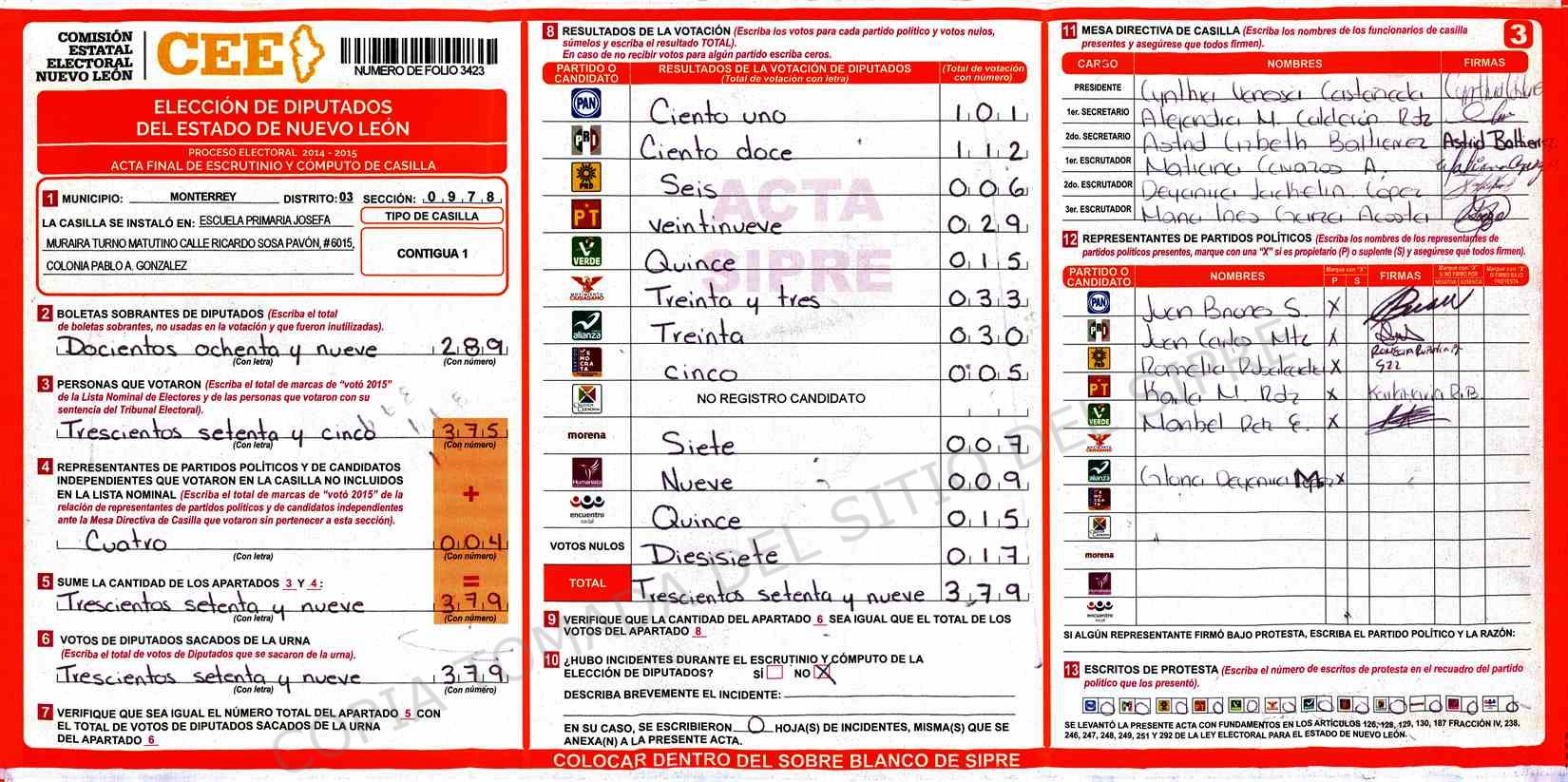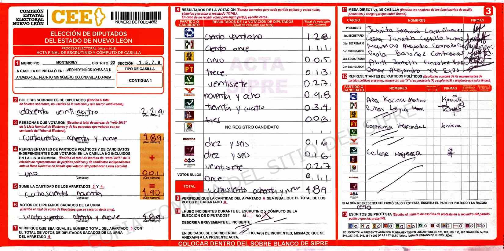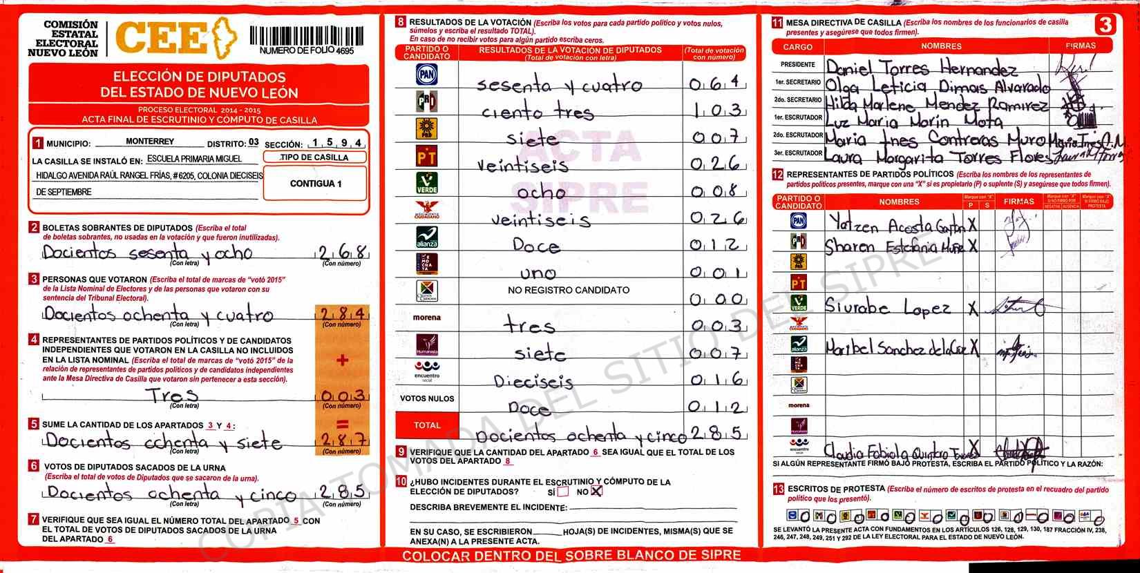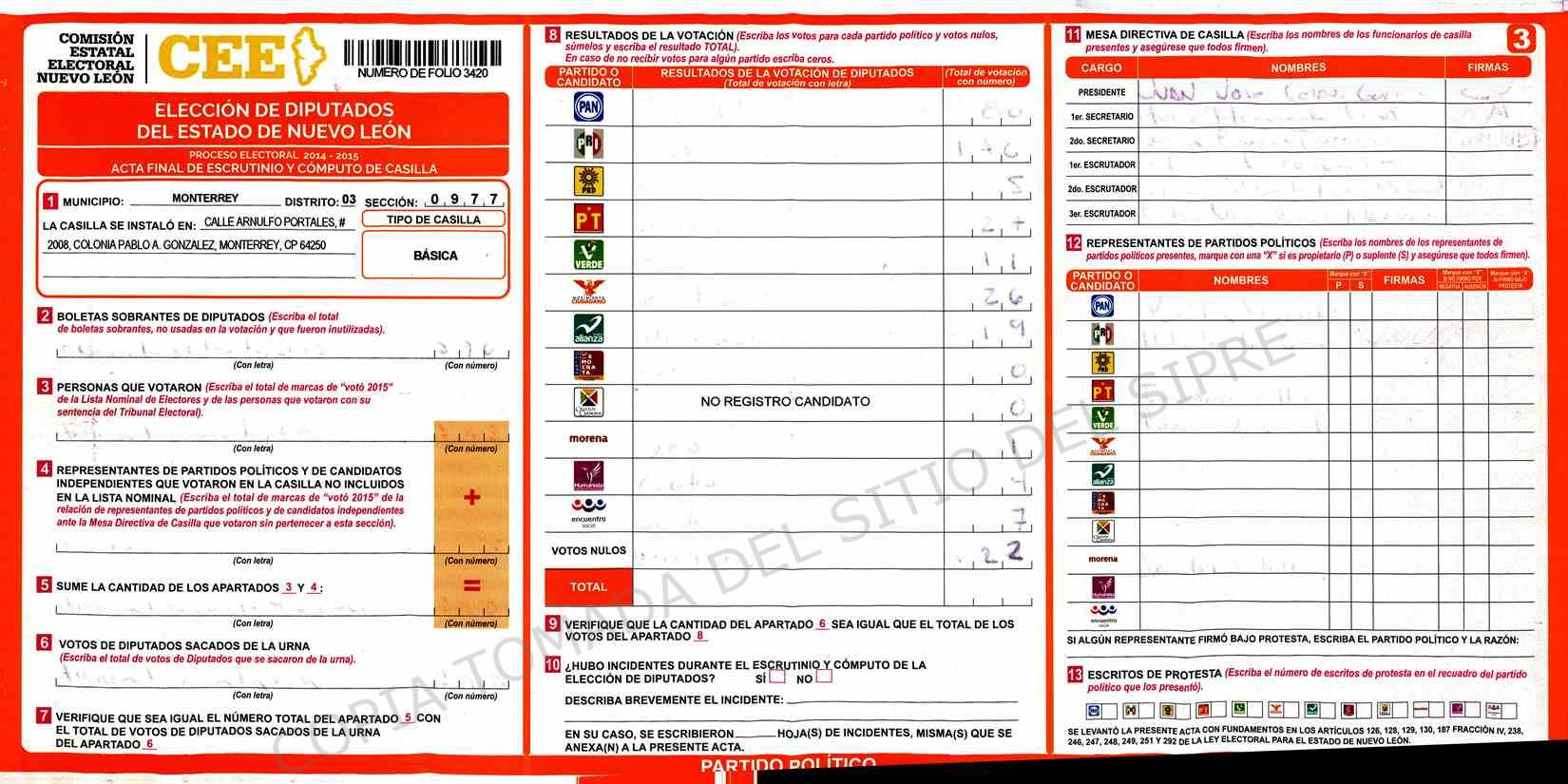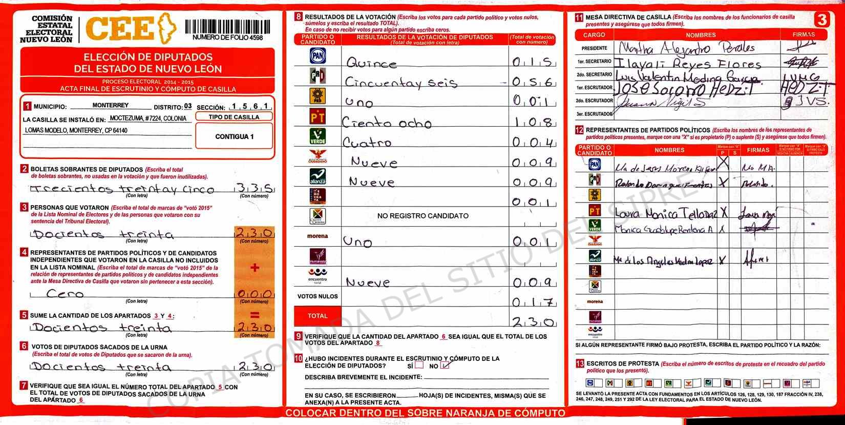 | Claves de Incidencia: | (1) Ilegible, (2) Mutilada, (3) Presenta Correcciones, (4) Presenta Borrones, (5) En Blanco, (6) Cifras Remarcadas, (7) Cifras de Mas, (8) Copiado Movido, (9) Con Signos Inválidos, (10) Excede Lista Nominal, (11) Otra |