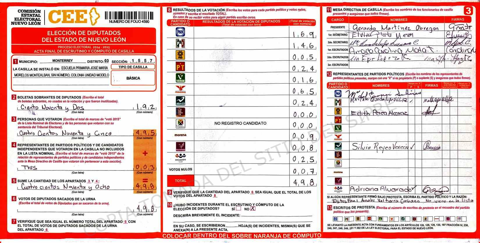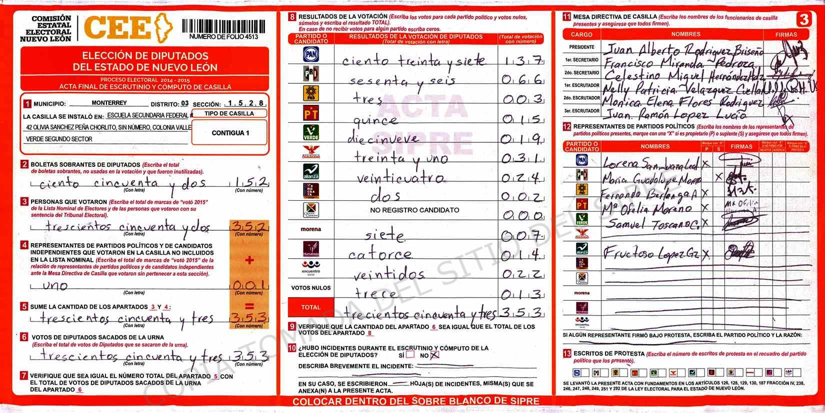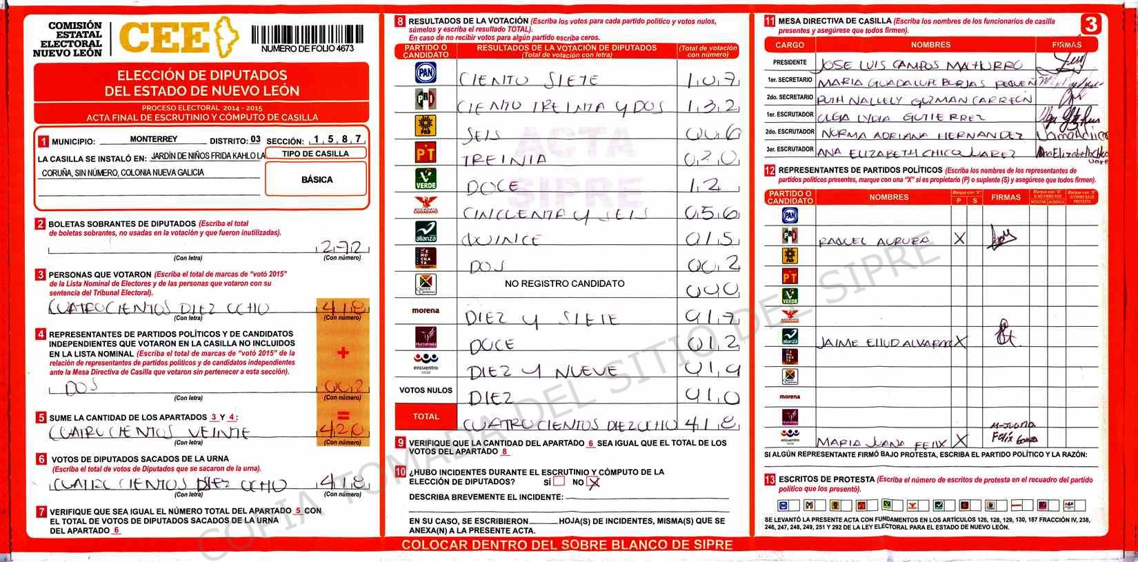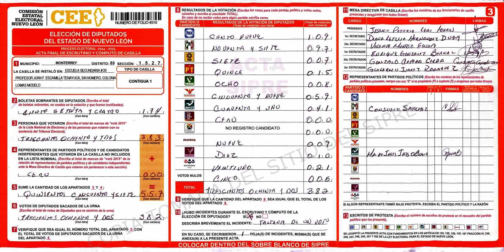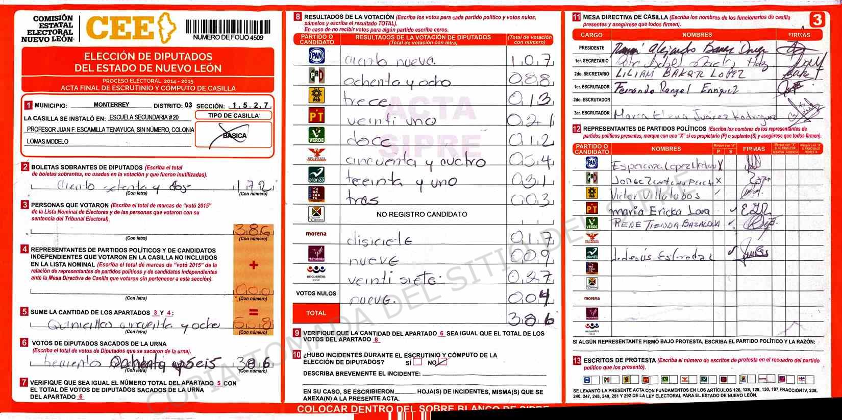 | Claves de Incidencia: | (1) Ilegible, (2) Mutilada, (3) Presenta Correcciones, (4) Presenta Borrones, (5) En Blanco, (6) Cifras Remarcadas, (7) Cifras de Mas, (8) Copiado Movido, (9) Con Signos Inválidos, (10) Excede Lista Nominal, (11) Otra |