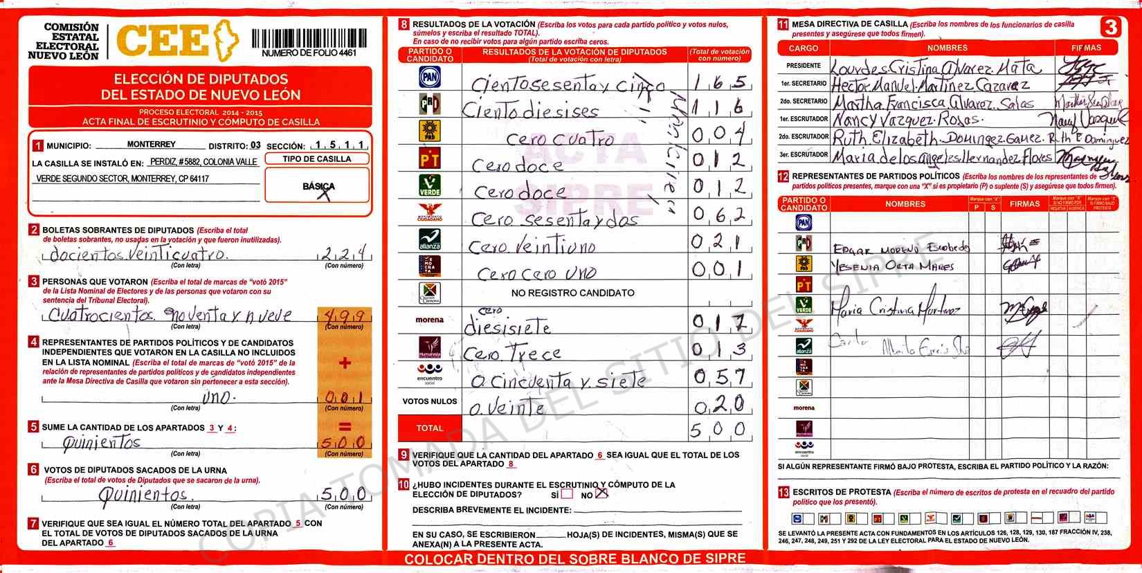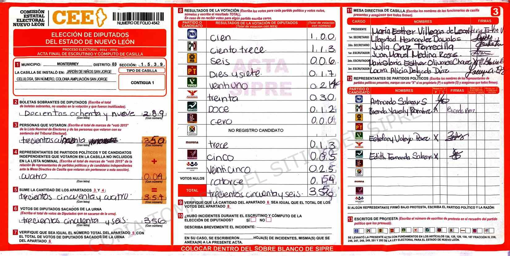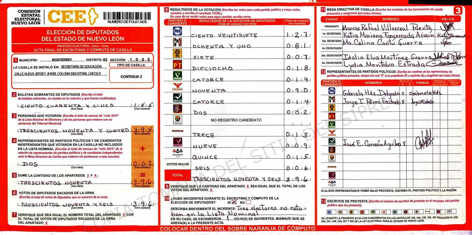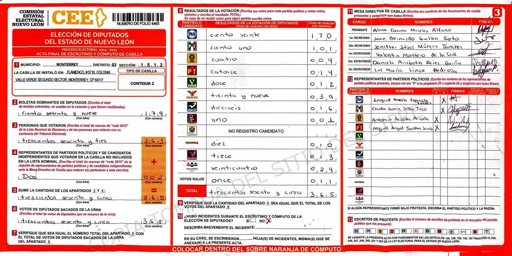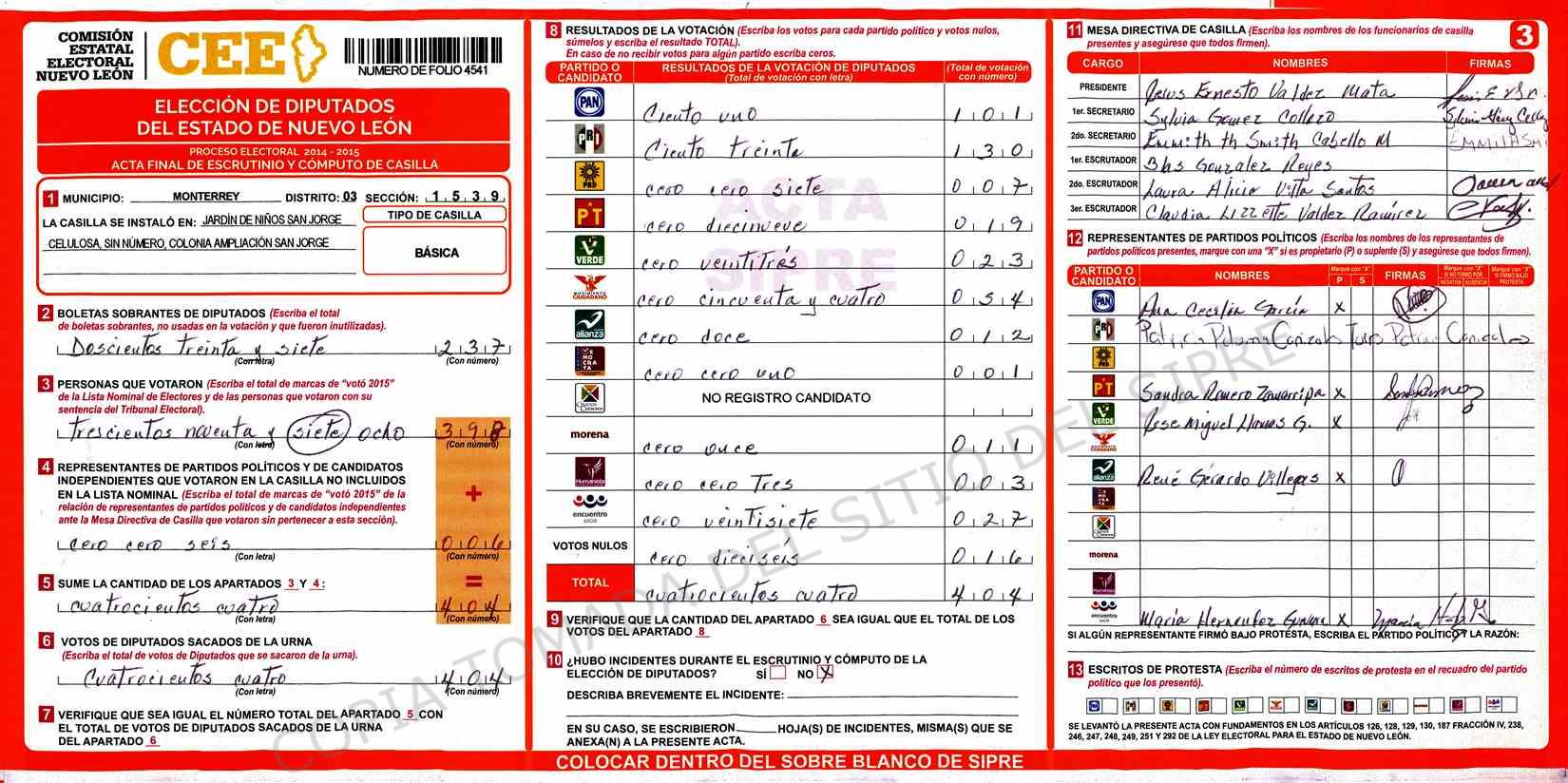 | Claves de Incidencia: | (1) Ilegible, (2) Mutilada, (3) Presenta Correcciones, (4) Presenta Borrones, (5) En Blanco, (6) Cifras Remarcadas, (7) Cifras de Mas, (8) Copiado Movido, (9) Con Signos Inválidos, (10) Excede Lista Nominal, (11) Otra |