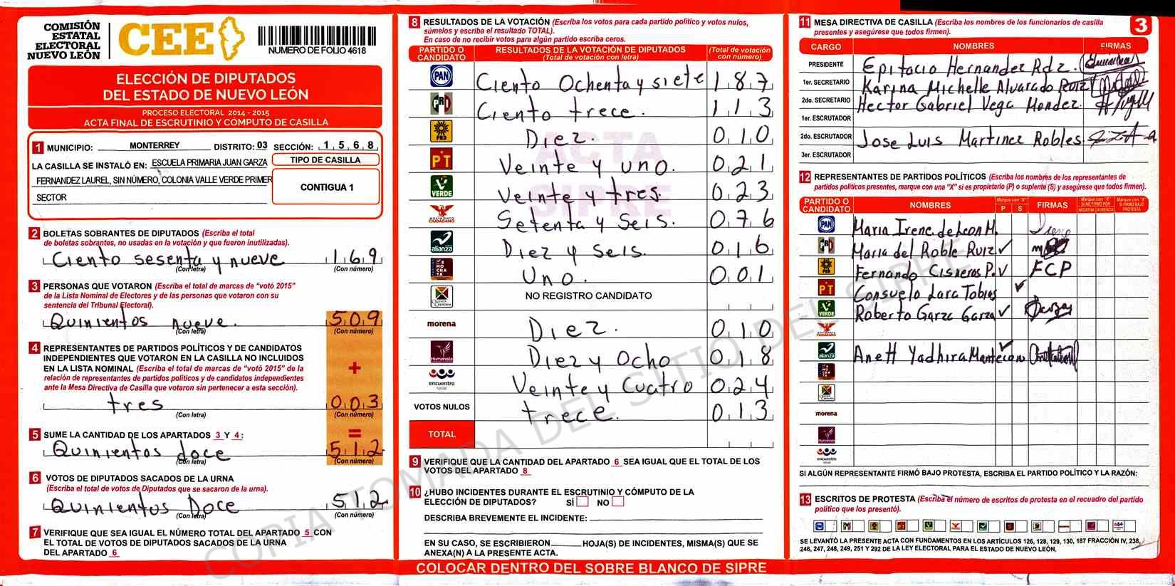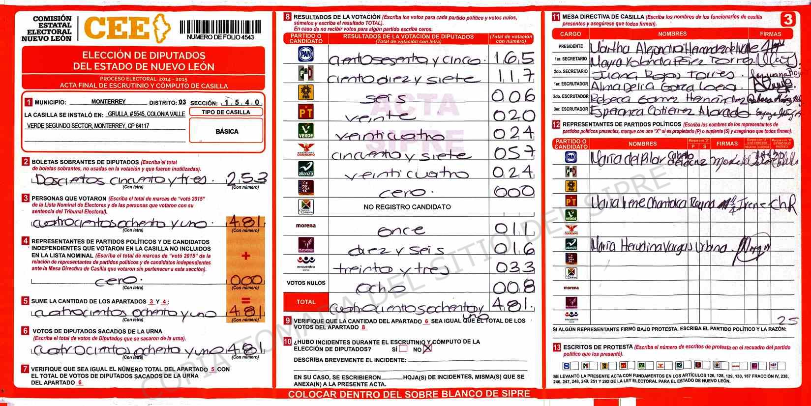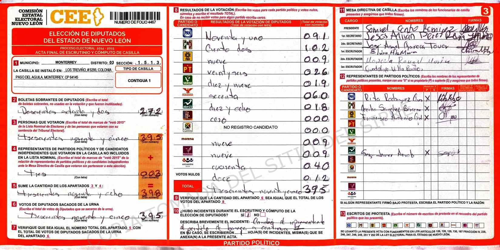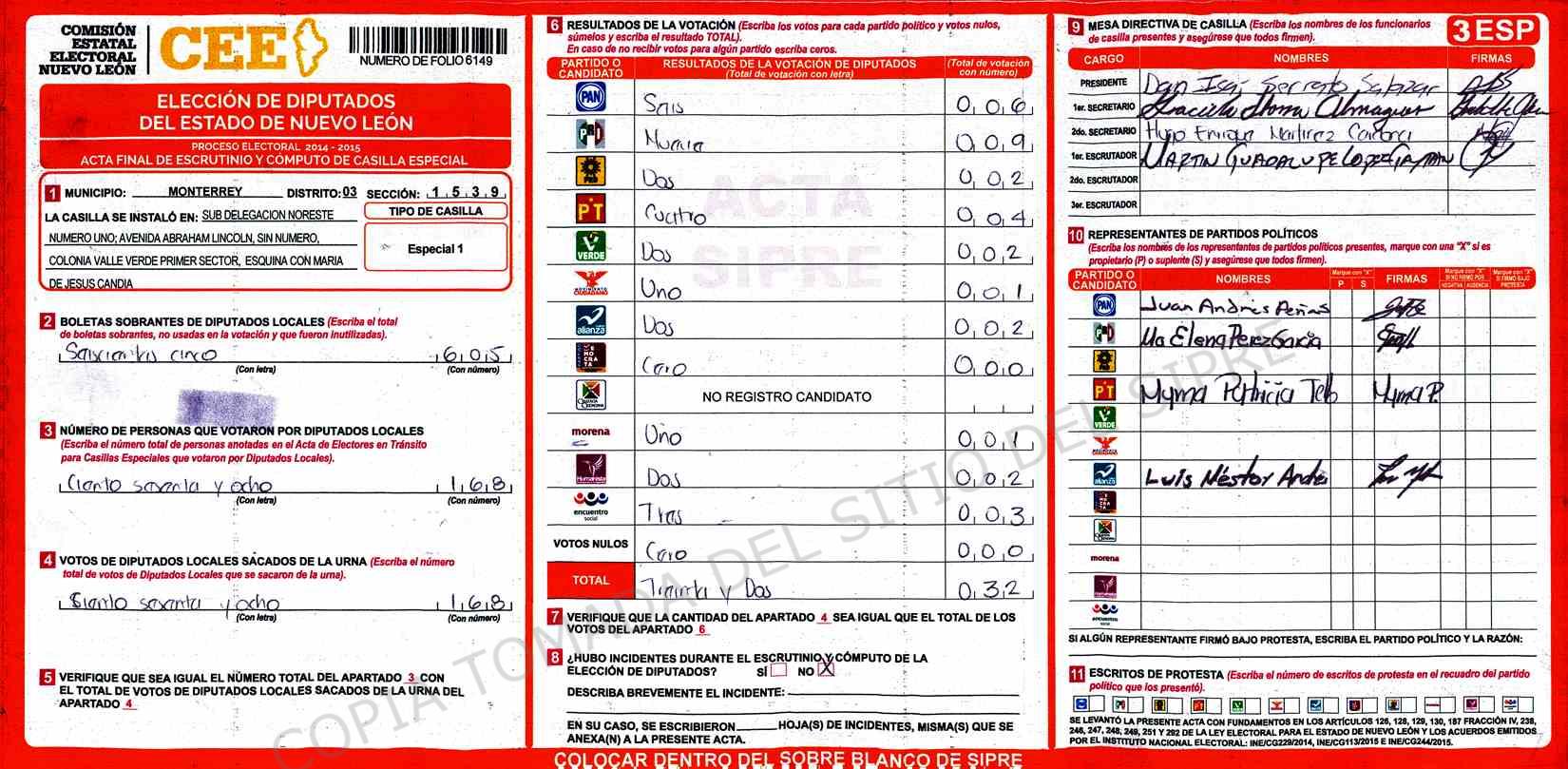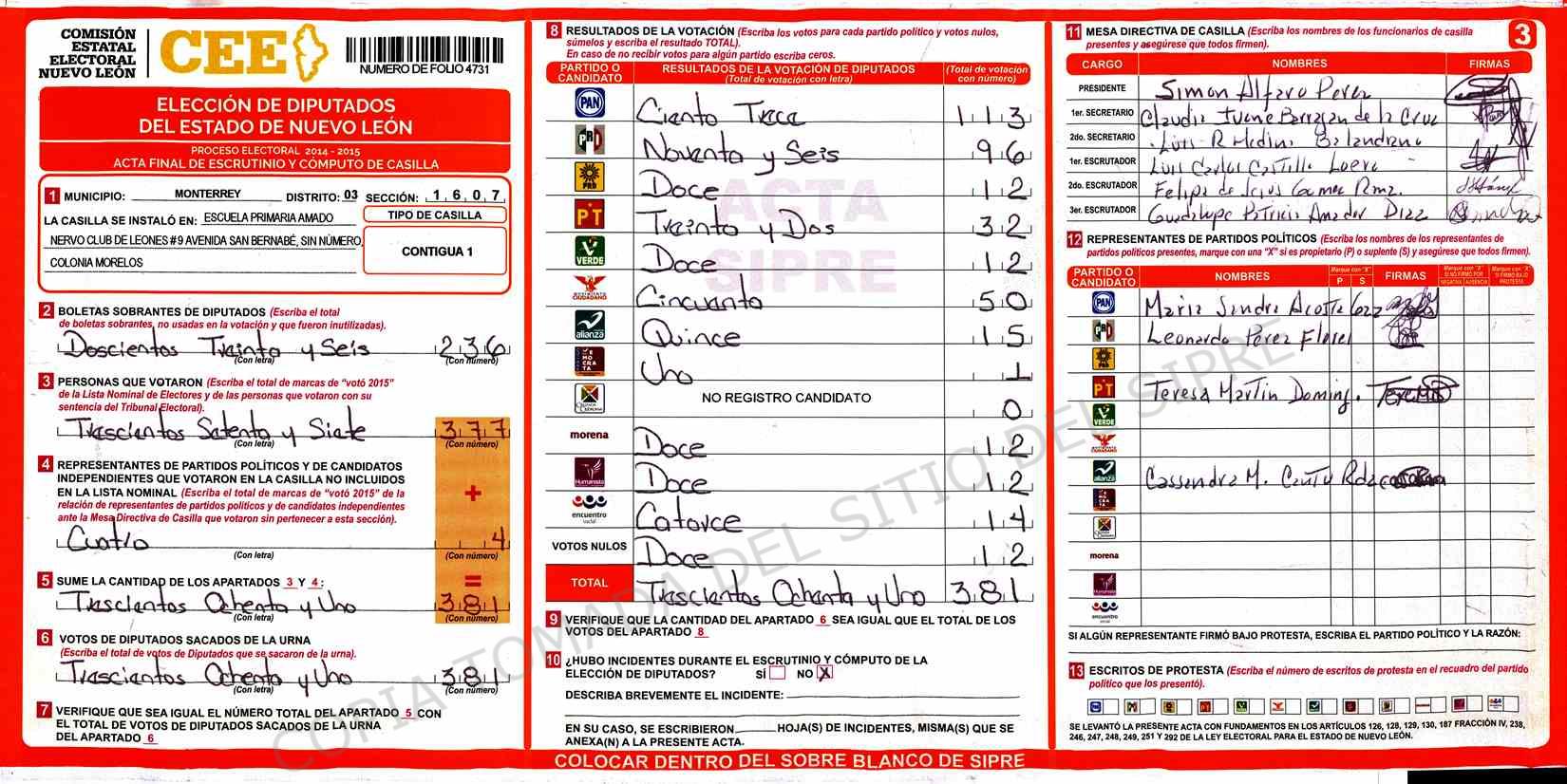 | Claves de Incidencia: | (1) Ilegible, (2) Mutilada, (3) Presenta Correcciones, (4) Presenta Borrones, (5) En Blanco, (6) Cifras Remarcadas, (7) Cifras de Mas, (8) Copiado Movido, (9) Con Signos Inválidos, (10) Excede Lista Nominal, (11) Otra |