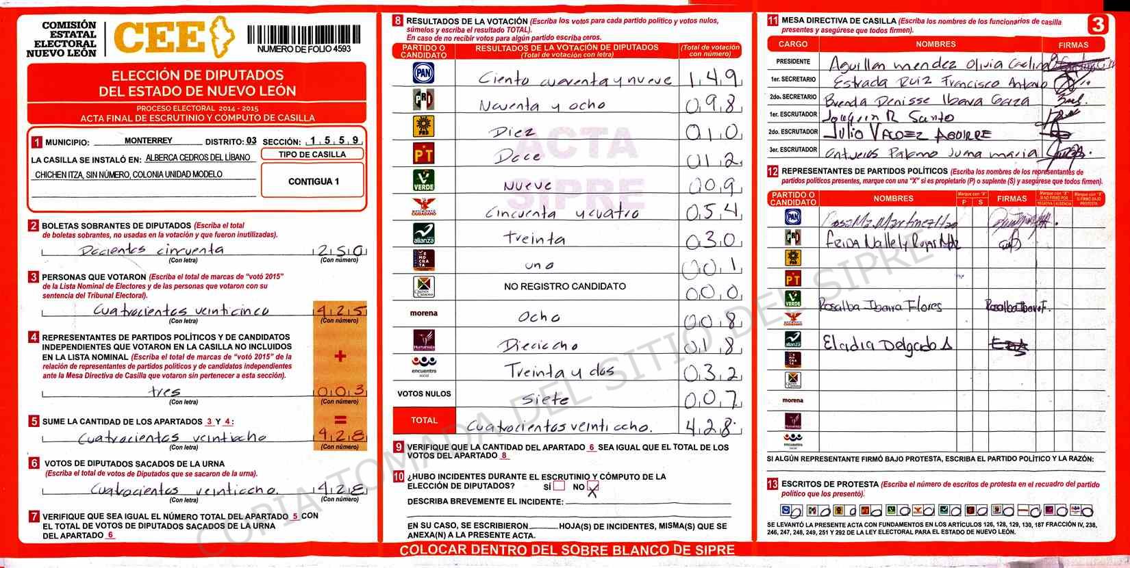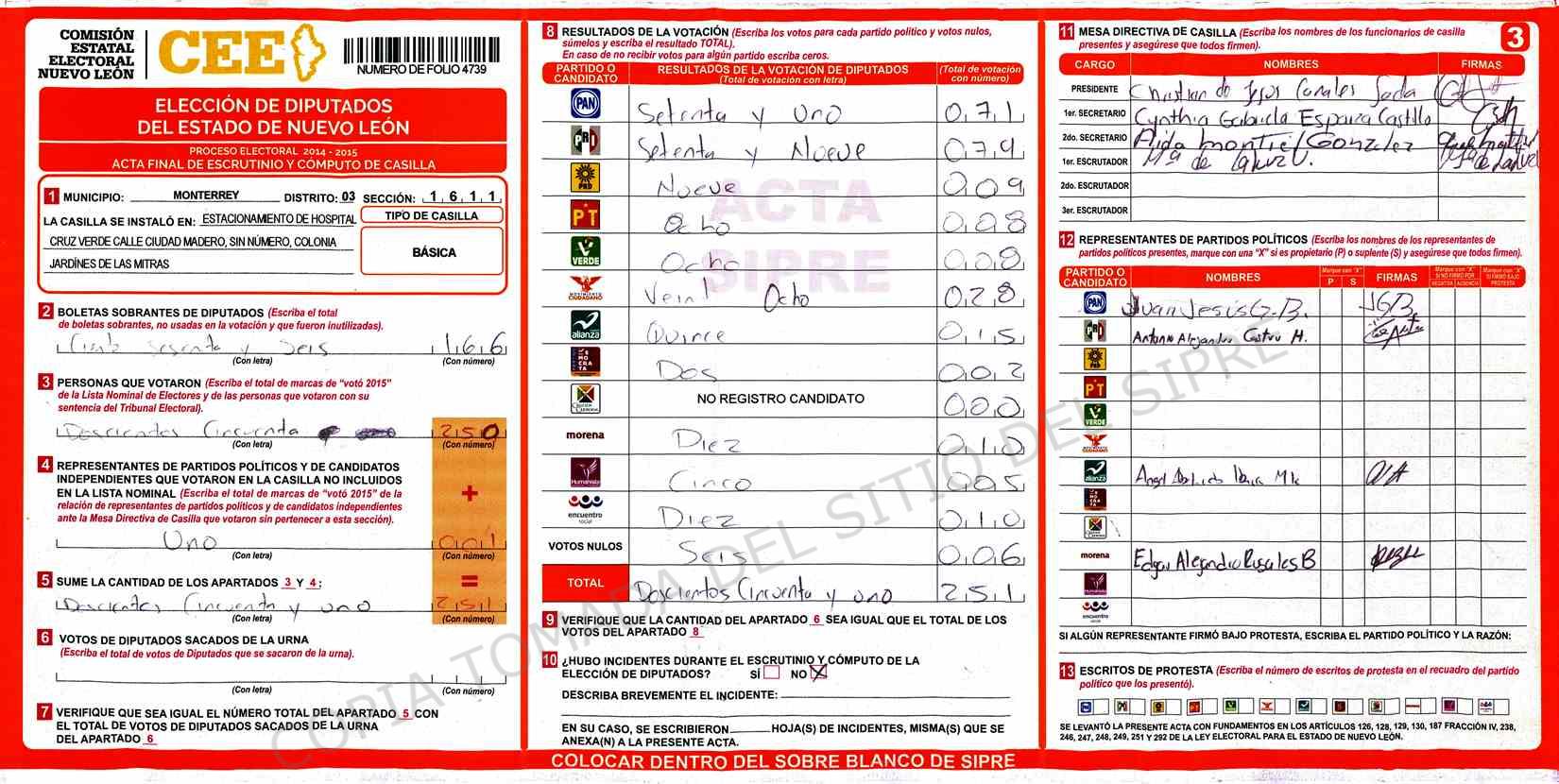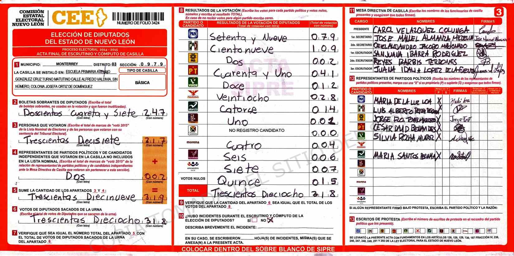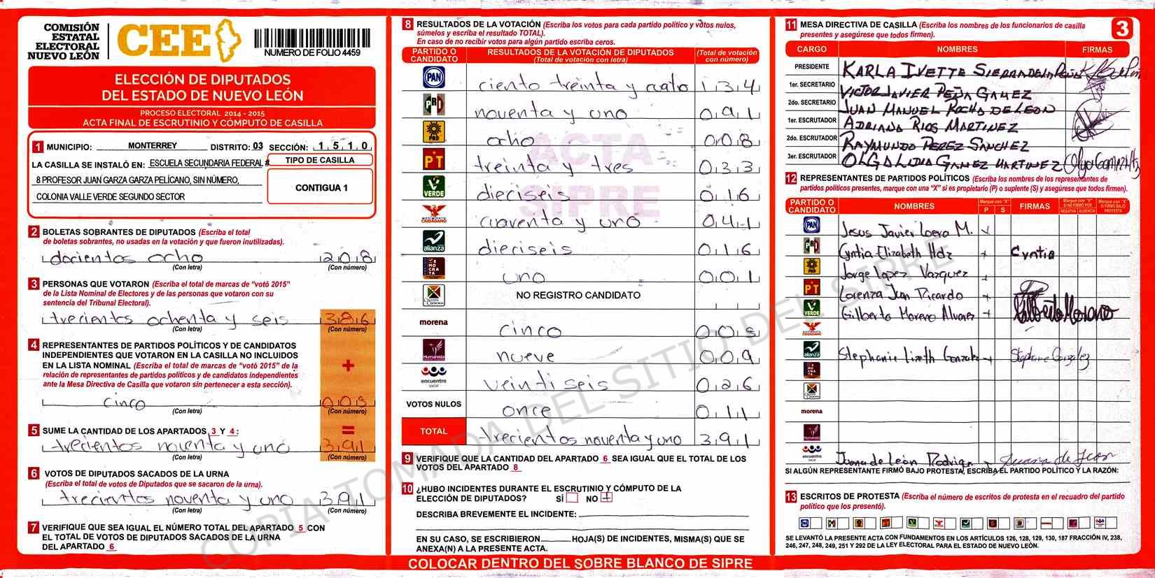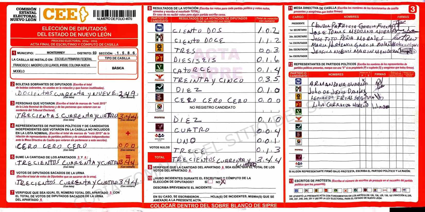 | Claves de Incidencia: | (1) Ilegible, (2) Mutilada, (3) Presenta Correcciones, (4) Presenta Borrones, (5) En Blanco, (6) Cifras Remarcadas, (7) Cifras de Mas, (8) Copiado Movido, (9) Con Signos Inválidos, (10) Excede Lista Nominal, (11) Otra |