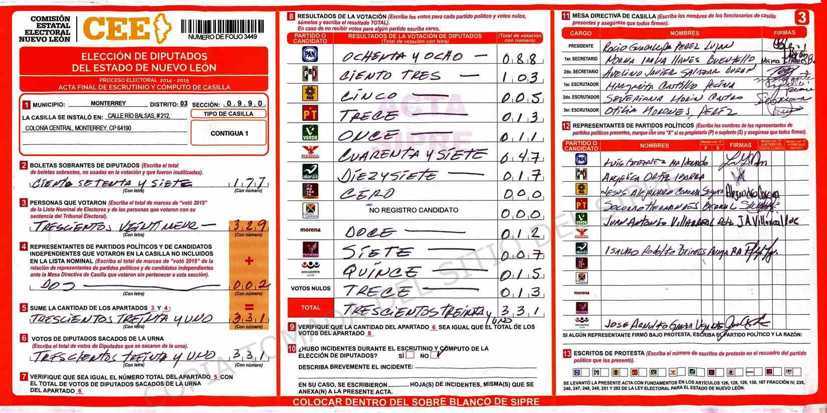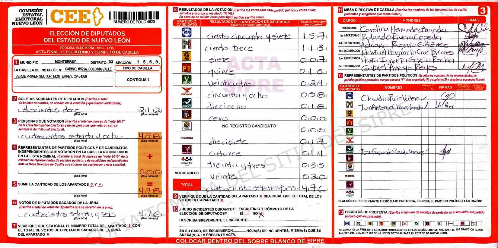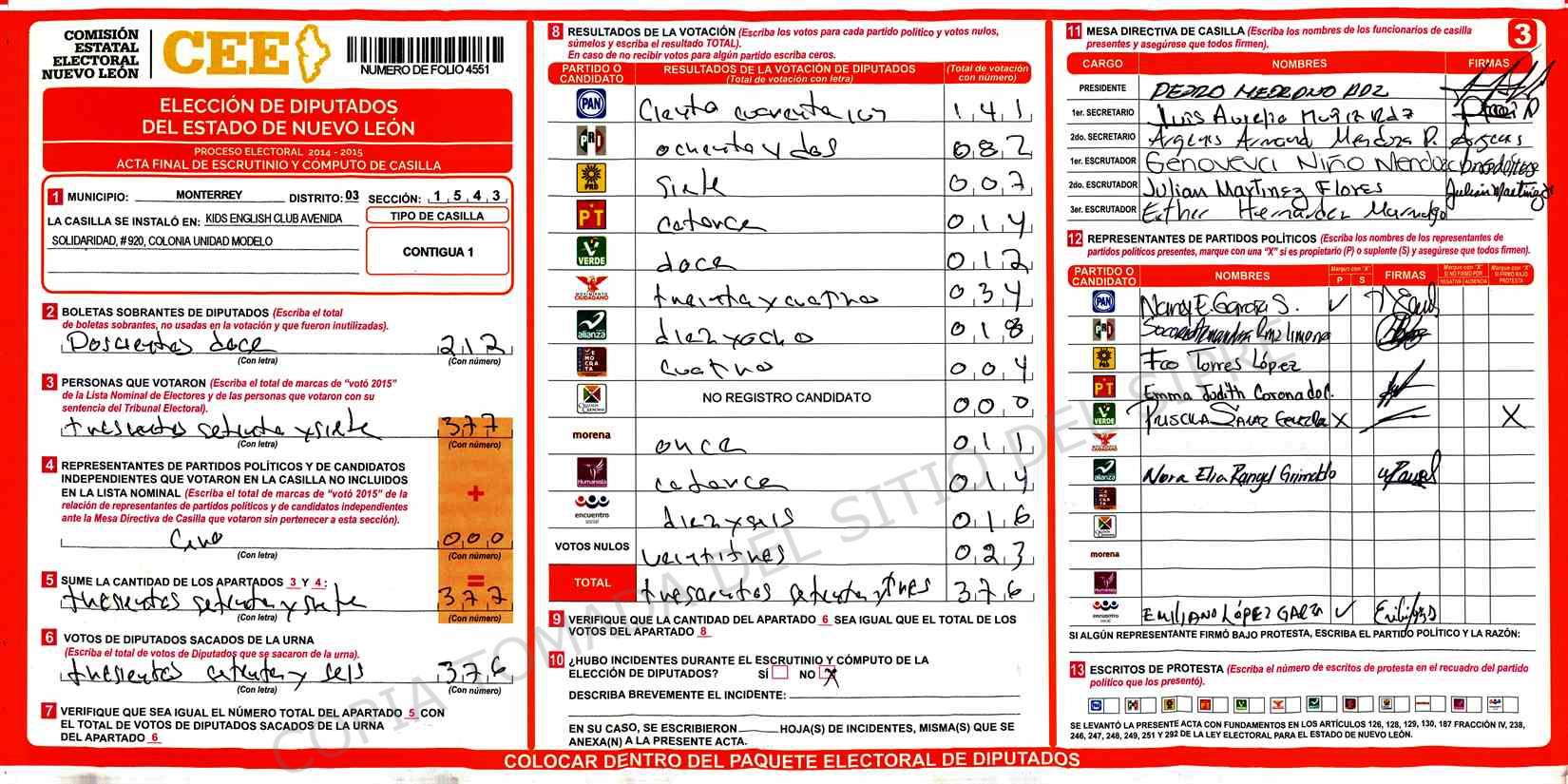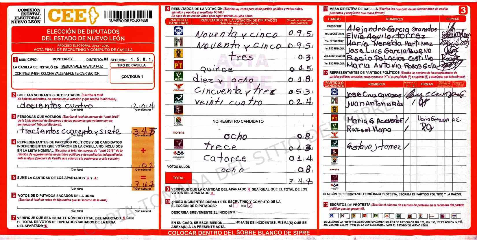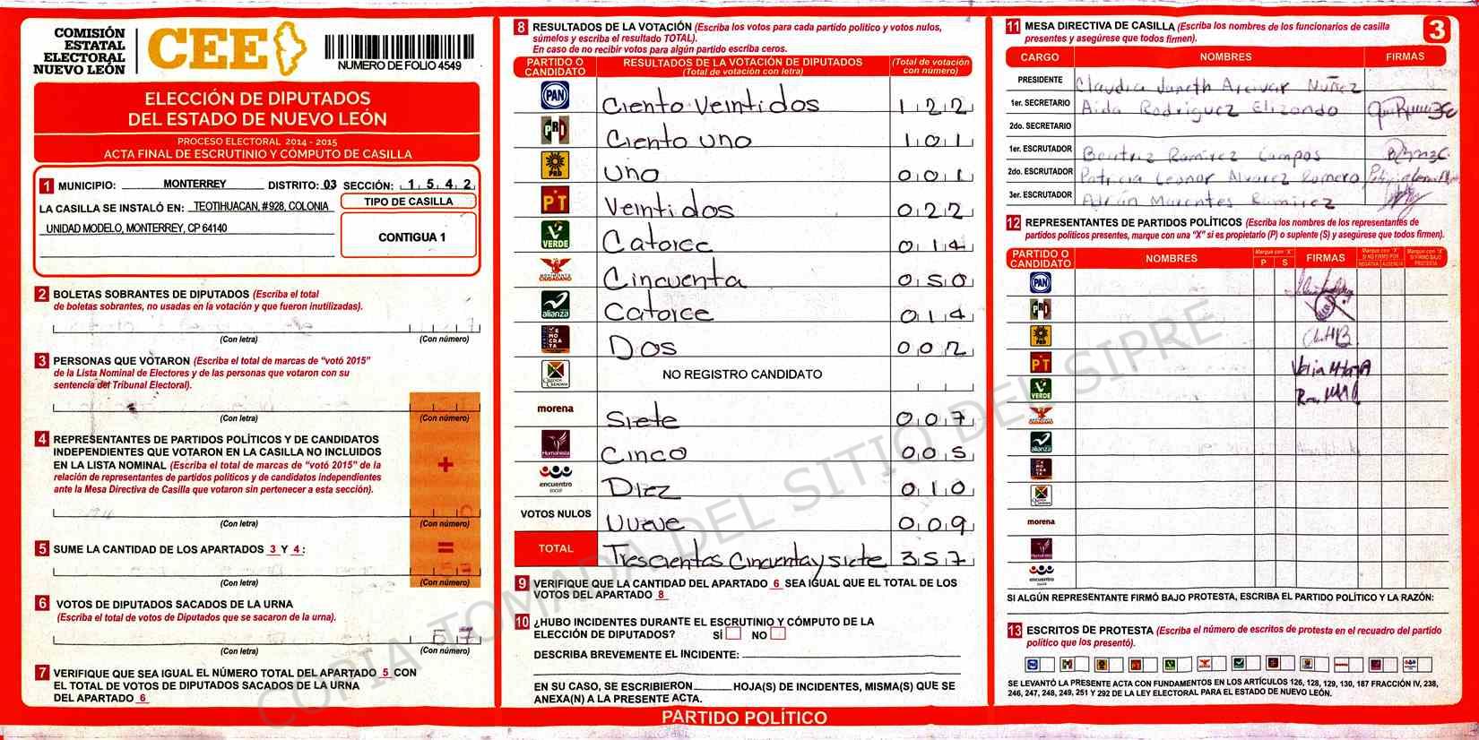 | Claves de Incidencia: | (1) Ilegible, (2) Mutilada, (3) Presenta Correcciones, (4) Presenta Borrones, (5) En Blanco, (6) Cifras Remarcadas, (7) Cifras de Mas, (8) Copiado Movido, (9) Con Signos Inválidos, (10) Excede Lista Nominal, (11) Otra |