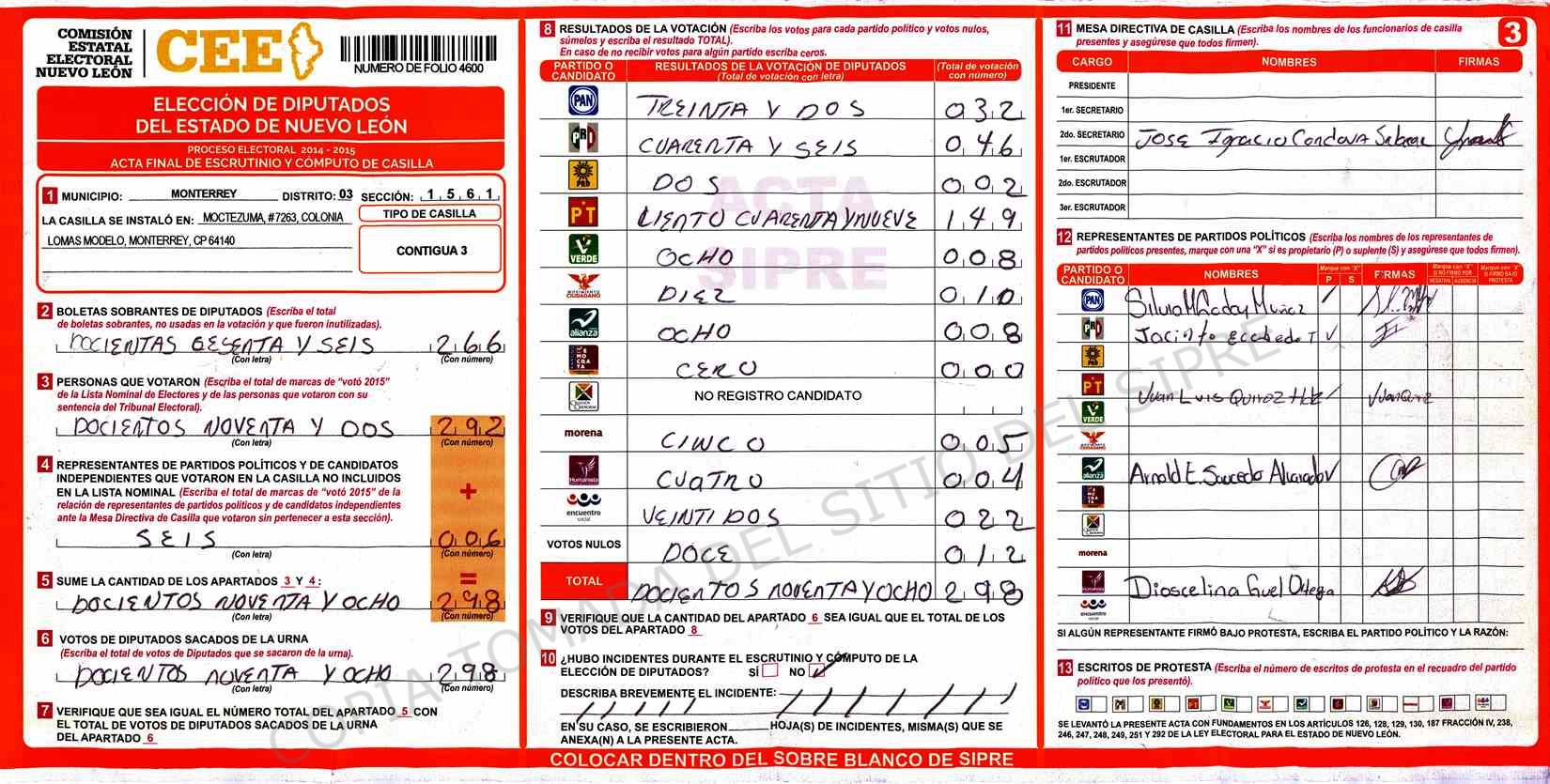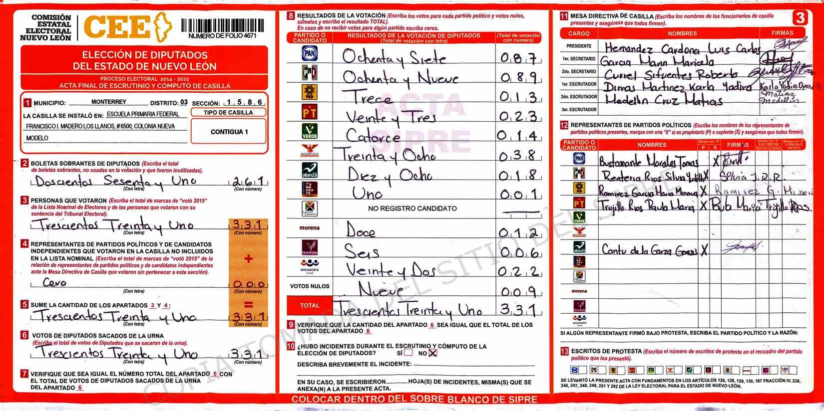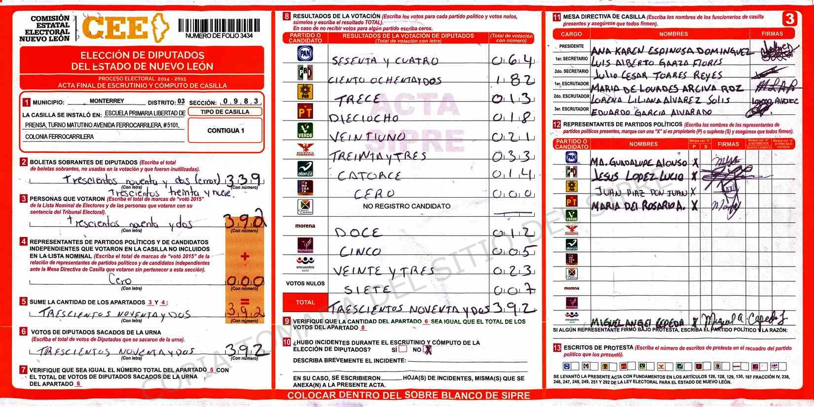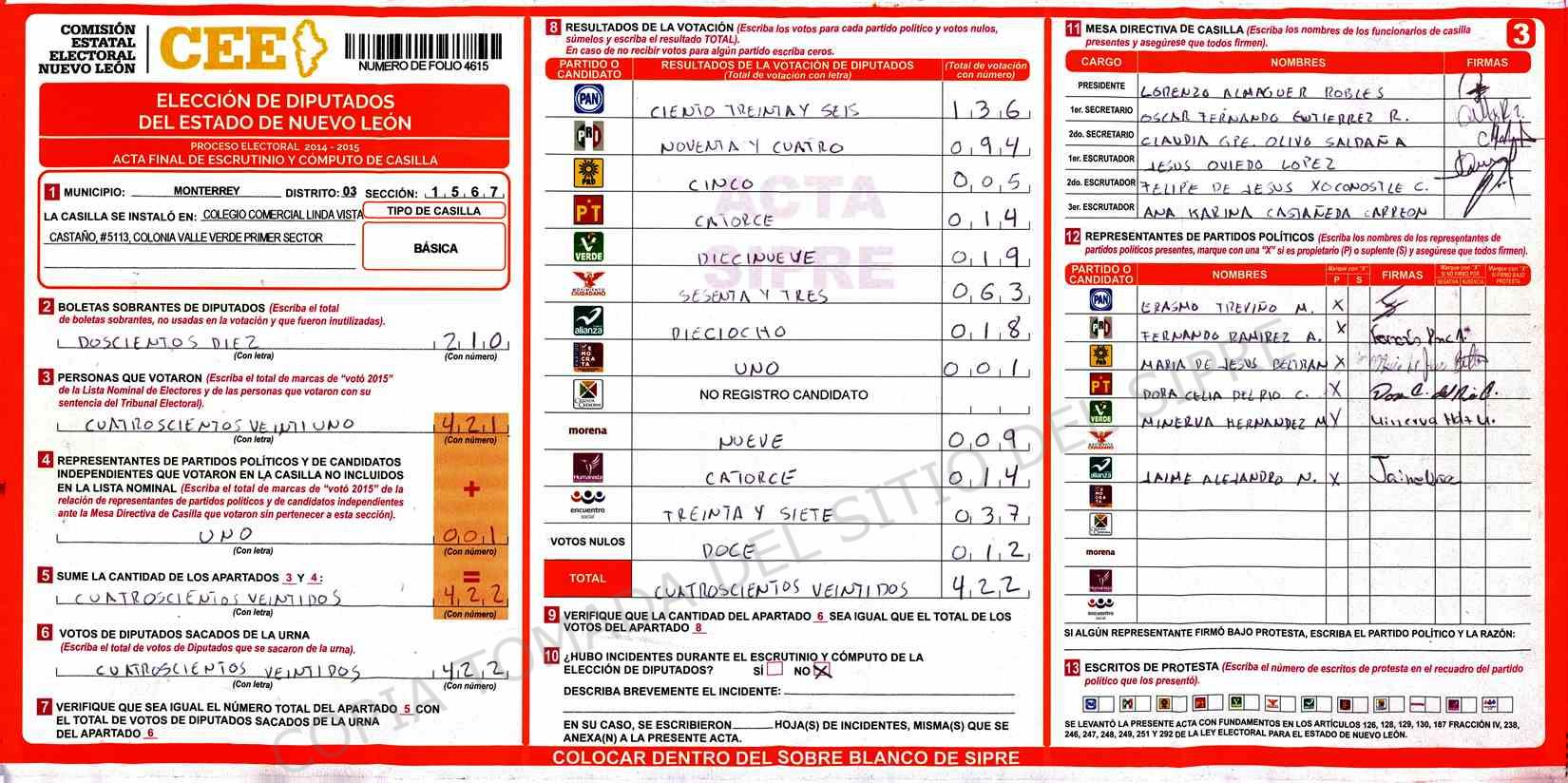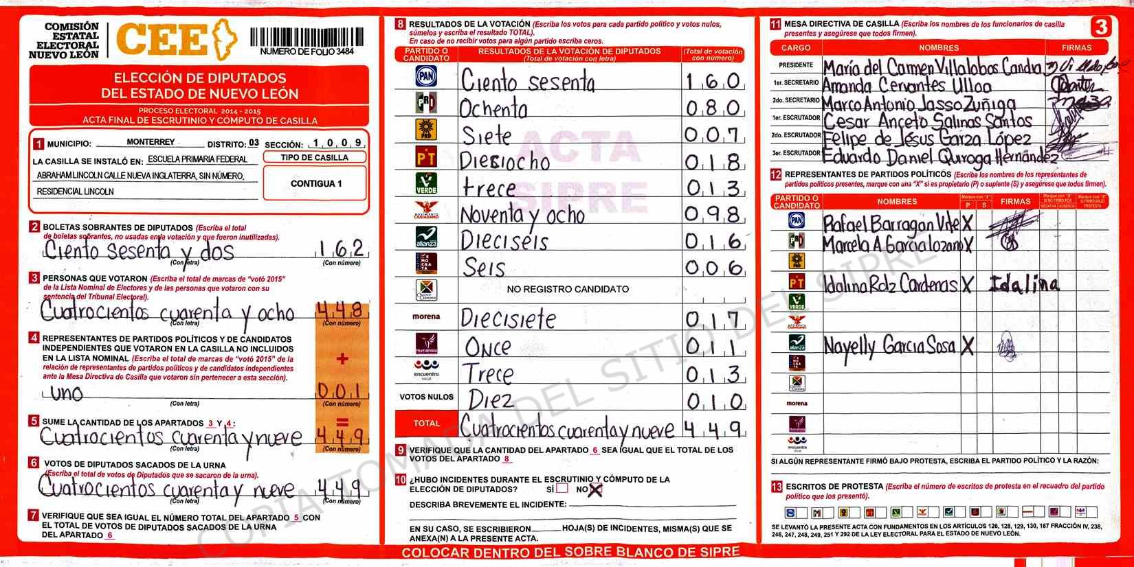 | Claves de Incidencia: | (1) Ilegible, (2) Mutilada, (3) Presenta Correcciones, (4) Presenta Borrones, (5) En Blanco, (6) Cifras Remarcadas, (7) Cifras de Mas, (8) Copiado Movido, (9) Con Signos Inválidos, (10) Excede Lista Nominal, (11) Otra |