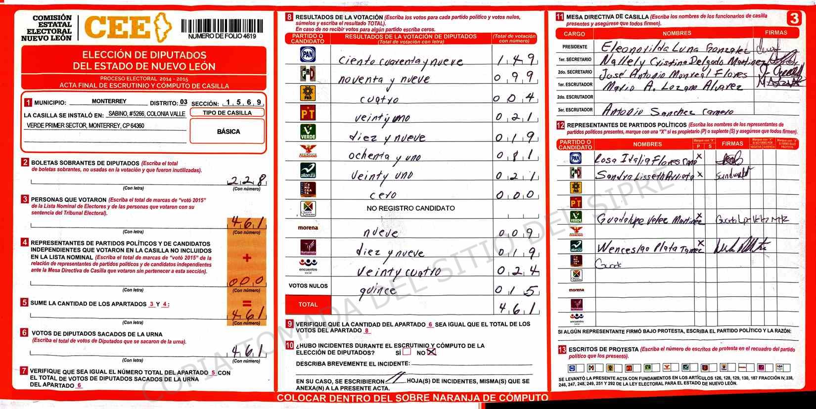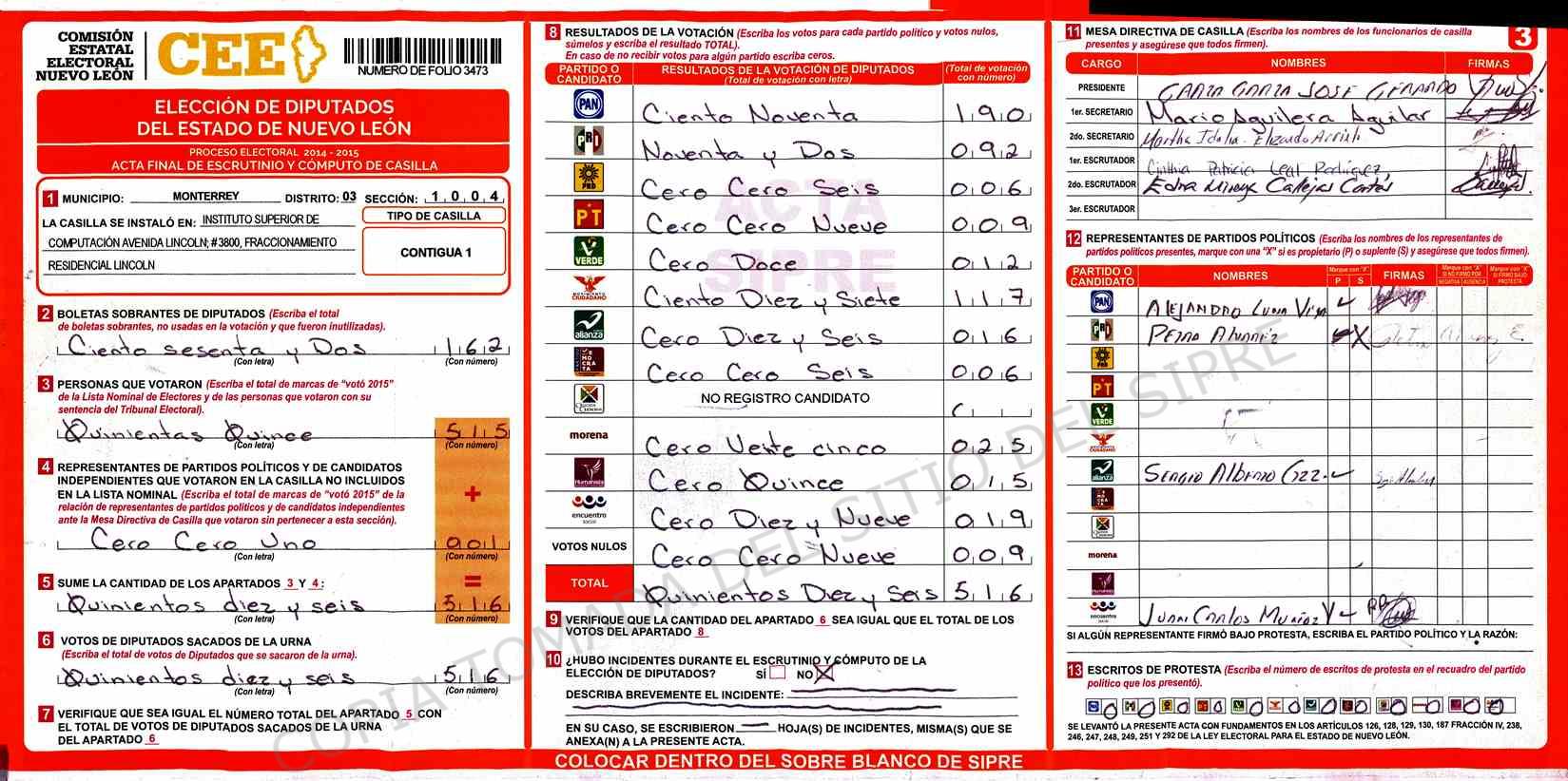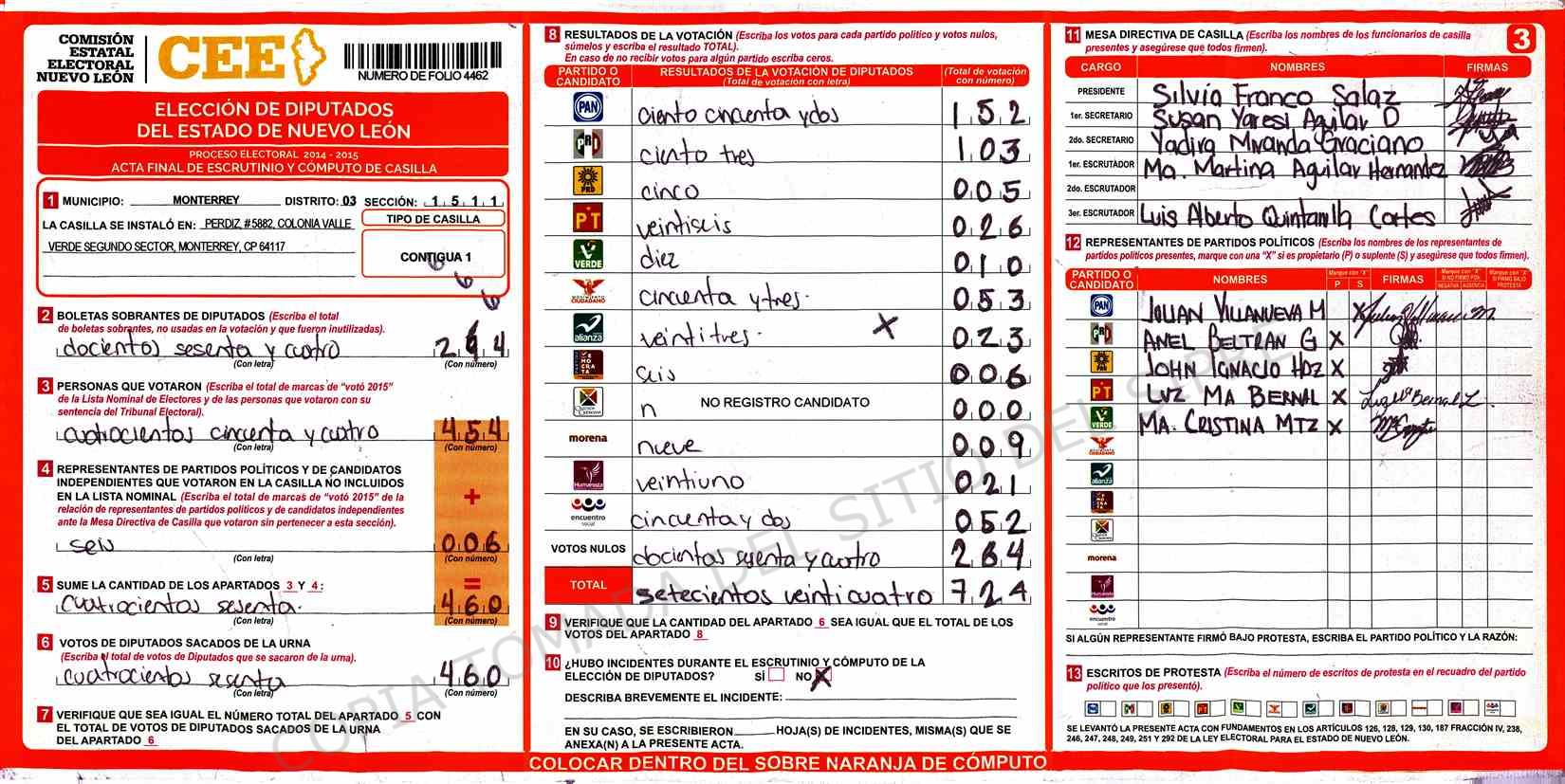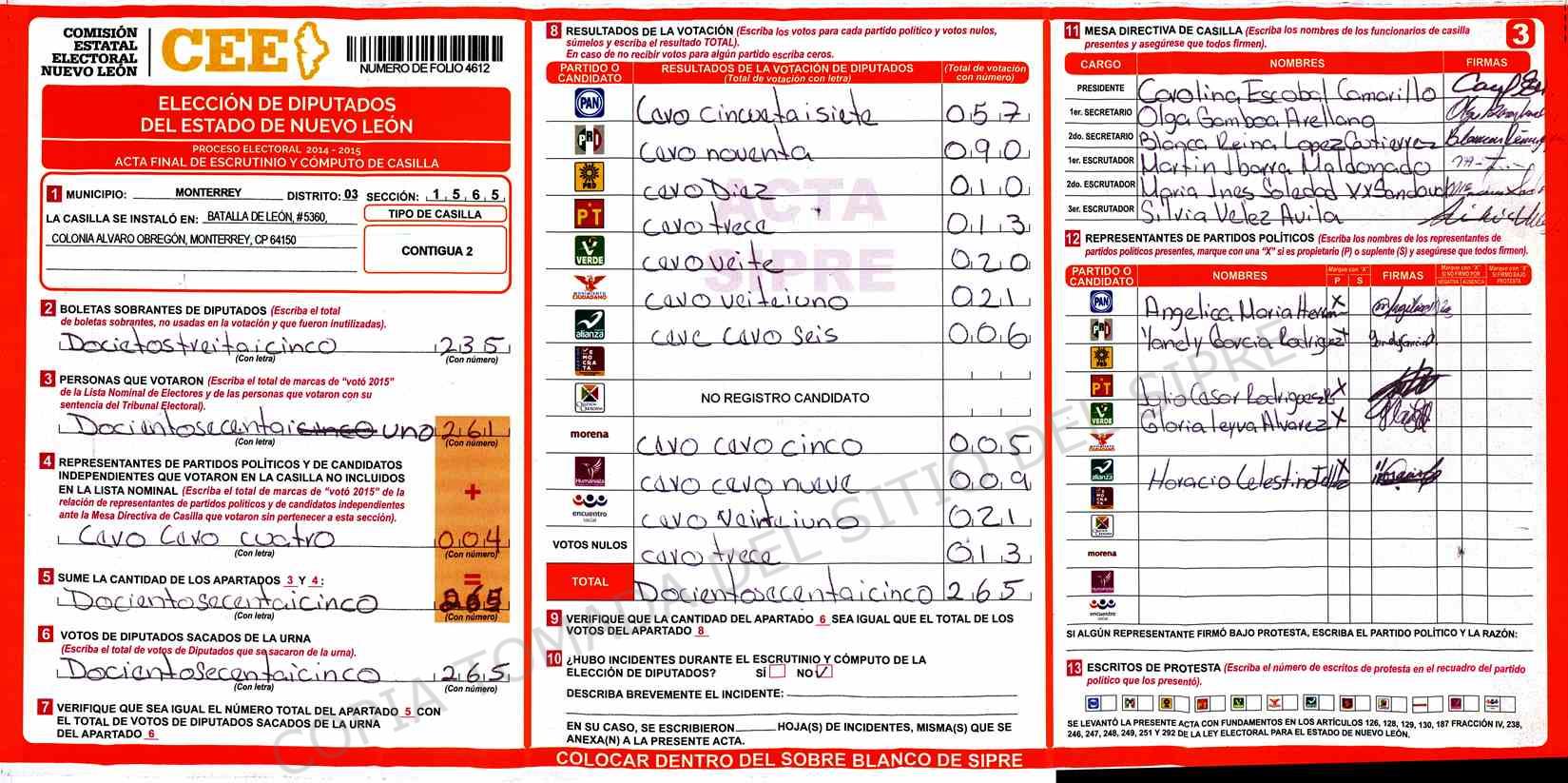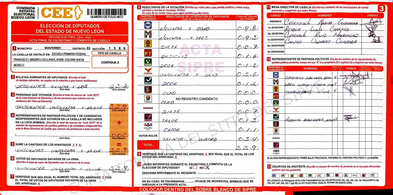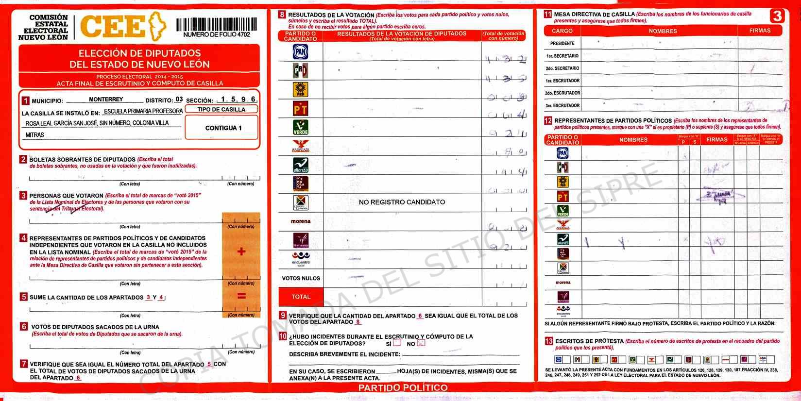 | Claves de Incidencia: | (1) Ilegible, (2) Mutilada, (3) Presenta Correcciones, (4) Presenta Borrones, (5) En Blanco, (6) Cifras Remarcadas, (7) Cifras de Mas, (8) Copiado Movido, (9) Con Signos Inválidos, (10) Excede Lista Nominal, (11) Otra |