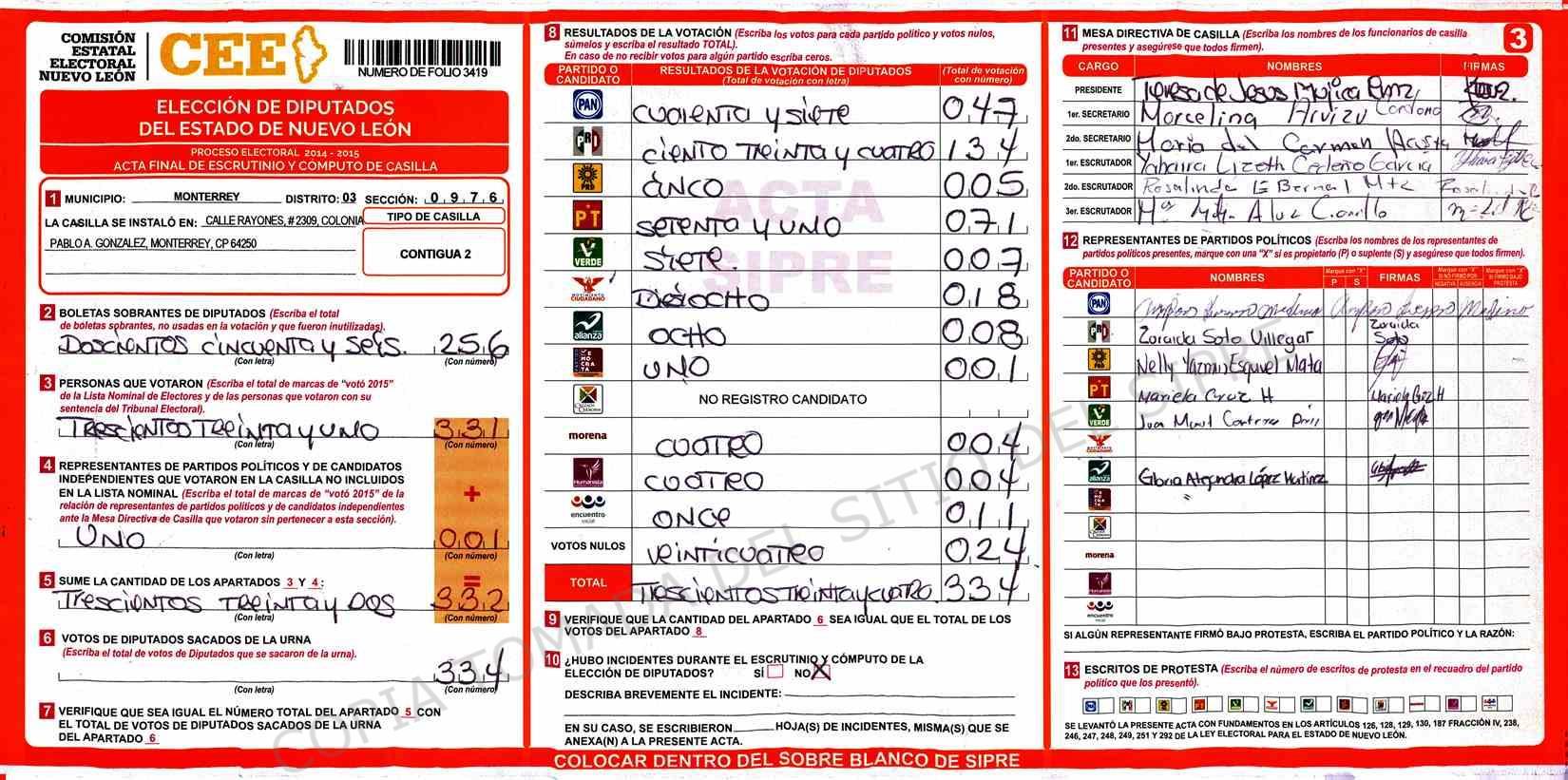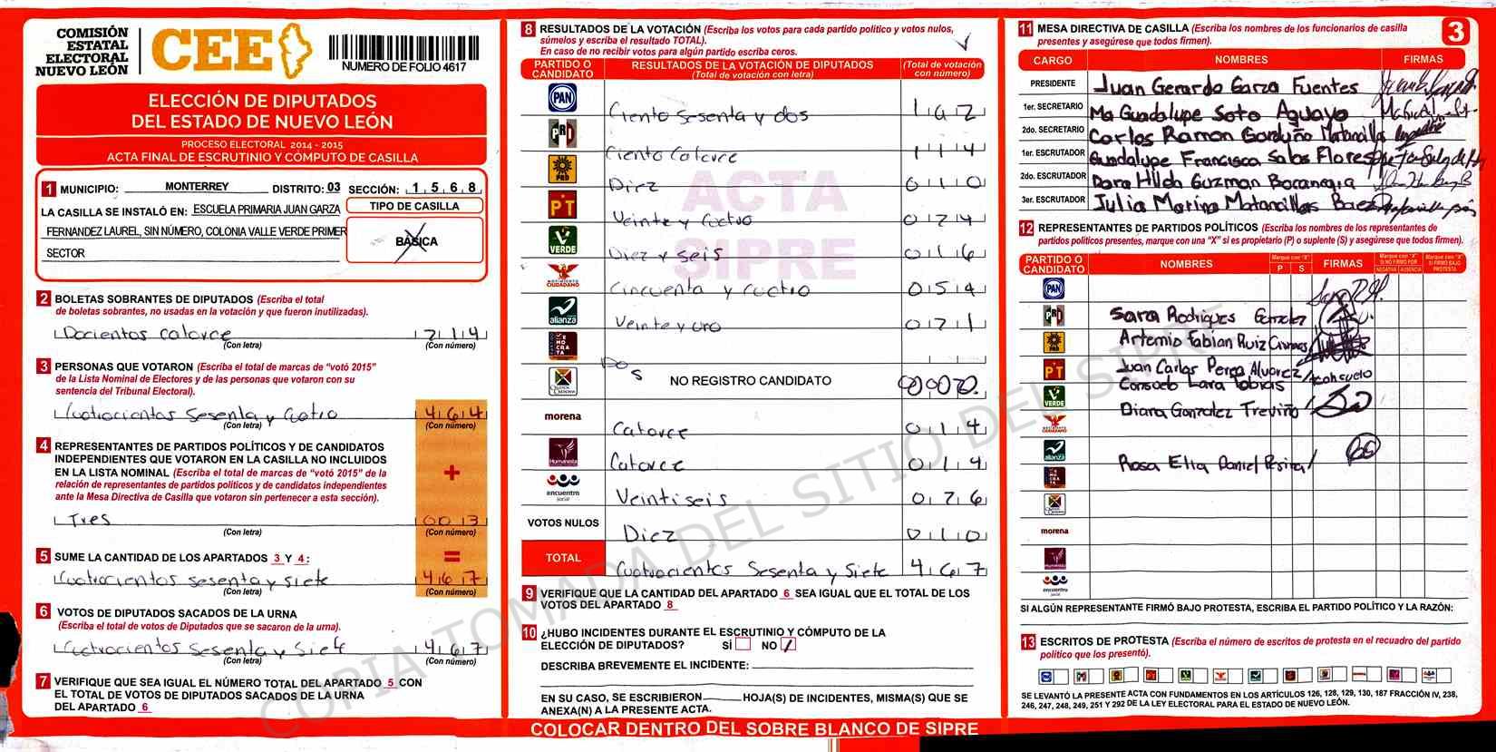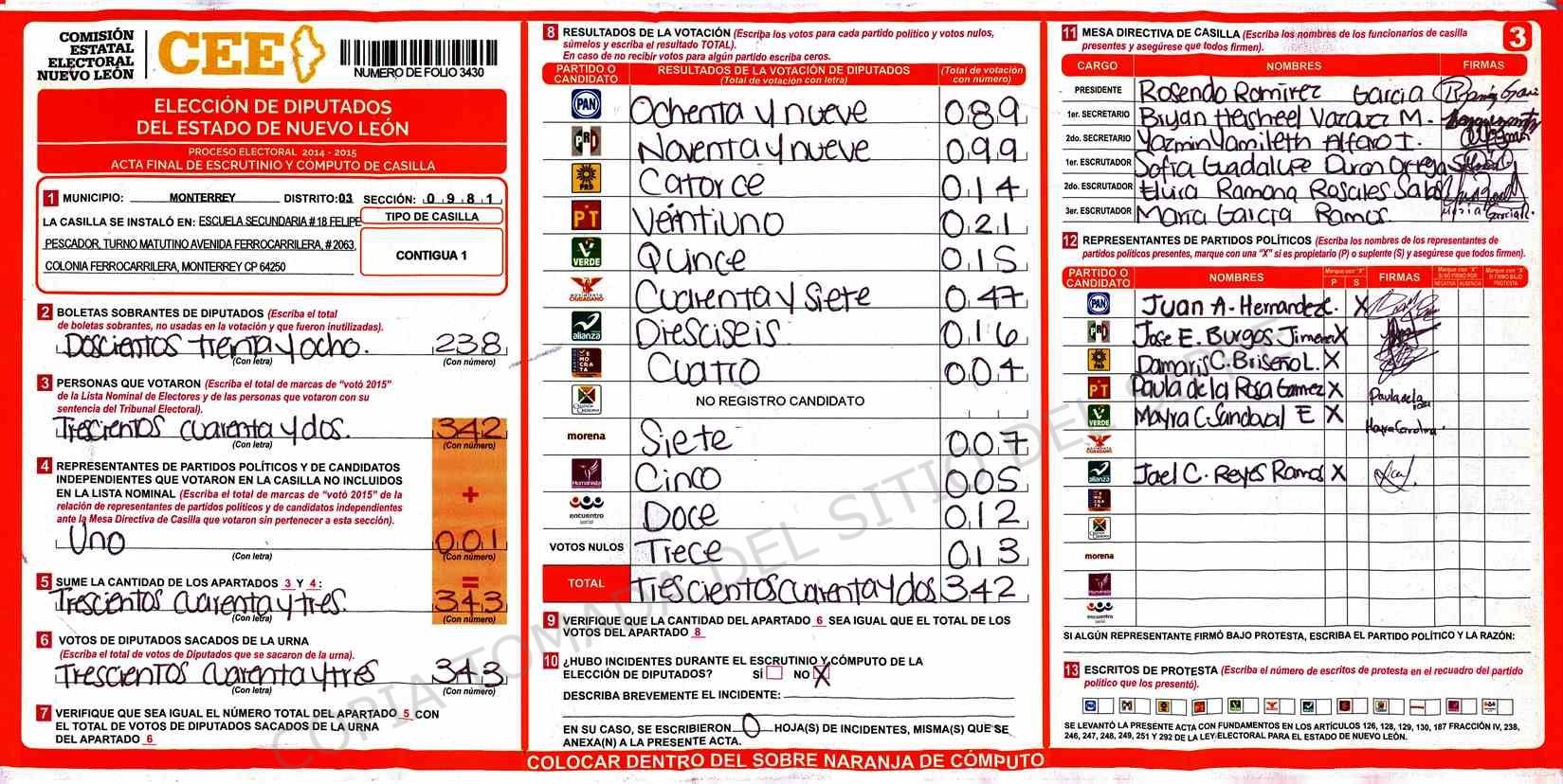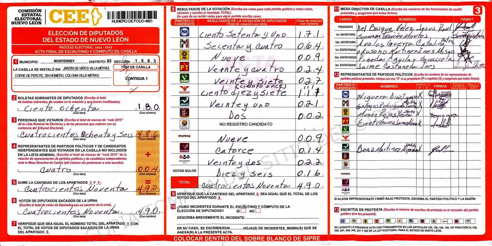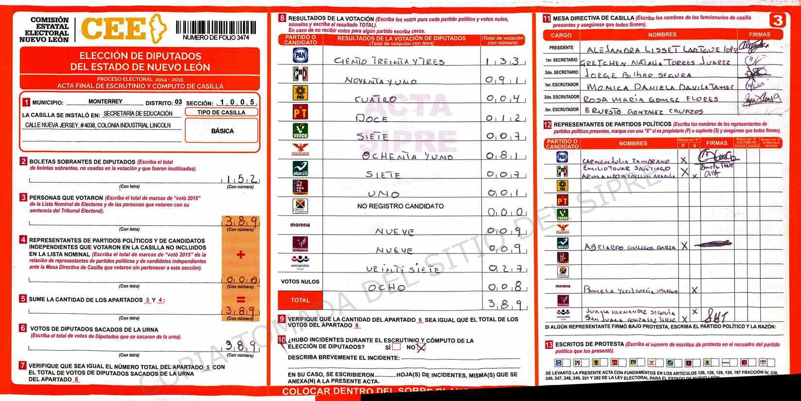 | Claves de Incidencia: | (1) Ilegible, (2) Mutilada, (3) Presenta Correcciones, (4) Presenta Borrones, (5) En Blanco, (6) Cifras Remarcadas, (7) Cifras de Mas, (8) Copiado Movido, (9) Con Signos Inválidos, (10) Excede Lista Nominal, (11) Otra |