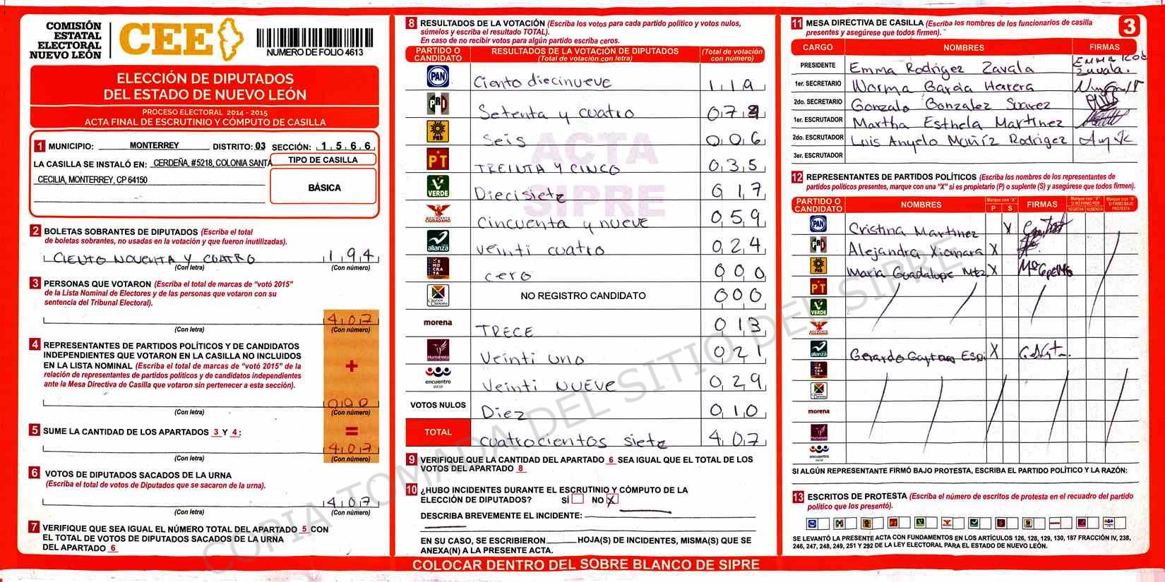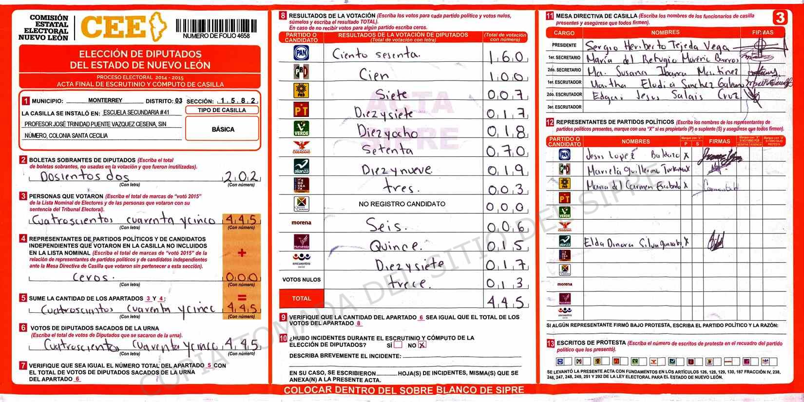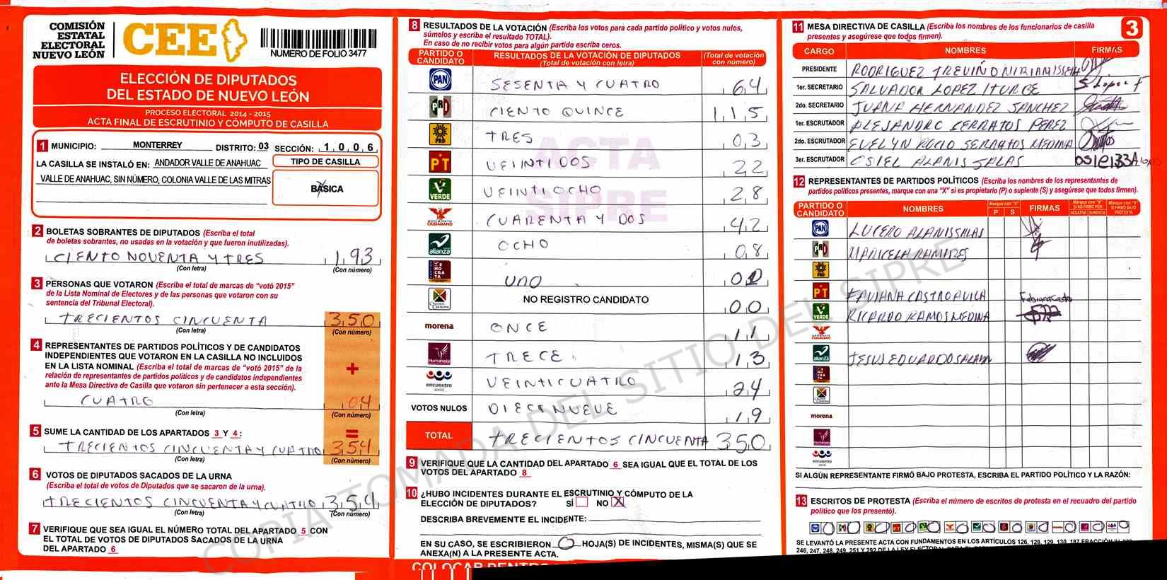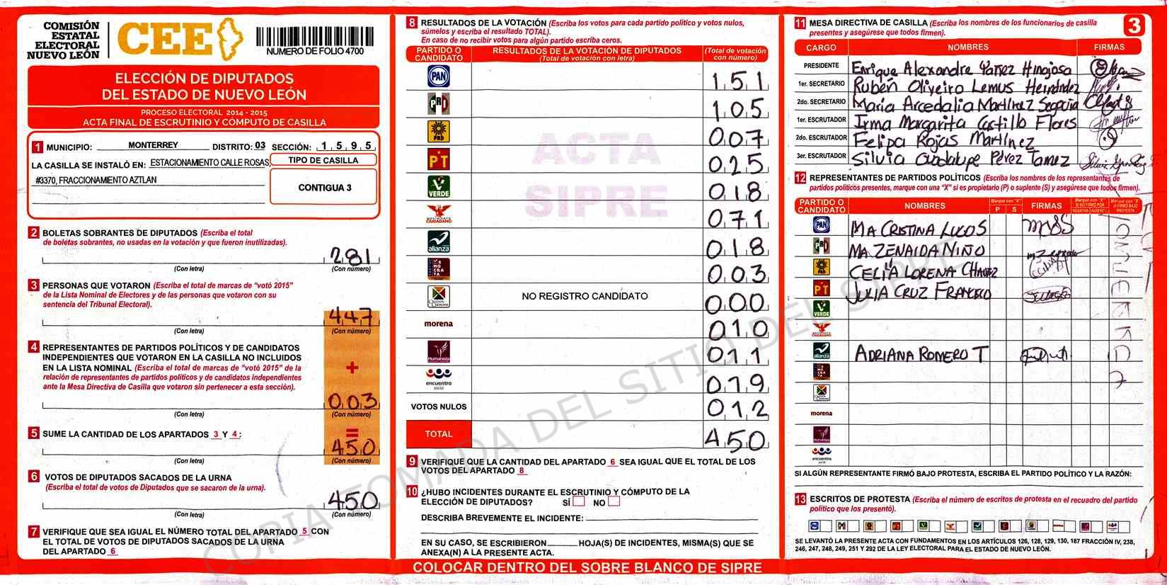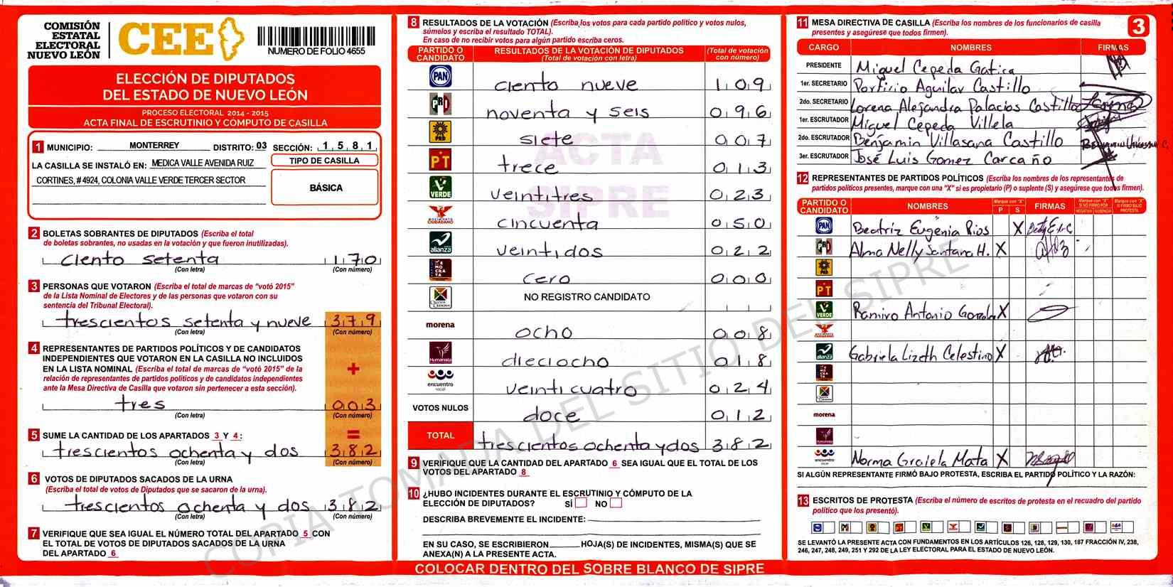 | Claves de Incidencia: | (1) Ilegible, (2) Mutilada, (3) Presenta Correcciones, (4) Presenta Borrones, (5) En Blanco, (6) Cifras Remarcadas, (7) Cifras de Mas, (8) Copiado Movido, (9) Con Signos Inválidos, (10) Excede Lista Nominal, (11) Otra |