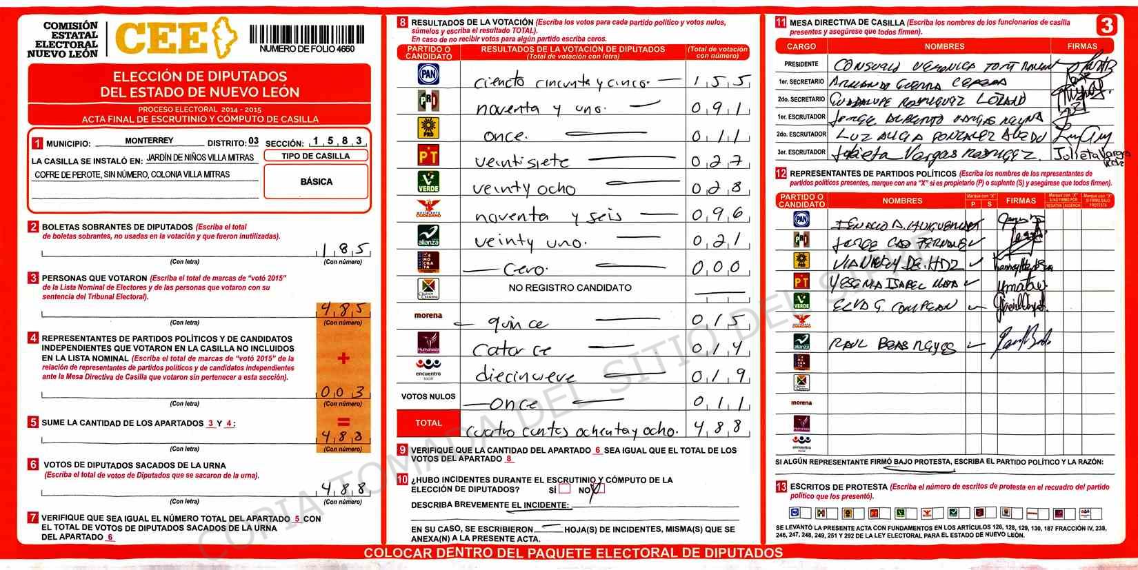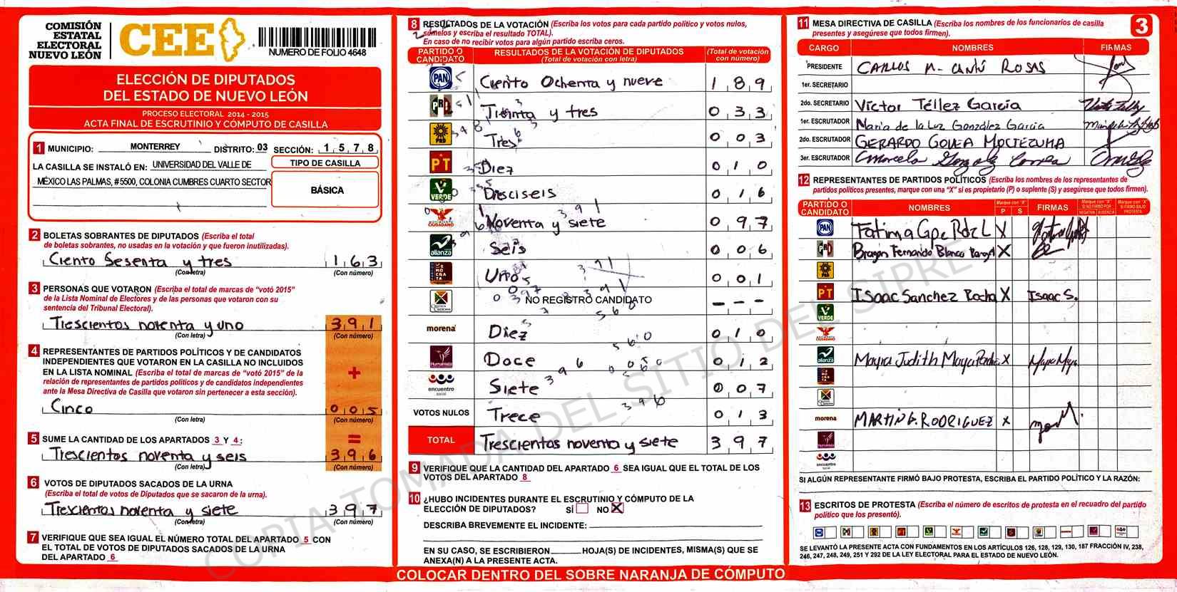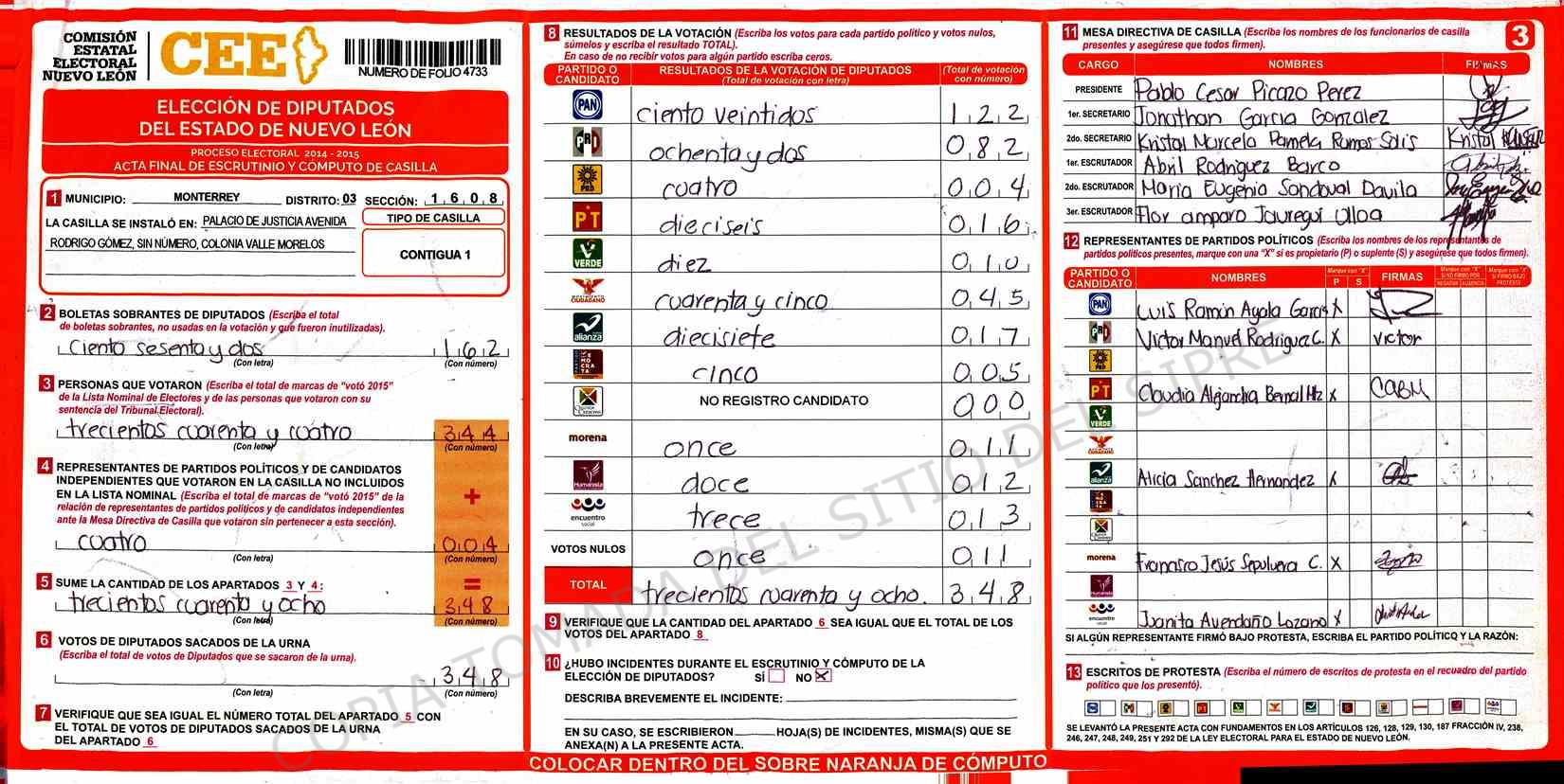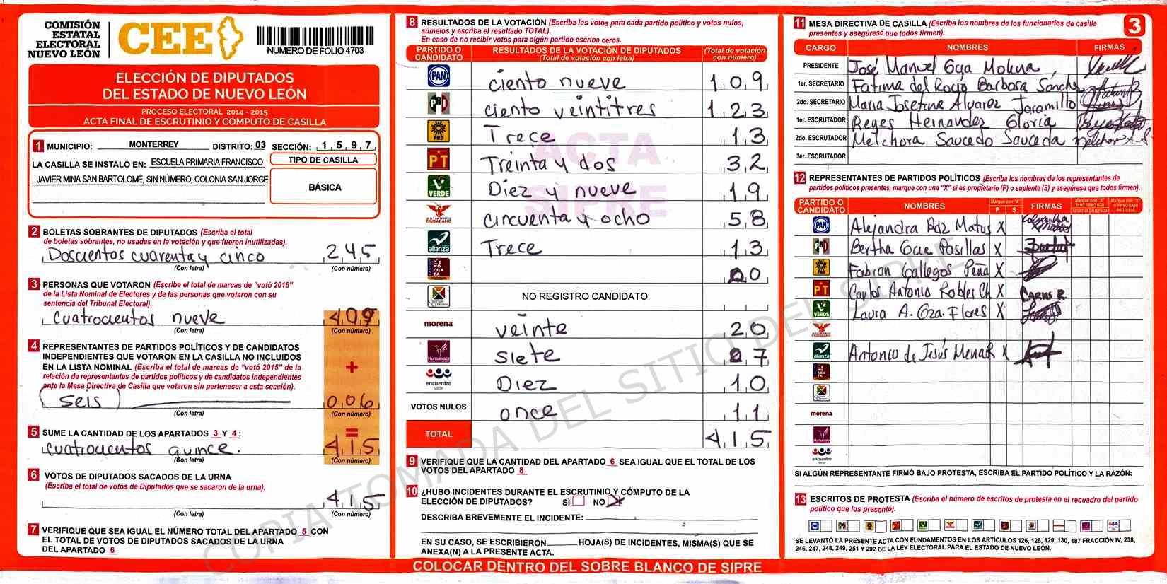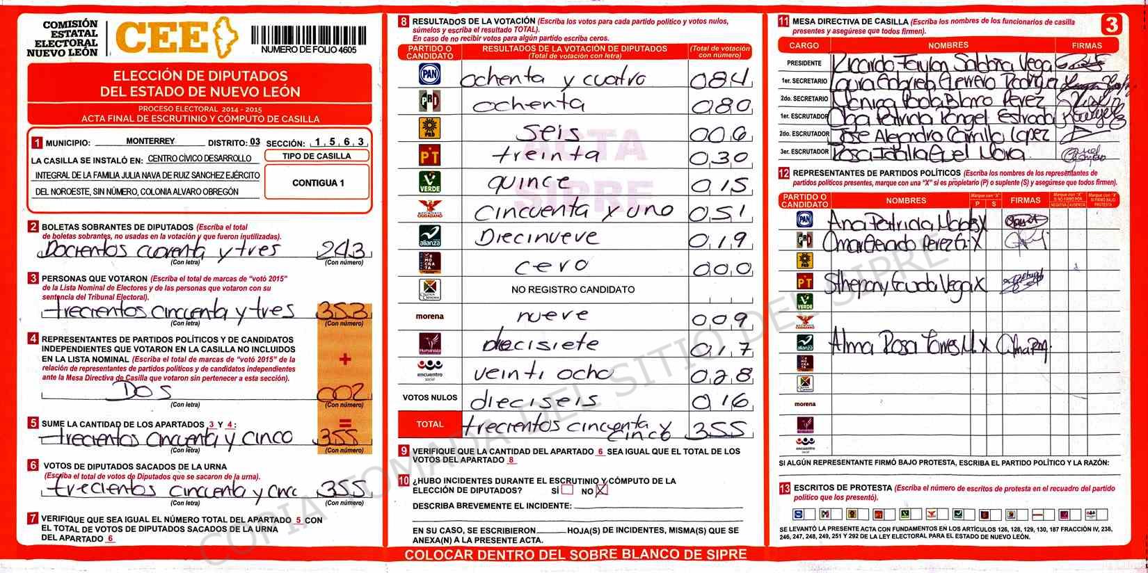 | Claves de Incidencia: | (1) Ilegible, (2) Mutilada, (3) Presenta Correcciones, (4) Presenta Borrones, (5) En Blanco, (6) Cifras Remarcadas, (7) Cifras de Mas, (8) Copiado Movido, (9) Con Signos Inválidos, (10) Excede Lista Nominal, (11) Otra |