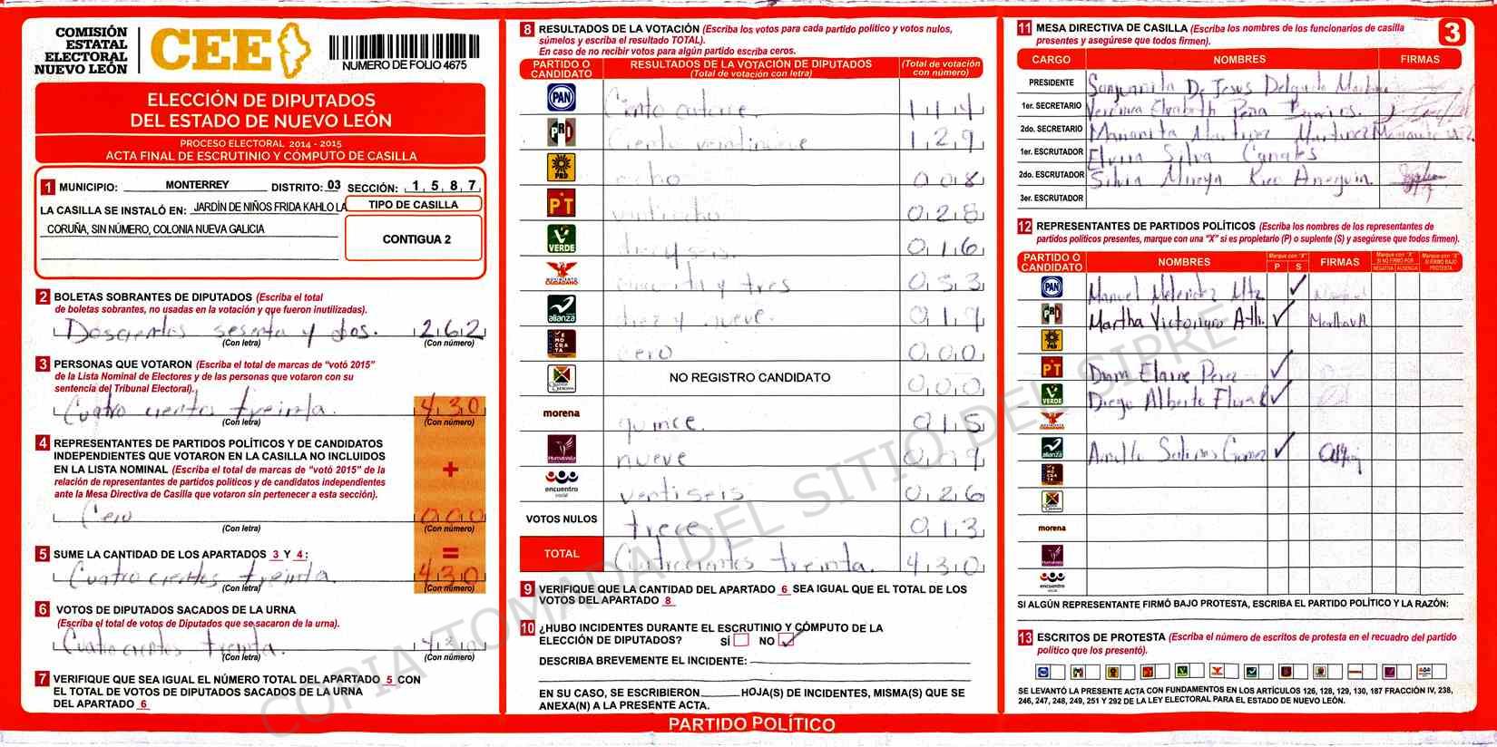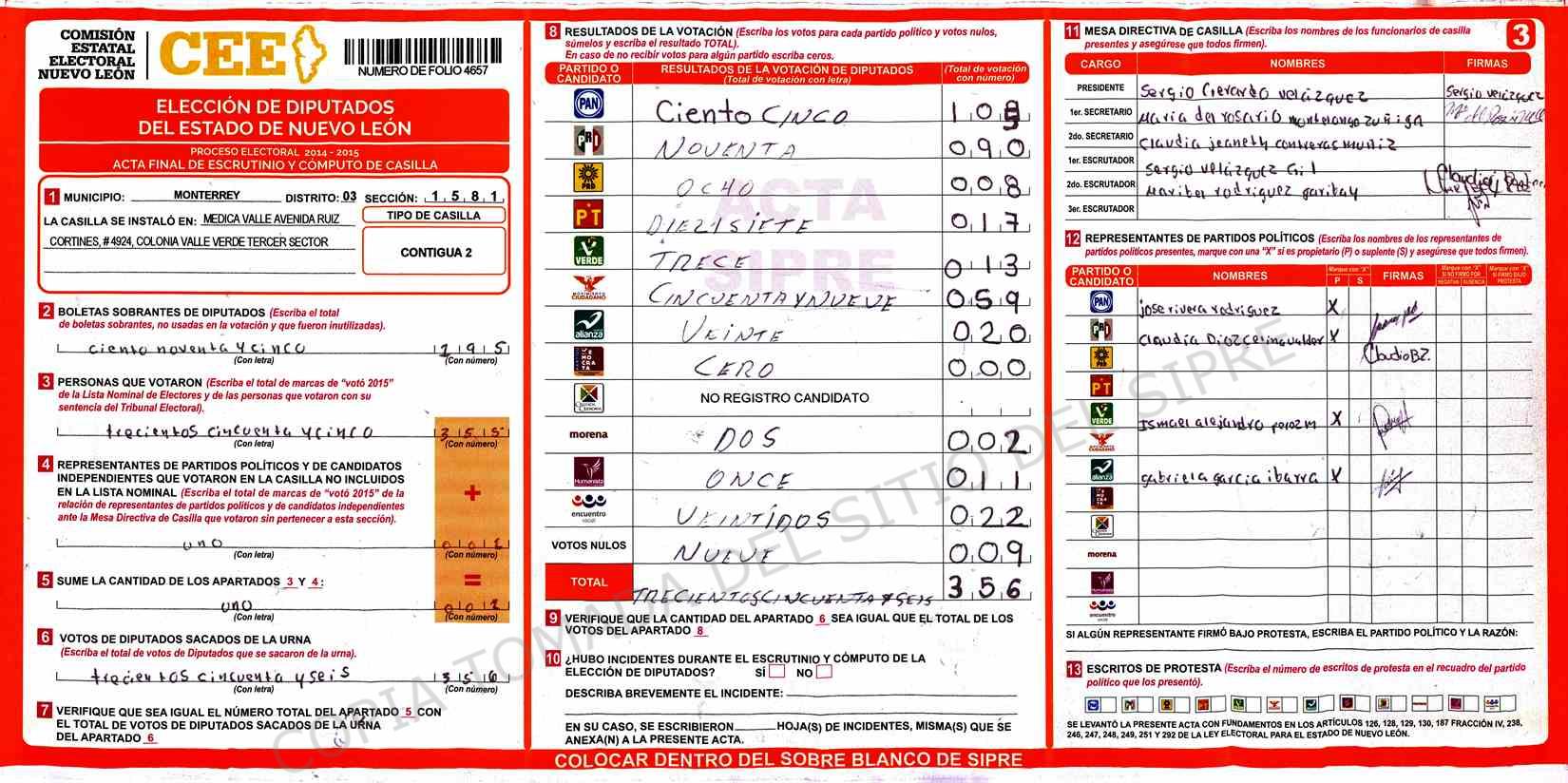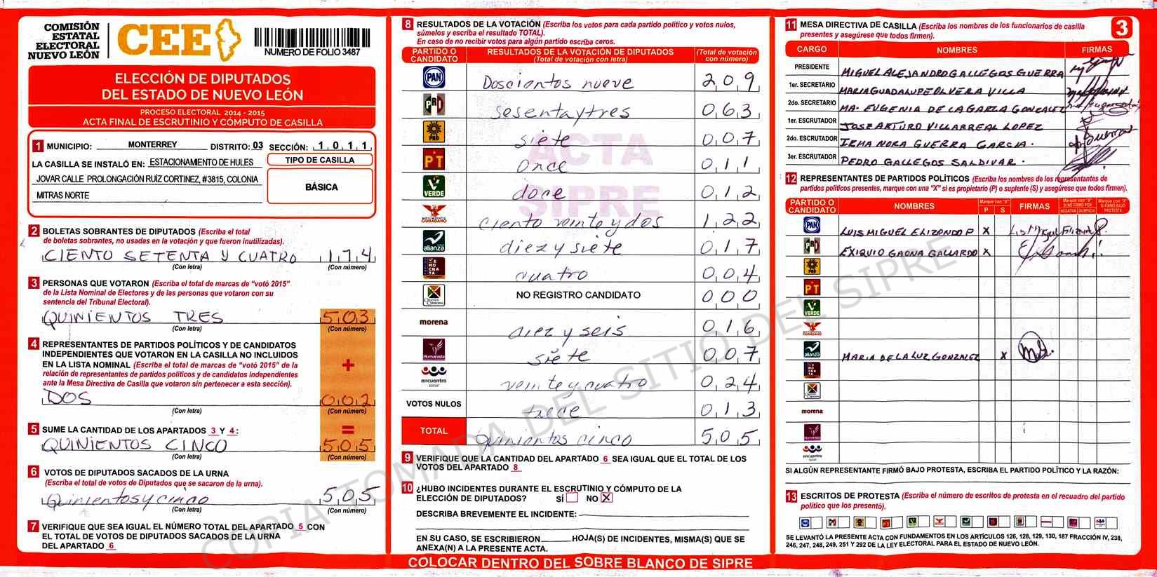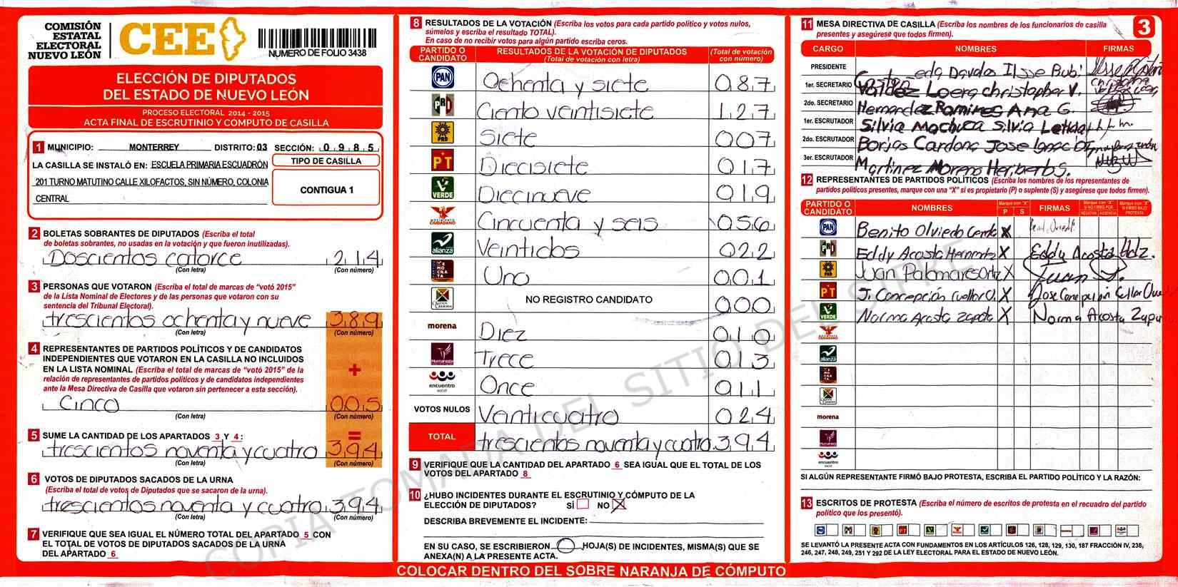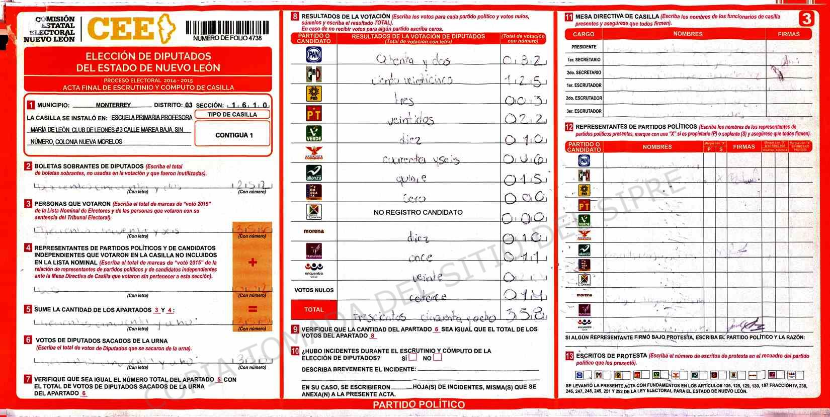 | Claves de Incidencia: | (1) Ilegible, (2) Mutilada, (3) Presenta Correcciones, (4) Presenta Borrones, (5) En Blanco, (6) Cifras Remarcadas, (7) Cifras de Mas, (8) Copiado Movido, (9) Con Signos Inválidos, (10) Excede Lista Nominal, (11) Otra |