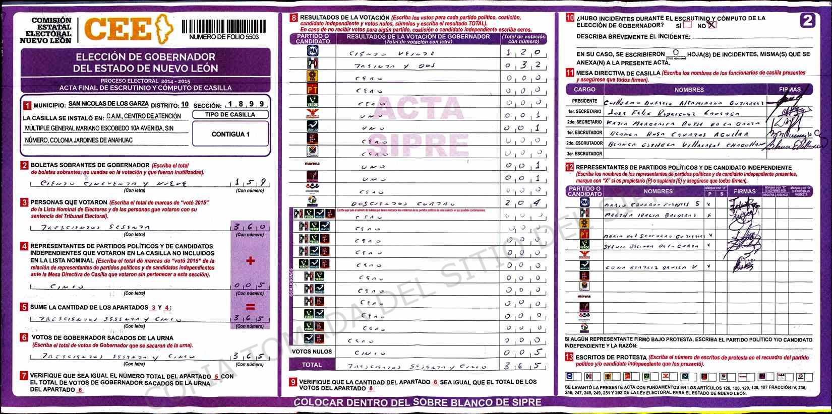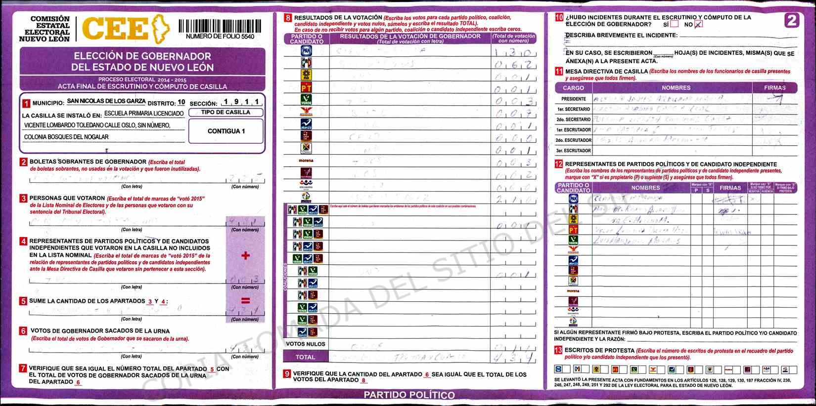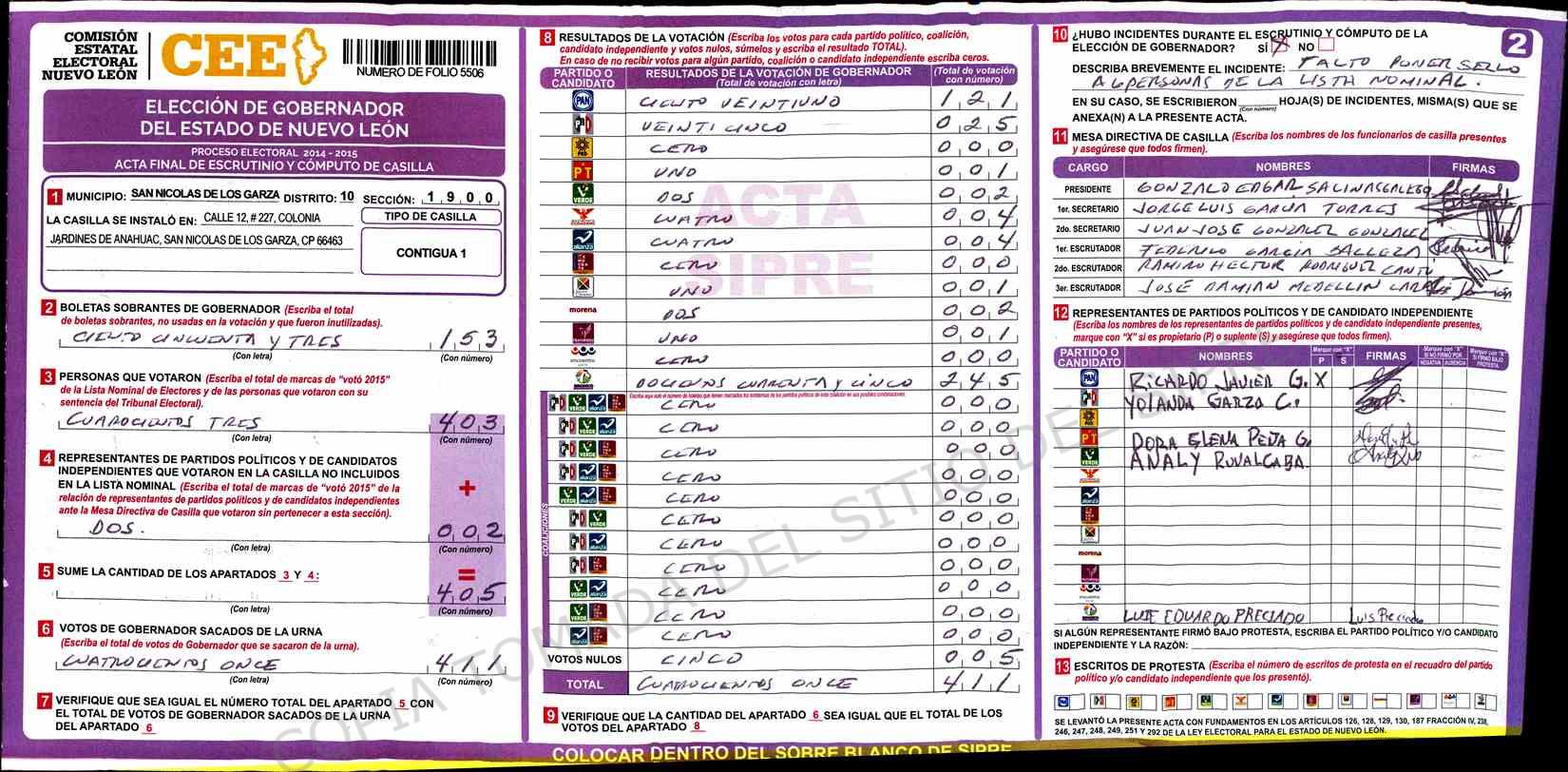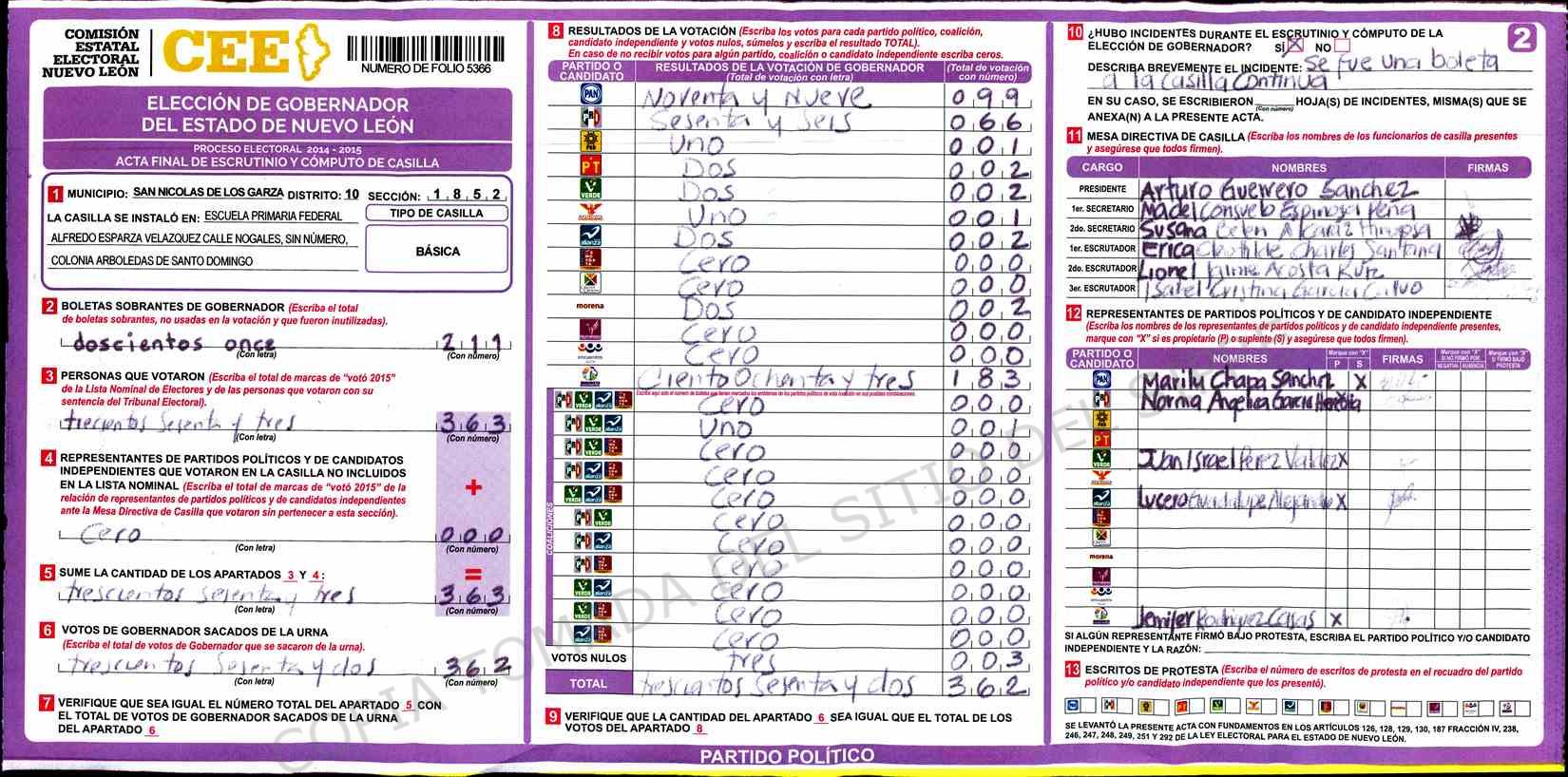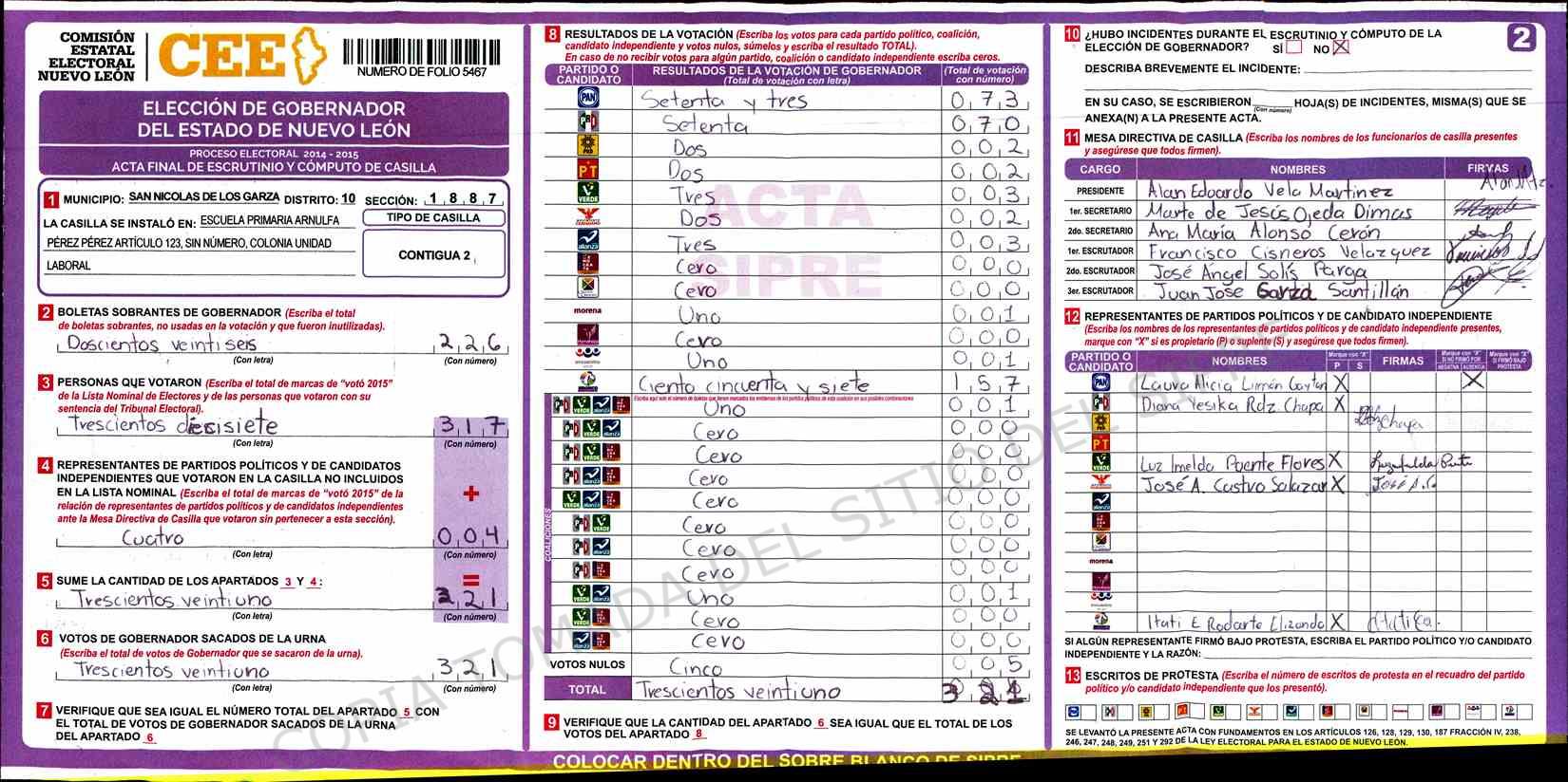 | Claves de Incidencia: | (1) Ilegible, (2) Mutilada, (3) Presenta Correcciones, (4) Presenta Borrones, (5) En Blanco, (6) Cifras Remarcadas, (7) Cifras de Mas, (8) Copiado Movido, (9) Con Signos Inválidos, (10) Excede Lista Nominal, (11) Otra |