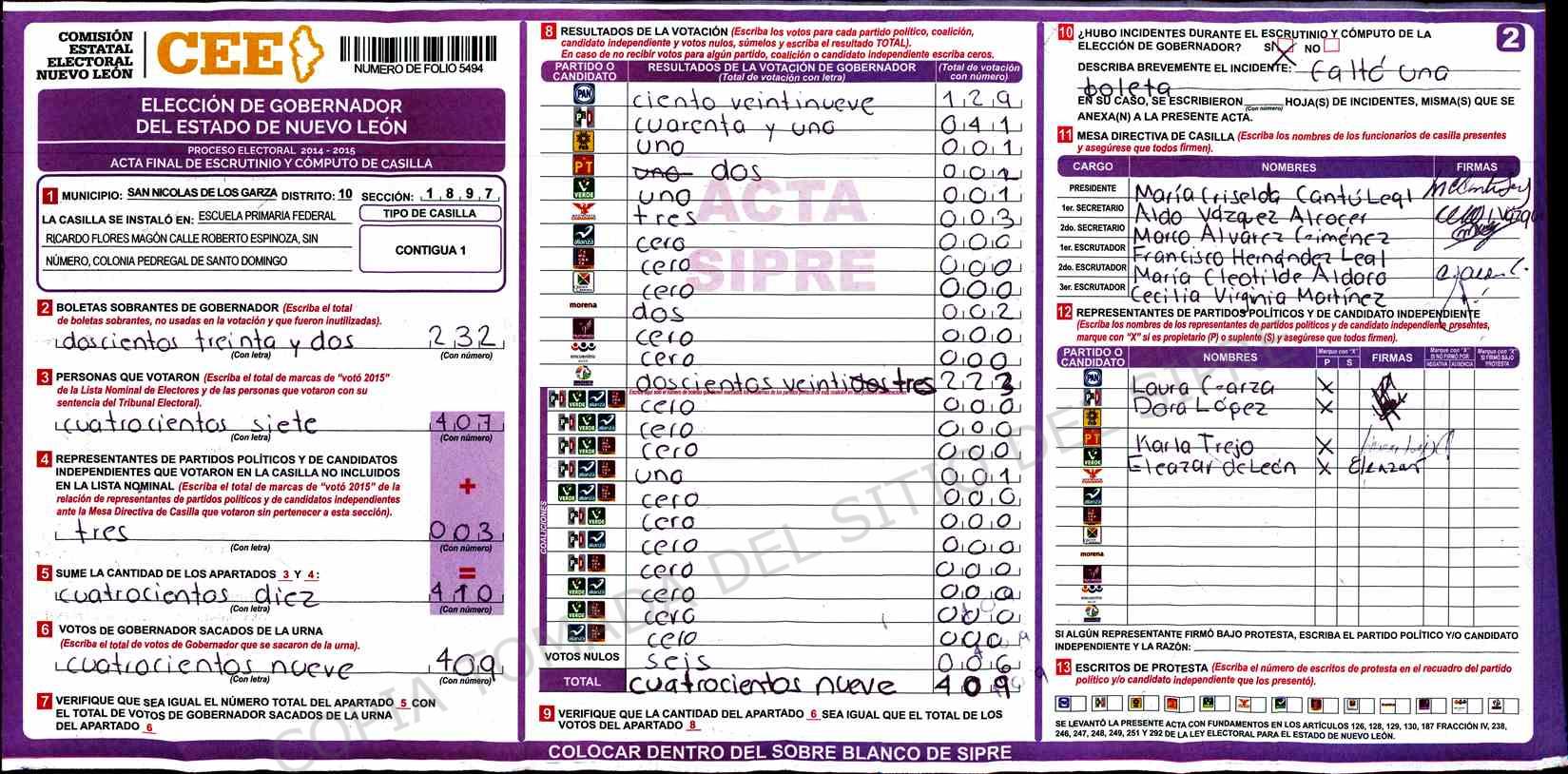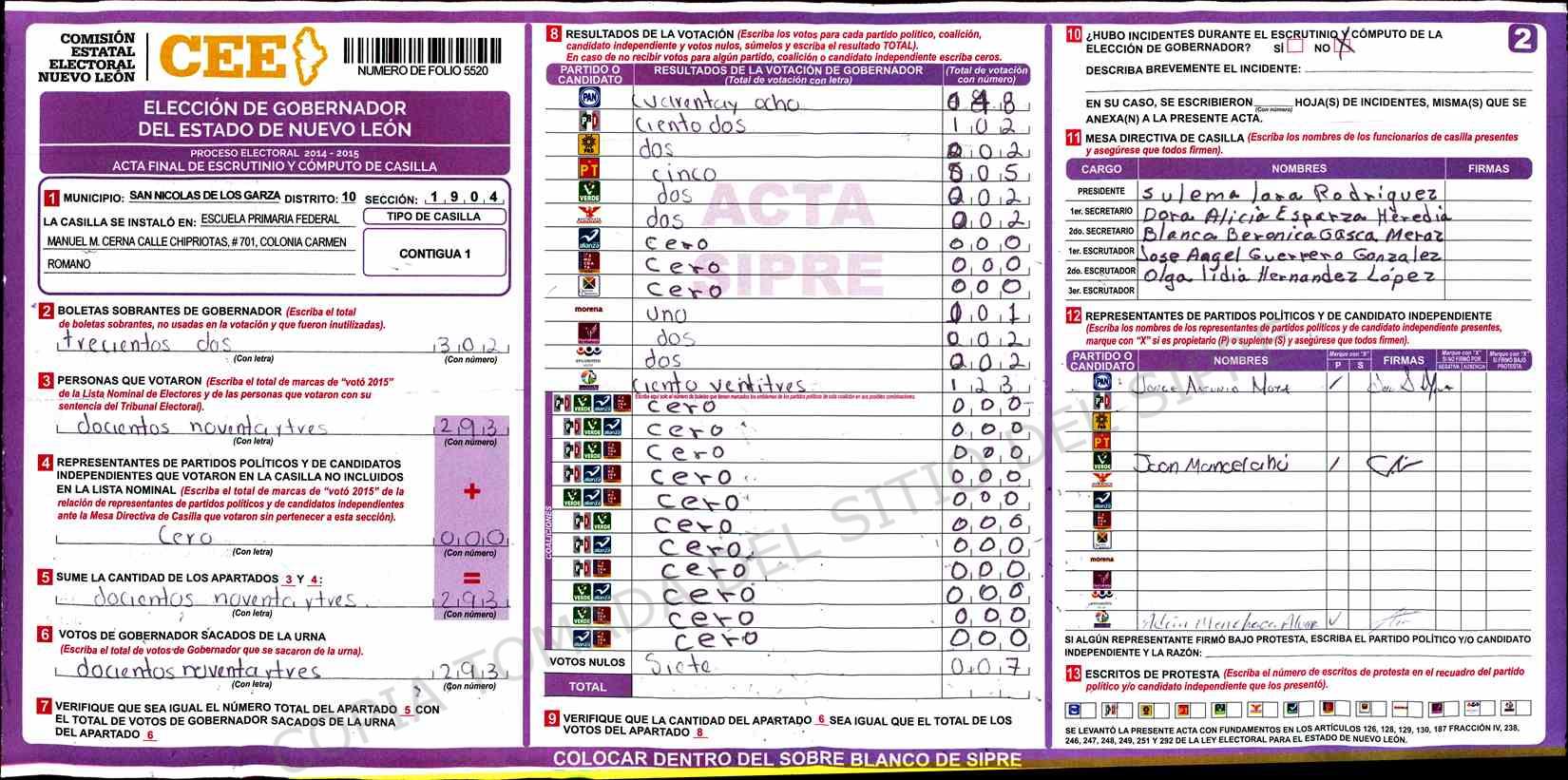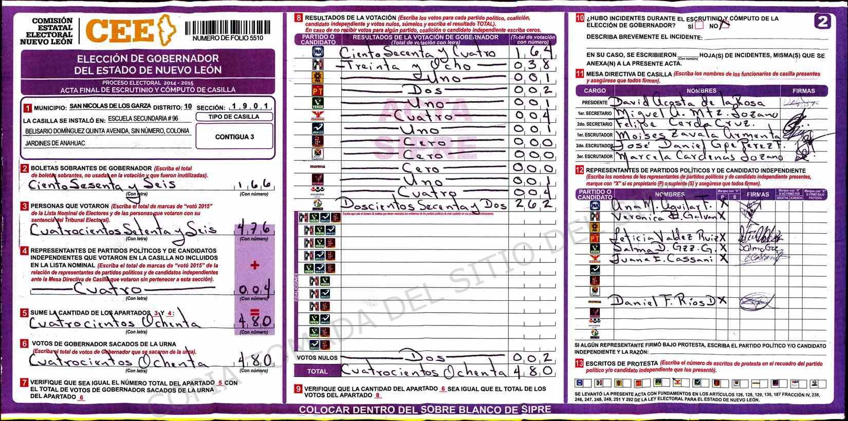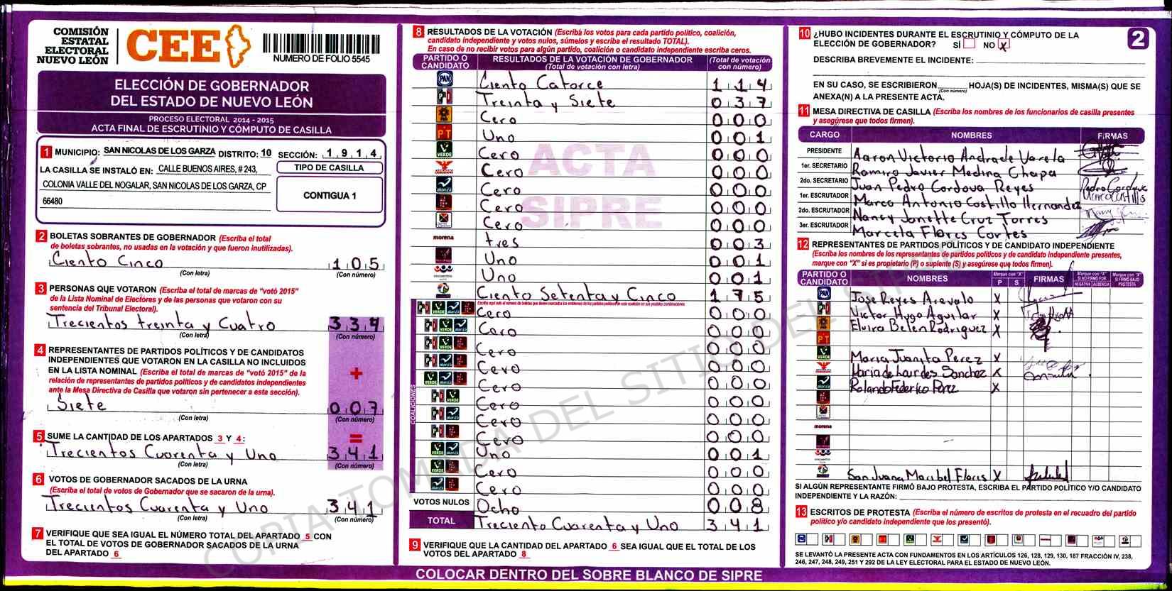 | Claves de Incidencia: | (1) Ilegible, (2) Mutilada, (3) Presenta Correcciones, (4) Presenta Borrones, (5) En Blanco, (6) Cifras Remarcadas, (7) Cifras de Mas, (8) Copiado Movido, (9) Con Signos Inválidos, (10) Excede Lista Nominal, (11) Otra |