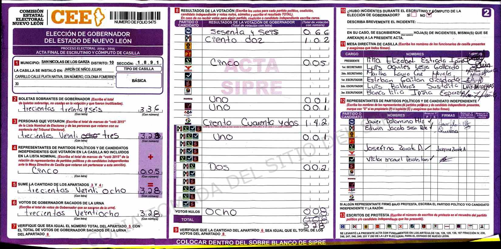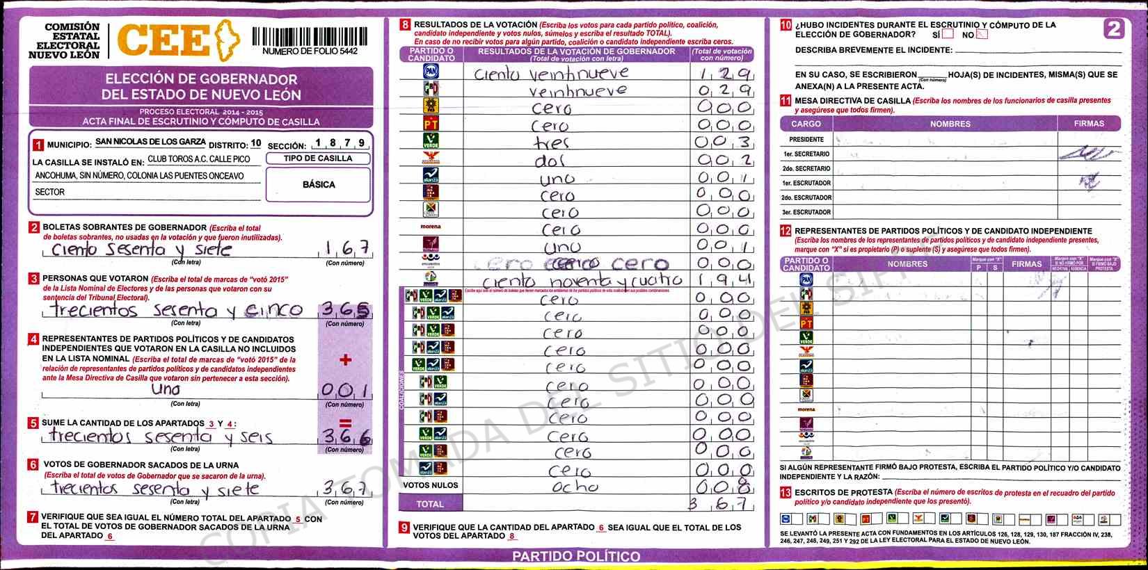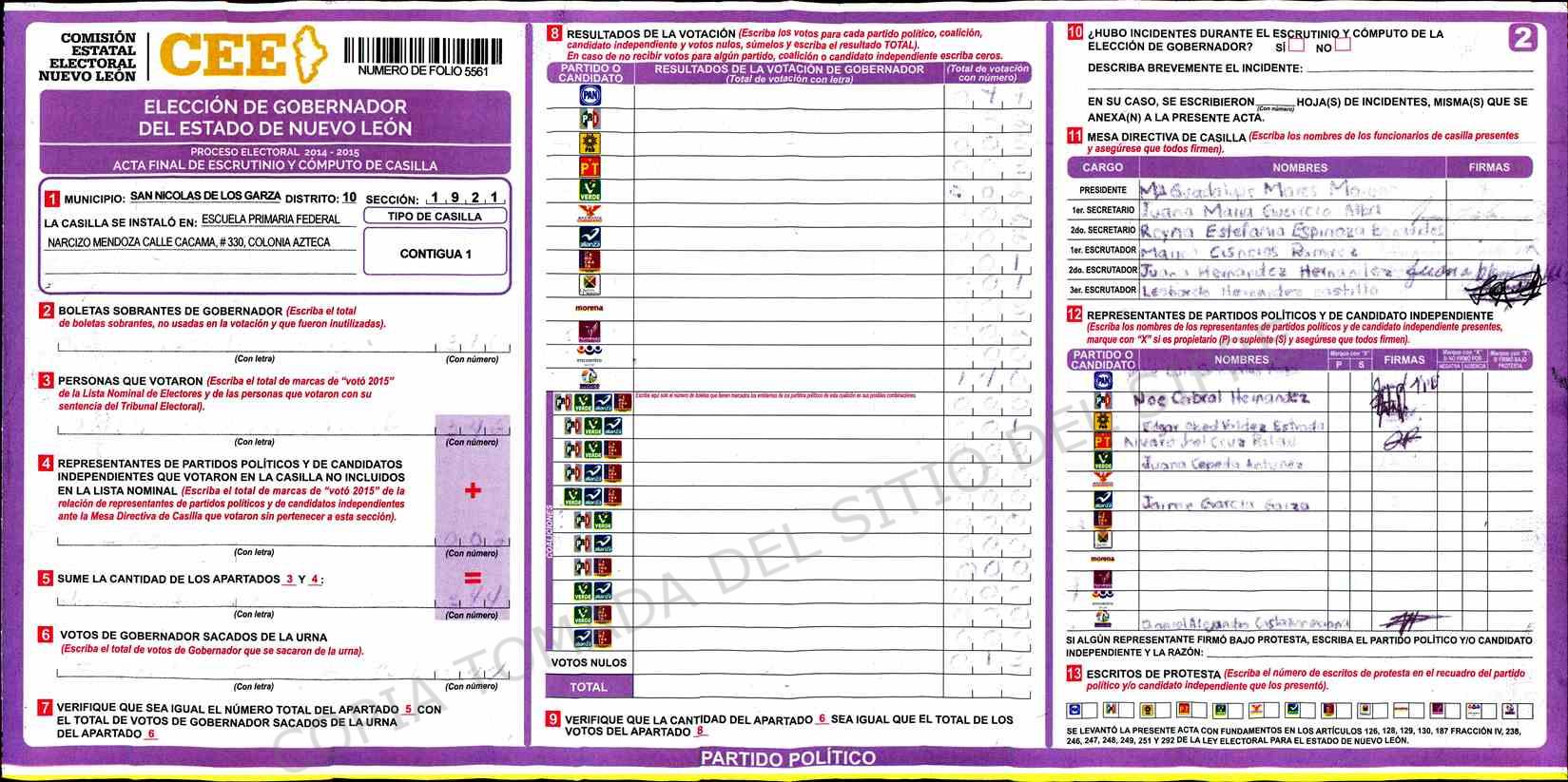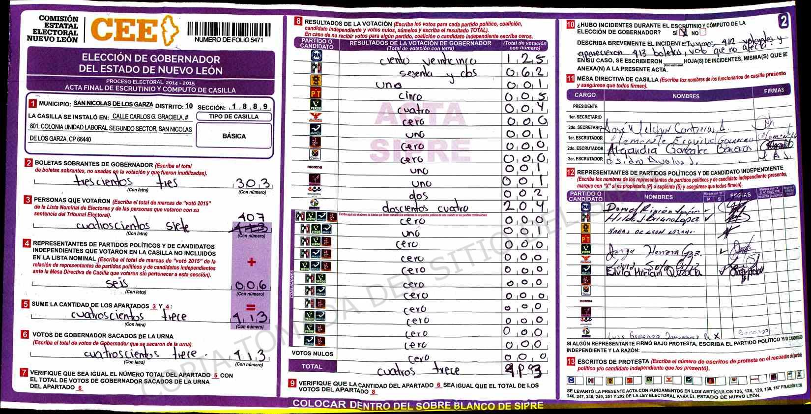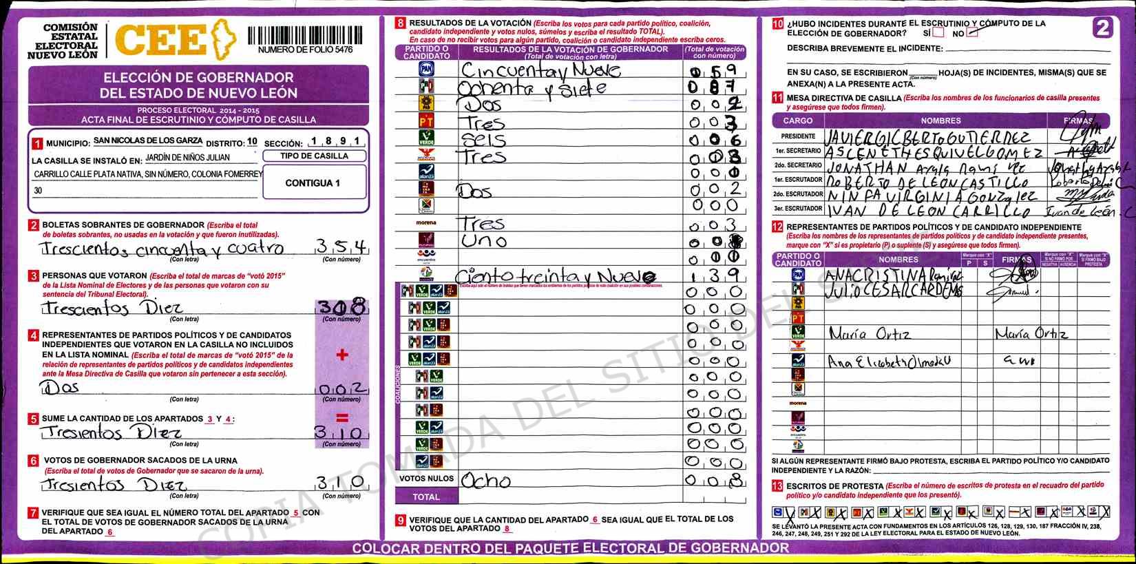 | Claves de Incidencia: | (1) Ilegible, (2) Mutilada, (3) Presenta Correcciones, (4) Presenta Borrones, (5) En Blanco, (6) Cifras Remarcadas, (7) Cifras de Mas, (8) Copiado Movido, (9) Con Signos Inválidos, (10) Excede Lista Nominal, (11) Otra |