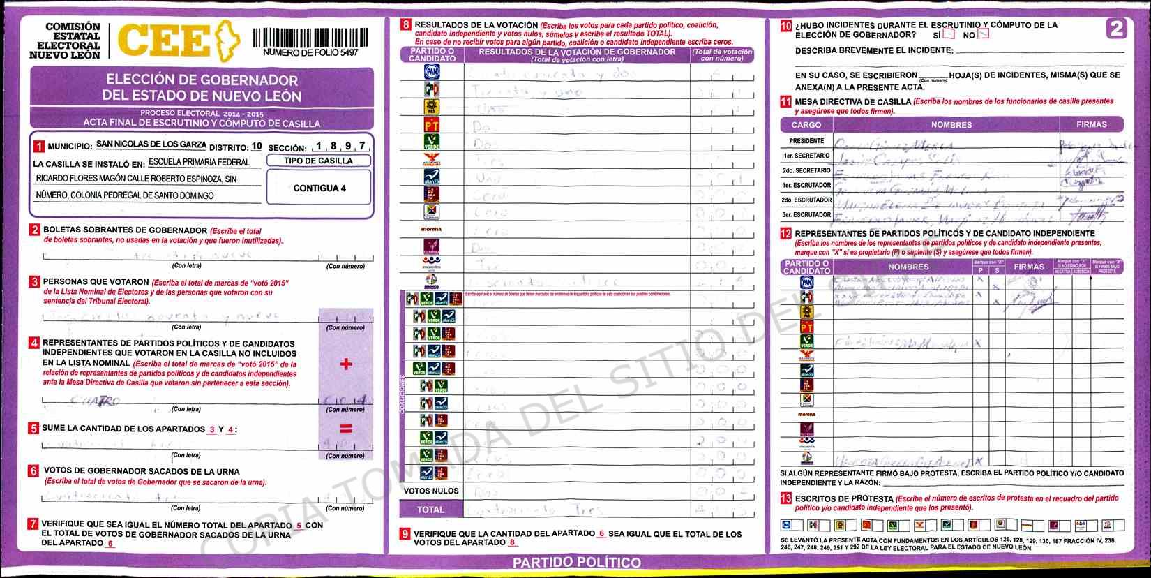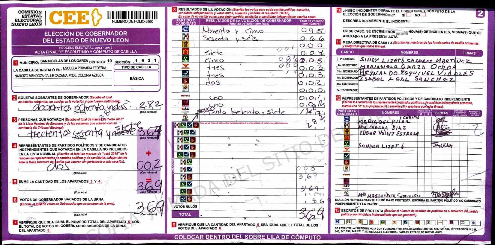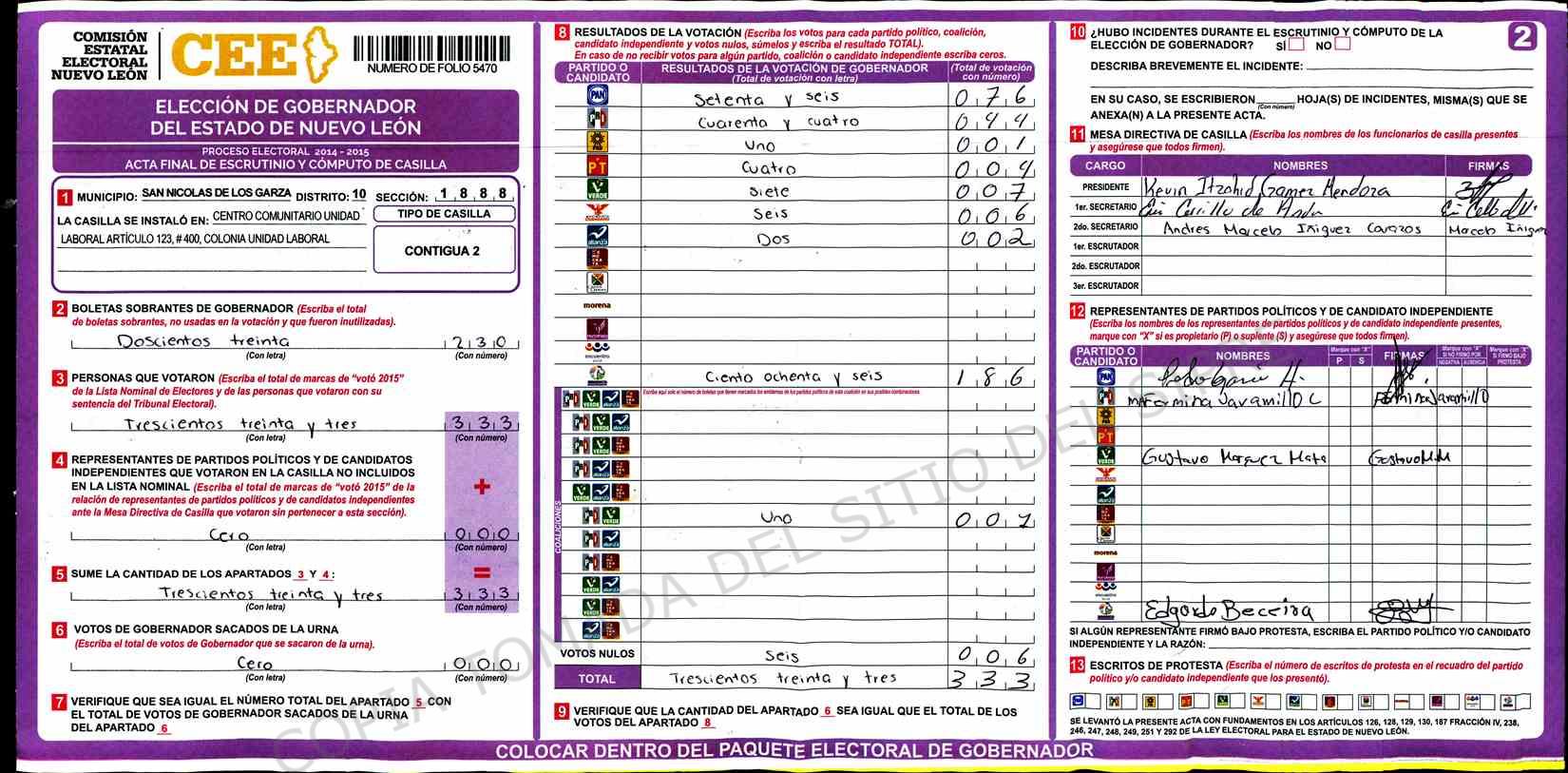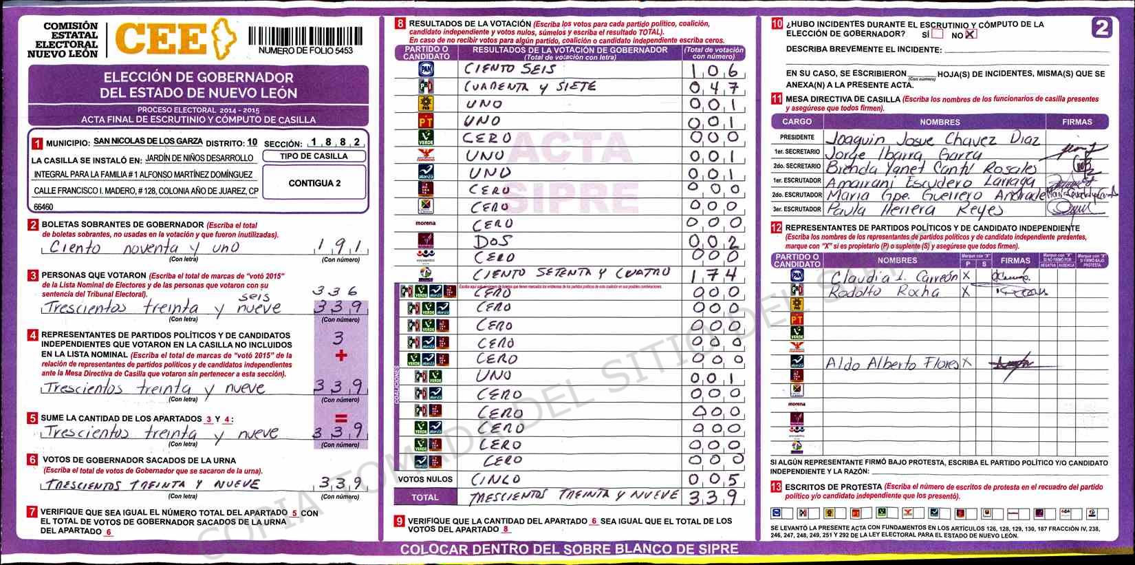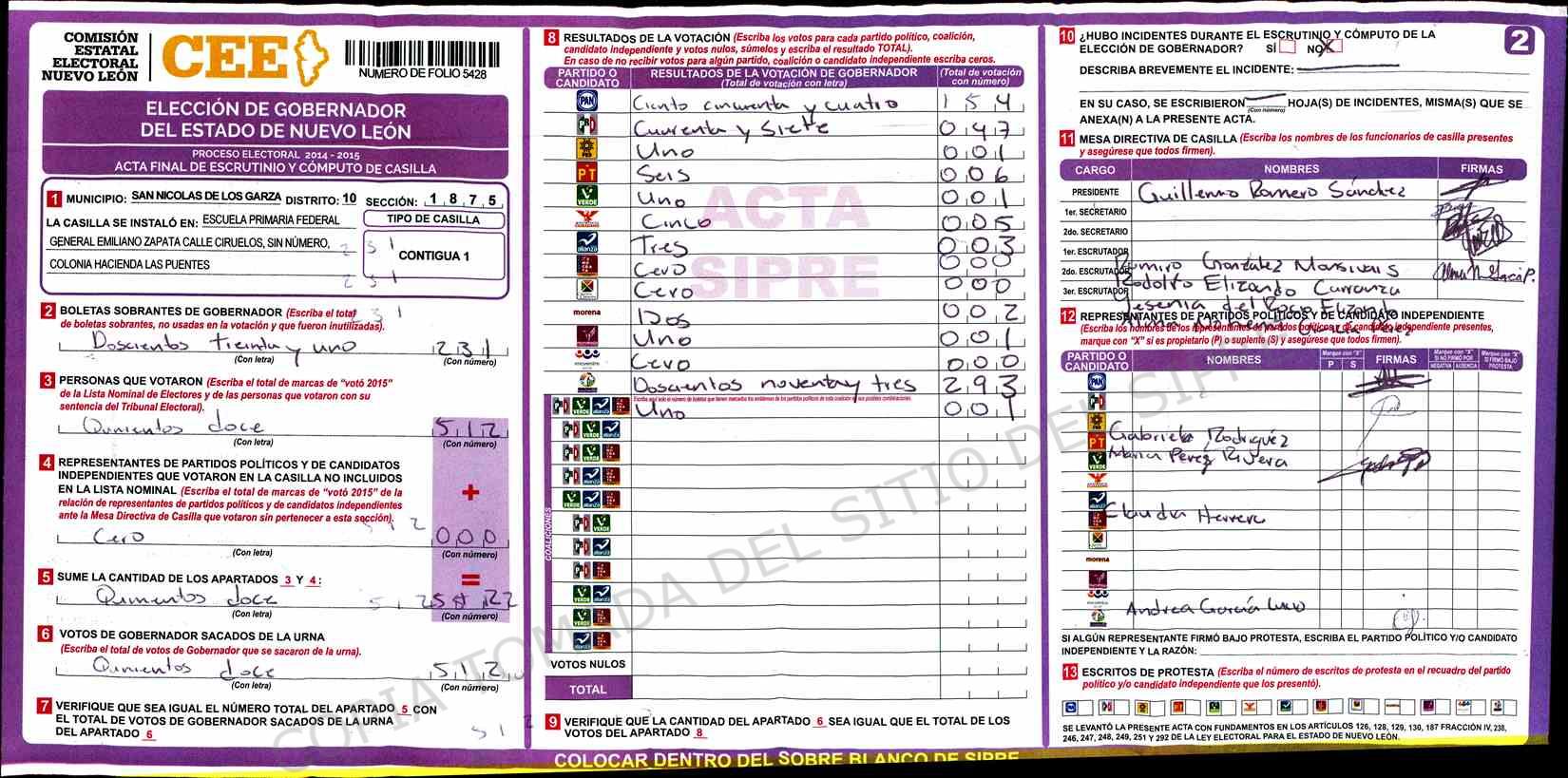 | Claves de Incidencia: | (1) Ilegible, (2) Mutilada, (3) Presenta Correcciones, (4) Presenta Borrones, (5) En Blanco, (6) Cifras Remarcadas, (7) Cifras de Mas, (8) Copiado Movido, (9) Con Signos Inválidos, (10) Excede Lista Nominal, (11) Otra |