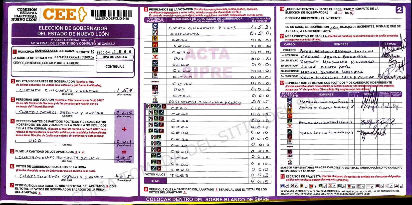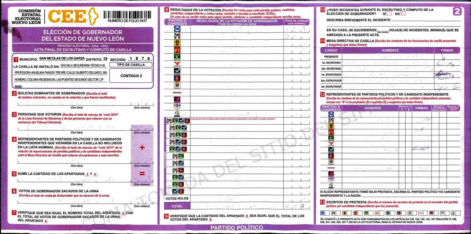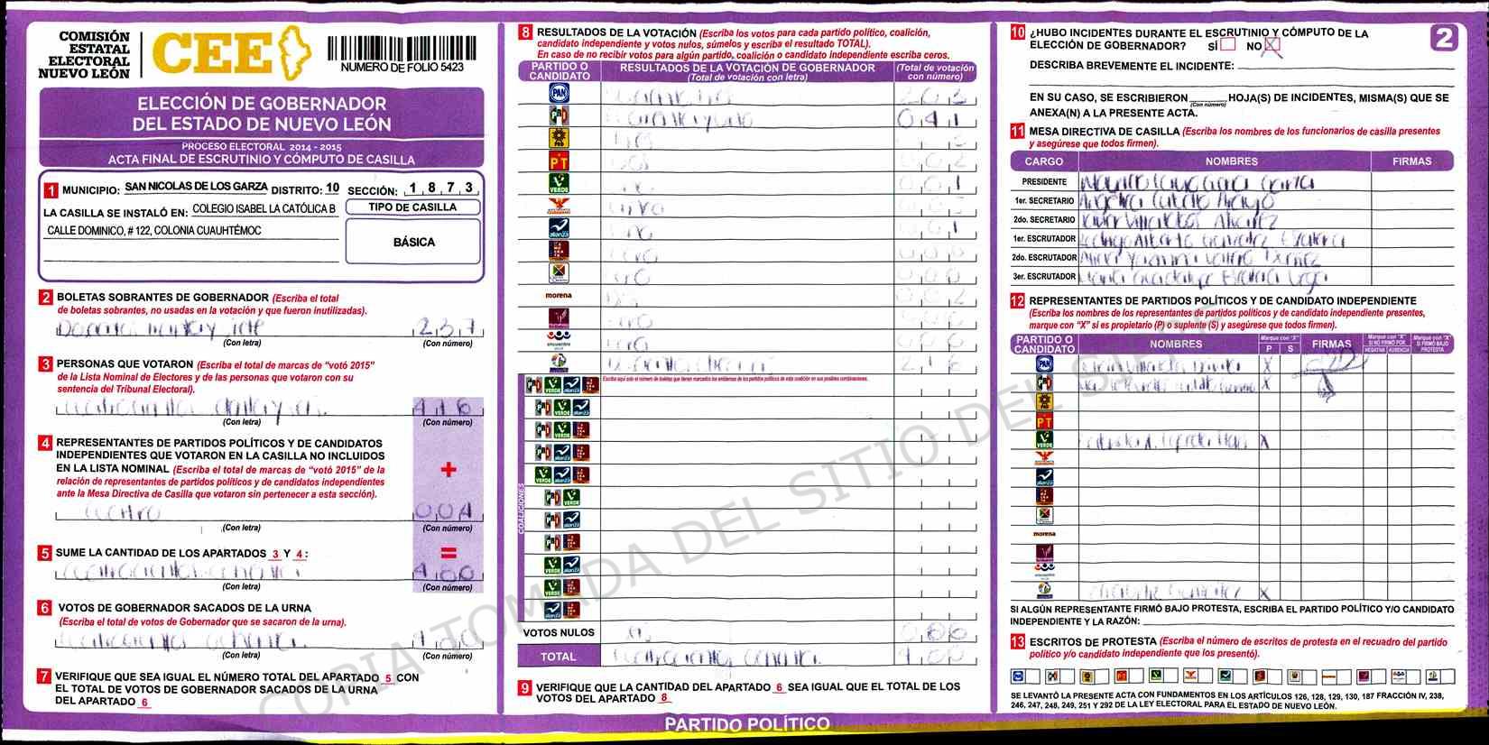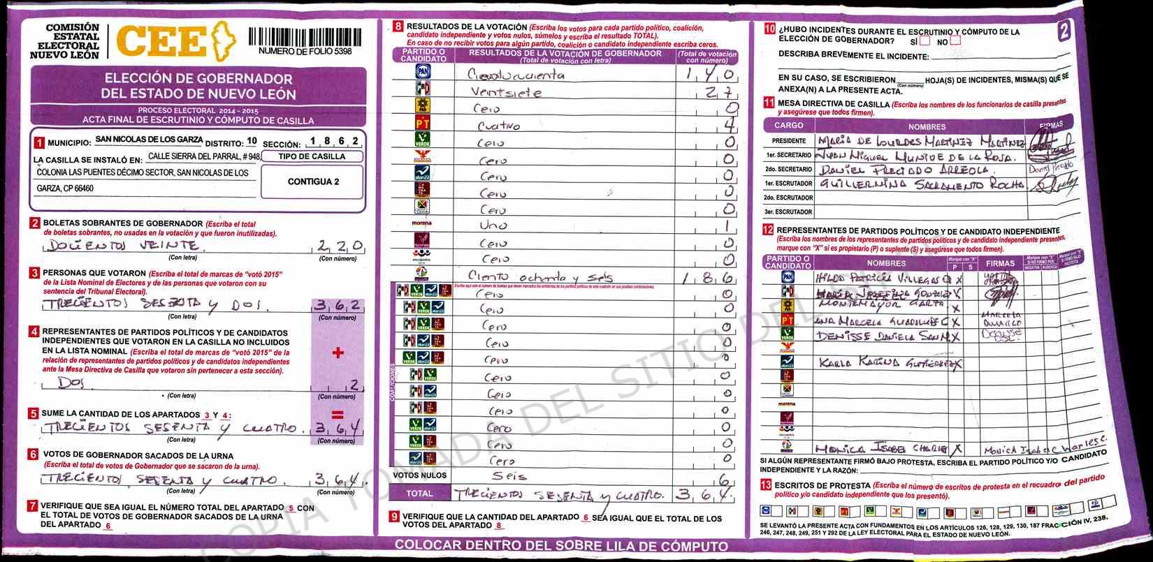 | Claves de Incidencia: | (1) Ilegible, (2) Mutilada, (3) Presenta Correcciones, (4) Presenta Borrones, (5) En Blanco, (6) Cifras Remarcadas, (7) Cifras de Mas, (8) Copiado Movido, (9) Con Signos Inválidos, (10) Excede Lista Nominal, (11) Otra |
