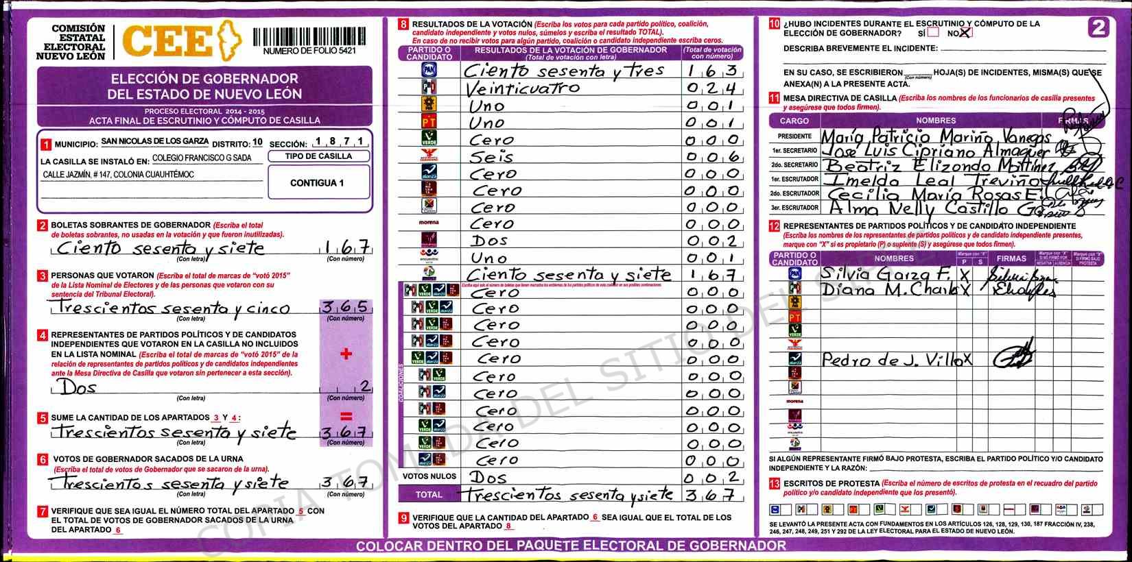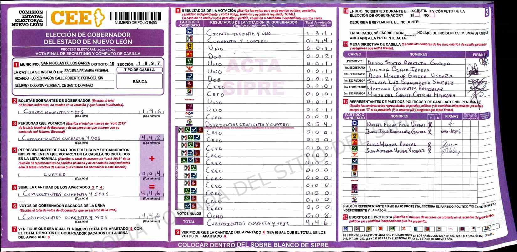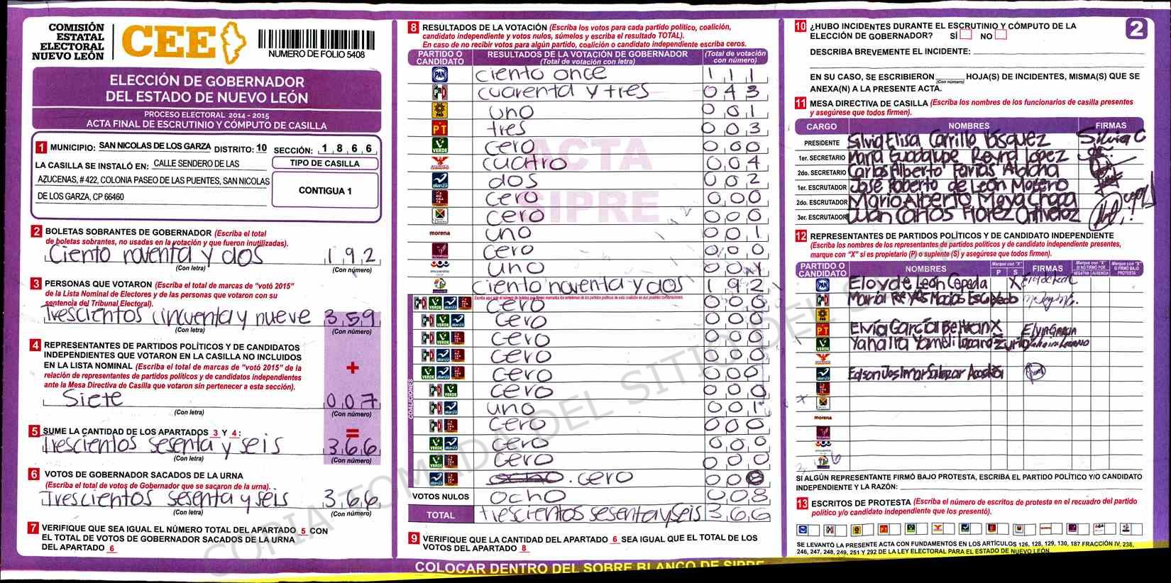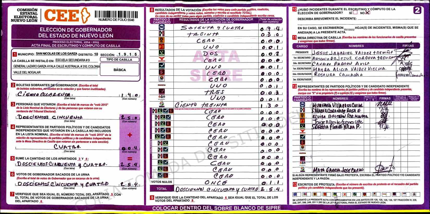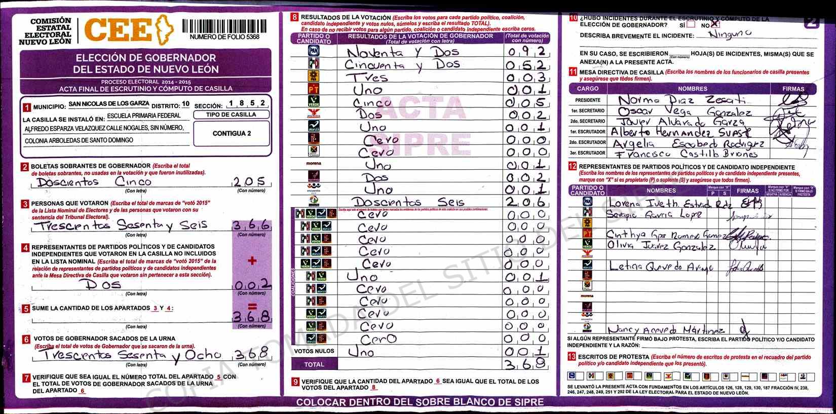 | Claves de Incidencia: | (1) Ilegible, (2) Mutilada, (3) Presenta Correcciones, (4) Presenta Borrones, (5) En Blanco, (6) Cifras Remarcadas, (7) Cifras de Mas, (8) Copiado Movido, (9) Con Signos Inválidos, (10) Excede Lista Nominal, (11) Otra |