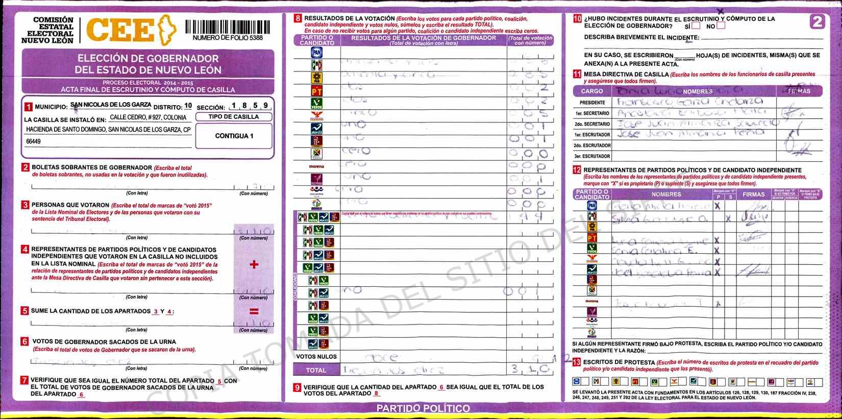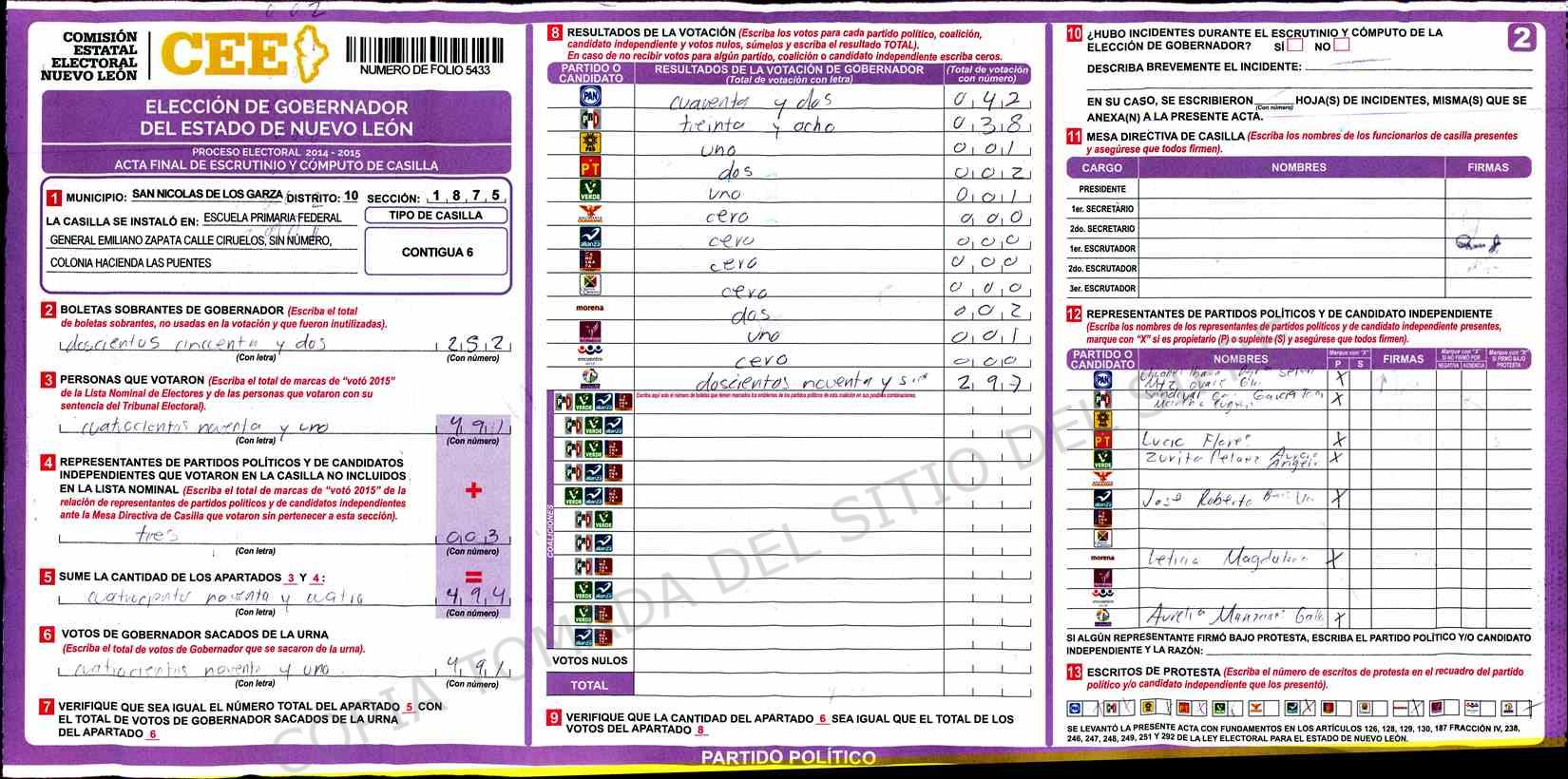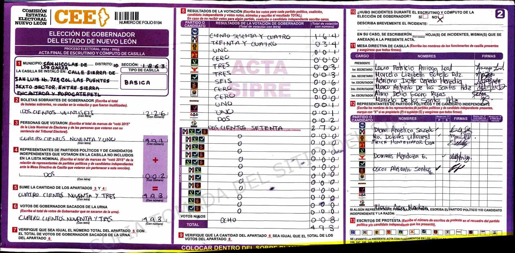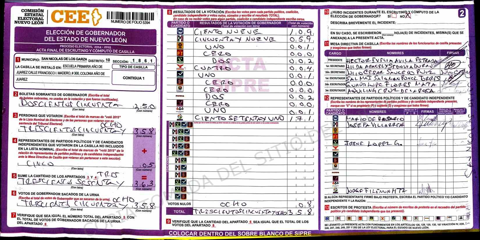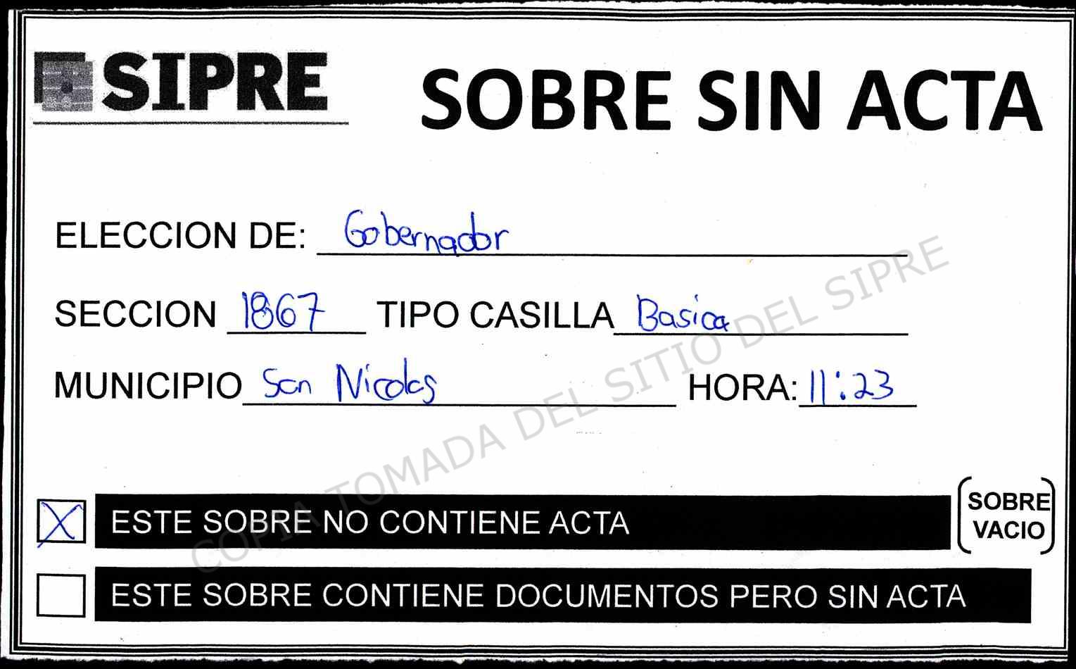 | Claves de Incidencia: | (1) Ilegible, (2) Mutilada, (3) Presenta Correcciones, (4) Presenta Borrones, (5) En Blanco, (6) Cifras Remarcadas, (7) Cifras de Mas, (8) Copiado Movido, (9) Con Signos Inválidos, (10) Excede Lista Nominal, (11) Otra |
