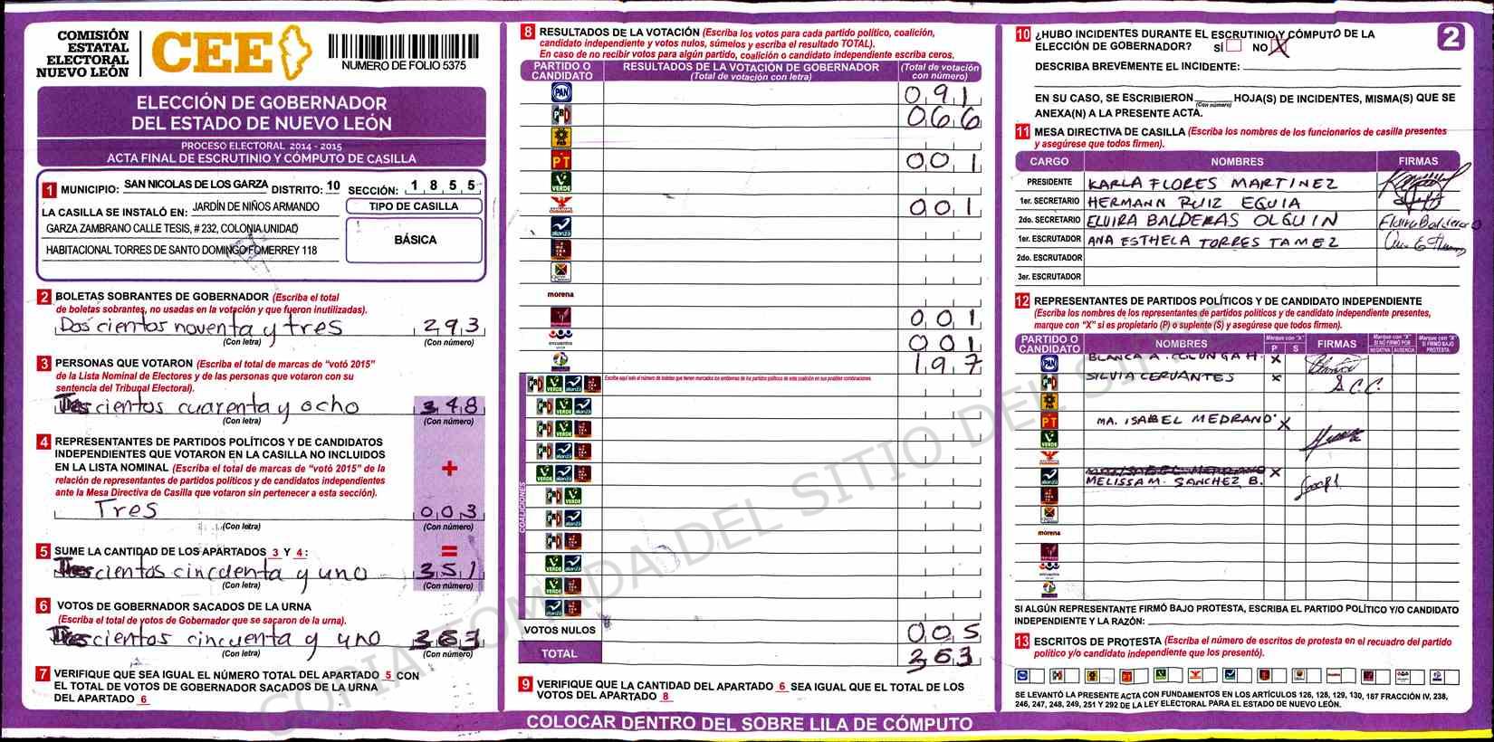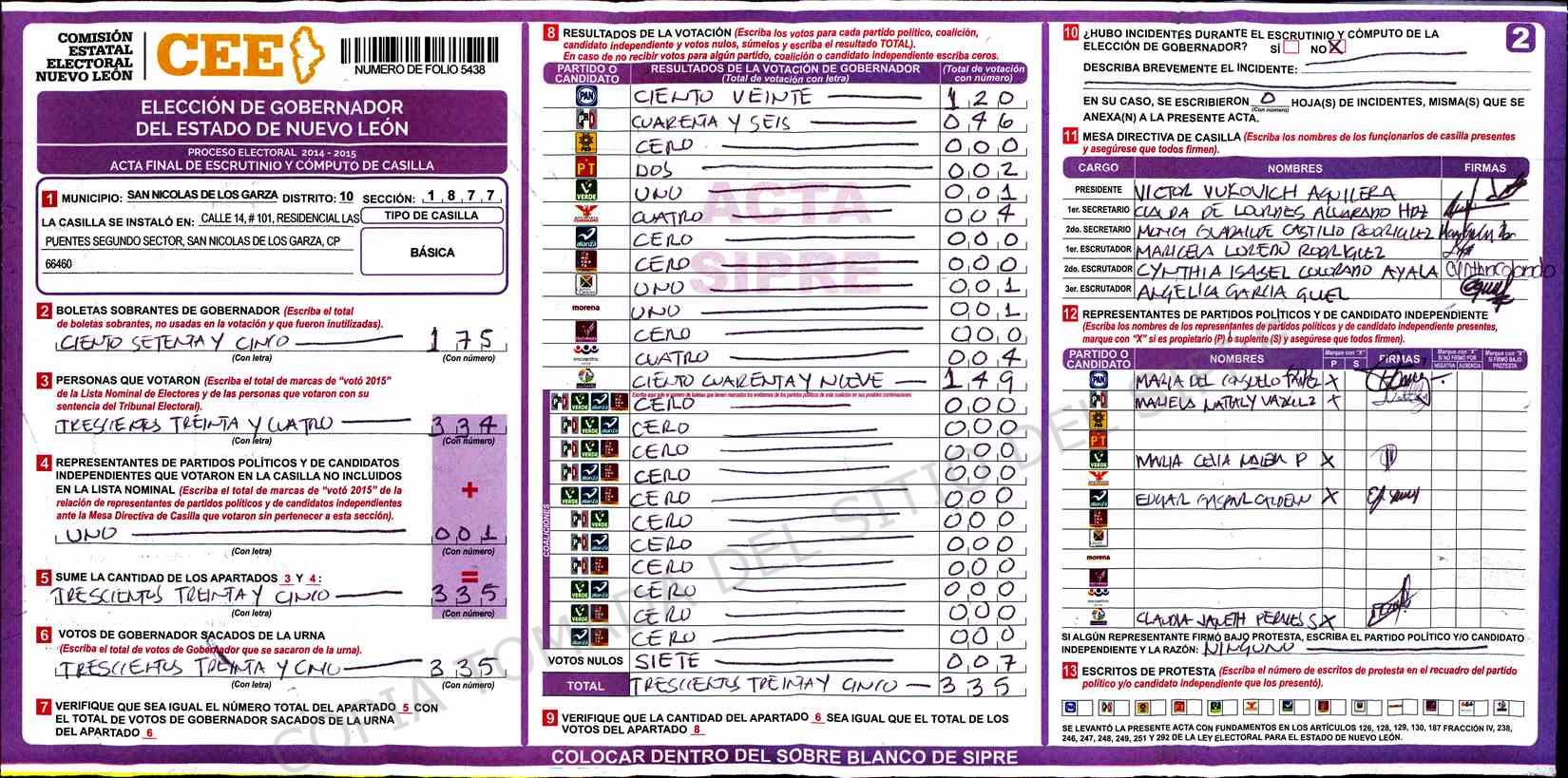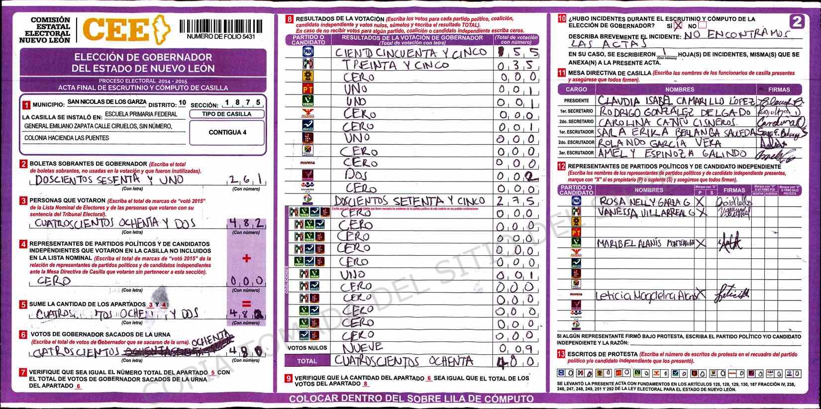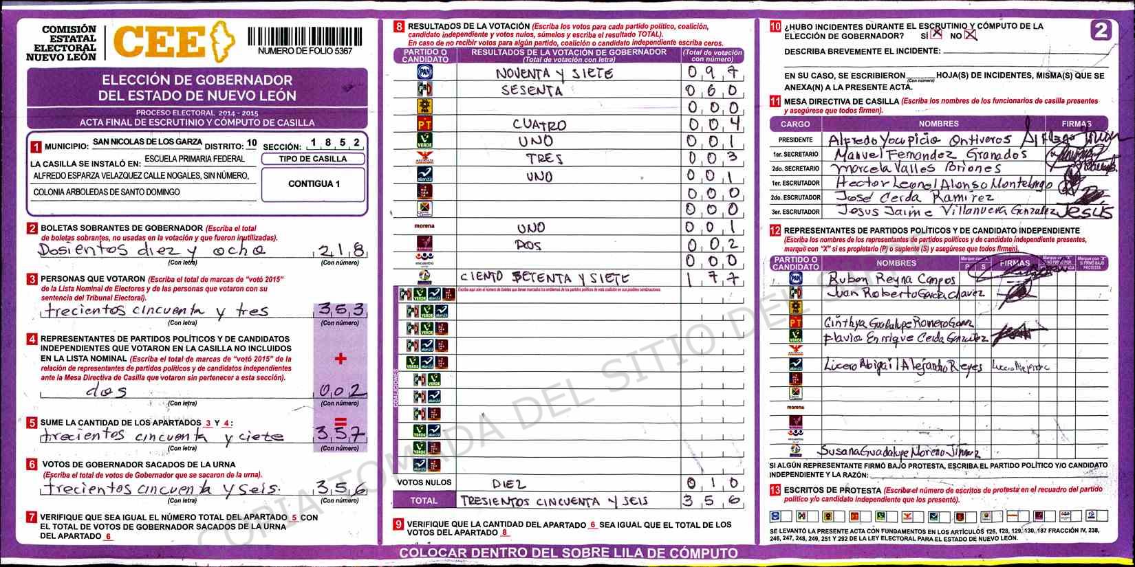 | Claves de Incidencia: | (1) Ilegible, (2) Mutilada, (3) Presenta Correcciones, (4) Presenta Borrones, (5) En Blanco, (6) Cifras Remarcadas, (7) Cifras de Mas, (8) Copiado Movido, (9) Con Signos Inválidos, (10) Excede Lista Nominal, (11) Otra |