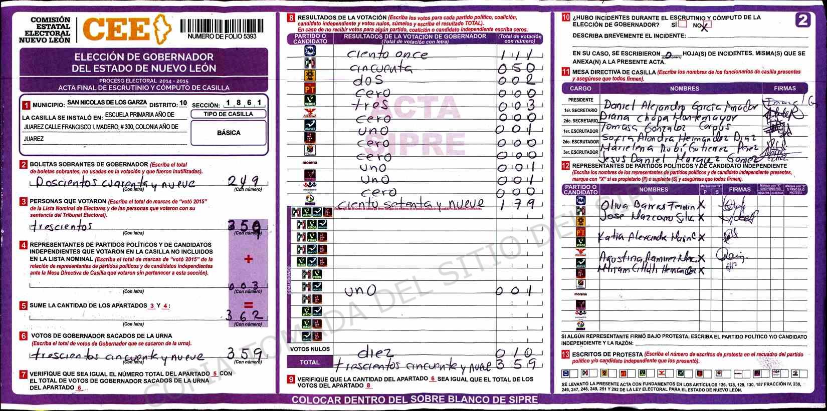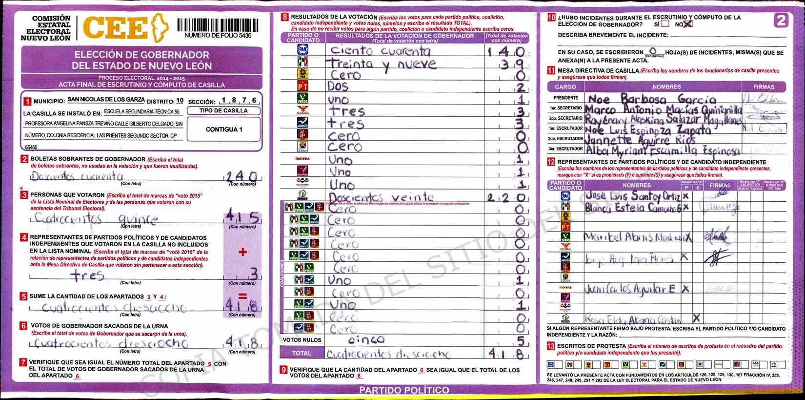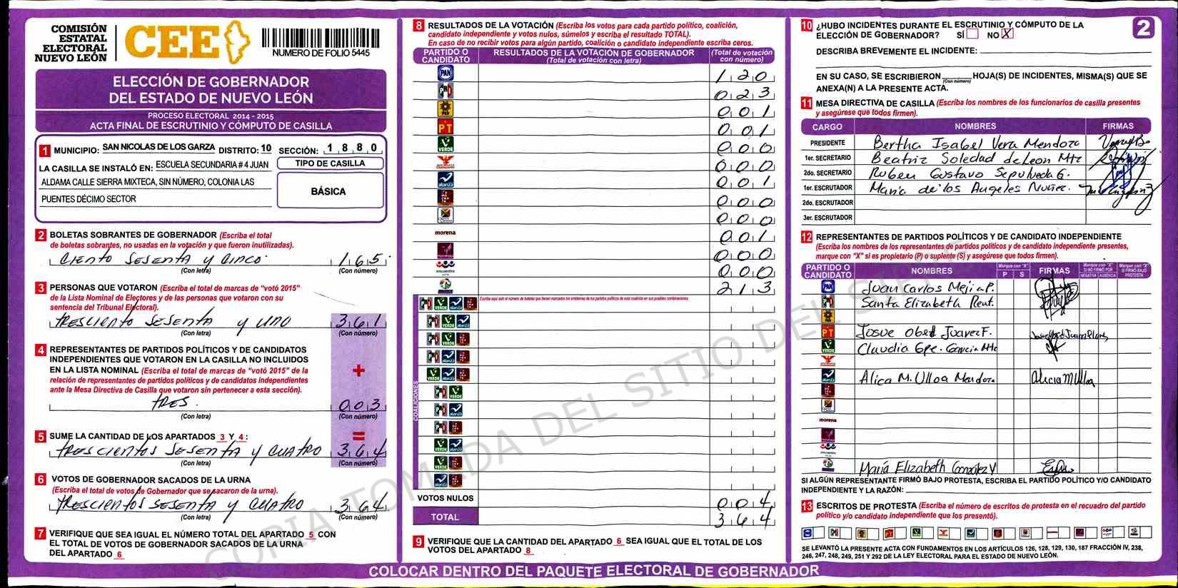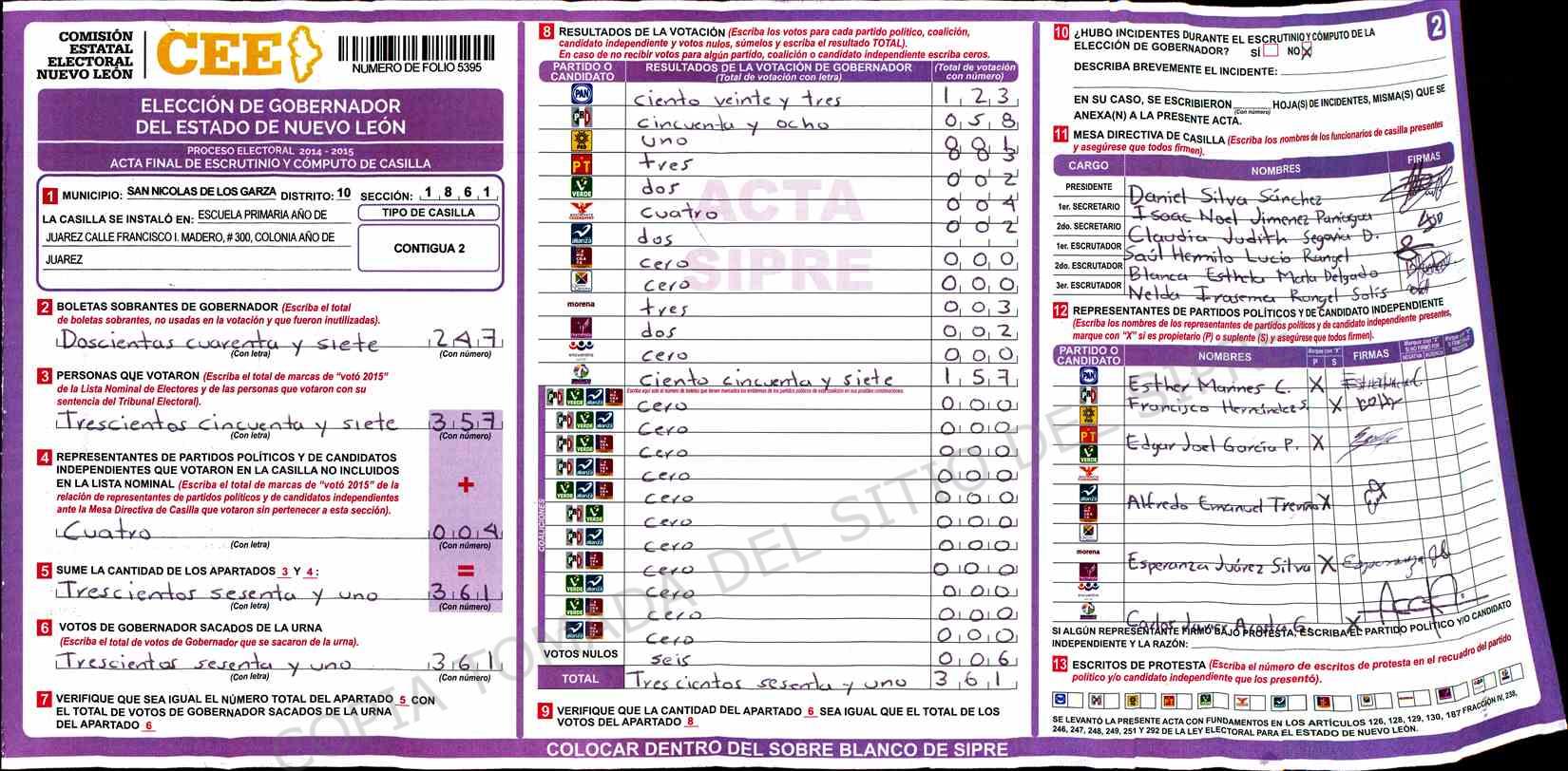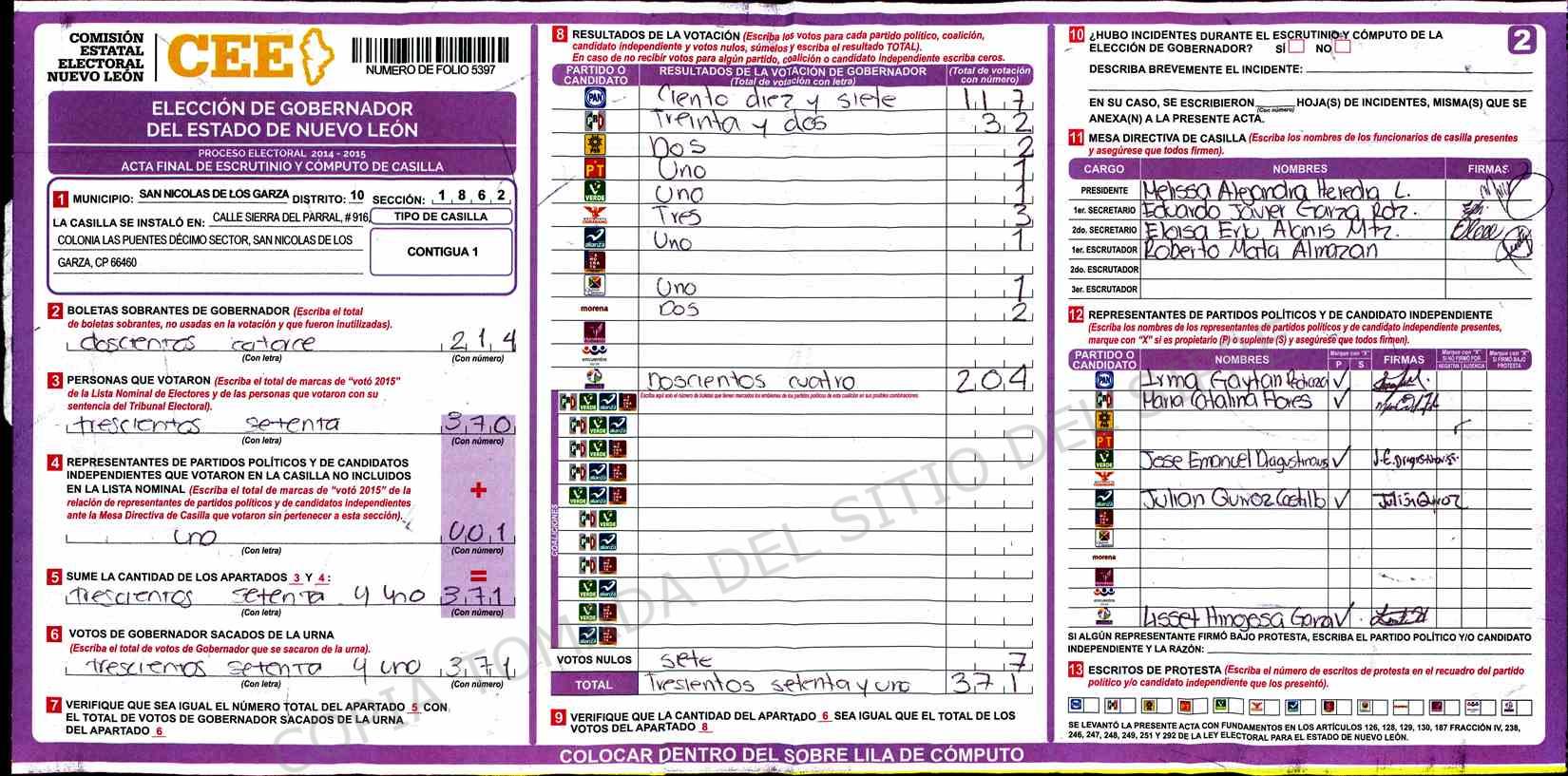 | Claves de Incidencia: | (1) Ilegible, (2) Mutilada, (3) Presenta Correcciones, (4) Presenta Borrones, (5) En Blanco, (6) Cifras Remarcadas, (7) Cifras de Mas, (8) Copiado Movido, (9) Con Signos Inválidos, (10) Excede Lista Nominal, (11) Otra |