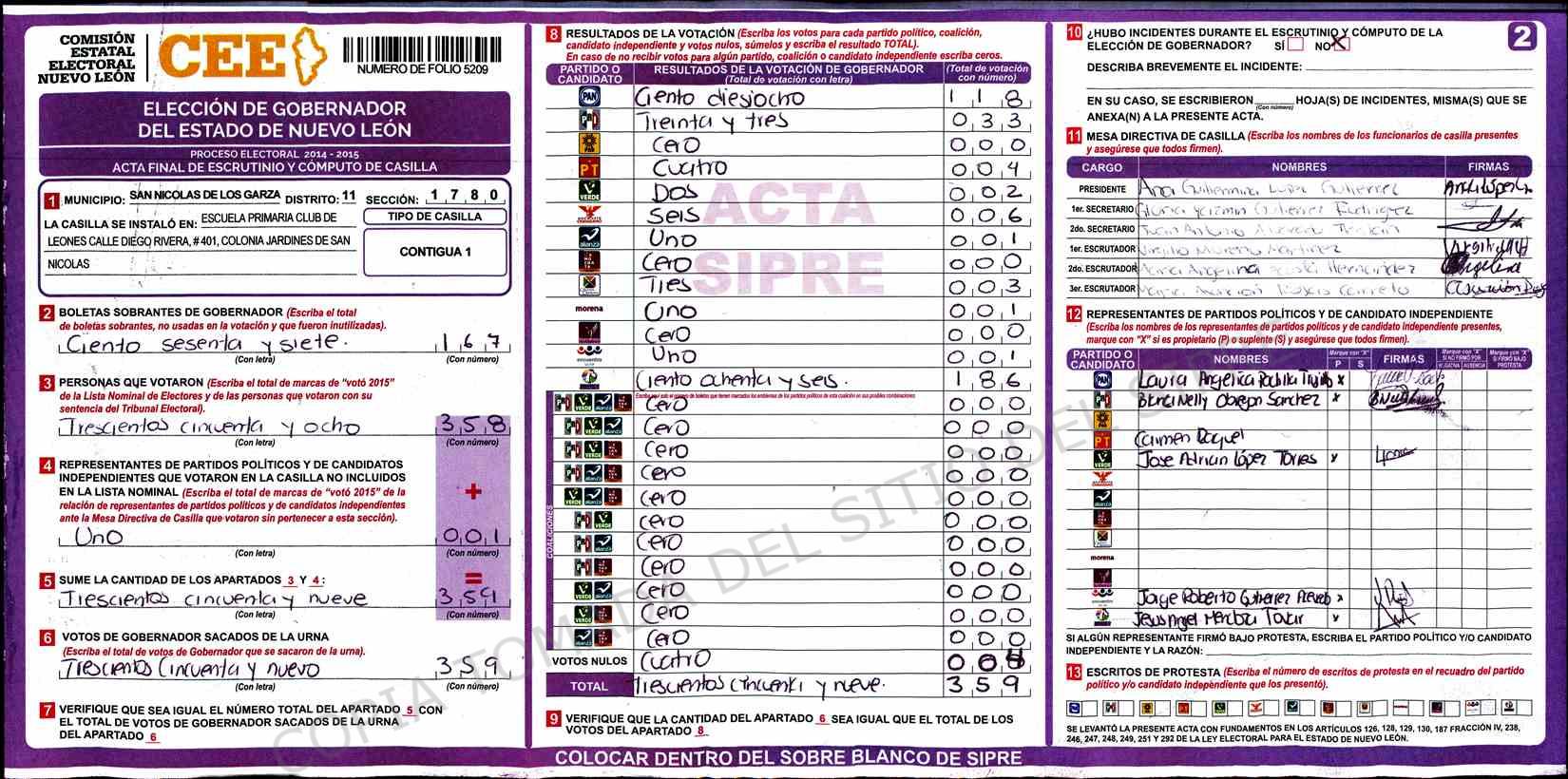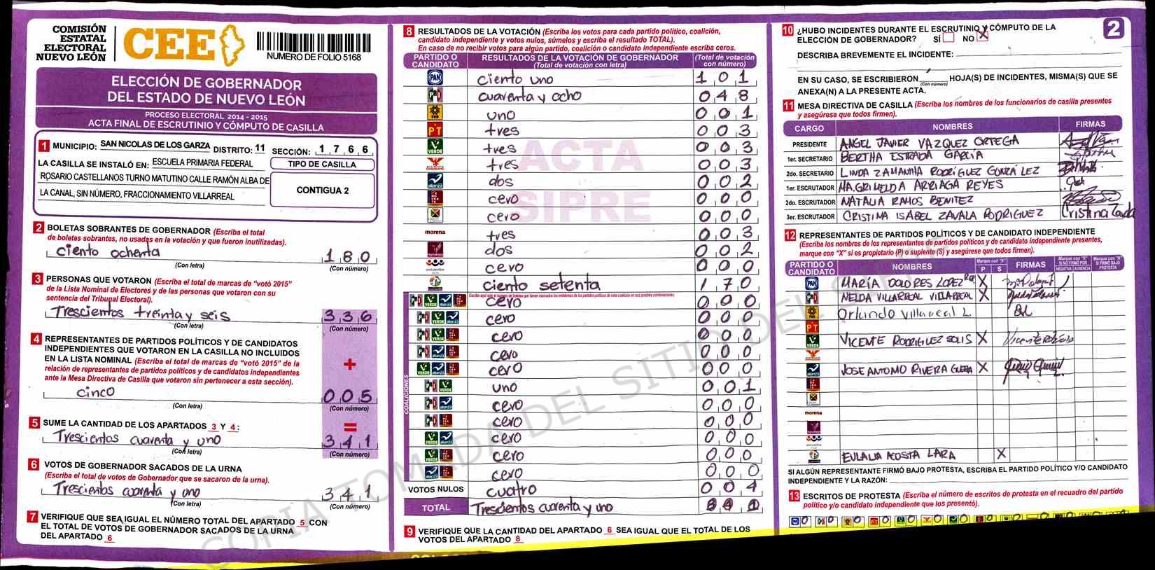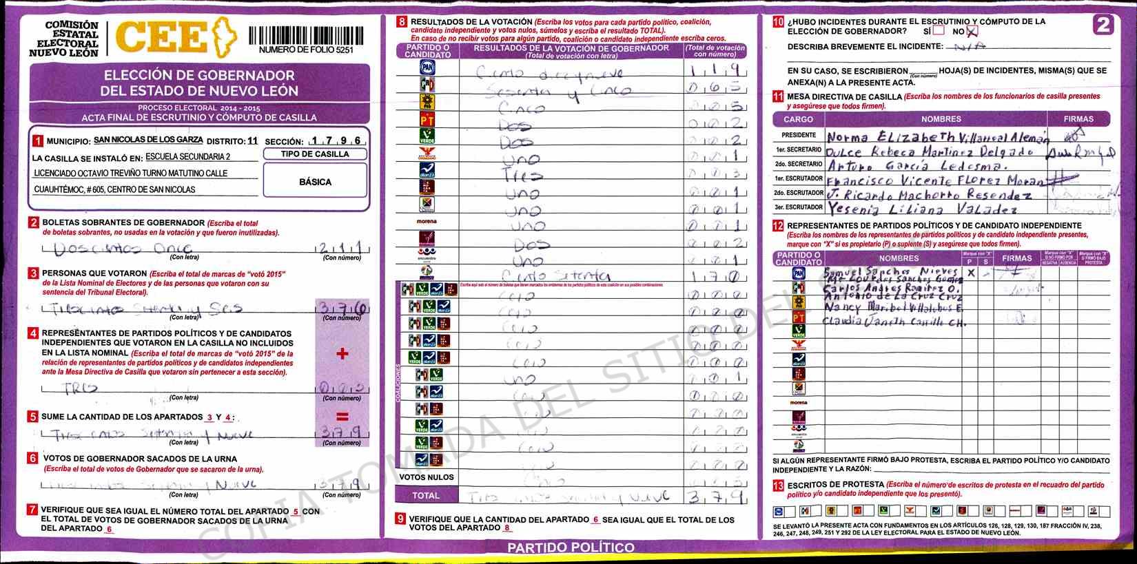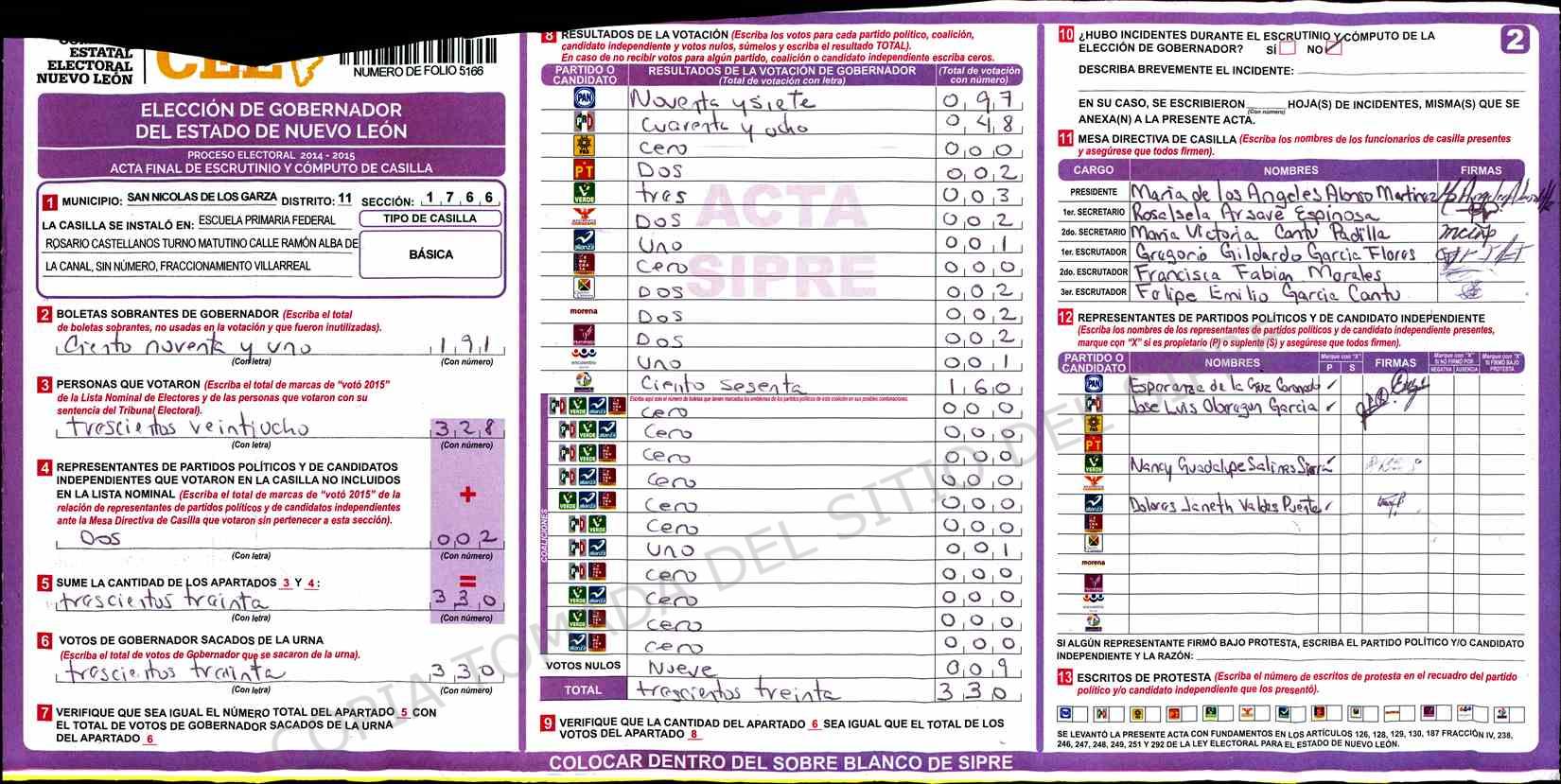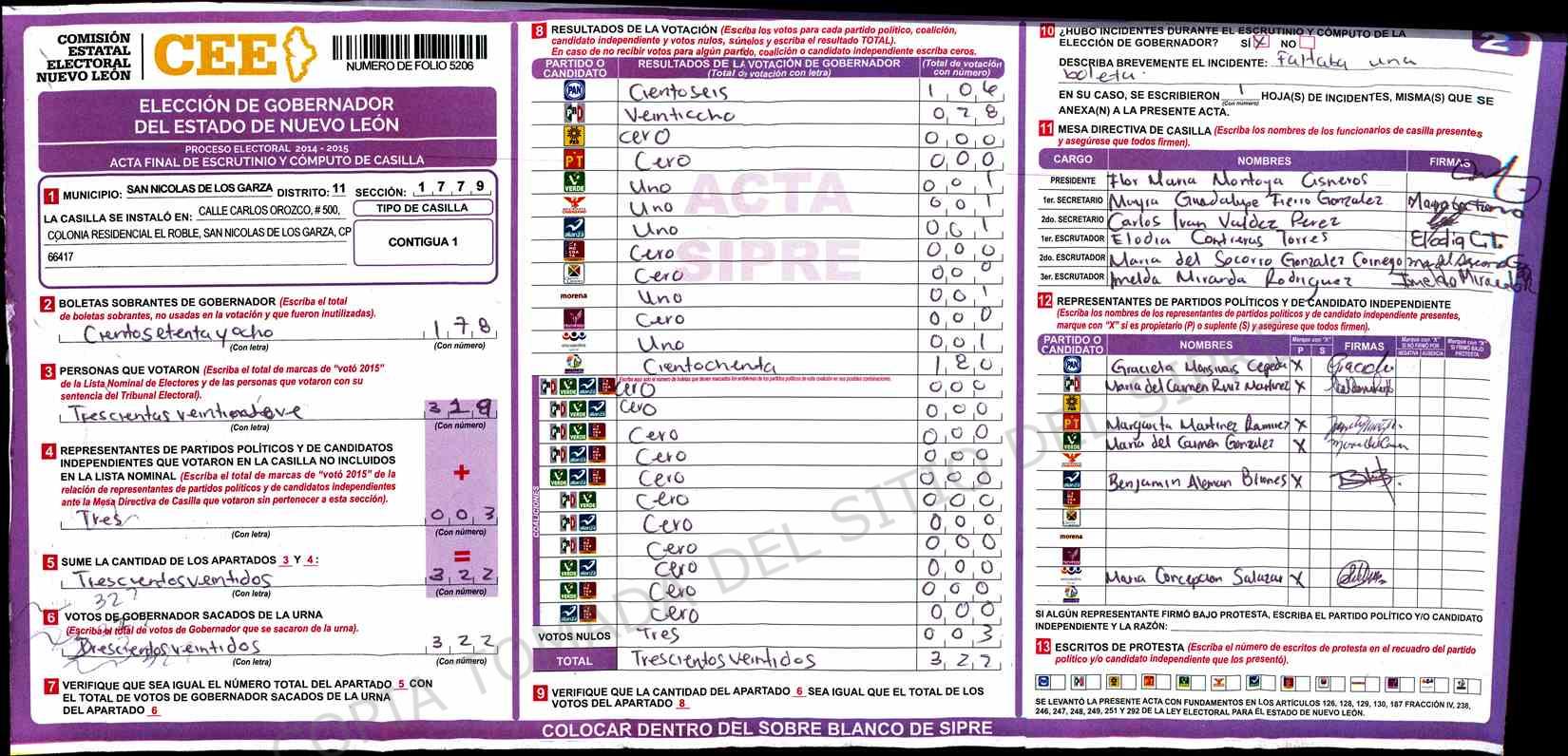 | Claves de Incidencia: | (1) Ilegible, (2) Mutilada, (3) Presenta Correcciones, (4) Presenta Borrones, (5) En Blanco, (6) Cifras Remarcadas, (7) Cifras de Mas, (8) Copiado Movido, (9) Con Signos Inválidos, (10) Excede Lista Nominal, (11) Otra |