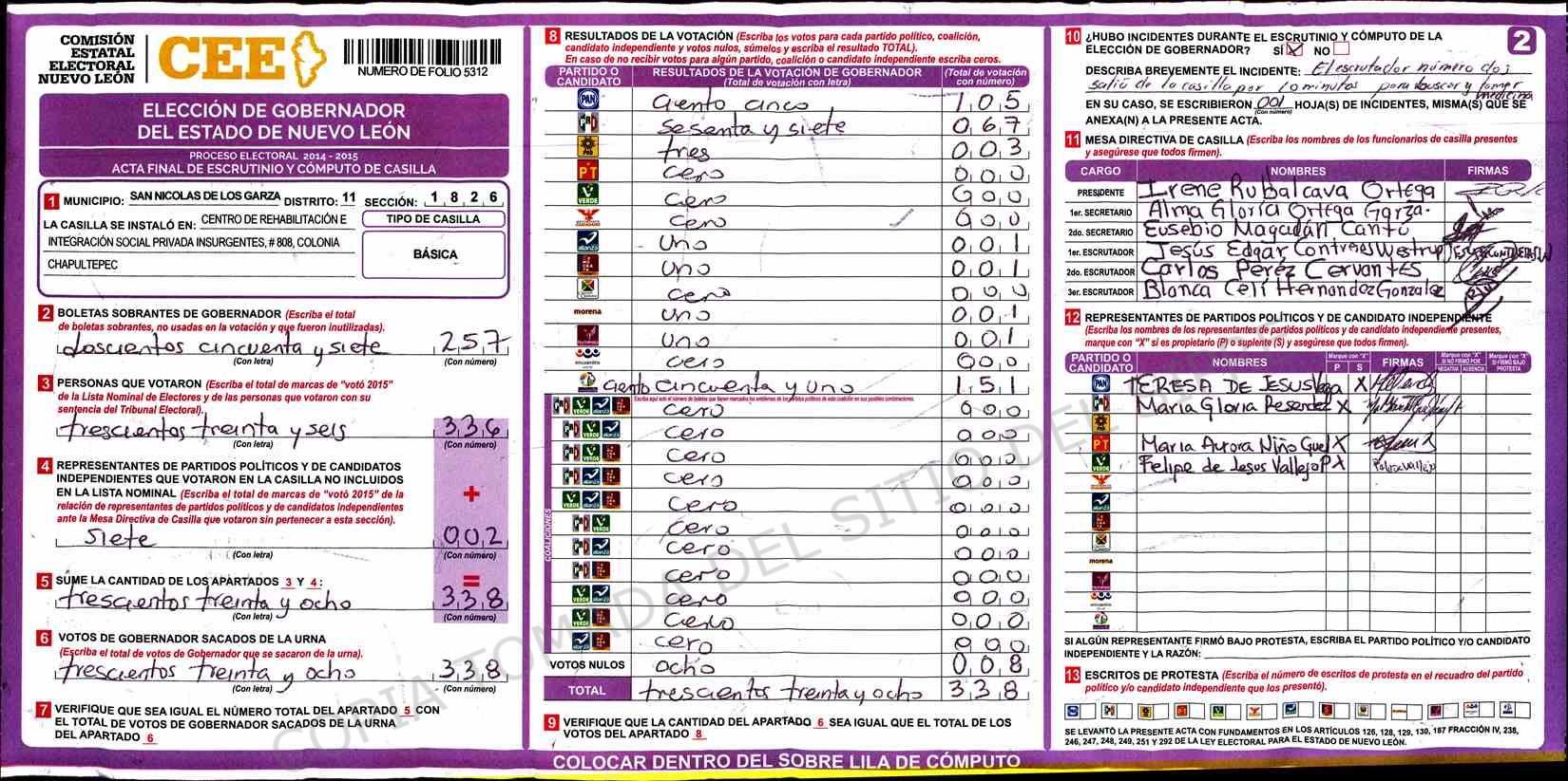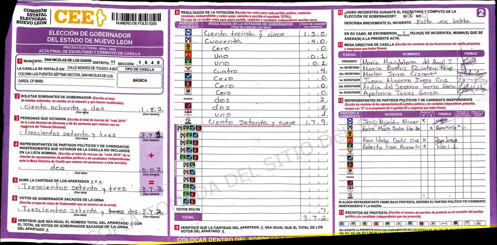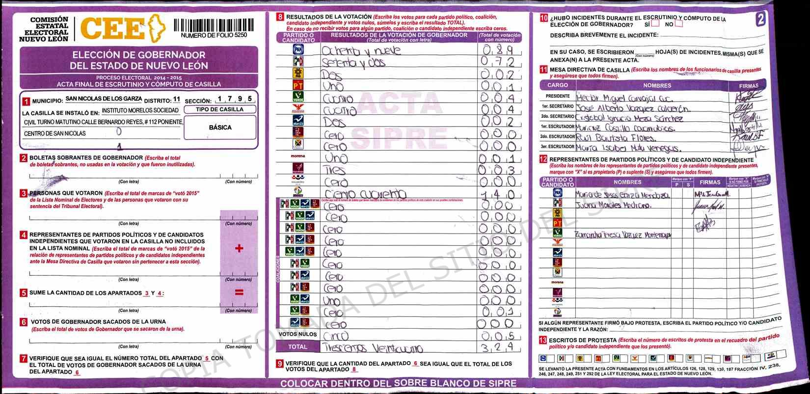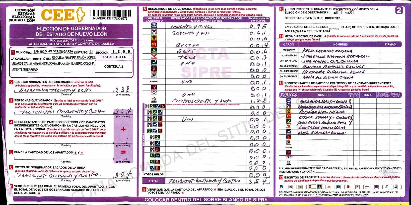 | Claves de Incidencia: | (1) Ilegible, (2) Mutilada, (3) Presenta Correcciones, (4) Presenta Borrones, (5) En Blanco, (6) Cifras Remarcadas, (7) Cifras de Mas, (8) Copiado Movido, (9) Con Signos Inválidos, (10) Excede Lista Nominal, (11) Otra |