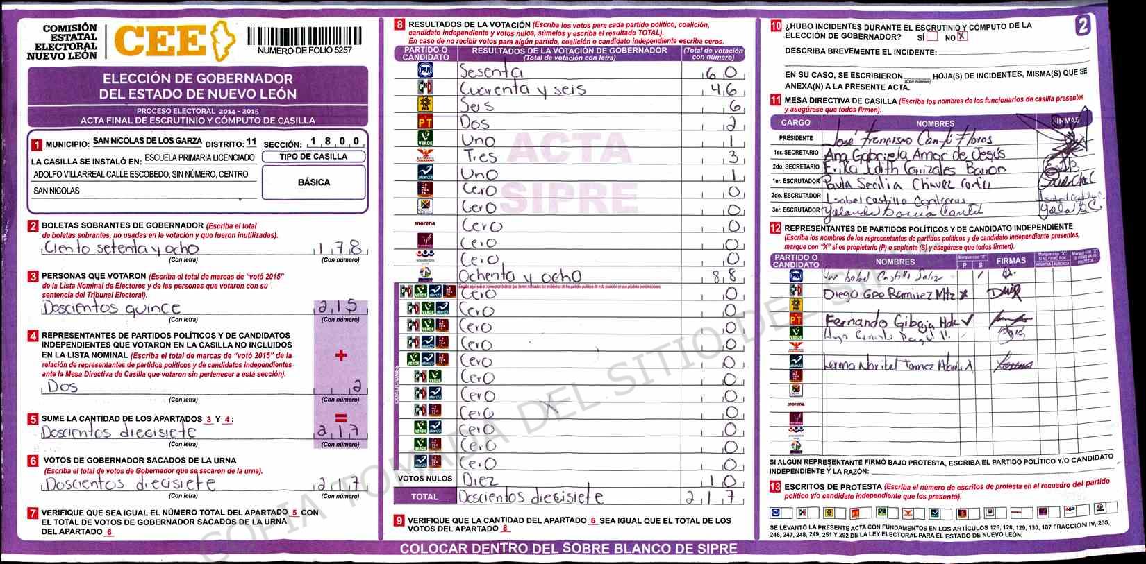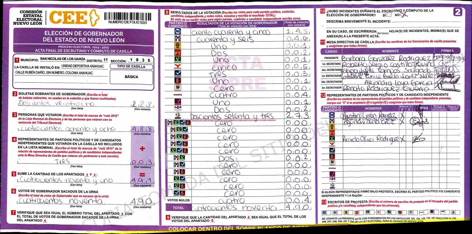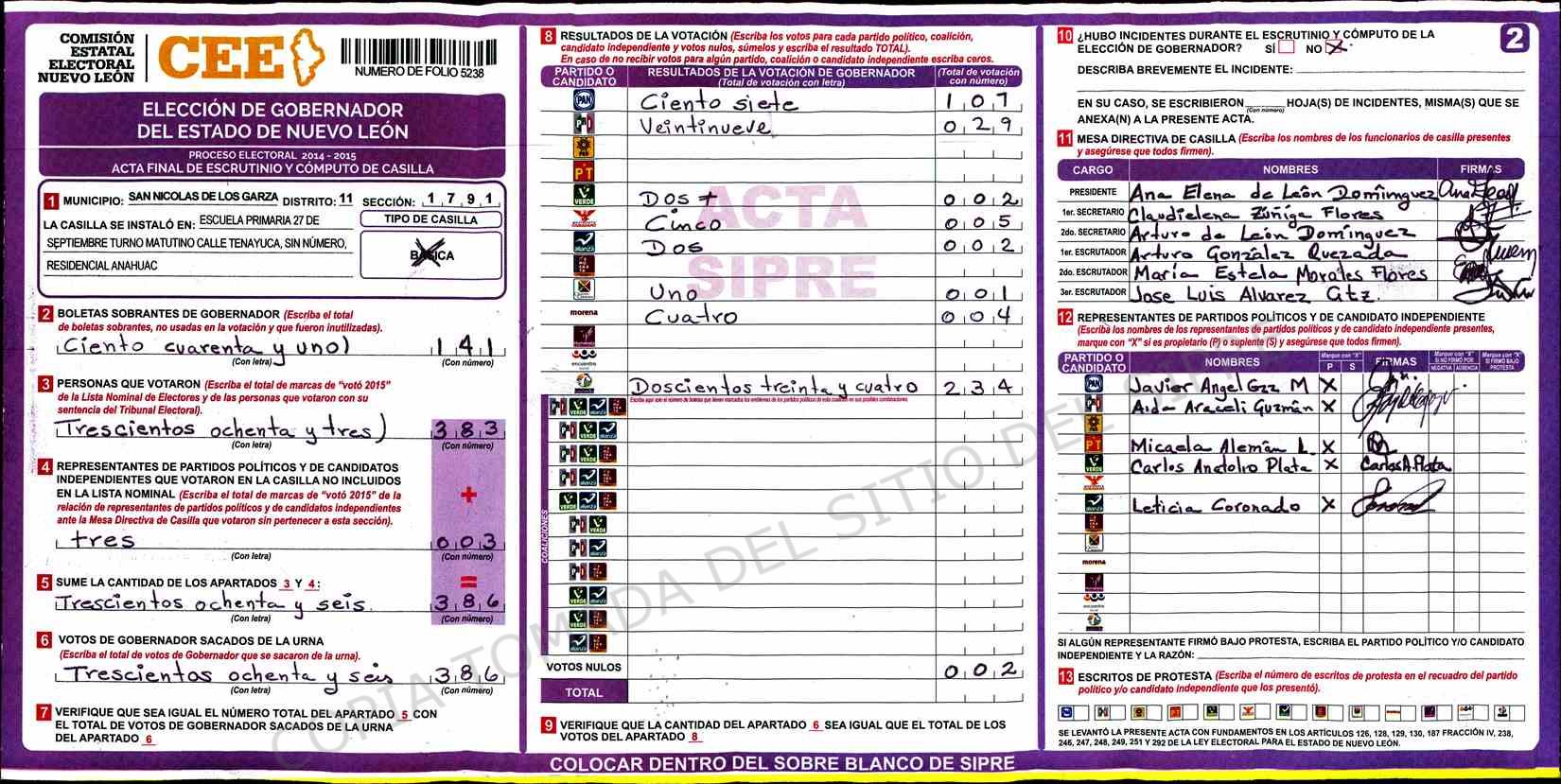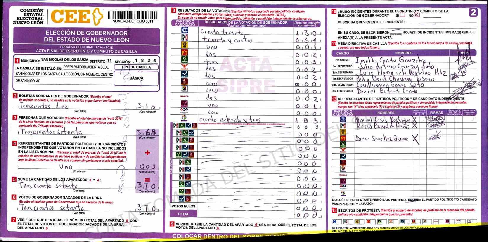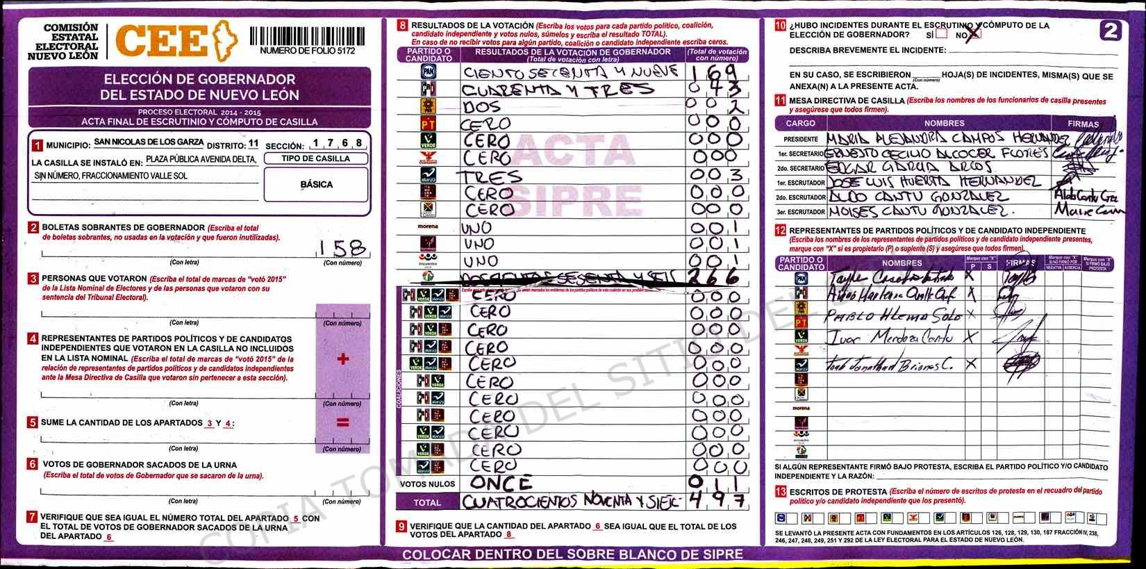 | Claves de Incidencia: | (1) Ilegible, (2) Mutilada, (3) Presenta Correcciones, (4) Presenta Borrones, (5) En Blanco, (6) Cifras Remarcadas, (7) Cifras de Mas, (8) Copiado Movido, (9) Con Signos Inválidos, (10) Excede Lista Nominal, (11) Otra |