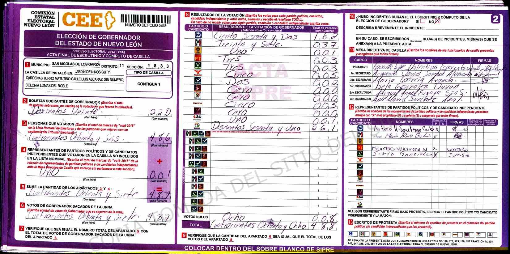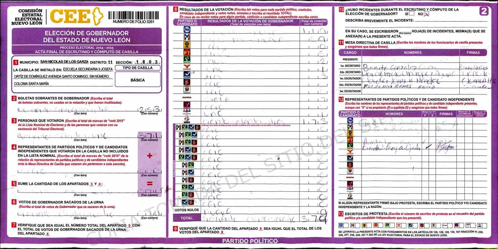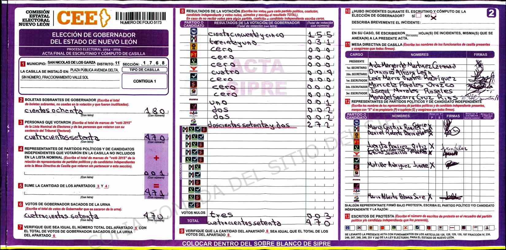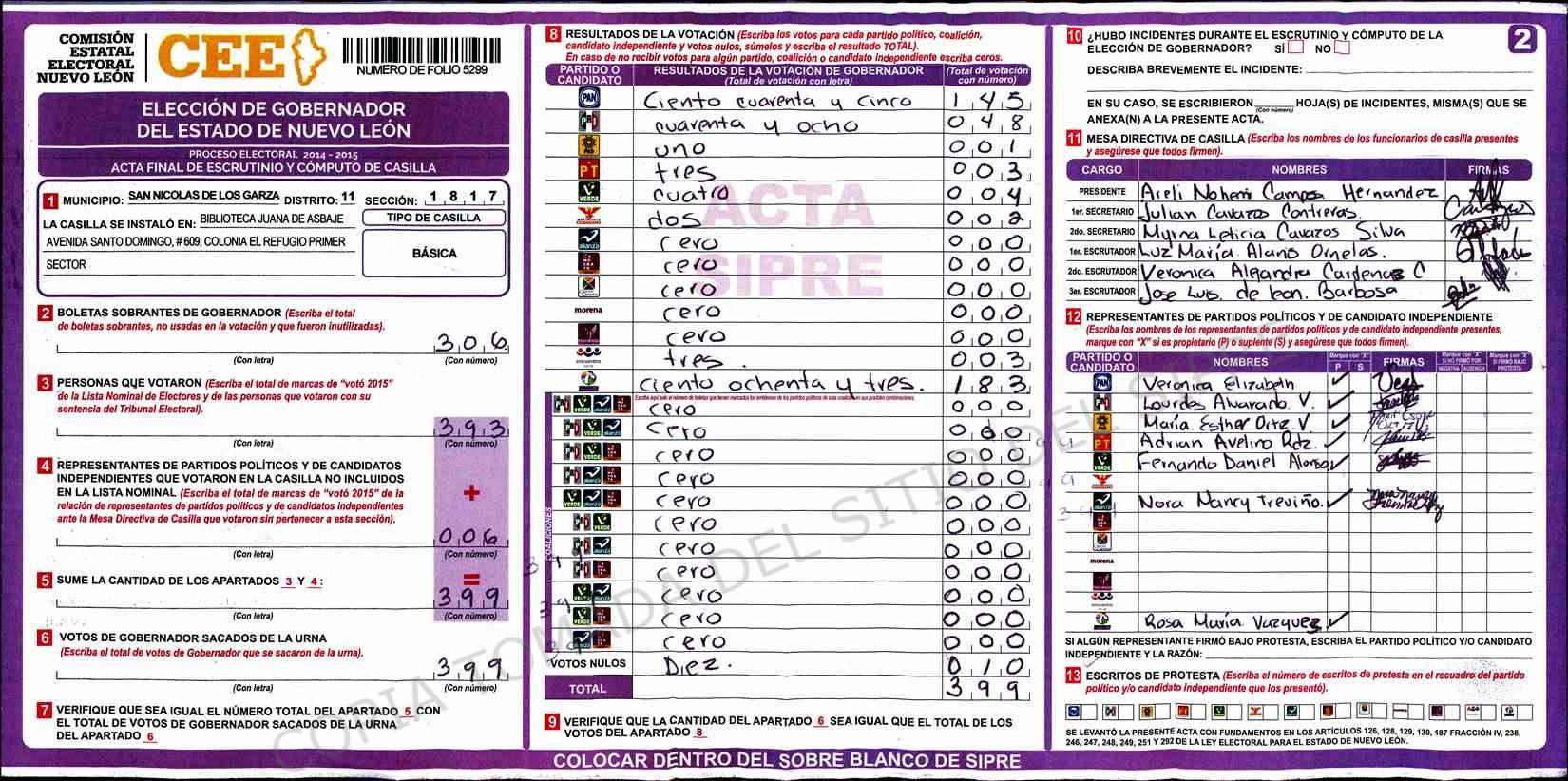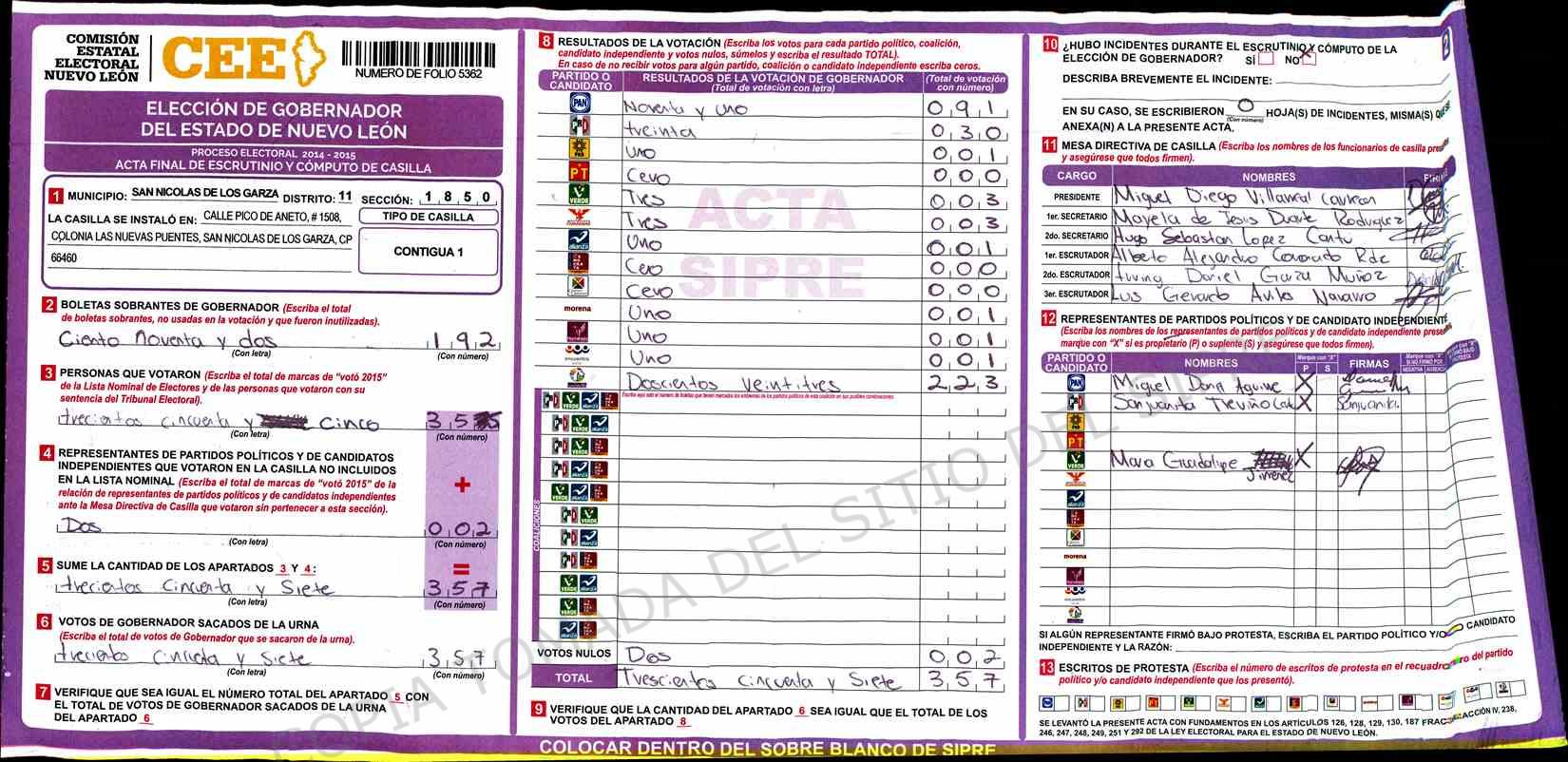 | Claves de Incidencia: | (1) Ilegible, (2) Mutilada, (3) Presenta Correcciones, (4) Presenta Borrones, (5) En Blanco, (6) Cifras Remarcadas, (7) Cifras de Mas, (8) Copiado Movido, (9) Con Signos Inválidos, (10) Excede Lista Nominal, (11) Otra |