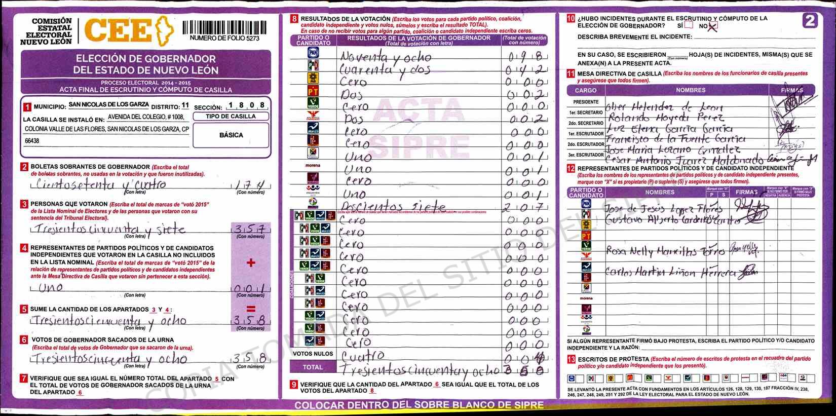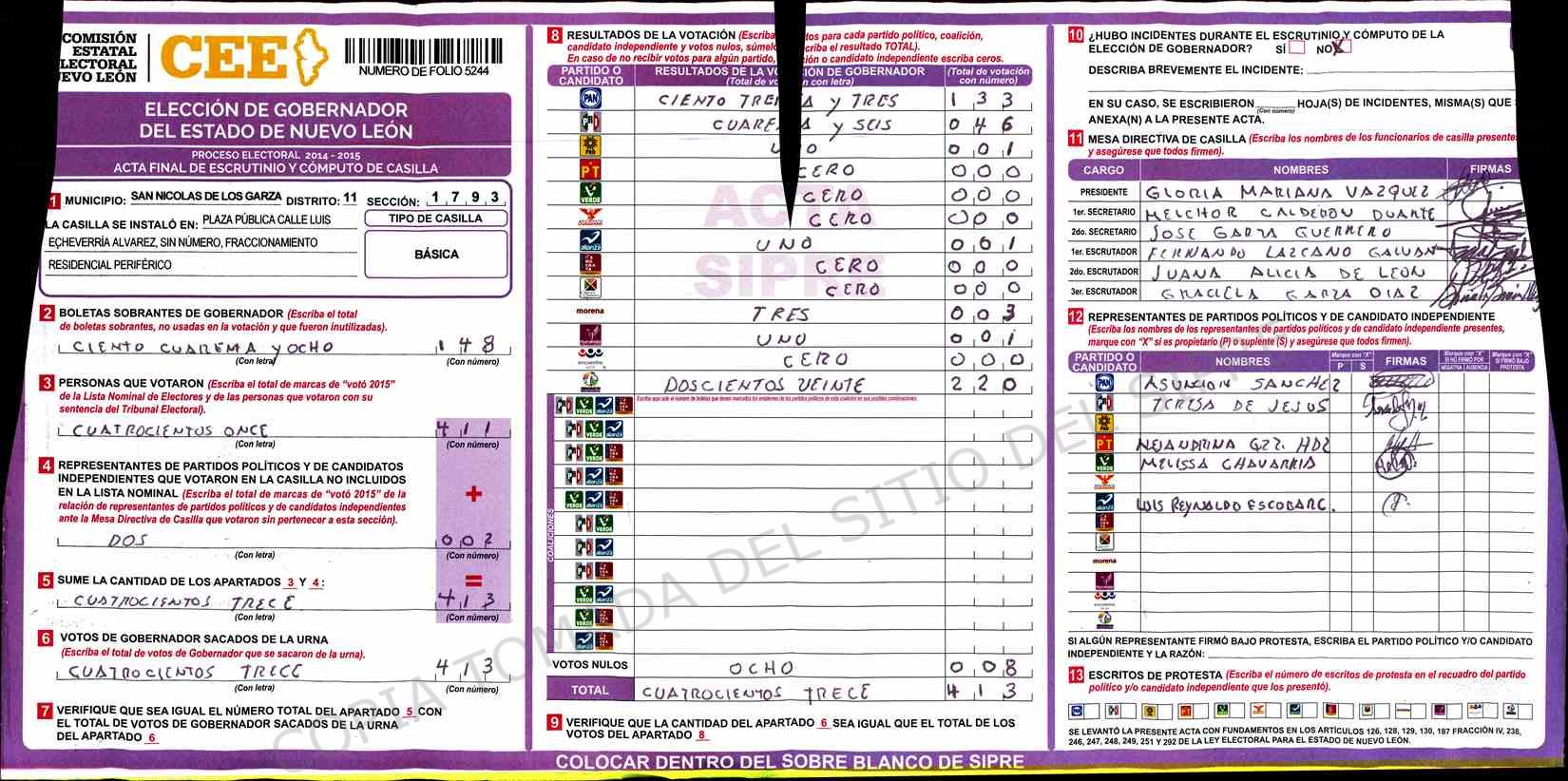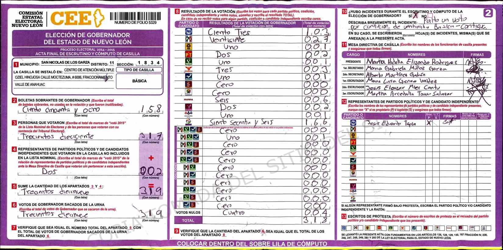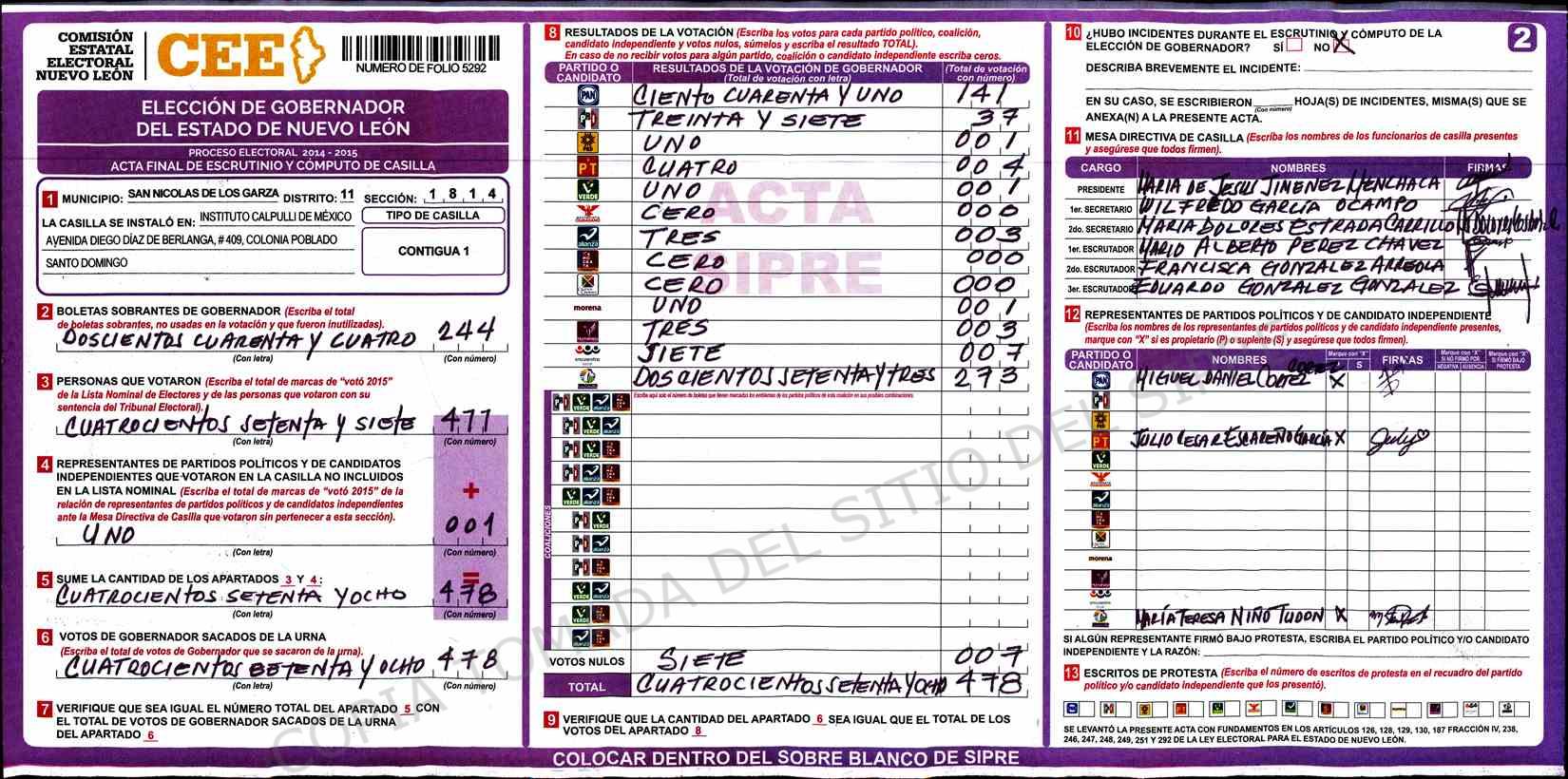 | Claves de Incidencia: | (1) Ilegible, (2) Mutilada, (3) Presenta Correcciones, (4) Presenta Borrones, (5) En Blanco, (6) Cifras Remarcadas, (7) Cifras de Mas, (8) Copiado Movido, (9) Con Signos Inválidos, (10) Excede Lista Nominal, (11) Otra |