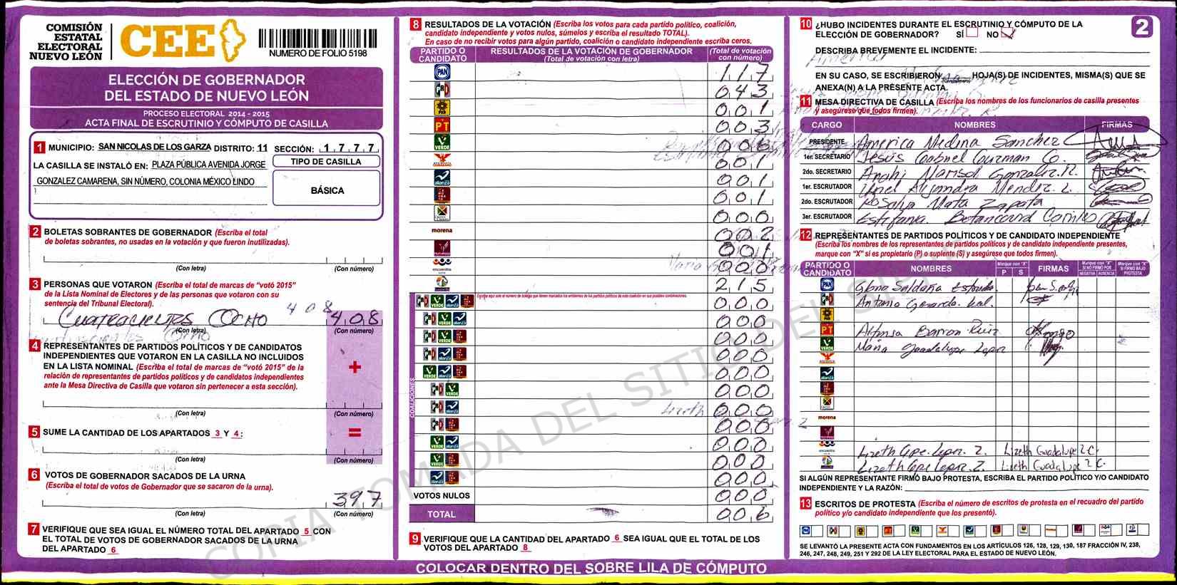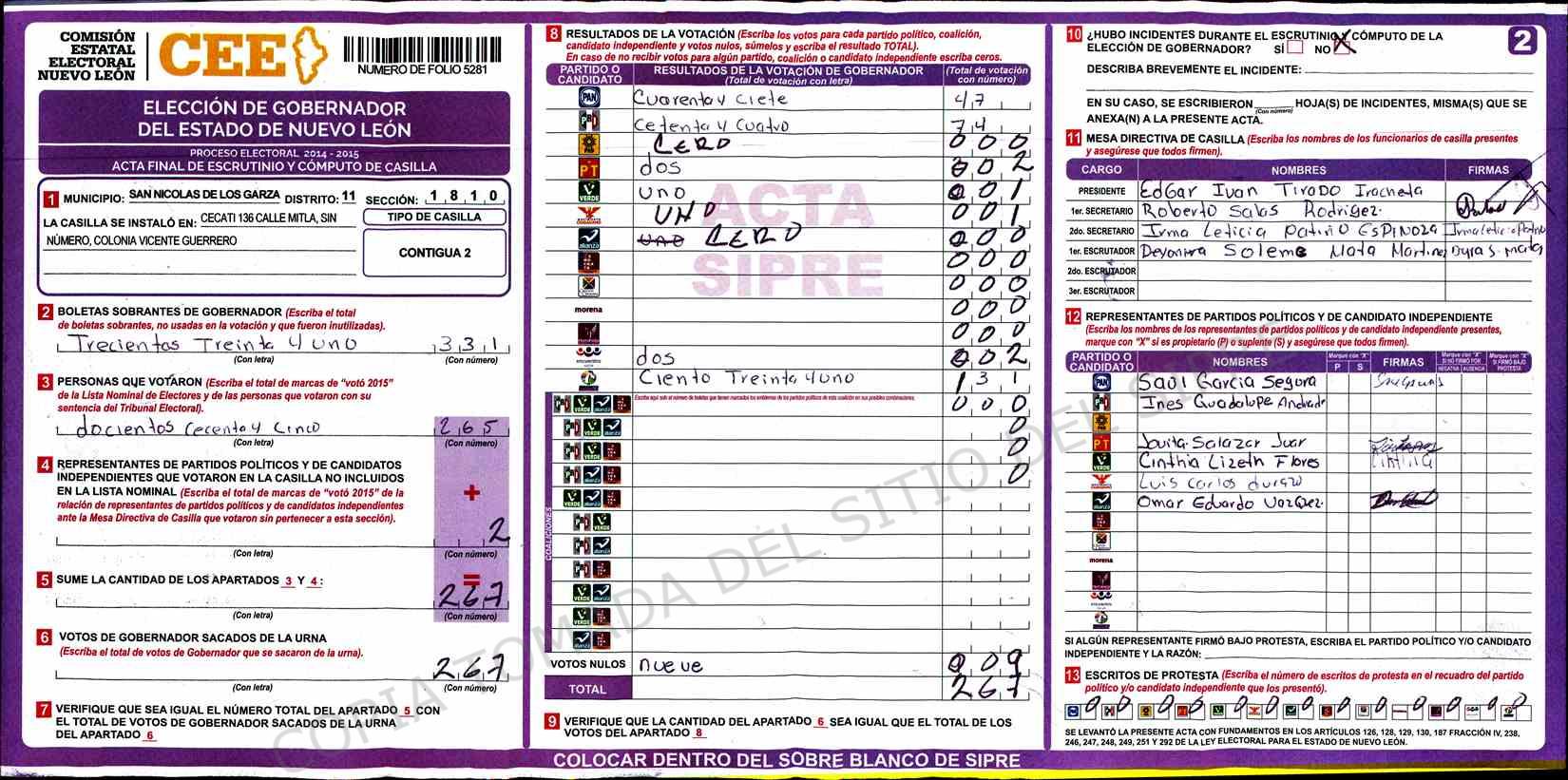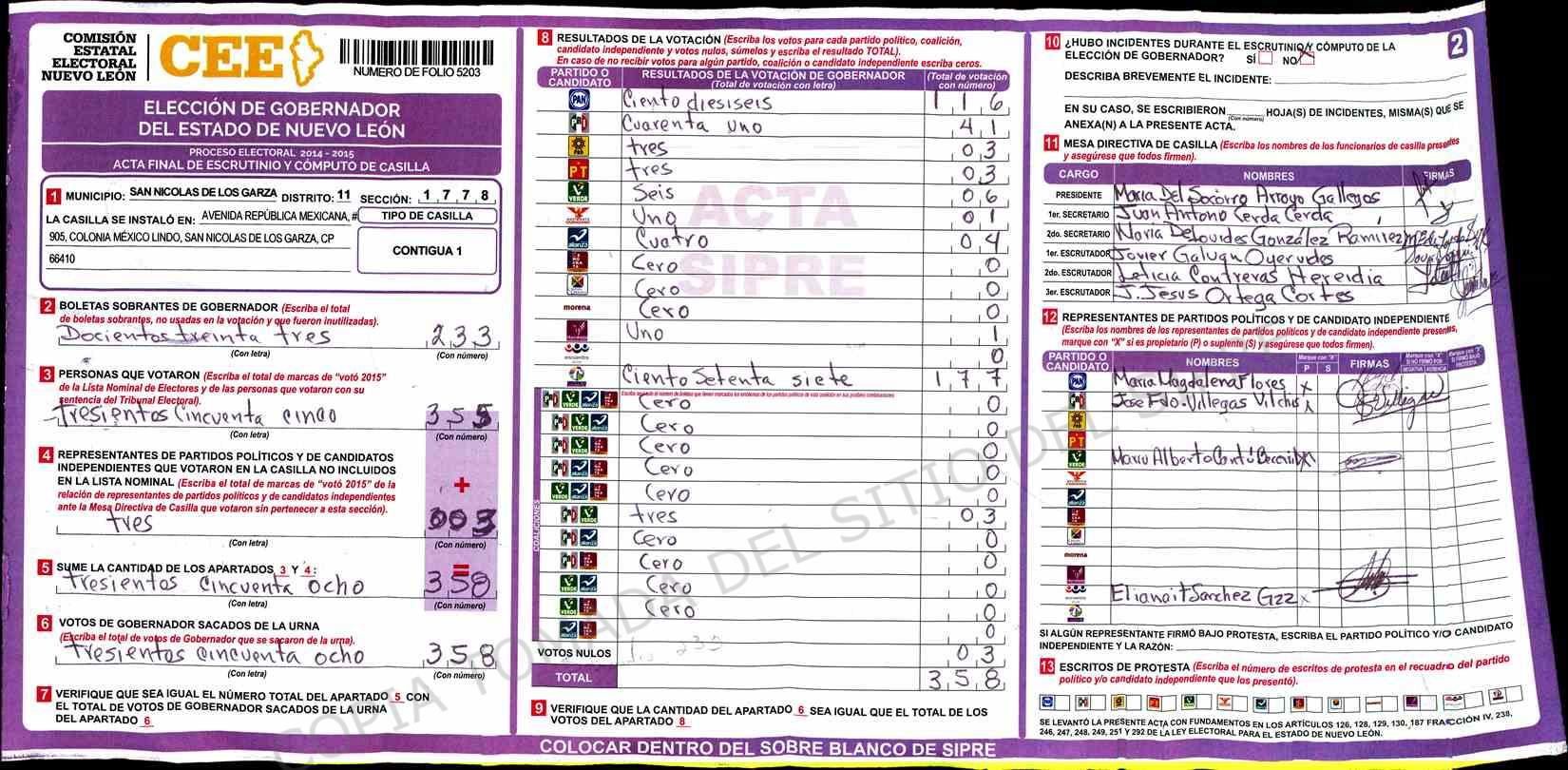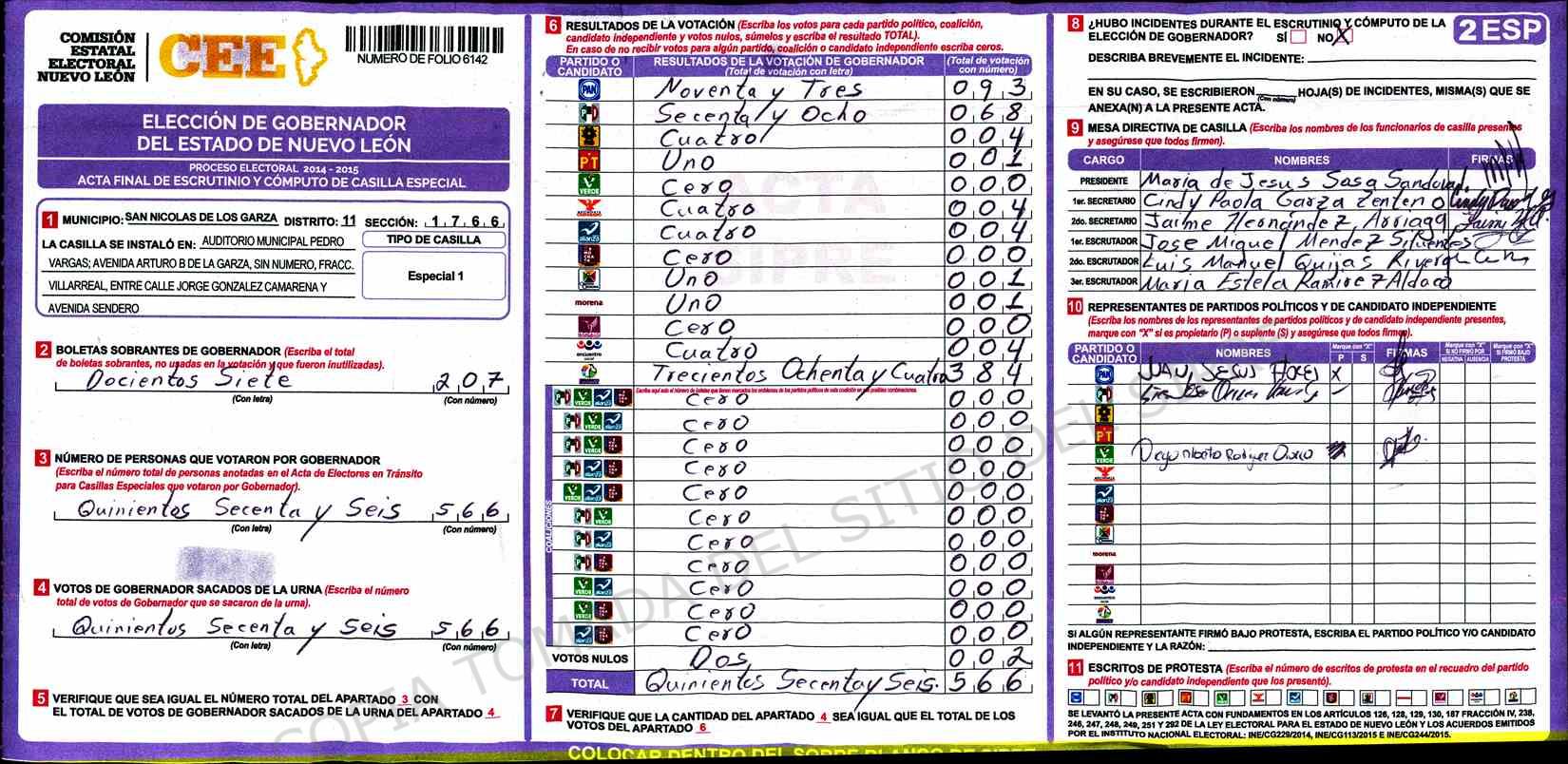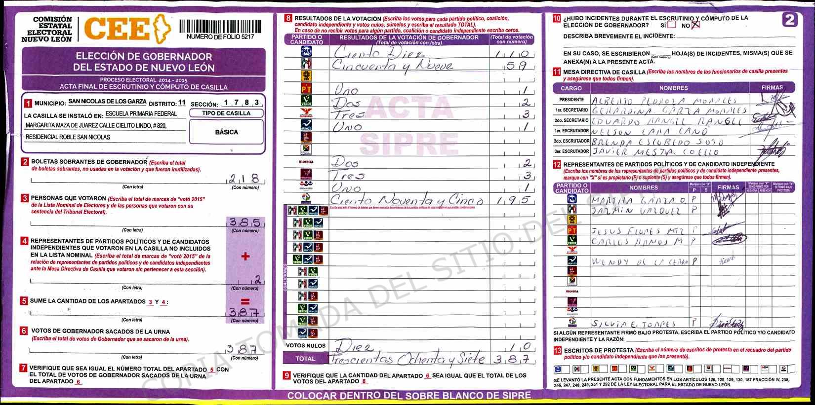 | Claves de Incidencia: | (1) Ilegible, (2) Mutilada, (3) Presenta Correcciones, (4) Presenta Borrones, (5) En Blanco, (6) Cifras Remarcadas, (7) Cifras de Mas, (8) Copiado Movido, (9) Con Signos Inválidos, (10) Excede Lista Nominal, (11) Otra |