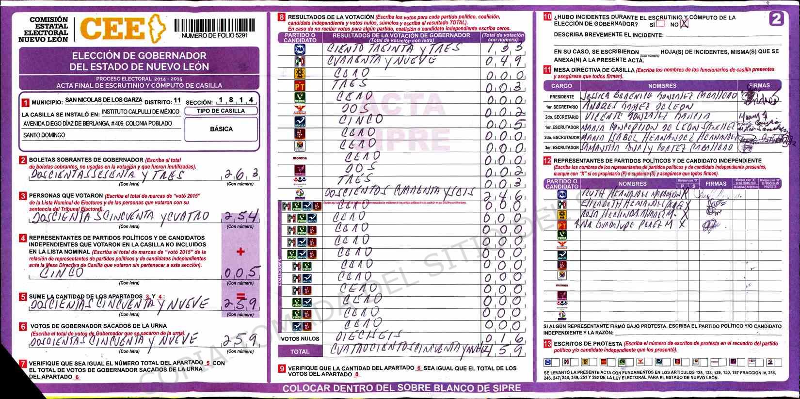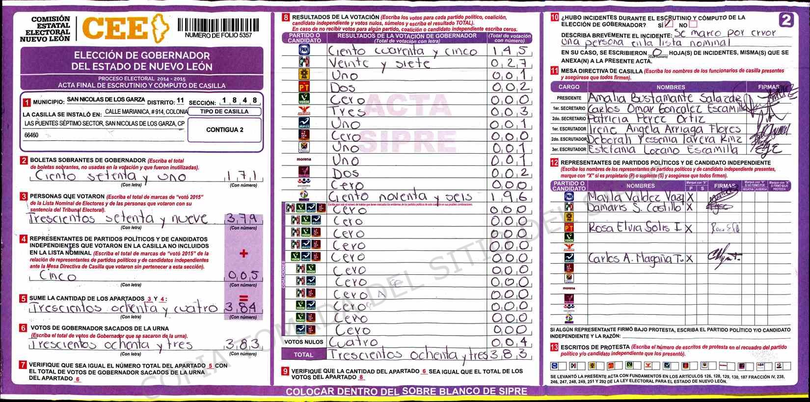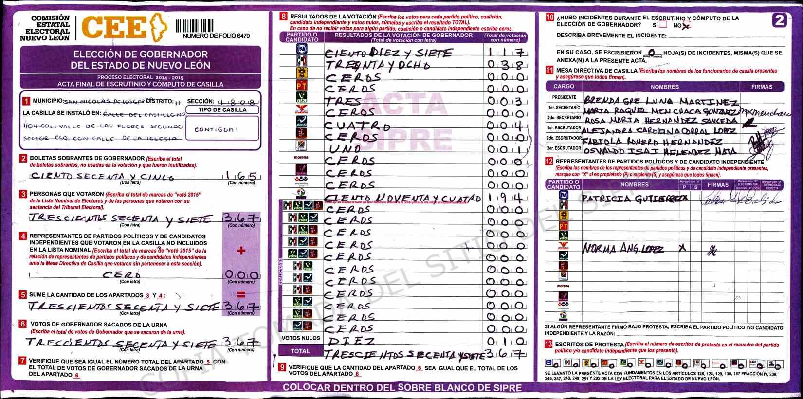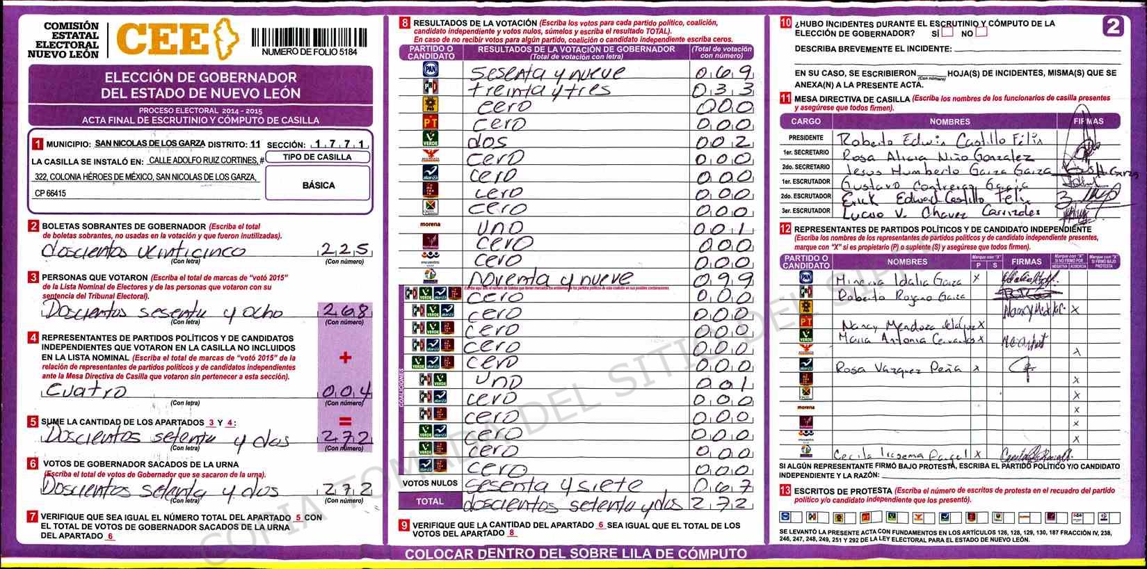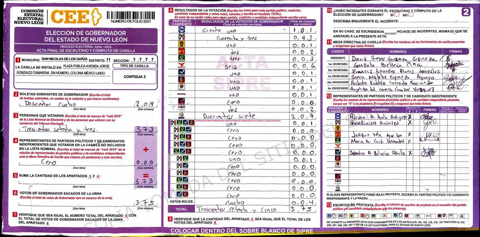 | Claves de Incidencia: | (1) Ilegible, (2) Mutilada, (3) Presenta Correcciones, (4) Presenta Borrones, (5) En Blanco, (6) Cifras Remarcadas, (7) Cifras de Mas, (8) Copiado Movido, (9) Con Signos Inválidos, (10) Excede Lista Nominal, (11) Otra |