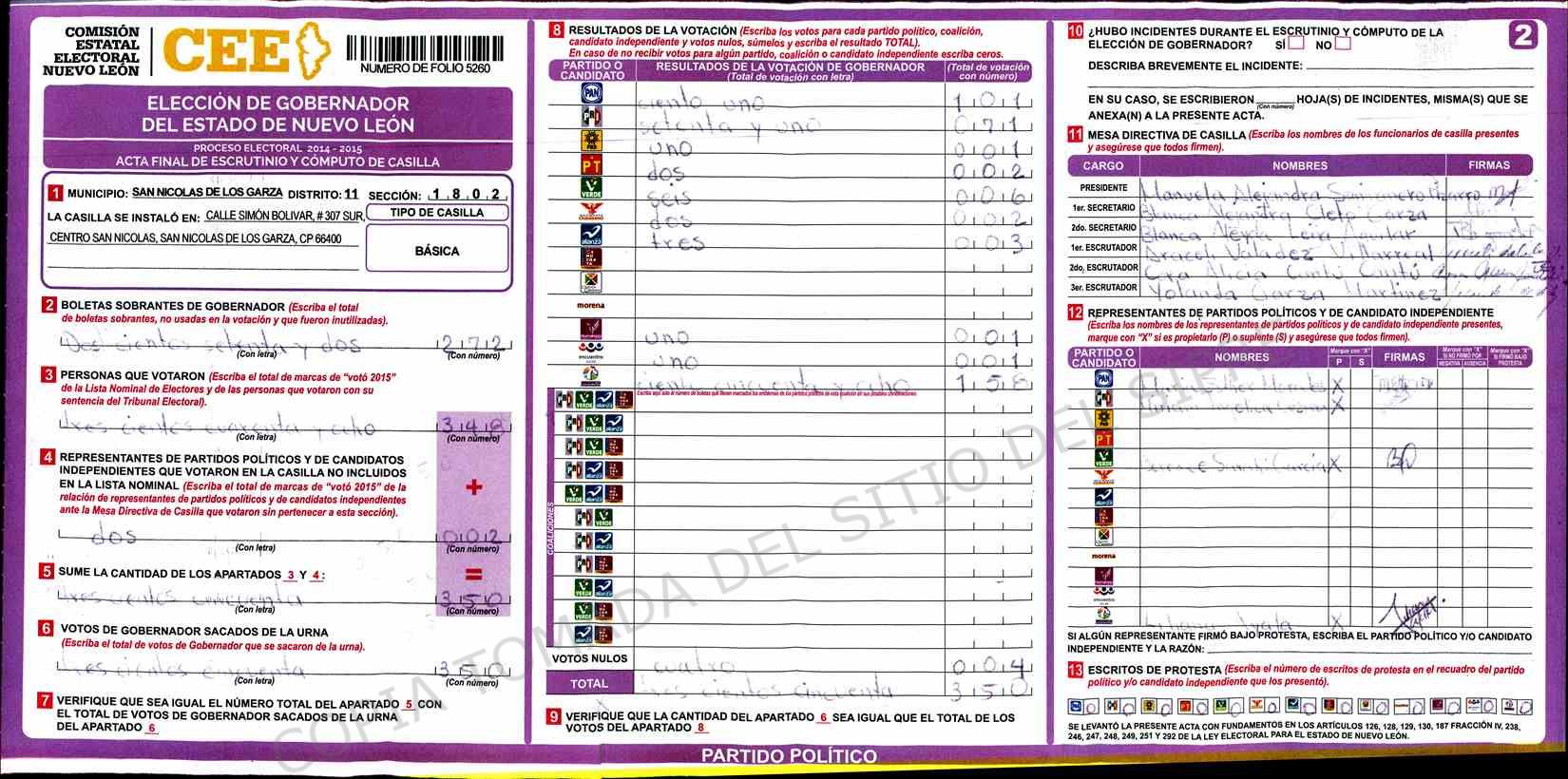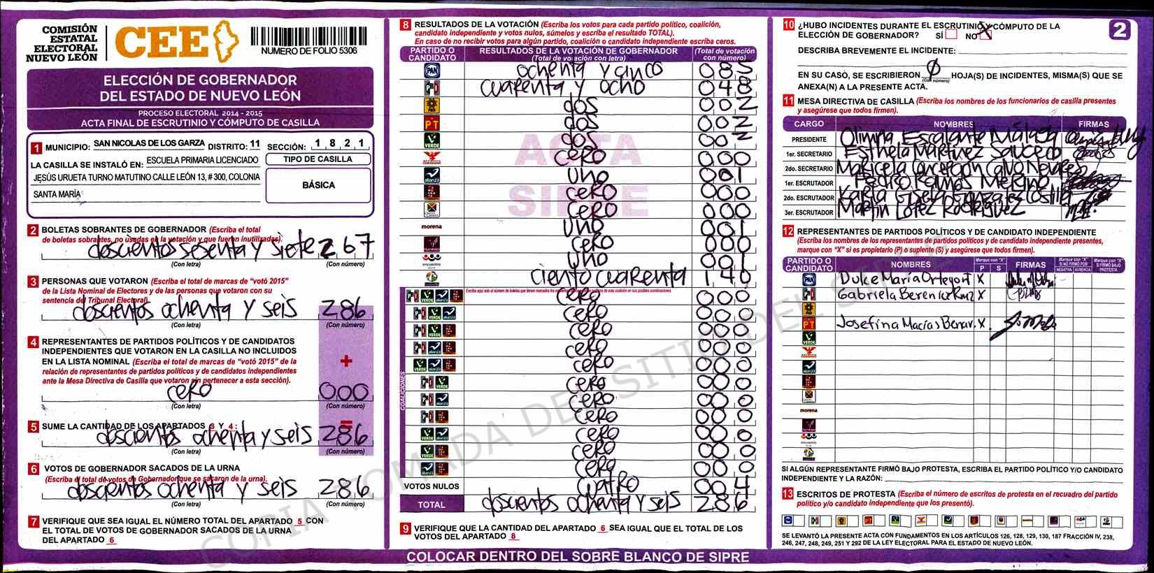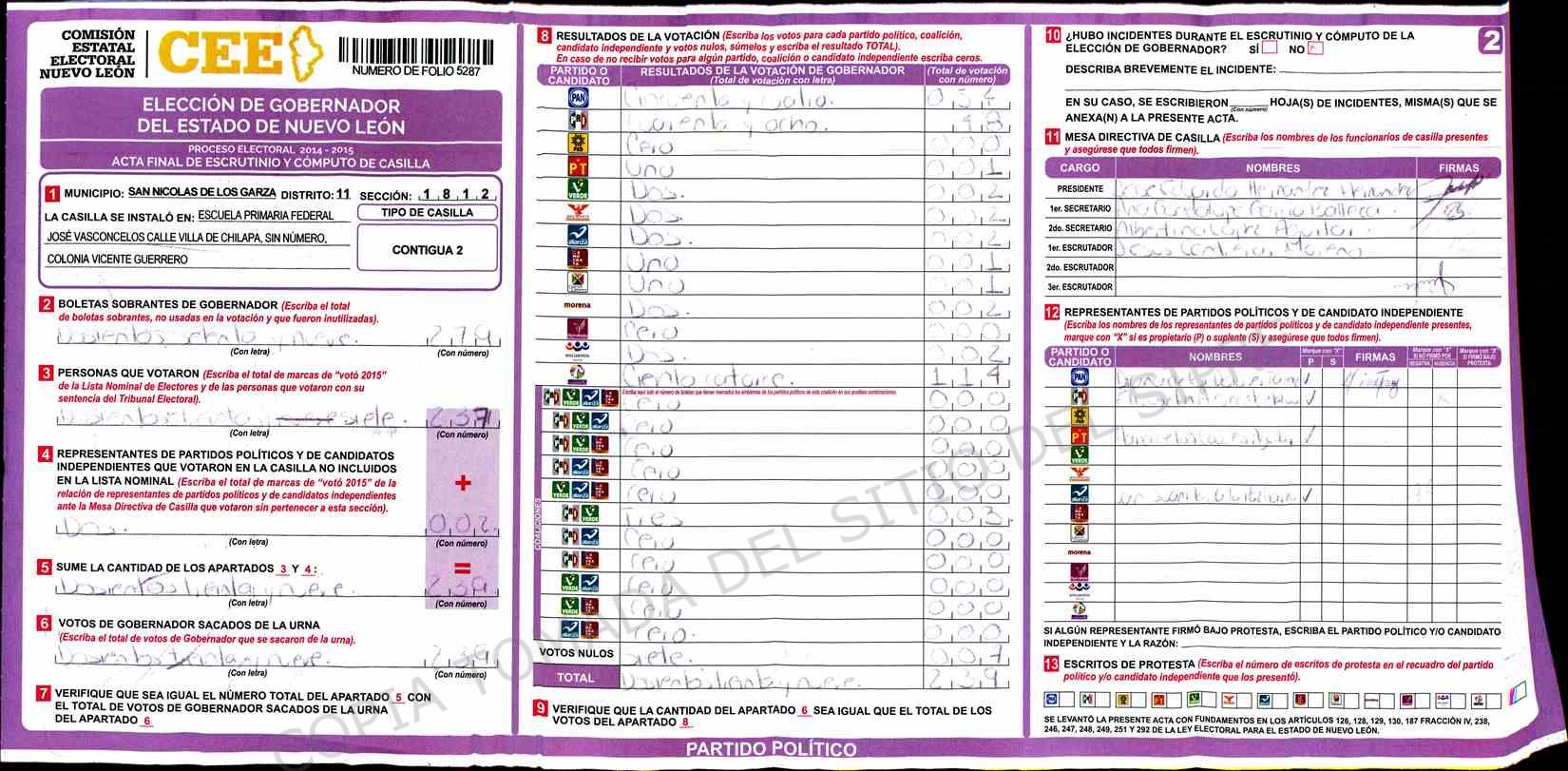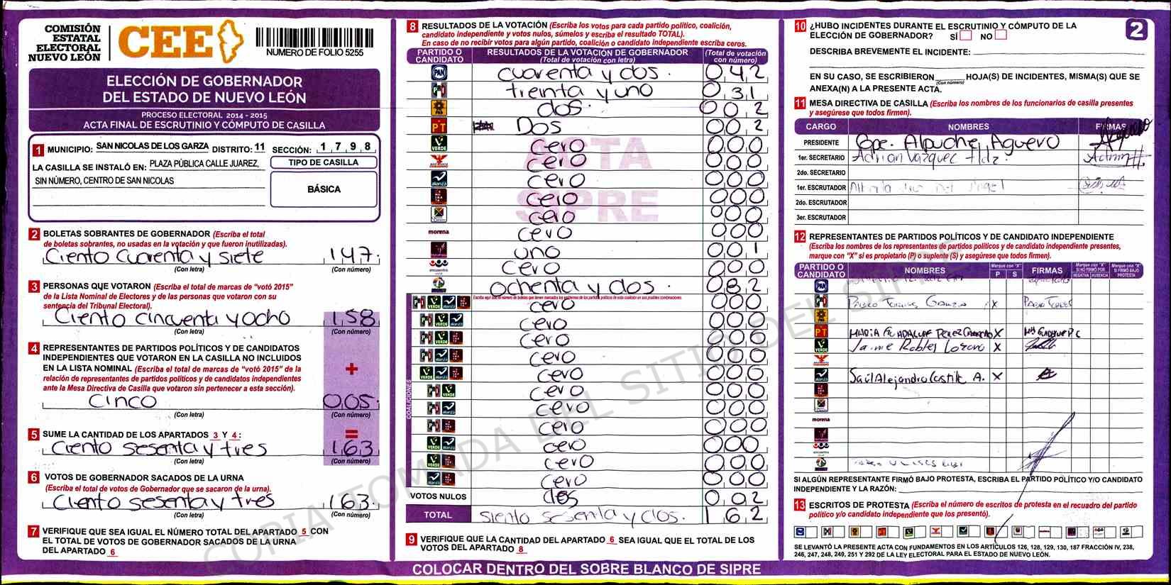 | Claves de Incidencia: | (1) Ilegible, (2) Mutilada, (3) Presenta Correcciones, (4) Presenta Borrones, (5) En Blanco, (6) Cifras Remarcadas, (7) Cifras de Mas, (8) Copiado Movido, (9) Con Signos Inválidos, (10) Excede Lista Nominal, (11) Otra |
