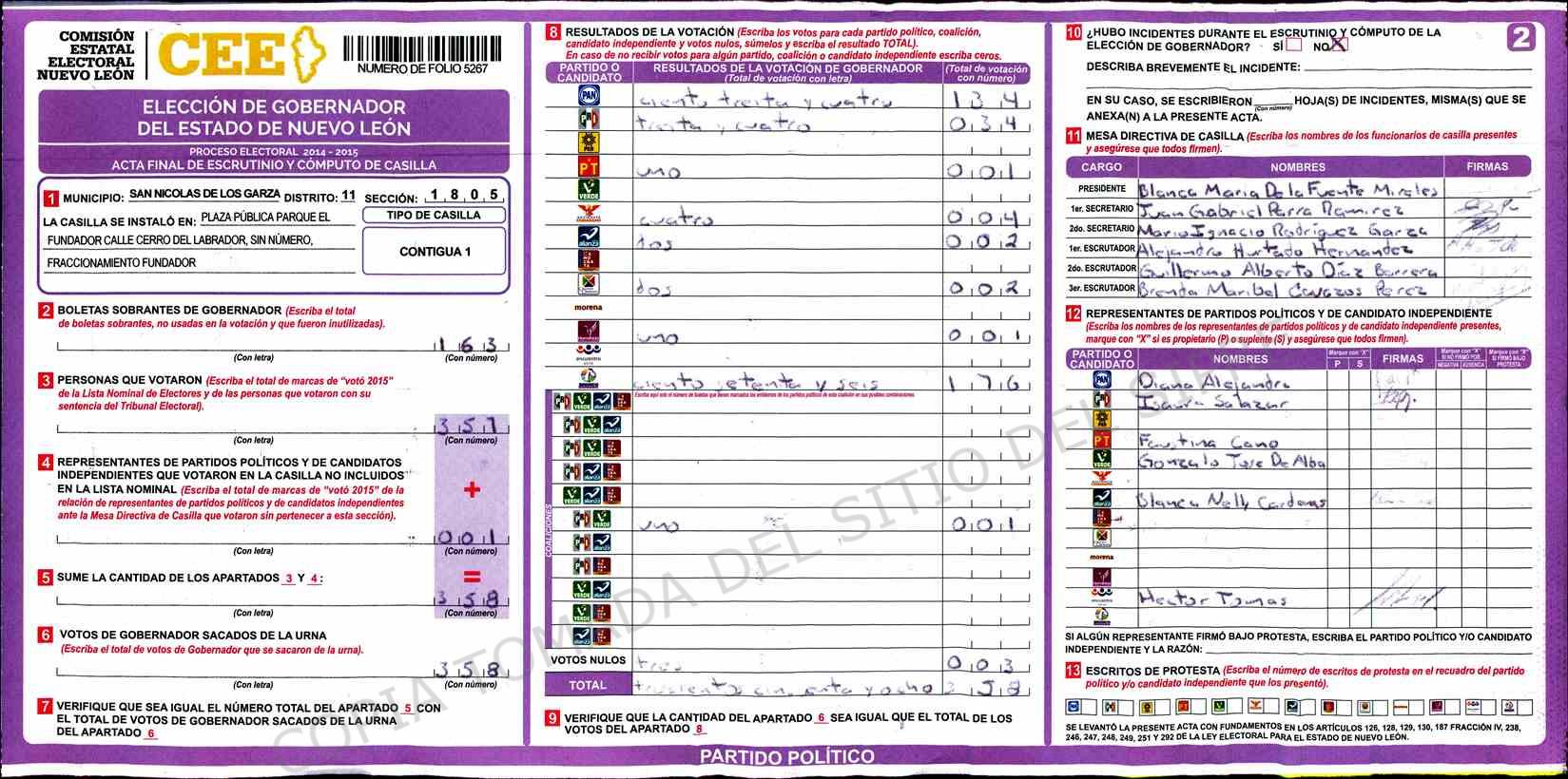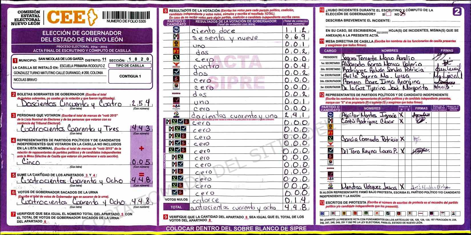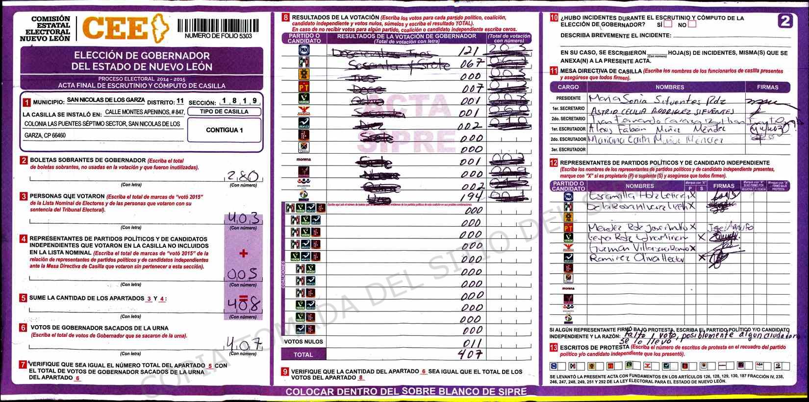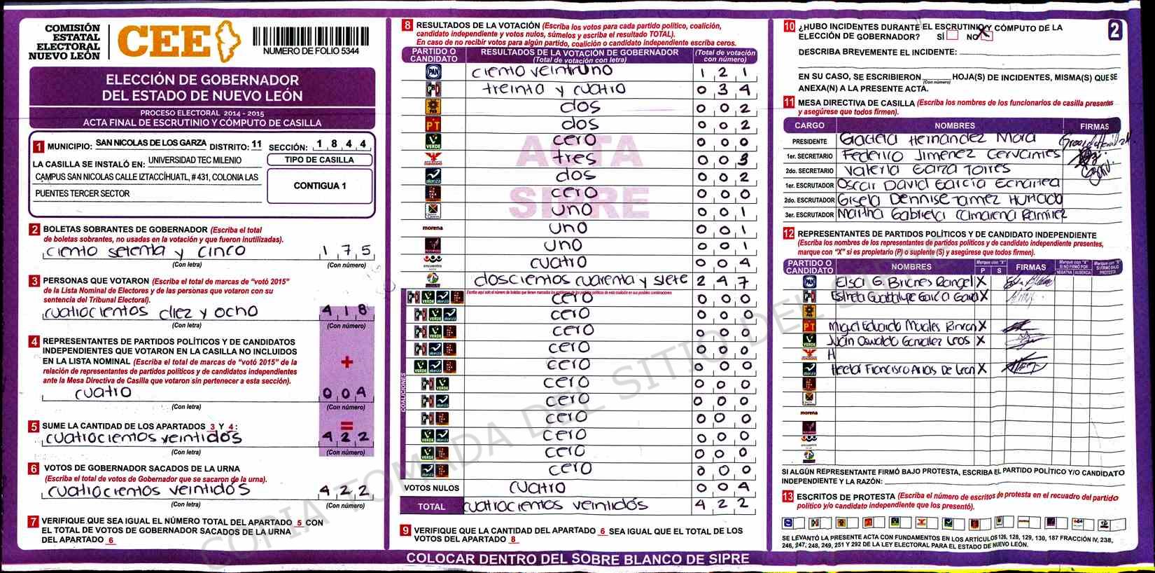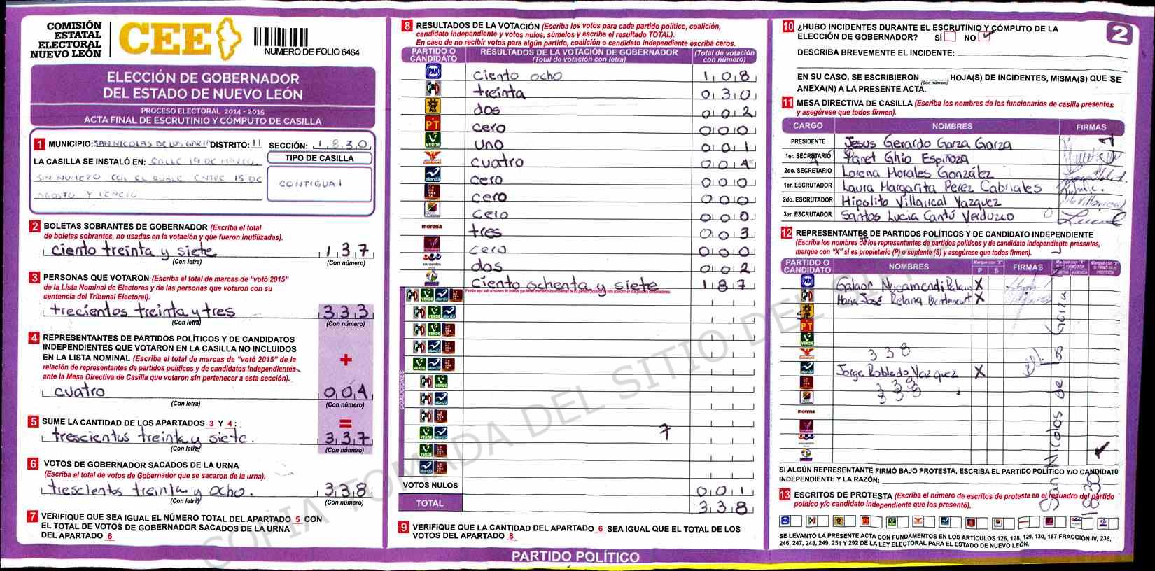 | Claves de Incidencia: | (1) Ilegible, (2) Mutilada, (3) Presenta Correcciones, (4) Presenta Borrones, (5) En Blanco, (6) Cifras Remarcadas, (7) Cifras de Mas, (8) Copiado Movido, (9) Con Signos Inválidos, (10) Excede Lista Nominal, (11) Otra |