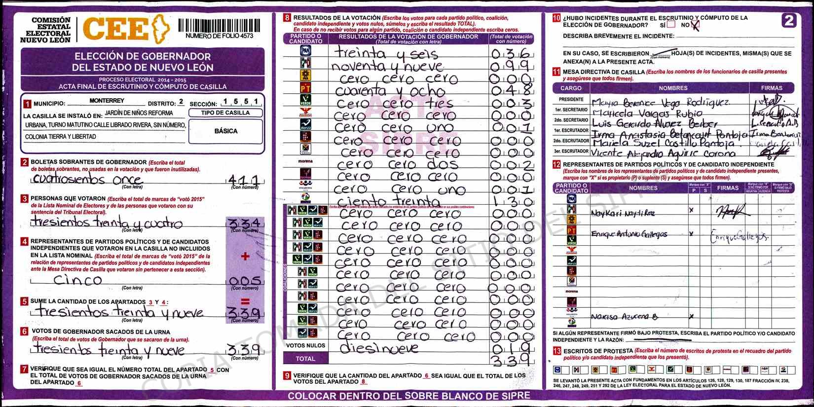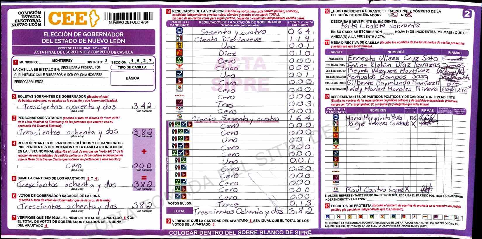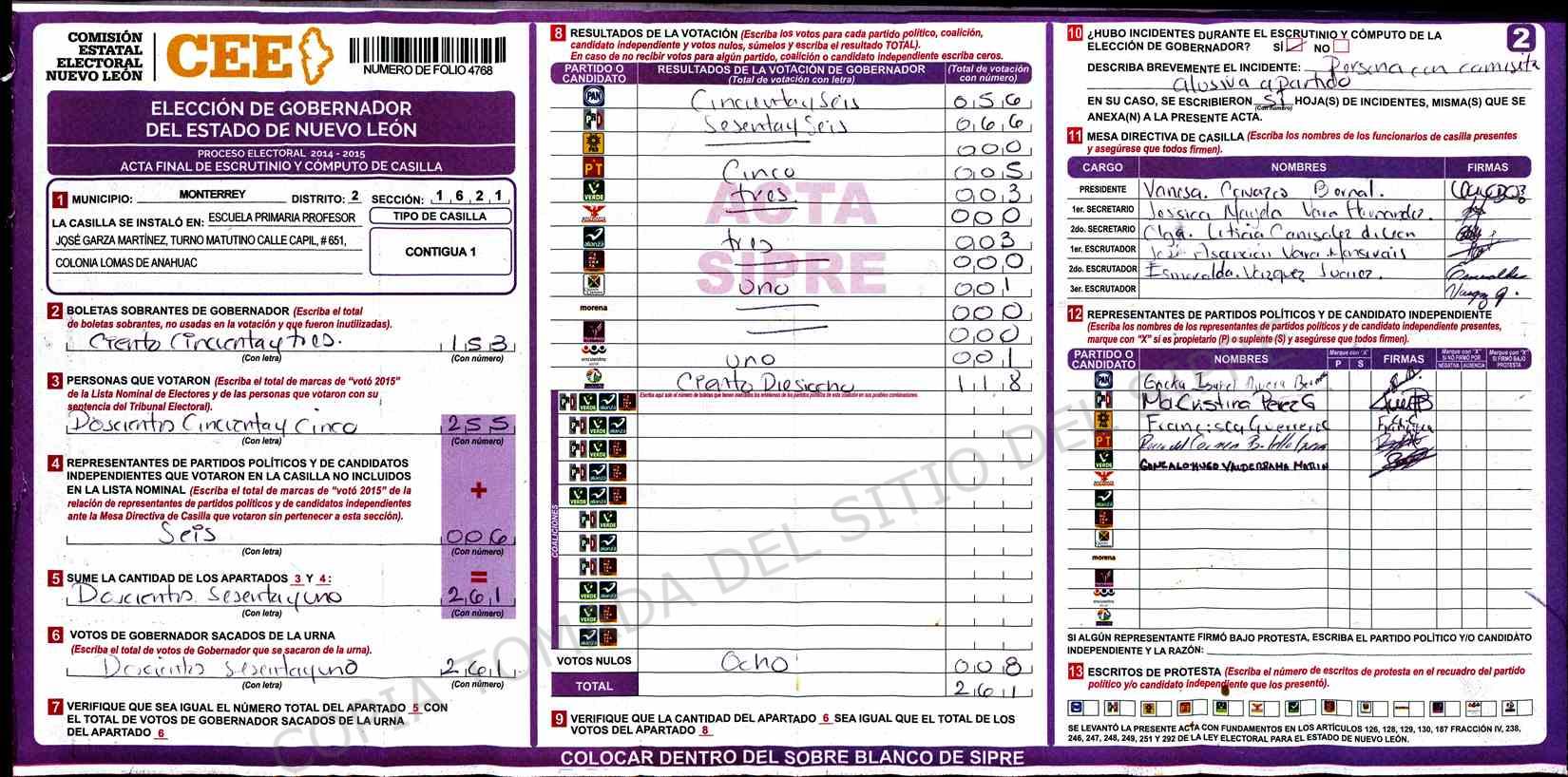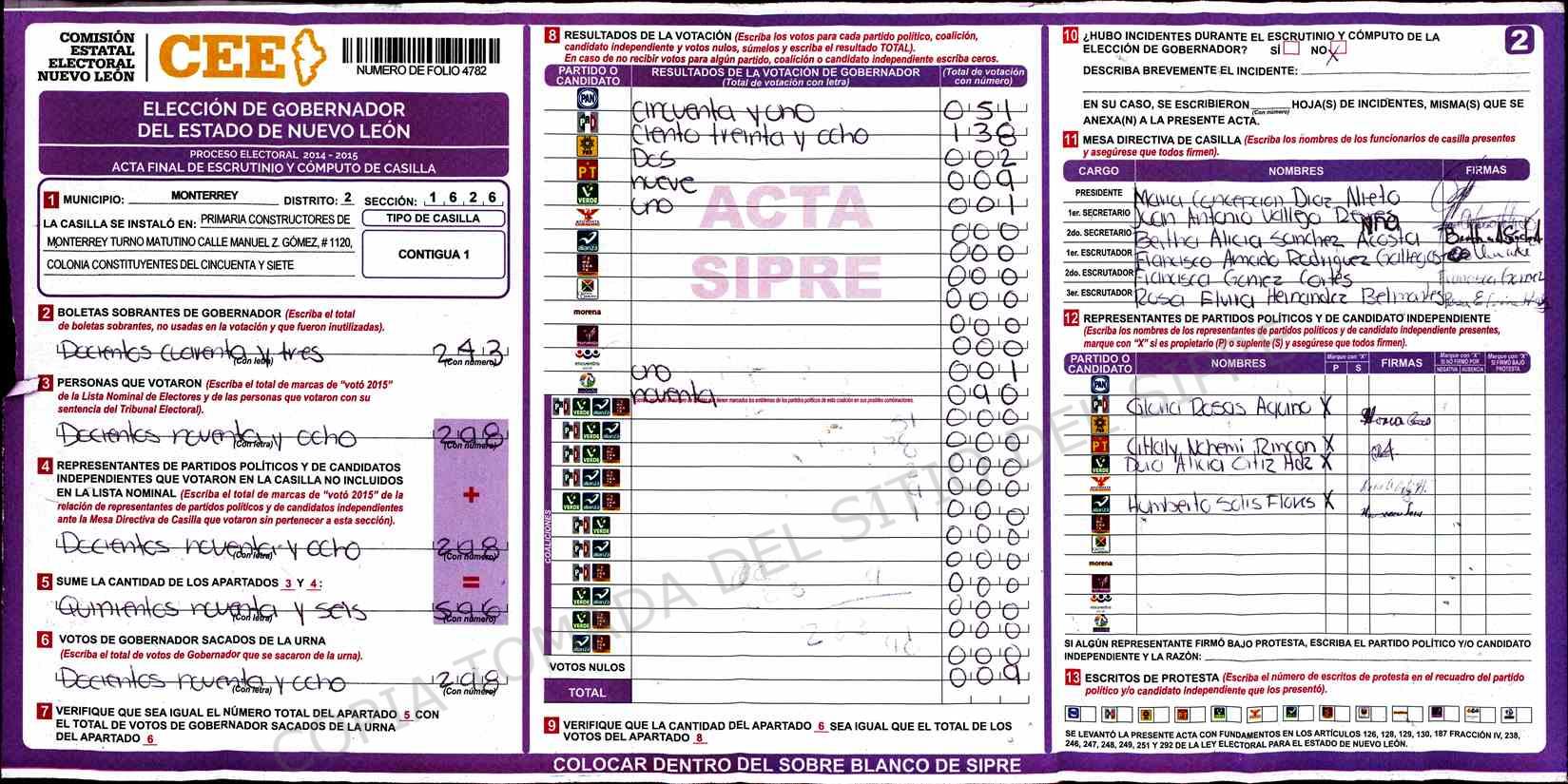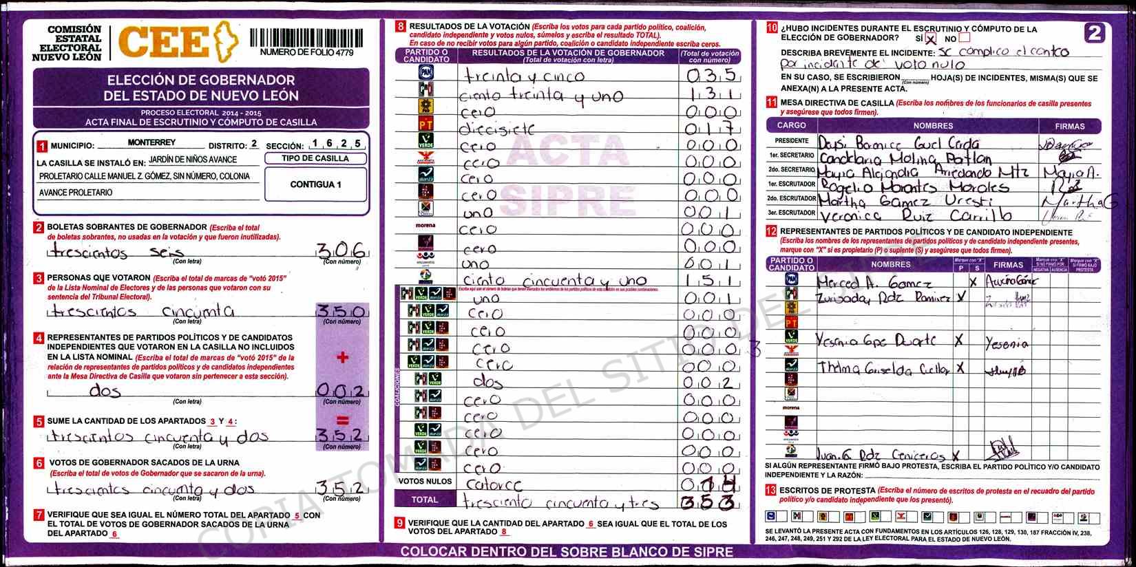 | Claves de Incidencia: | (1) Ilegible, (2) Mutilada, (3) Presenta Correcciones, (4) Presenta Borrones, (5) En Blanco, (6) Cifras Remarcadas, (7) Cifras de Mas, (8) Copiado Movido, (9) Con Signos Inválidos, (10) Excede Lista Nominal, (11) Otra |