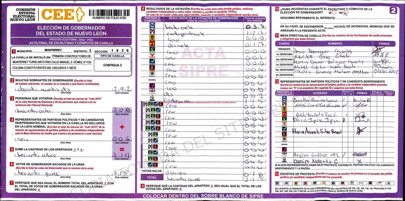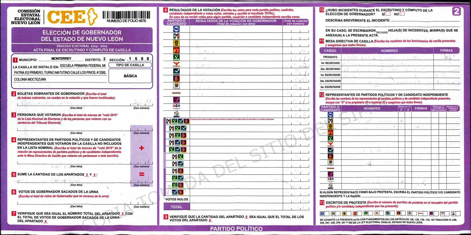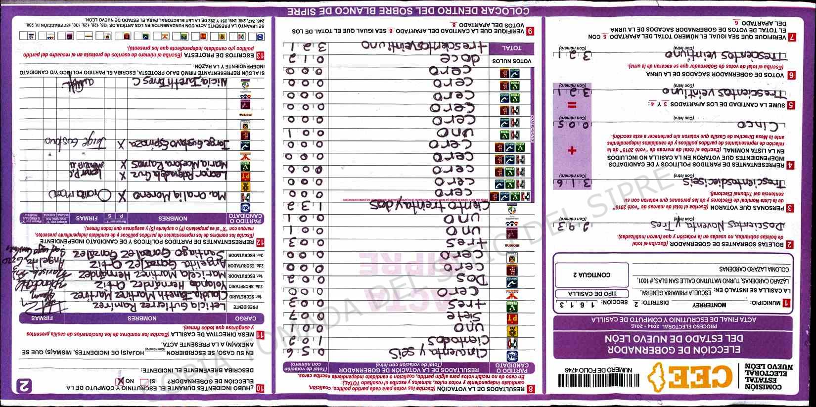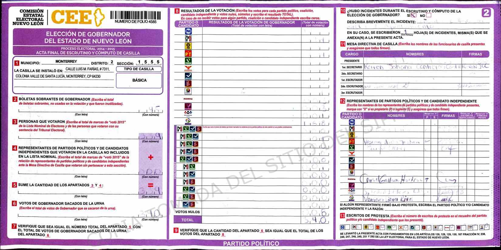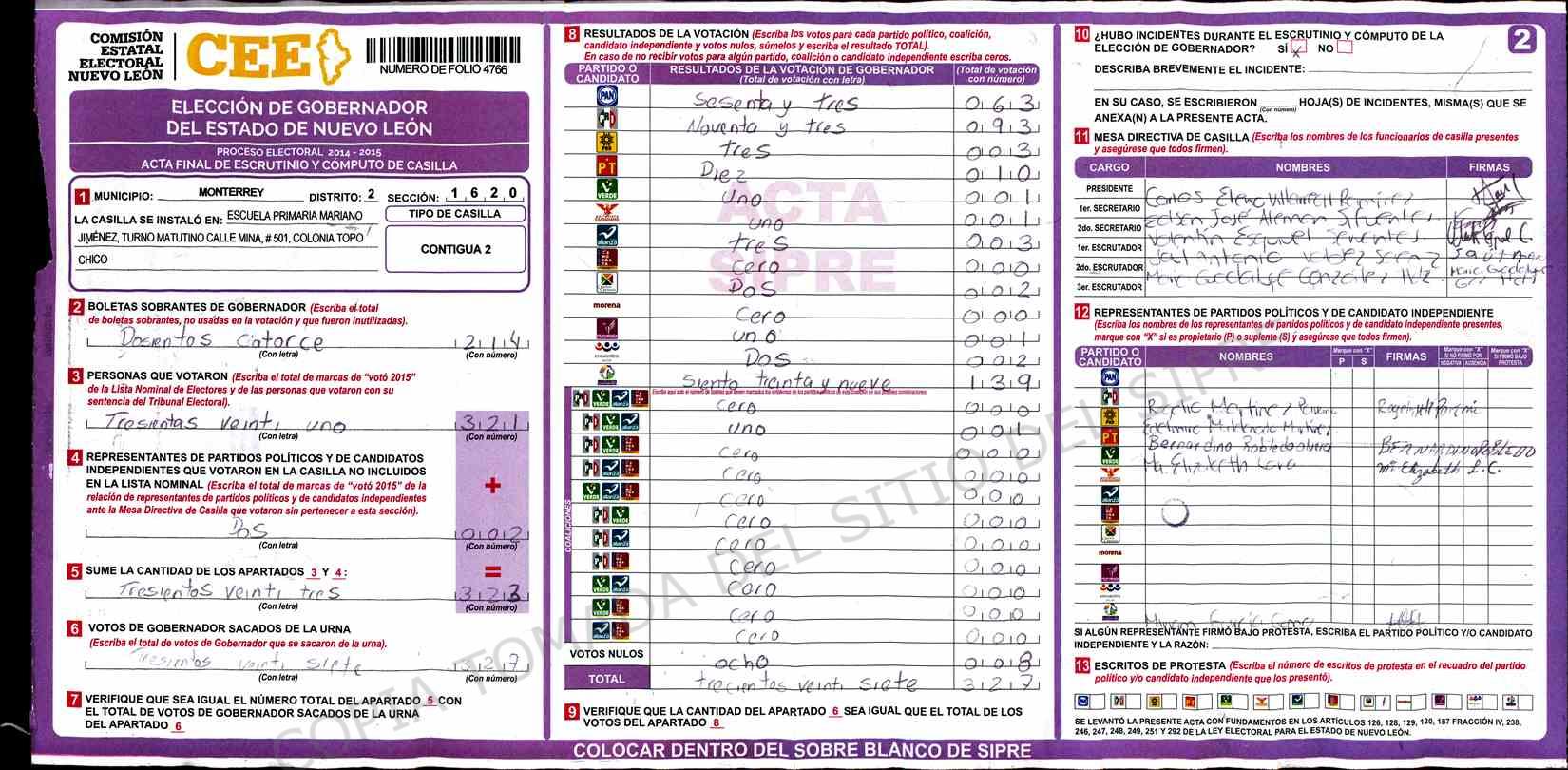 | Claves de Incidencia: | (1) Ilegible, (2) Mutilada, (3) Presenta Correcciones, (4) Presenta Borrones, (5) En Blanco, (6) Cifras Remarcadas, (7) Cifras de Mas, (8) Copiado Movido, (9) Con Signos Inválidos, (10) Excede Lista Nominal, (11) Otra |