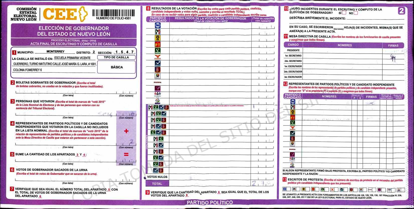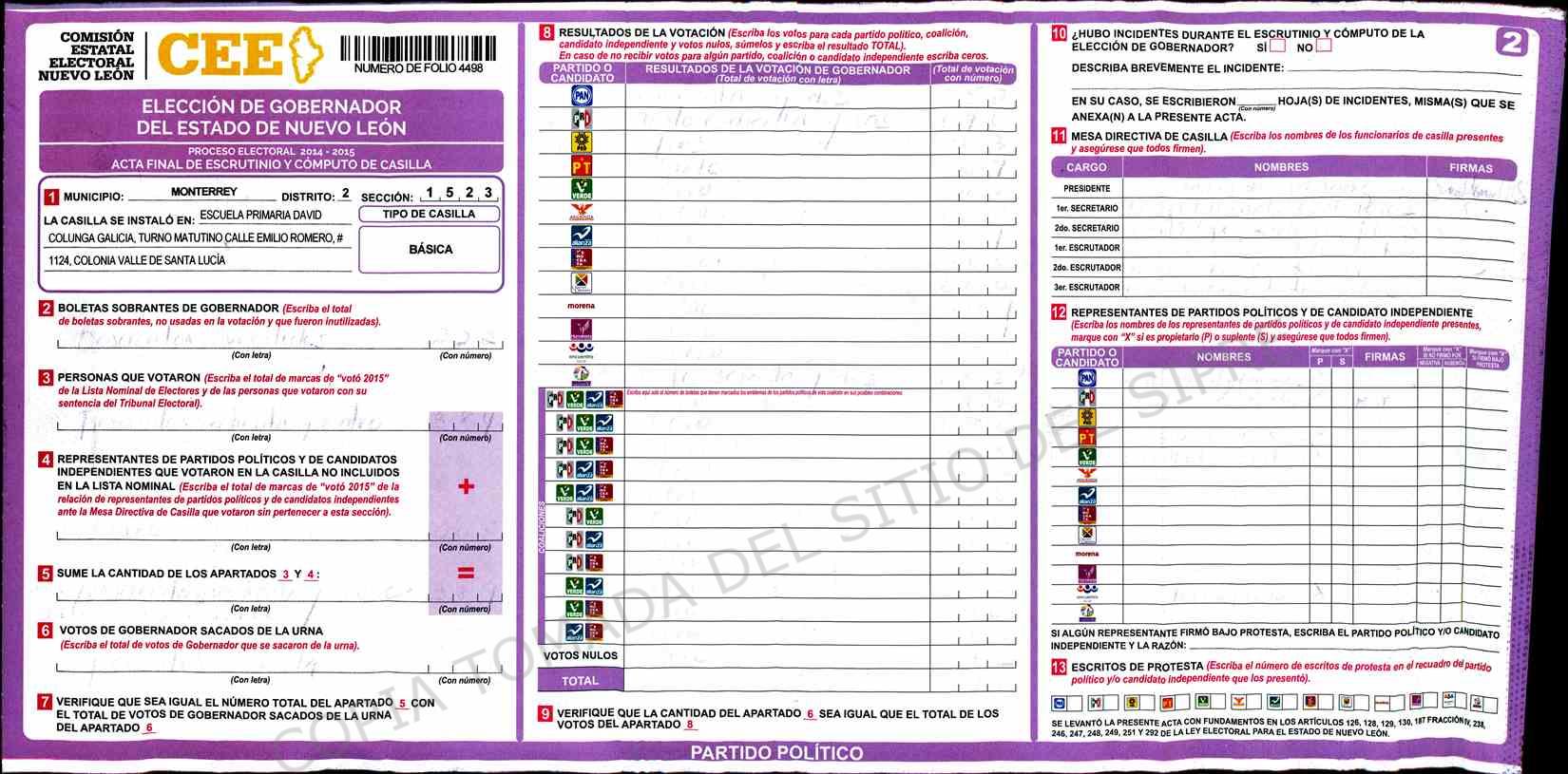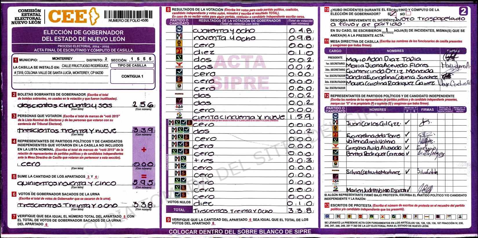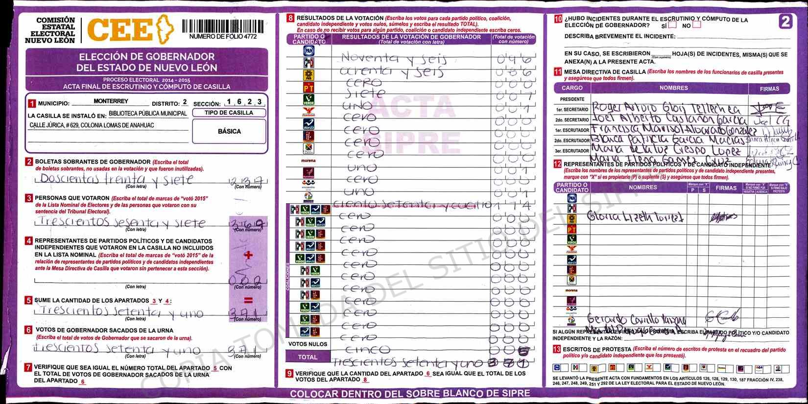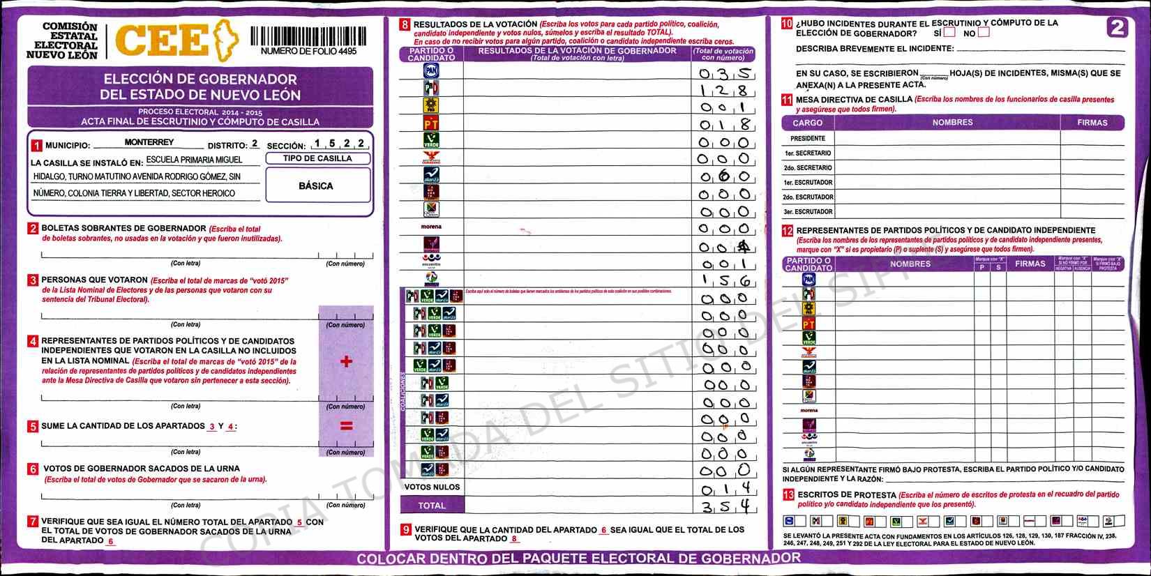 | Claves de Incidencia: | (1) Ilegible, (2) Mutilada, (3) Presenta Correcciones, (4) Presenta Borrones, (5) En Blanco, (6) Cifras Remarcadas, (7) Cifras de Mas, (8) Copiado Movido, (9) Con Signos Inválidos, (10) Excede Lista Nominal, (11) Otra |