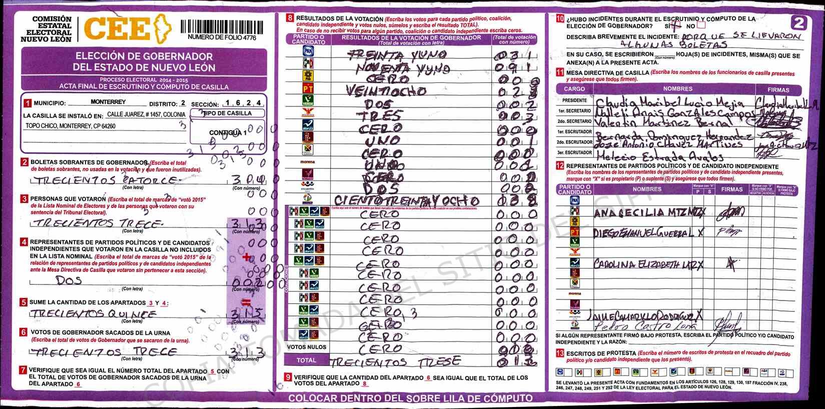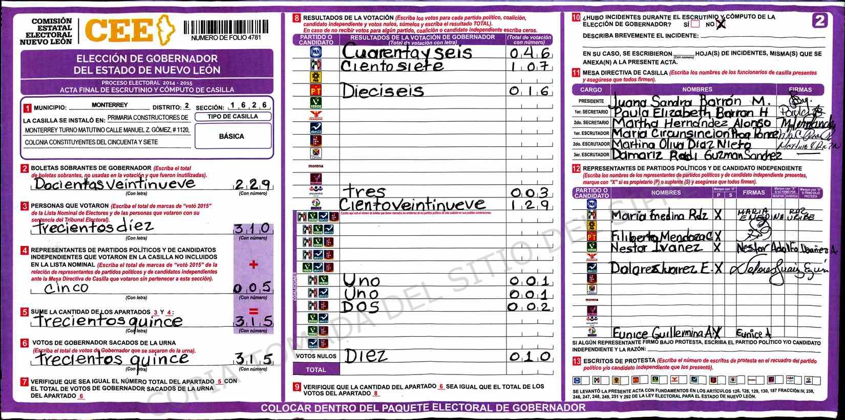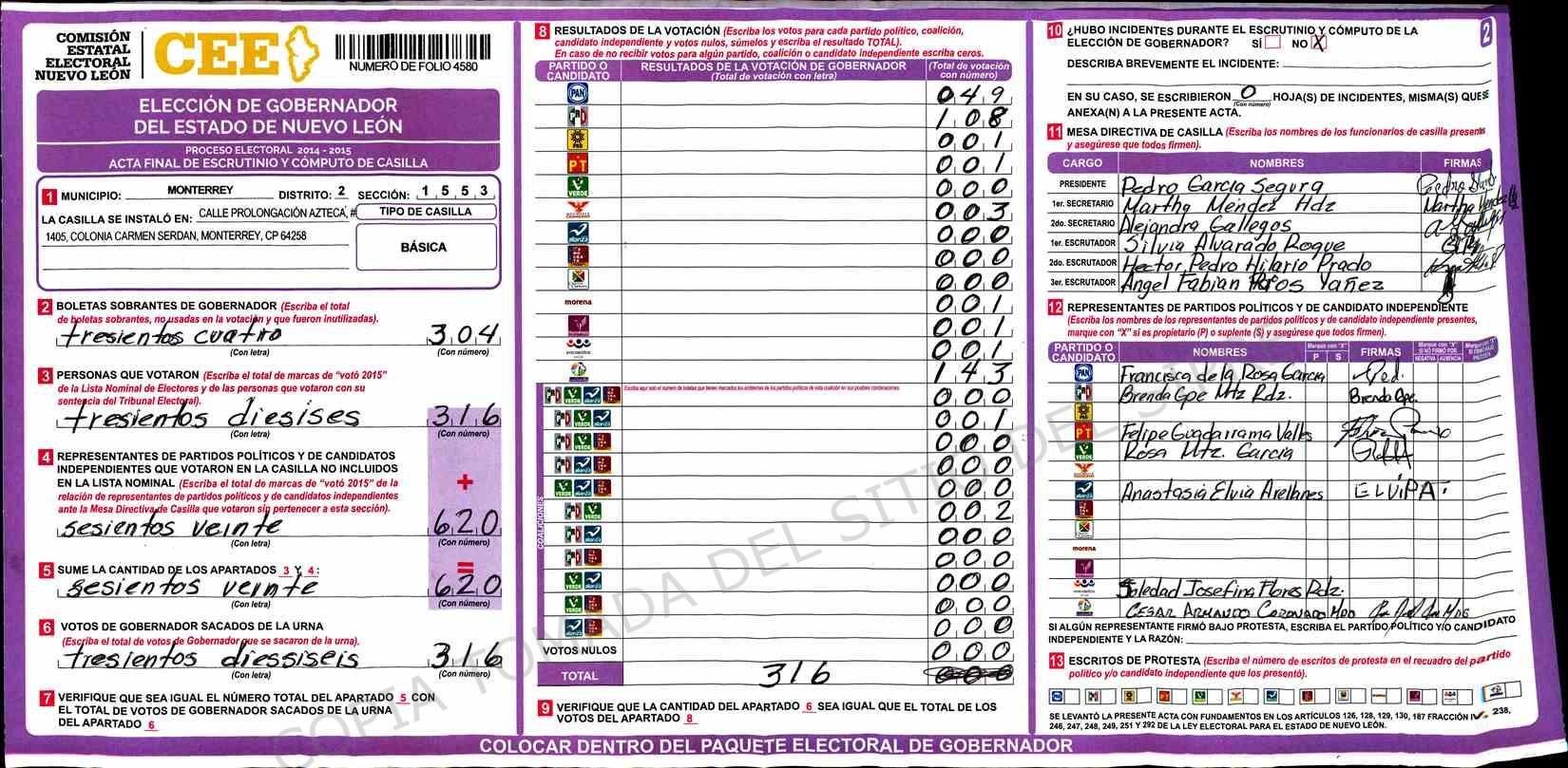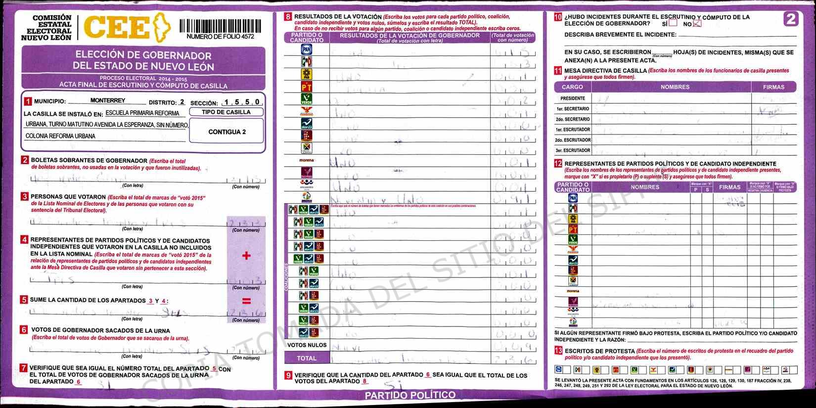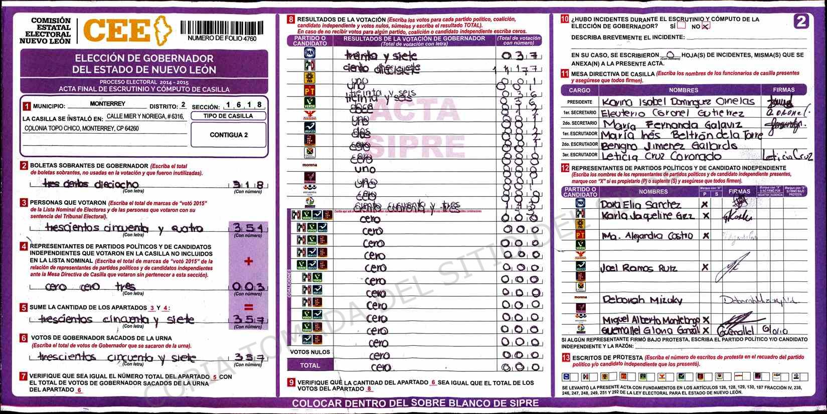 | Claves de Incidencia: | (1) Ilegible, (2) Mutilada, (3) Presenta Correcciones, (4) Presenta Borrones, (5) En Blanco, (6) Cifras Remarcadas, (7) Cifras de Mas, (8) Copiado Movido, (9) Con Signos Inválidos, (10) Excede Lista Nominal, (11) Otra |