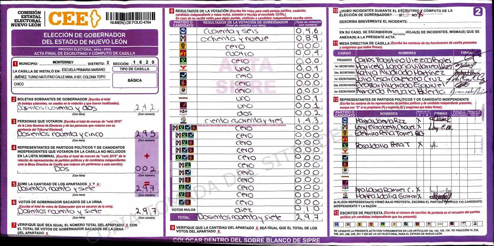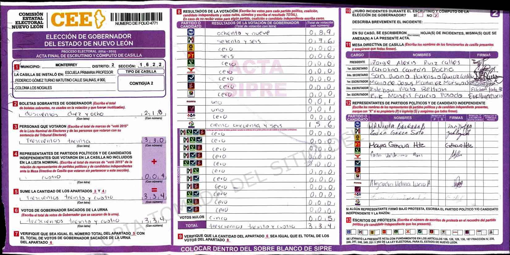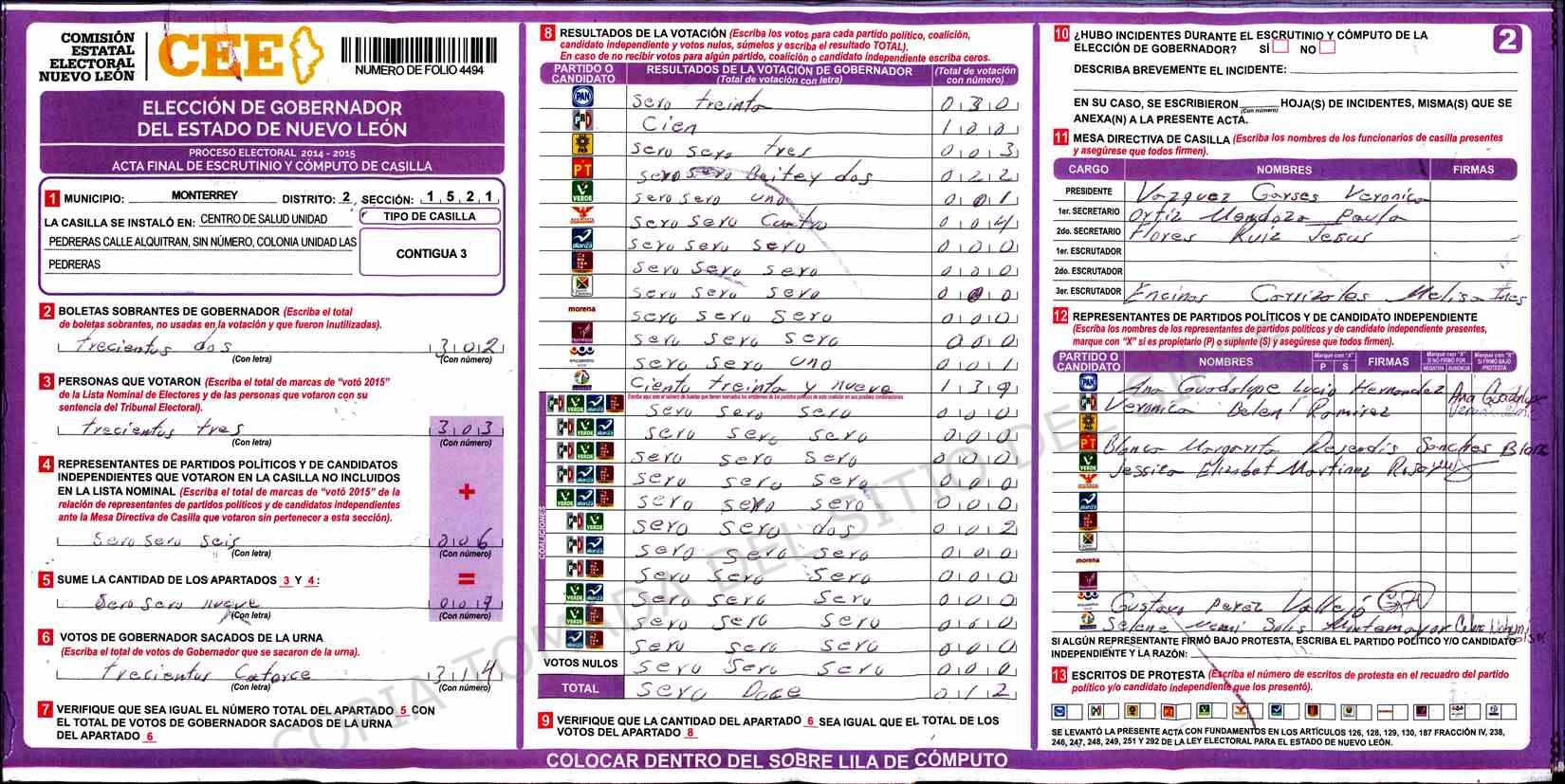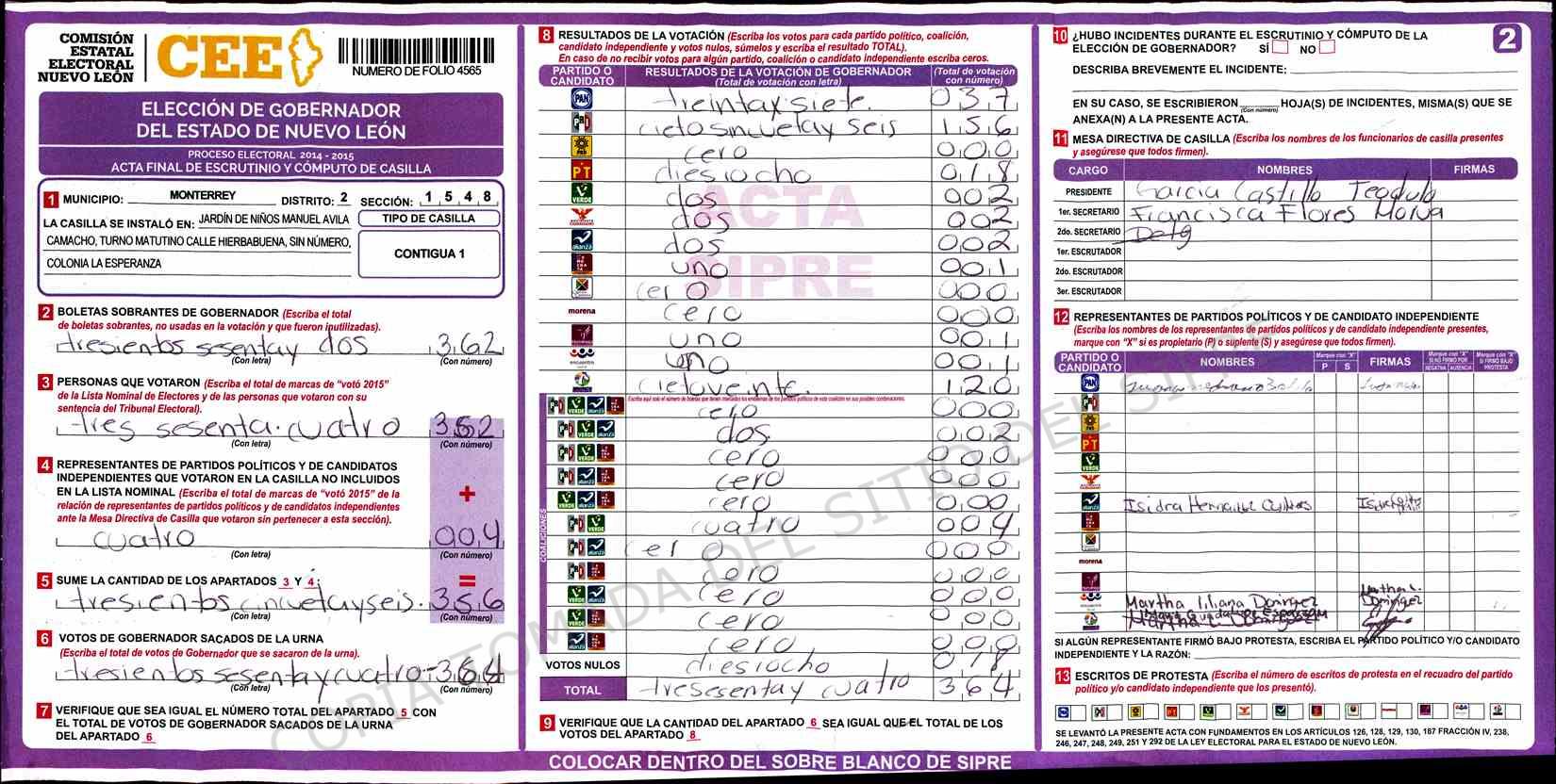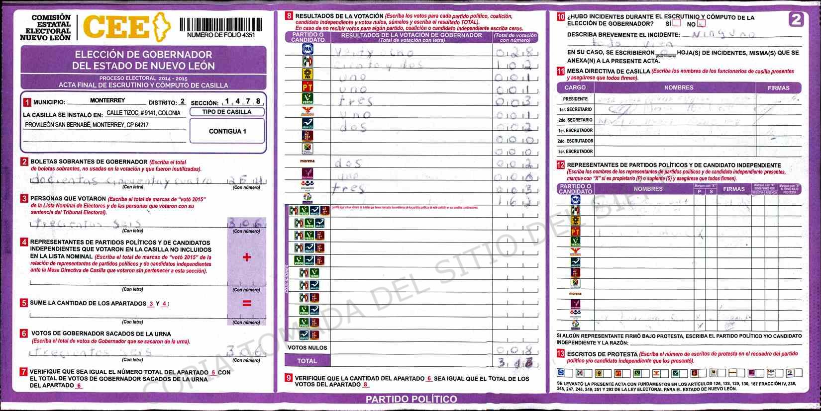 | Claves de Incidencia: | (1) Ilegible, (2) Mutilada, (3) Presenta Correcciones, (4) Presenta Borrones, (5) En Blanco, (6) Cifras Remarcadas, (7) Cifras de Mas, (8) Copiado Movido, (9) Con Signos Inválidos, (10) Excede Lista Nominal, (11) Otra |