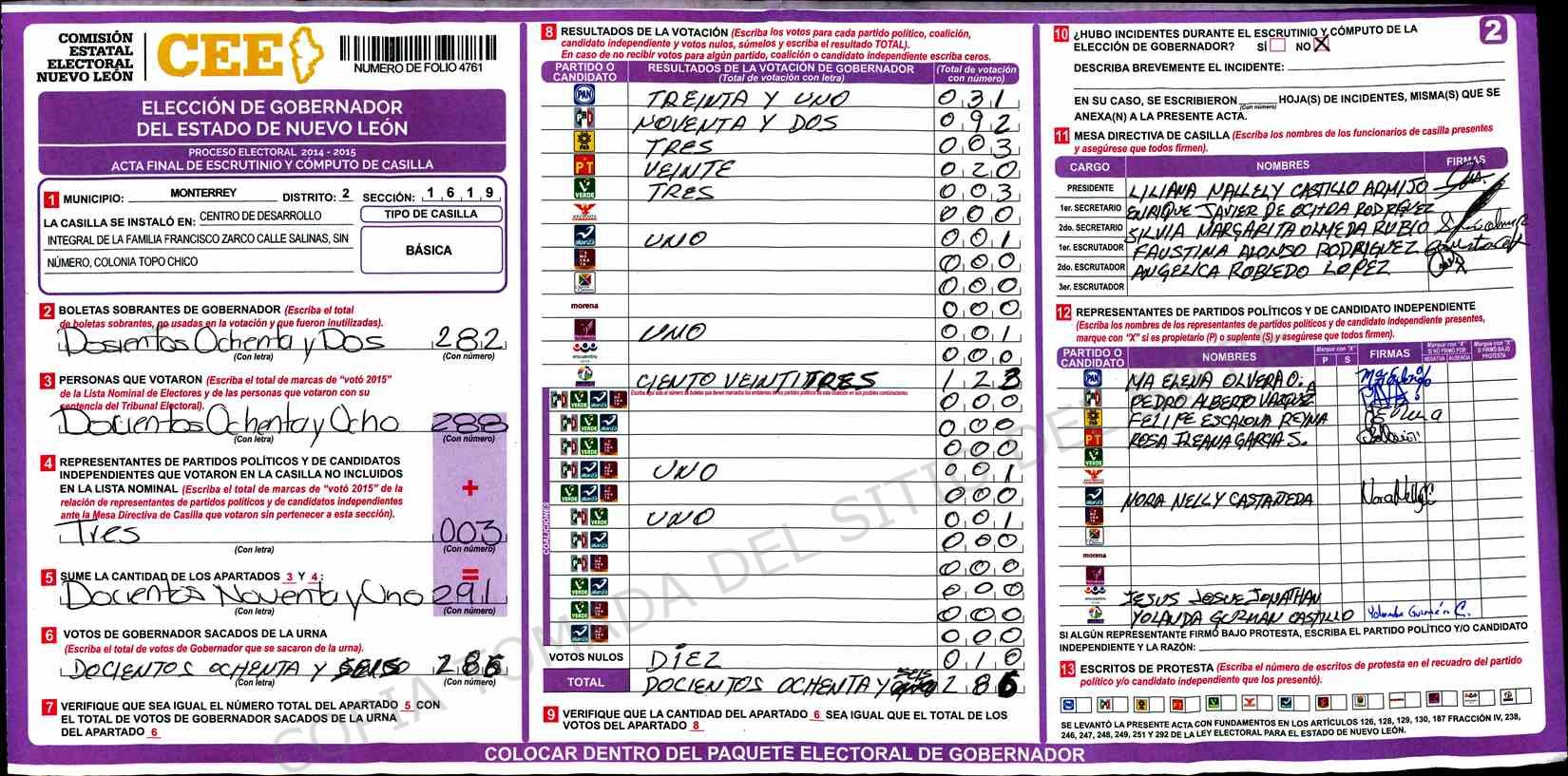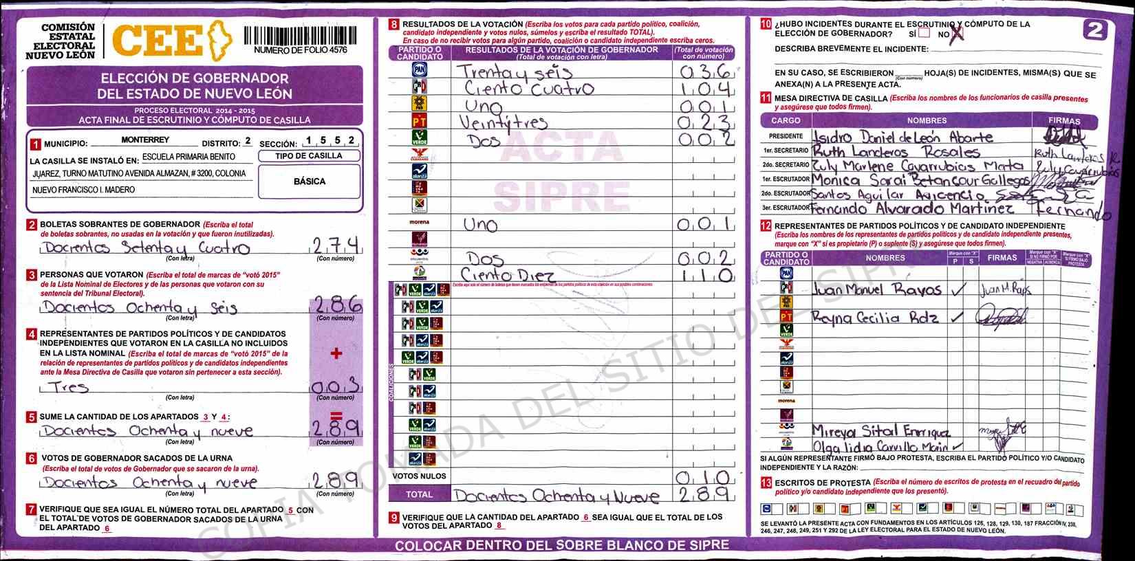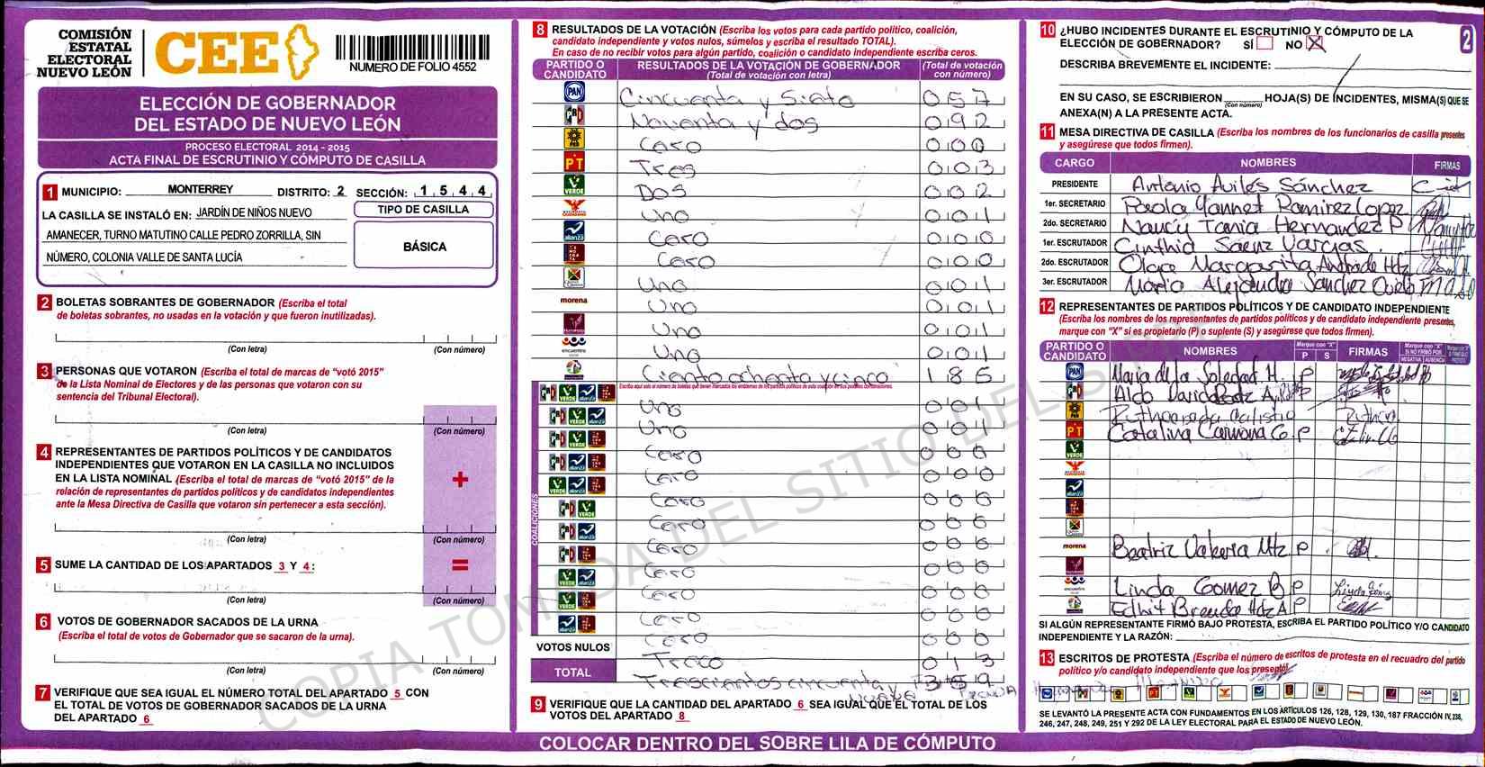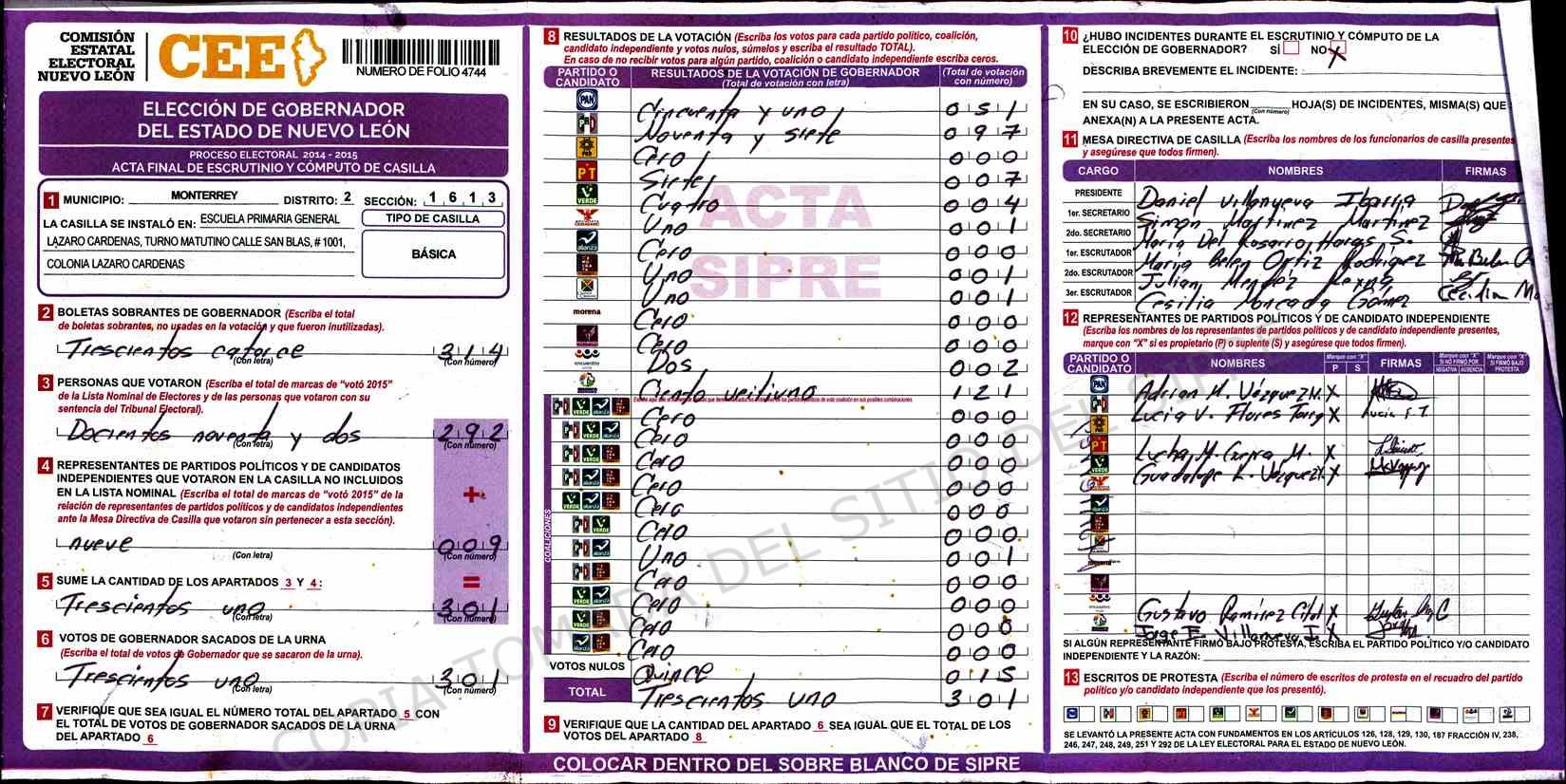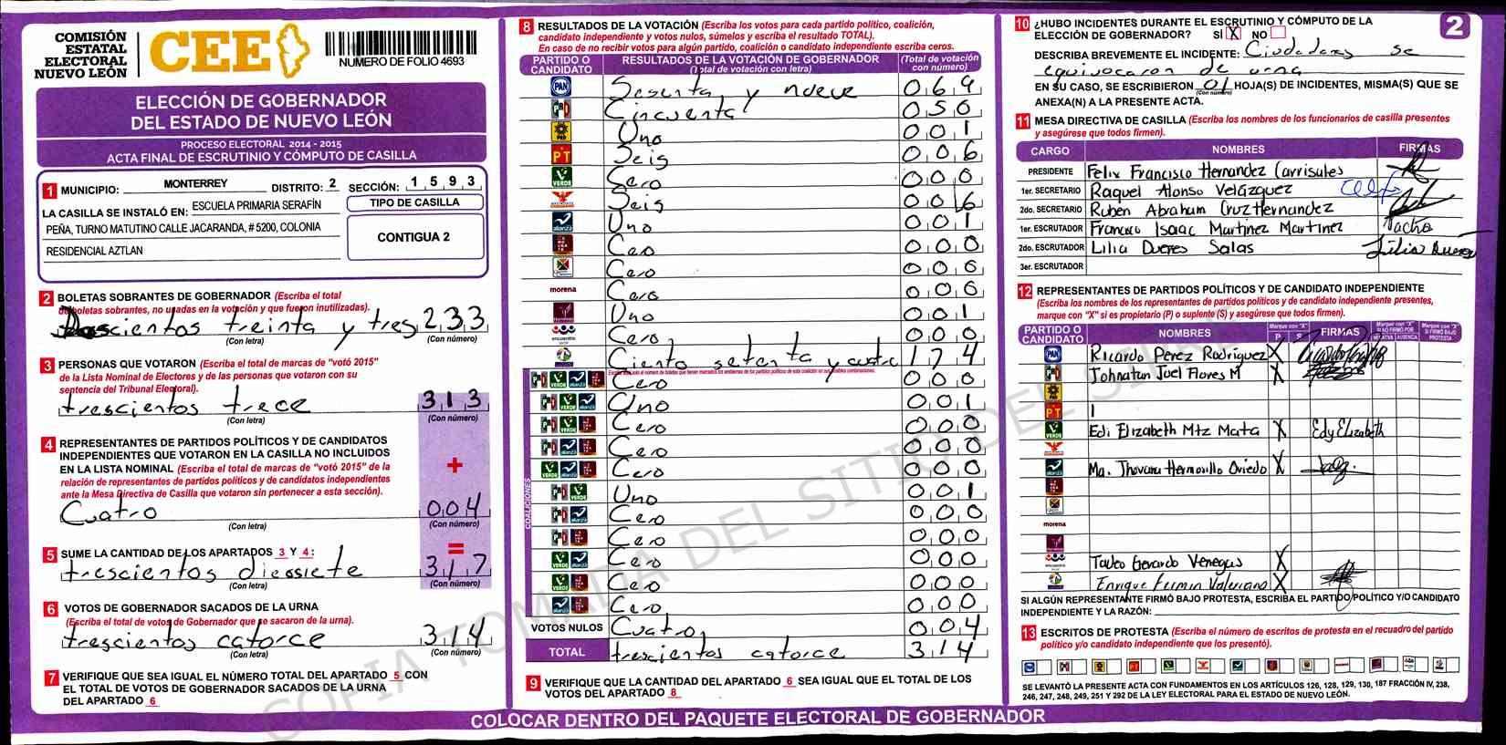 | Claves de Incidencia: | (1) Ilegible, (2) Mutilada, (3) Presenta Correcciones, (4) Presenta Borrones, (5) En Blanco, (6) Cifras Remarcadas, (7) Cifras de Mas, (8) Copiado Movido, (9) Con Signos Inválidos, (10) Excede Lista Nominal, (11) Otra |