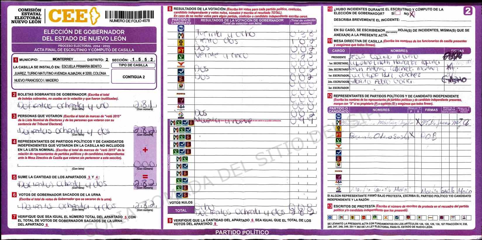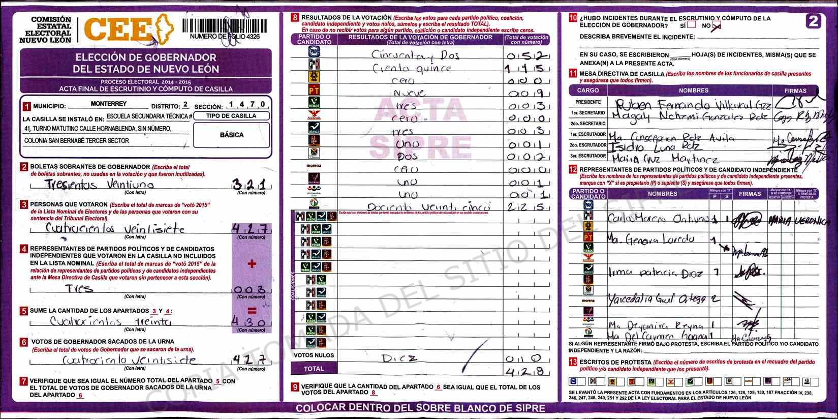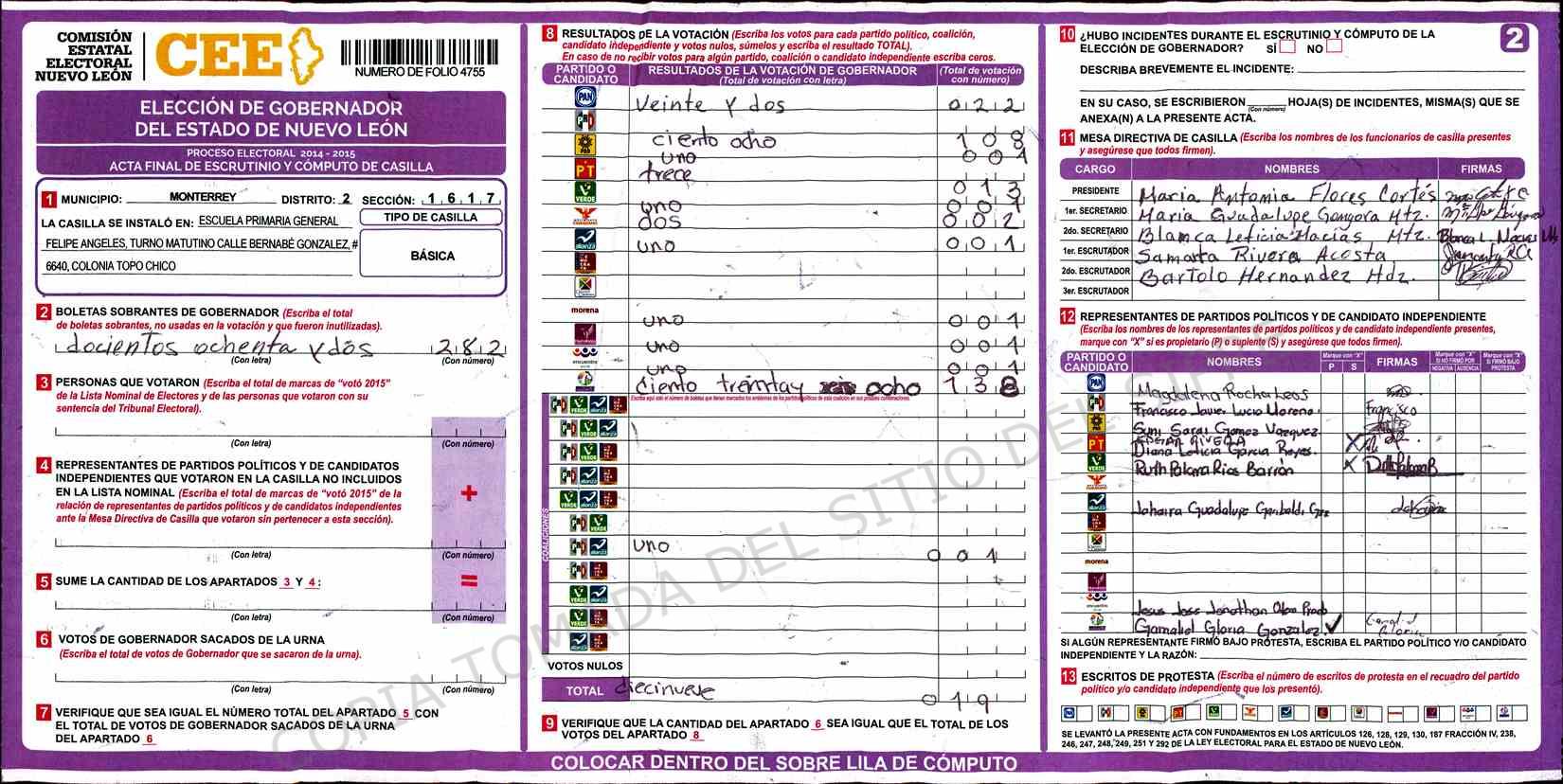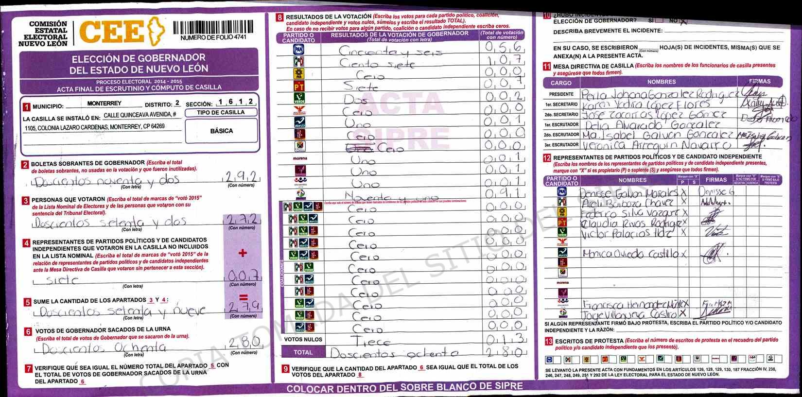 | Claves de Incidencia: | (1) Ilegible, (2) Mutilada, (3) Presenta Correcciones, (4) Presenta Borrones, (5) En Blanco, (6) Cifras Remarcadas, (7) Cifras de Mas, (8) Copiado Movido, (9) Con Signos Inválidos, (10) Excede Lista Nominal, (11) Otra |