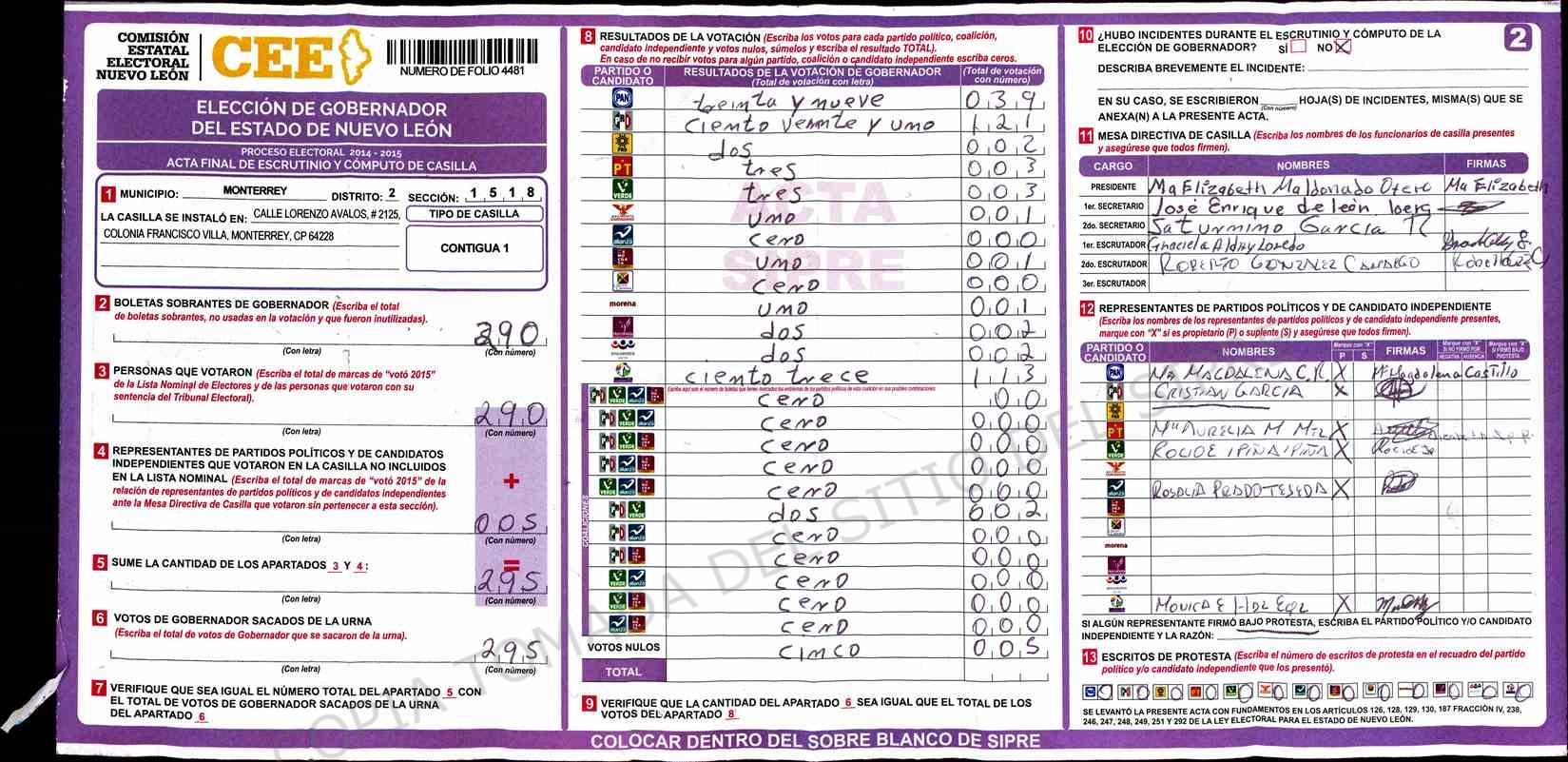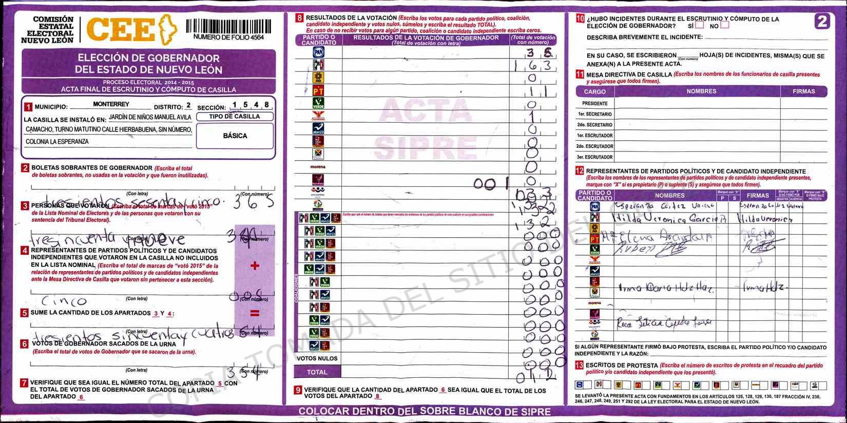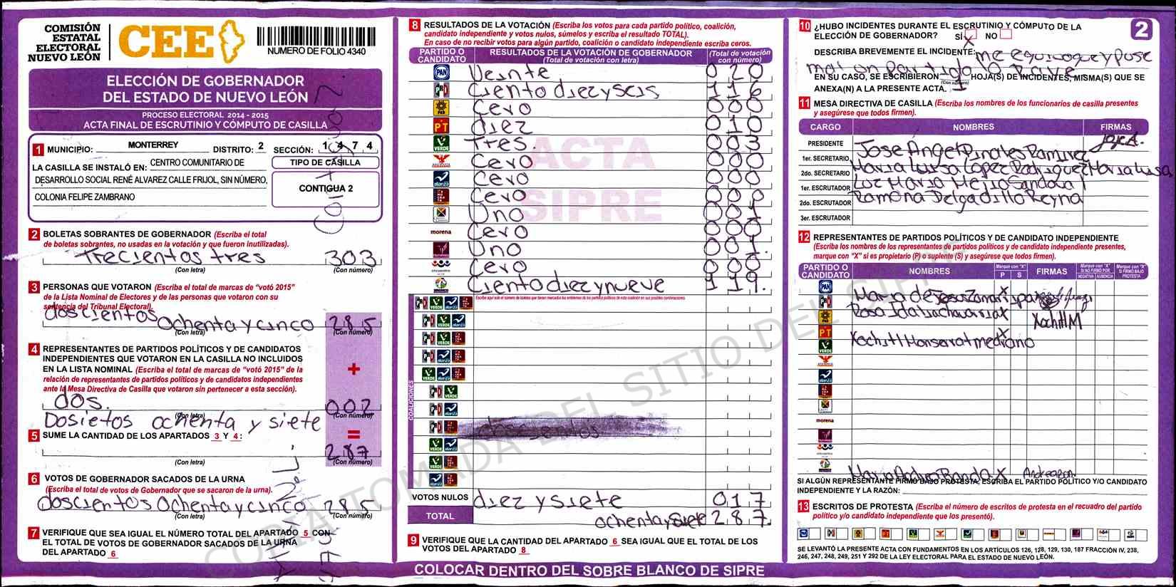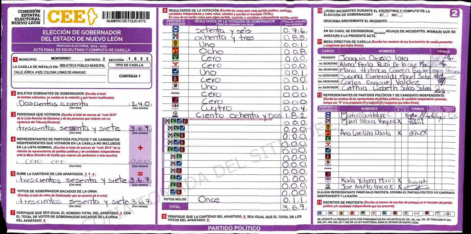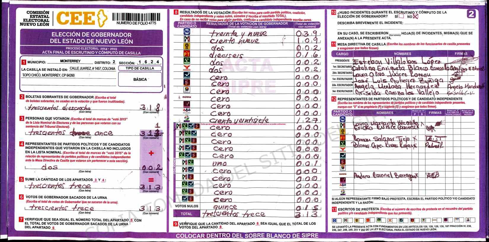 | Claves de Incidencia: | (1) Ilegible, (2) Mutilada, (3) Presenta Correcciones, (4) Presenta Borrones, (5) En Blanco, (6) Cifras Remarcadas, (7) Cifras de Mas, (8) Copiado Movido, (9) Con Signos Inválidos, (10) Excede Lista Nominal, (11) Otra |