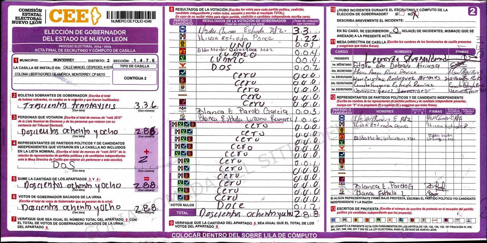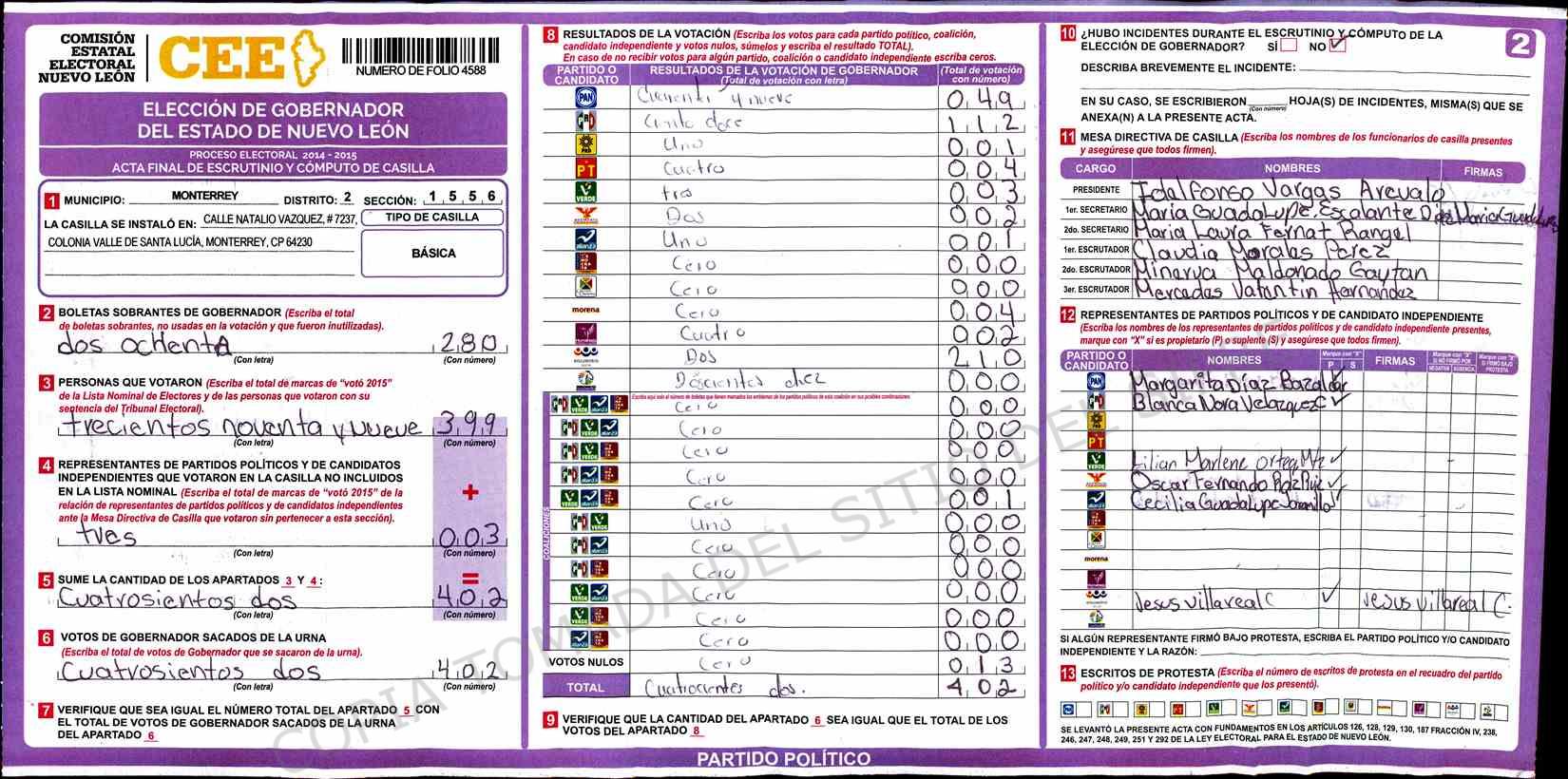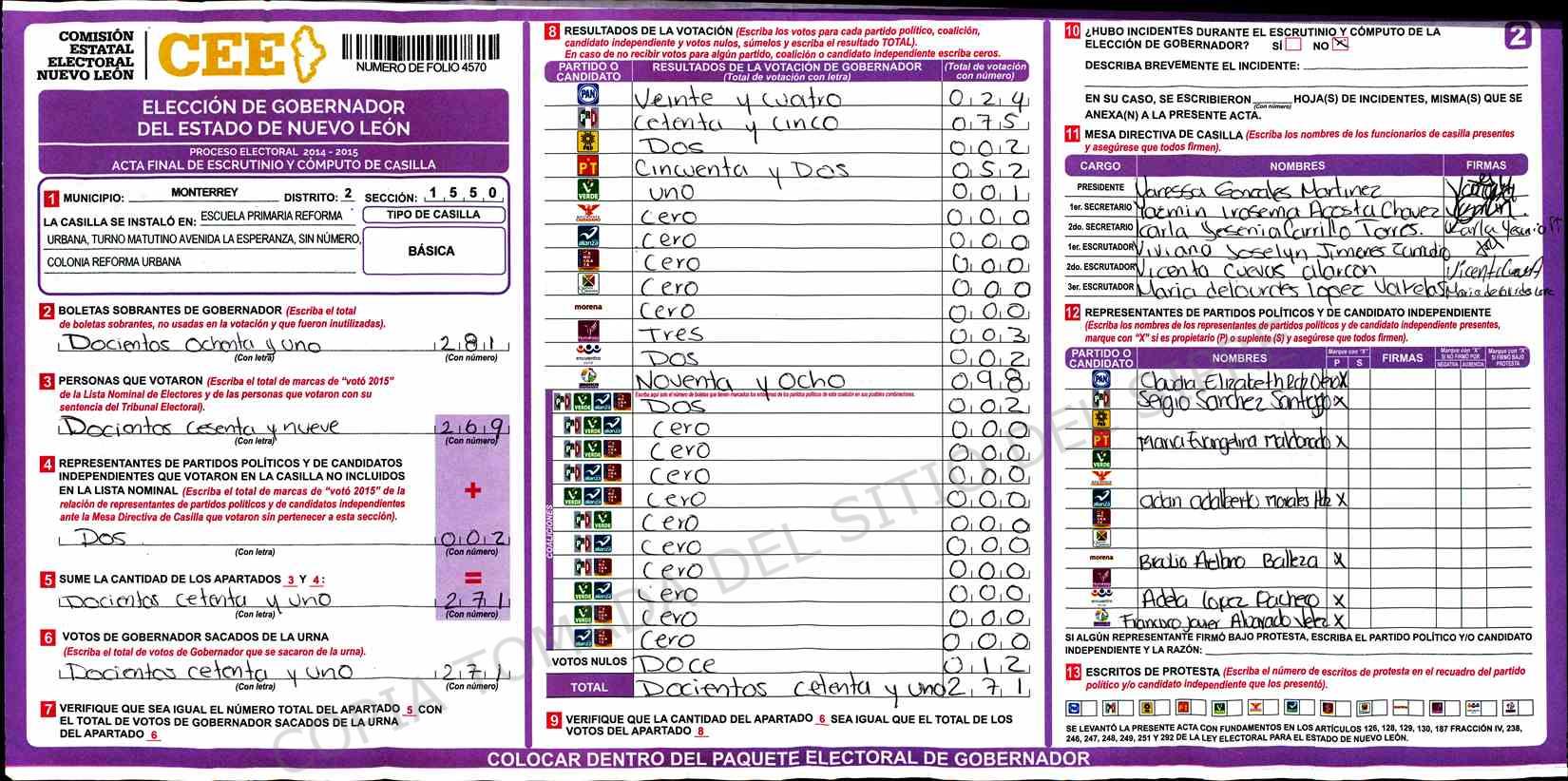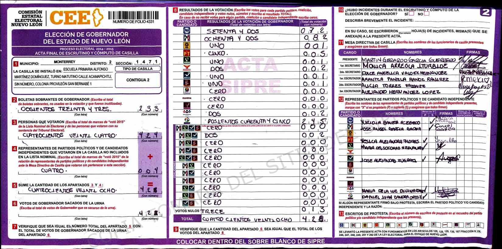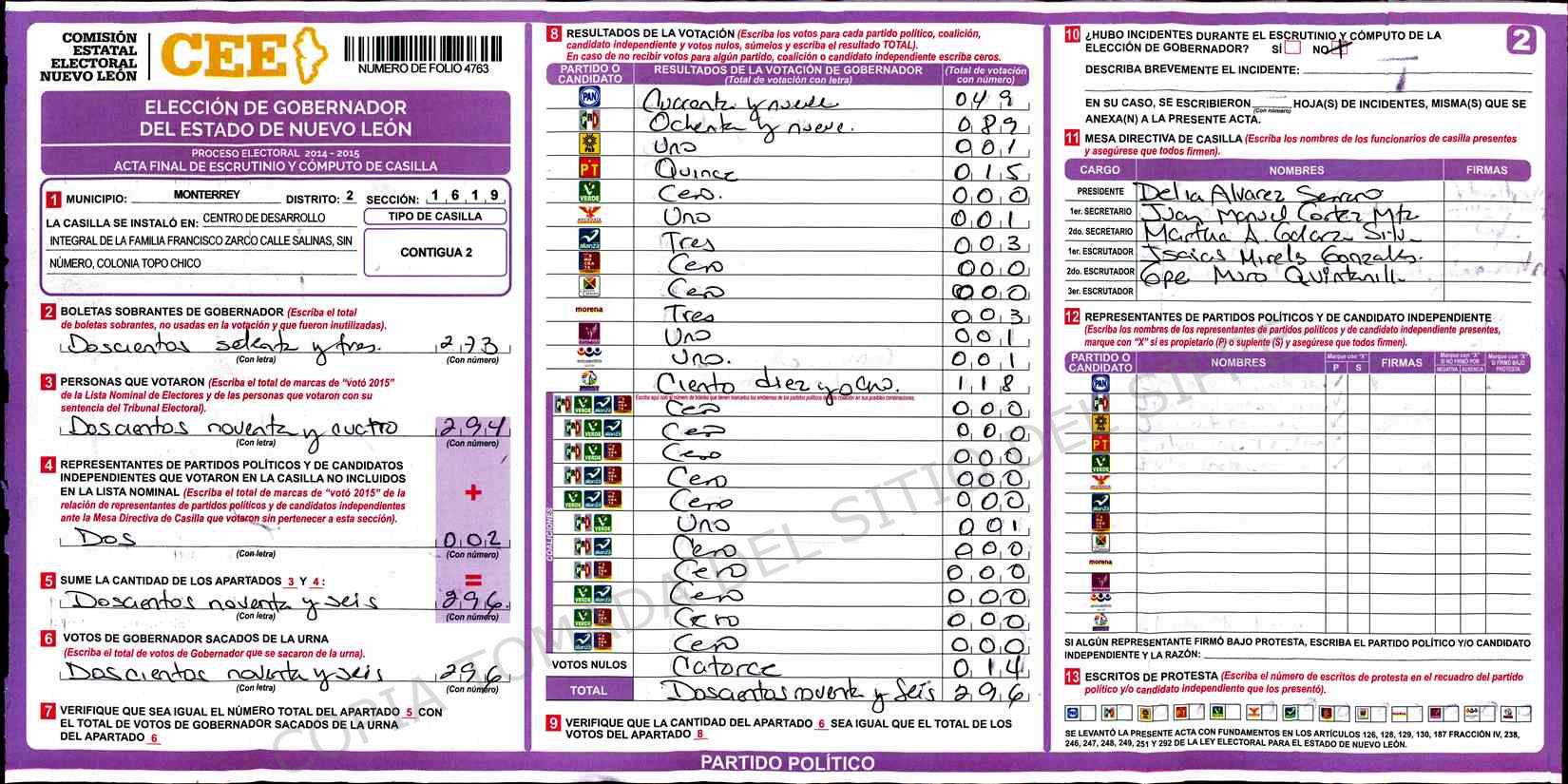 | Claves de Incidencia: | (1) Ilegible, (2) Mutilada, (3) Presenta Correcciones, (4) Presenta Borrones, (5) En Blanco, (6) Cifras Remarcadas, (7) Cifras de Mas, (8) Copiado Movido, (9) Con Signos Inválidos, (10) Excede Lista Nominal, (11) Otra |