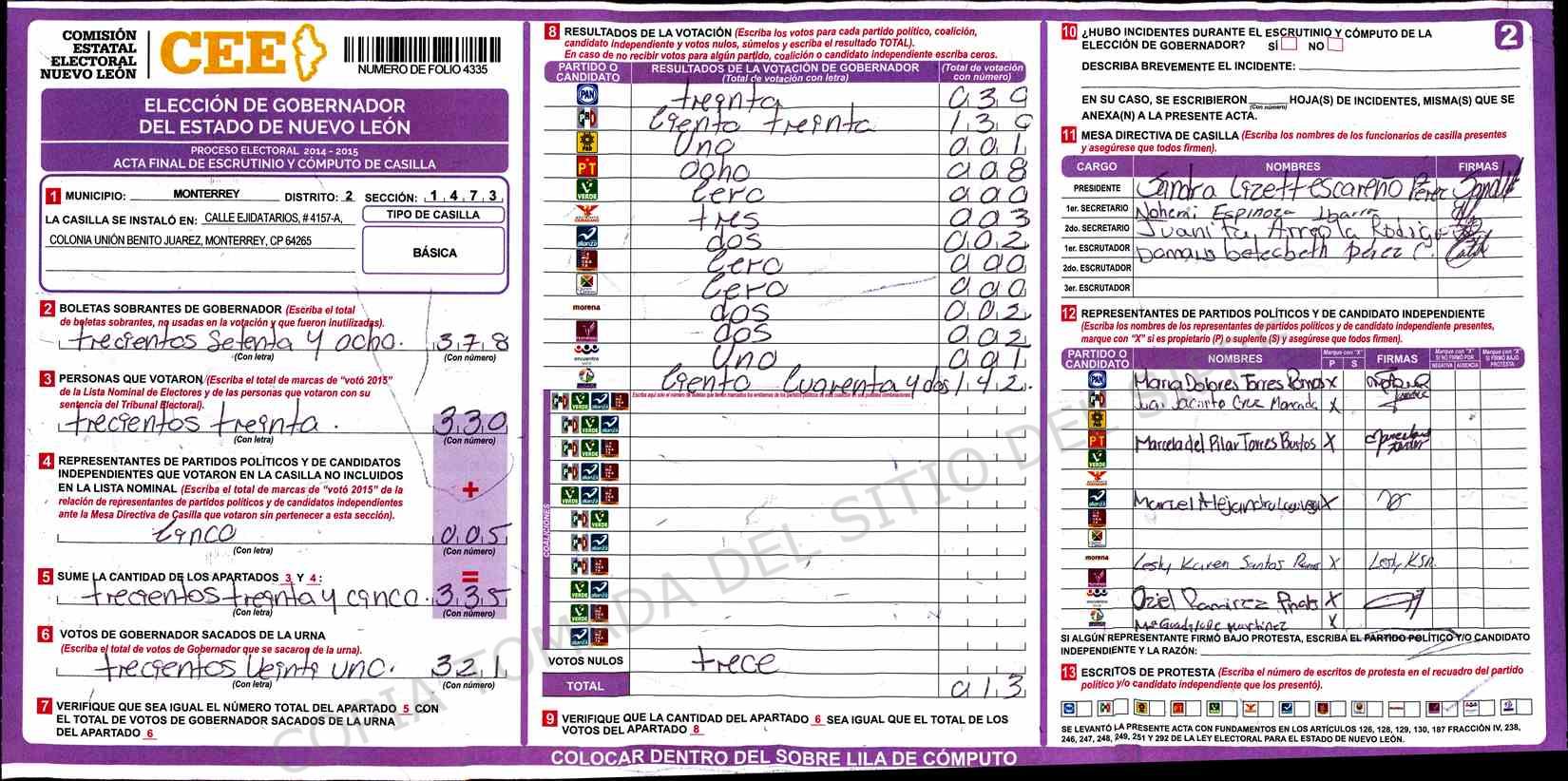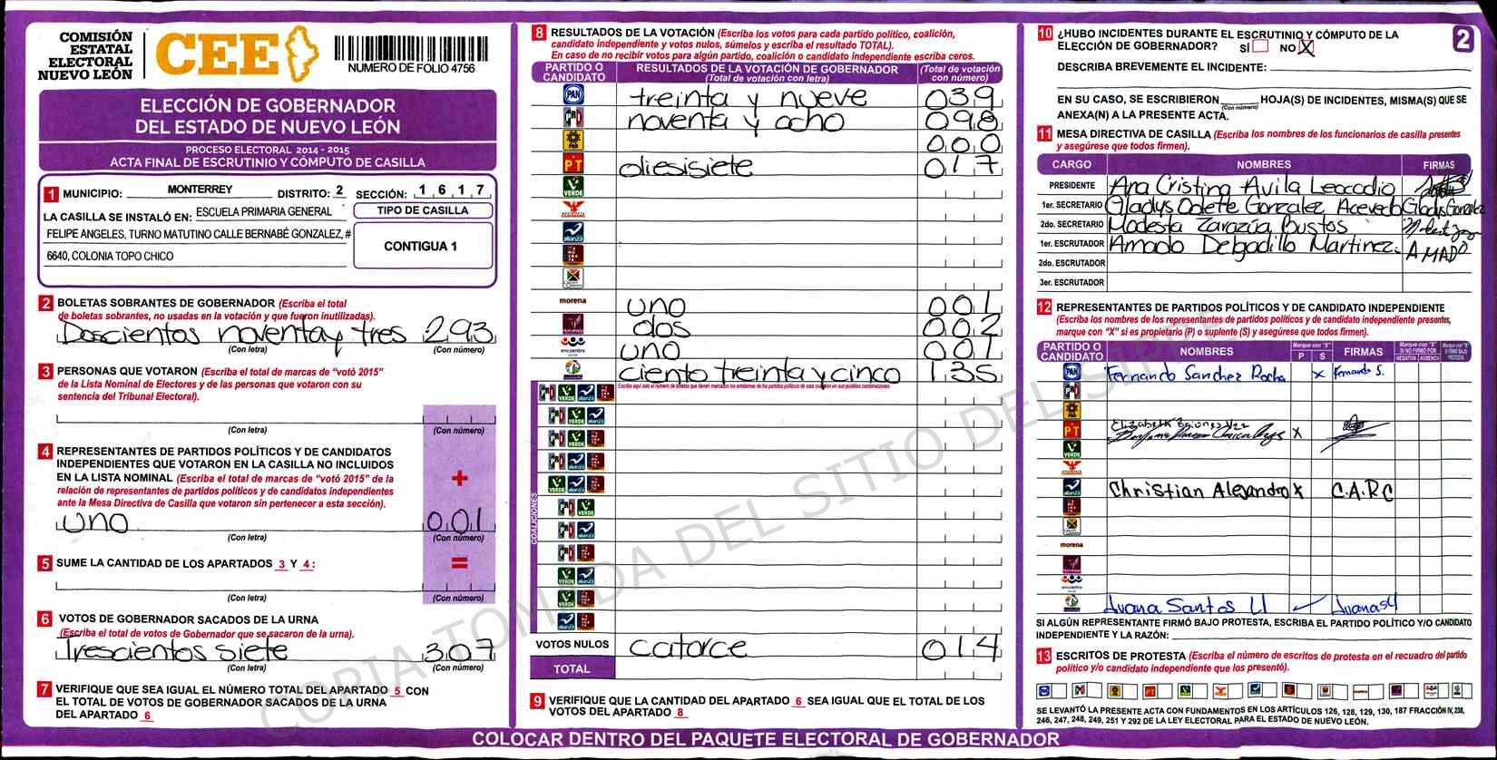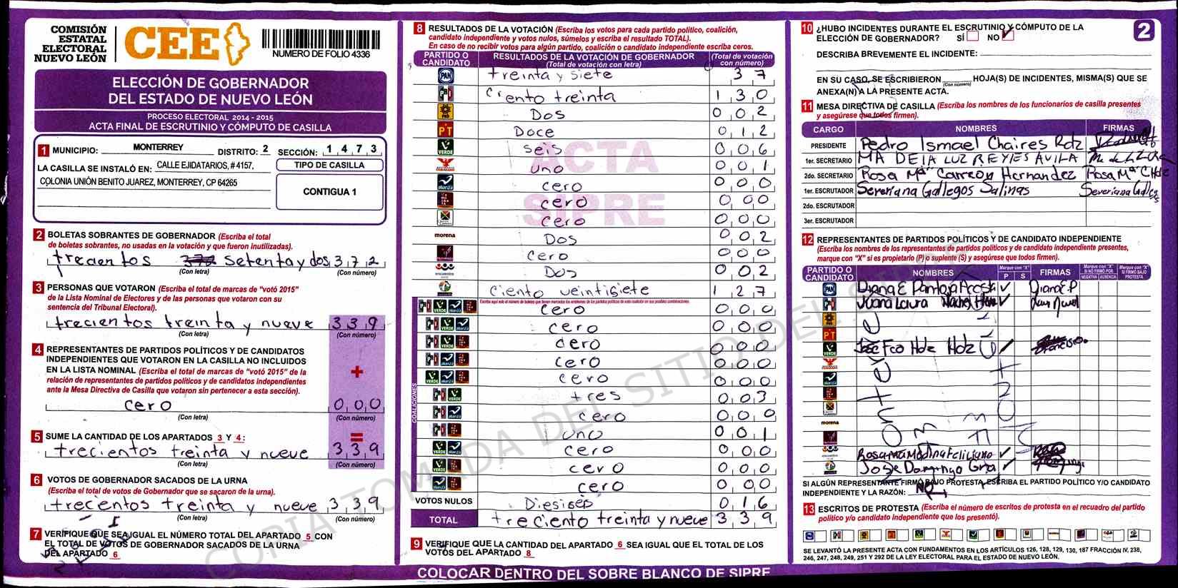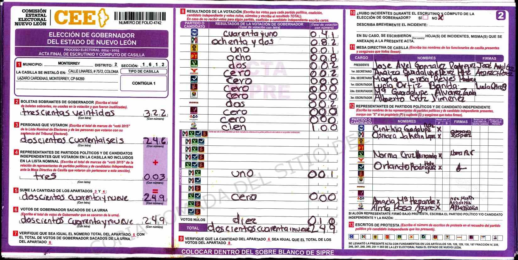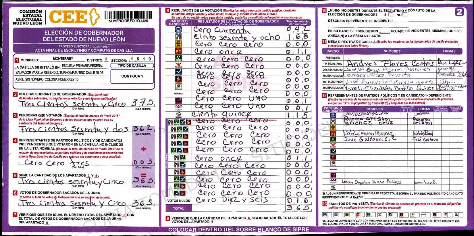 | Claves de Incidencia: | (1) Ilegible, (2) Mutilada, (3) Presenta Correcciones, (4) Presenta Borrones, (5) En Blanco, (6) Cifras Remarcadas, (7) Cifras de Mas, (8) Copiado Movido, (9) Con Signos Inválidos, (10) Excede Lista Nominal, (11) Otra |