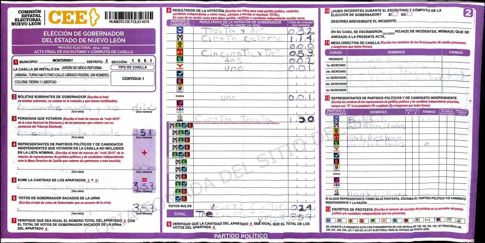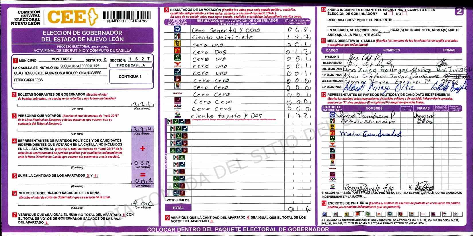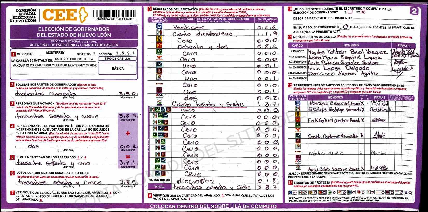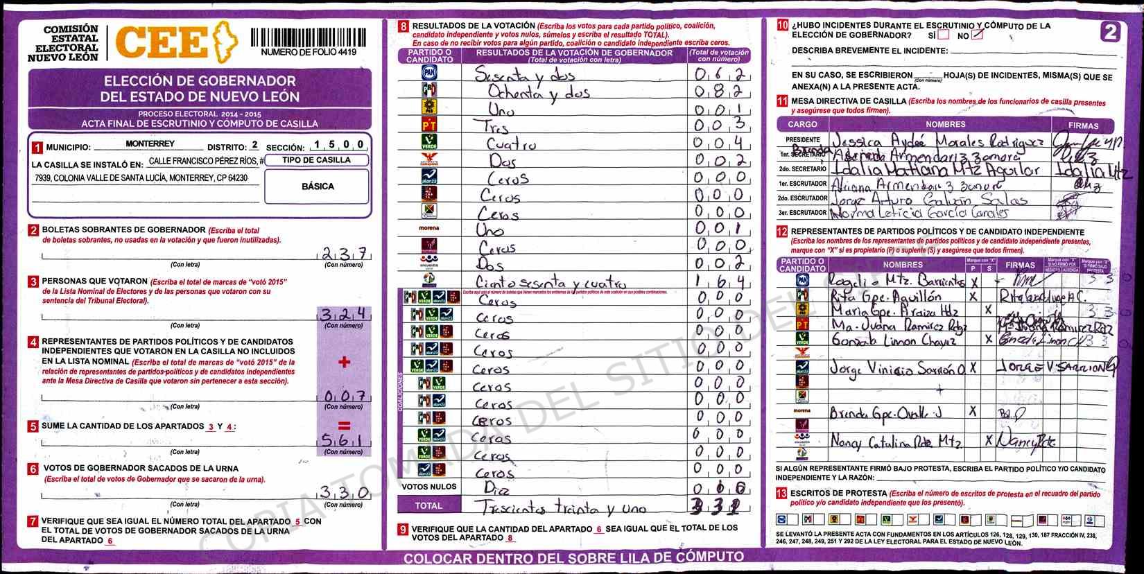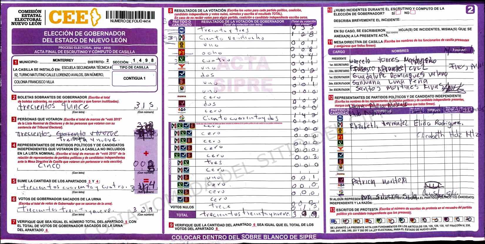 | Claves de Incidencia: | (1) Ilegible, (2) Mutilada, (3) Presenta Correcciones, (4) Presenta Borrones, (5) En Blanco, (6) Cifras Remarcadas, (7) Cifras de Mas, (8) Copiado Movido, (9) Con Signos Inválidos, (10) Excede Lista Nominal, (11) Otra |