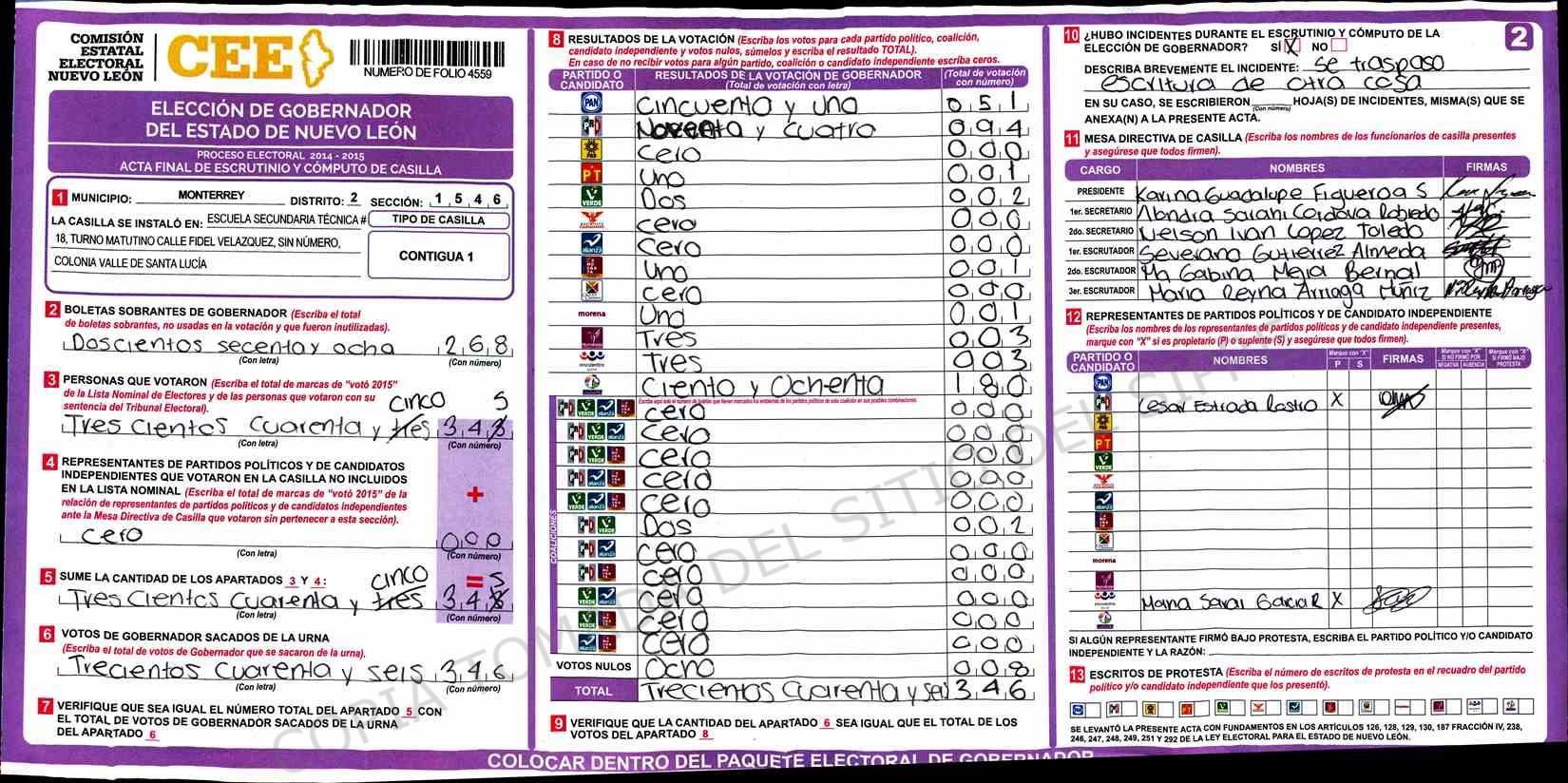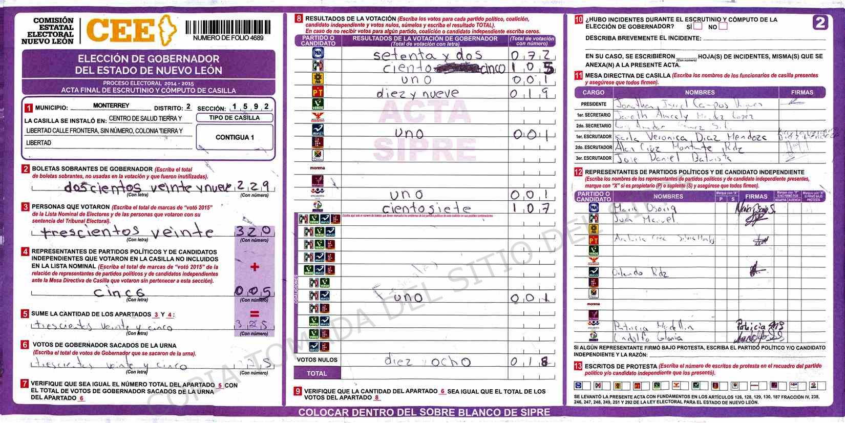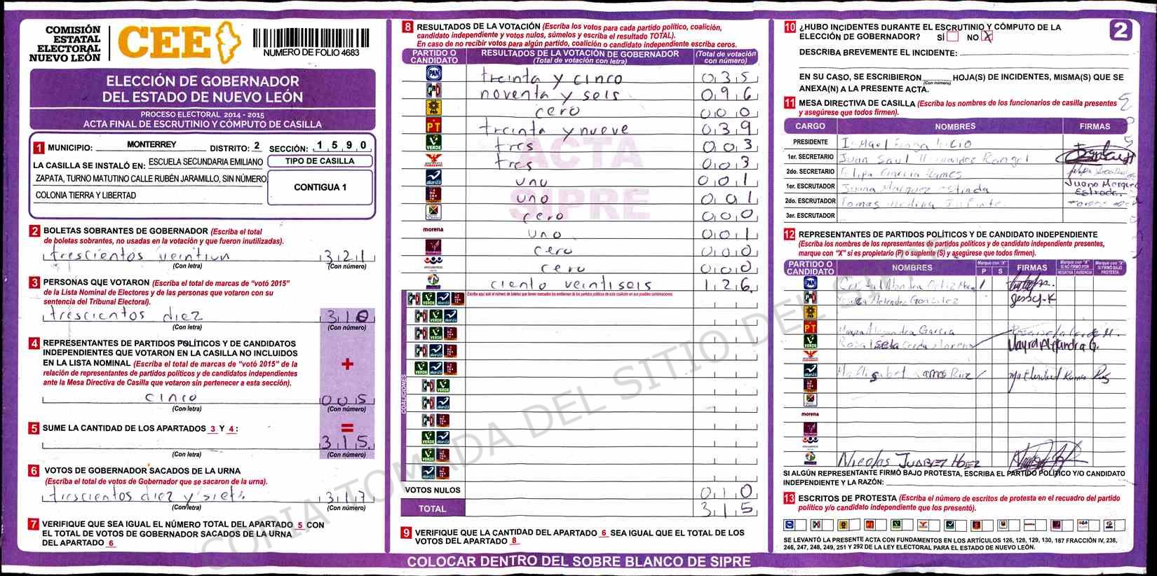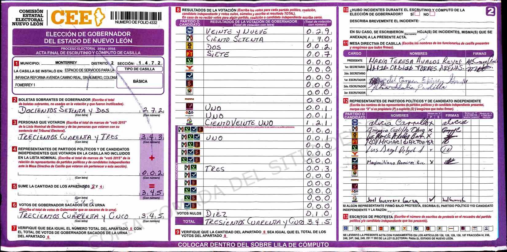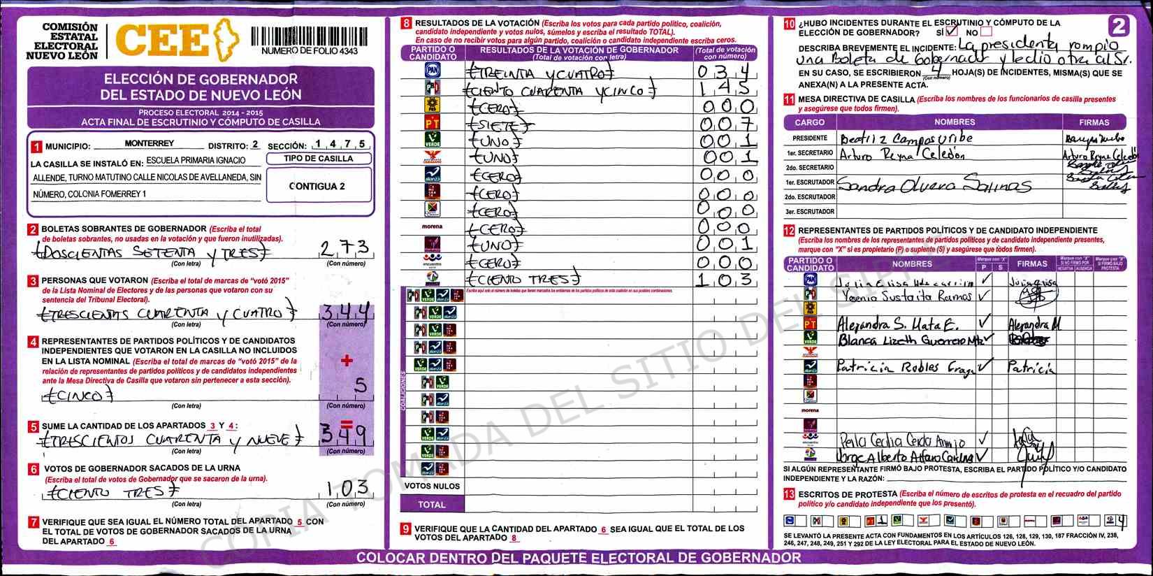 | Claves de Incidencia: | (1) Ilegible, (2) Mutilada, (3) Presenta Correcciones, (4) Presenta Borrones, (5) En Blanco, (6) Cifras Remarcadas, (7) Cifras de Mas, (8) Copiado Movido, (9) Con Signos Inválidos, (10) Excede Lista Nominal, (11) Otra |