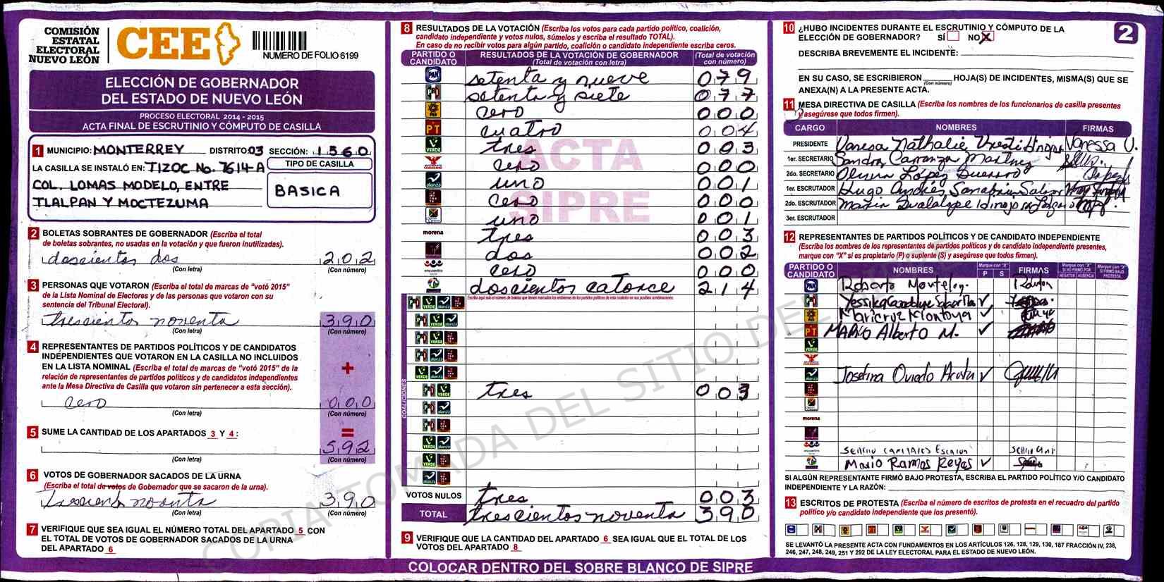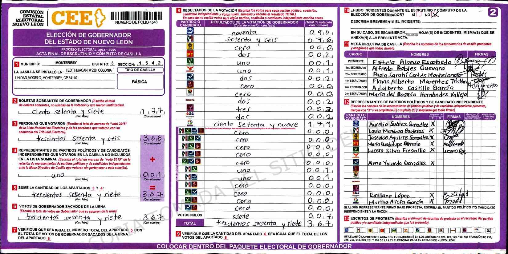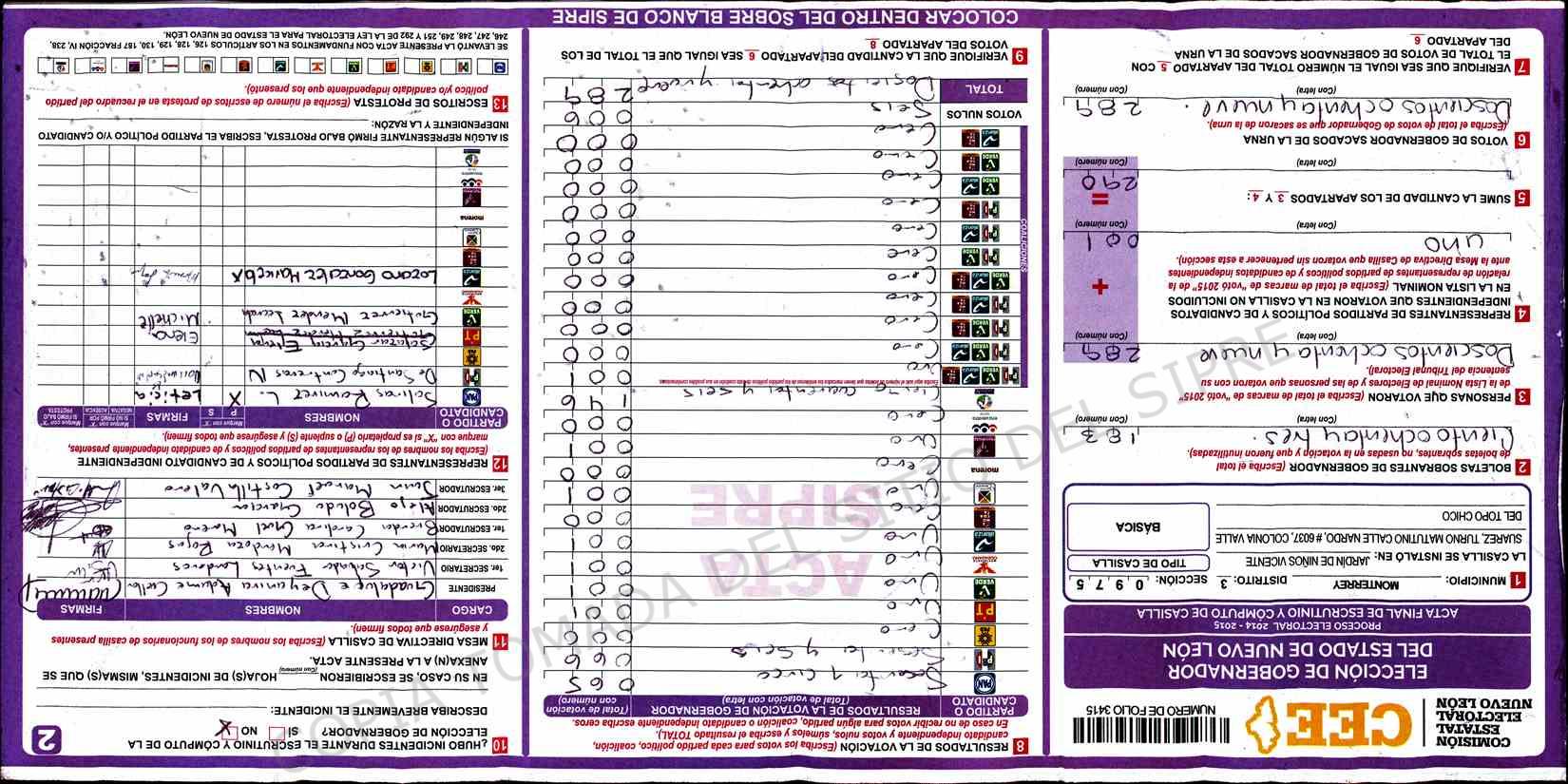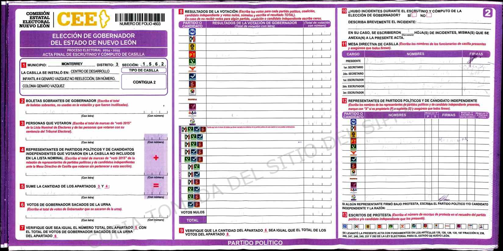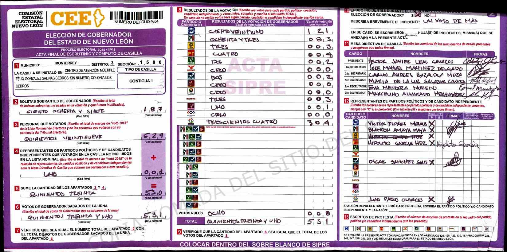 | Claves de Incidencia: | (1) Ilegible, (2) Mutilada, (3) Presenta Correcciones, (4) Presenta Borrones, (5) En Blanco, (6) Cifras Remarcadas, (7) Cifras de Mas, (8) Copiado Movido, (9) Con Signos Inválidos, (10) Excede Lista Nominal, (11) Otra |