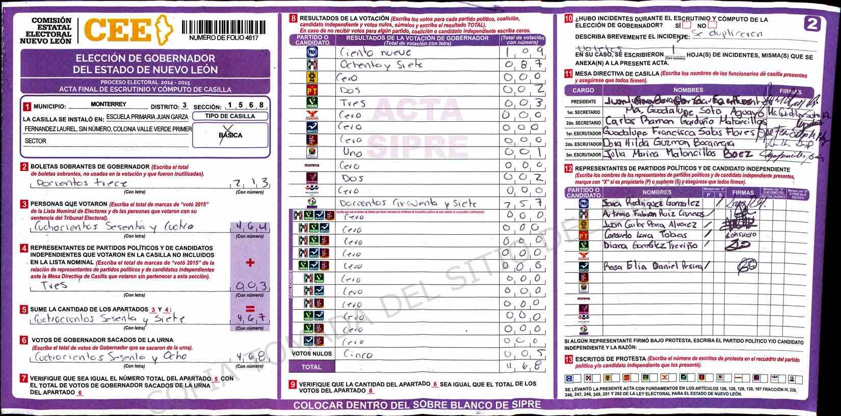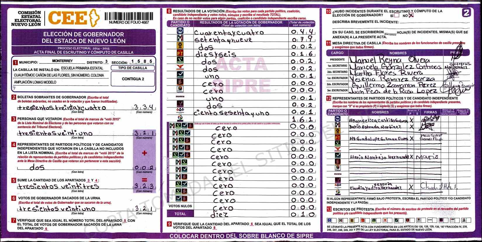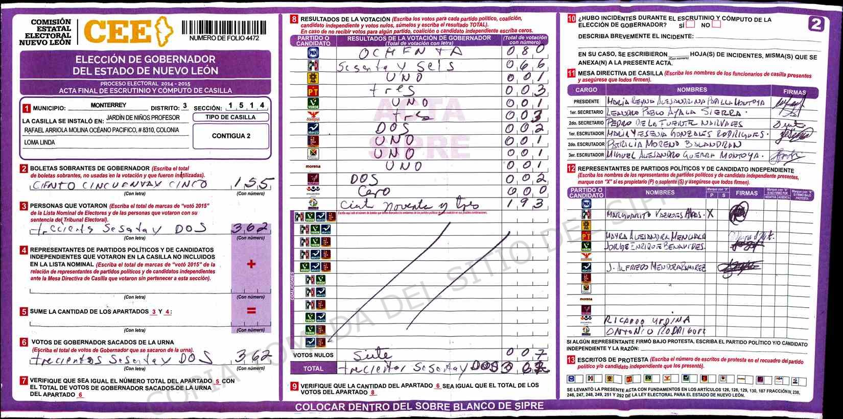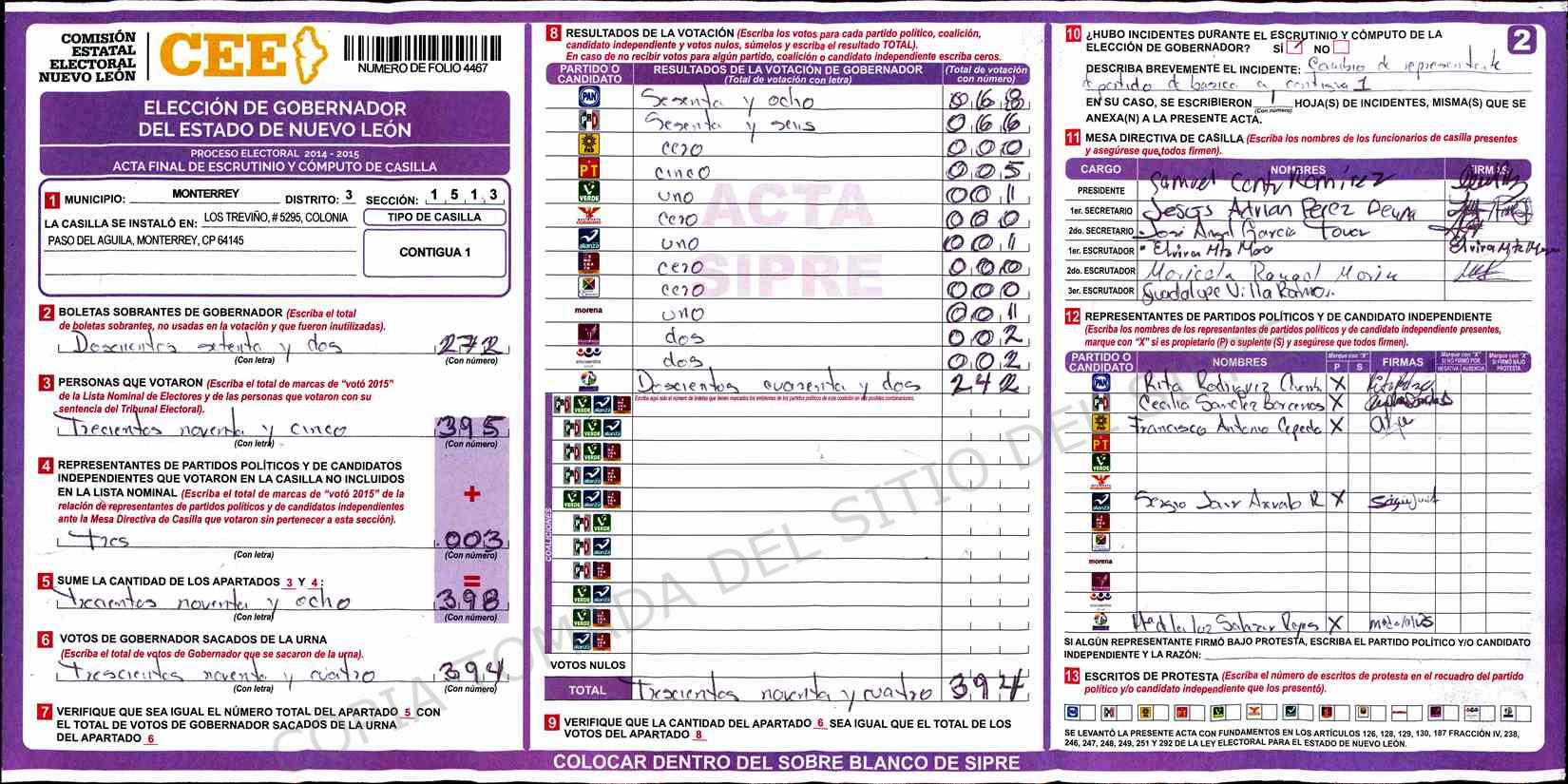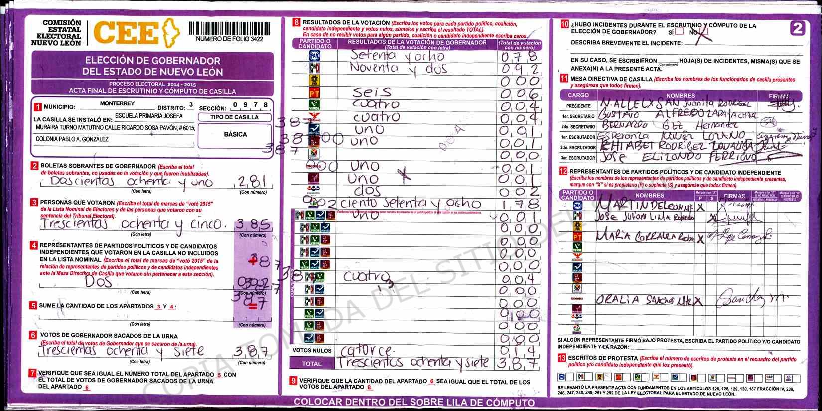 | Claves de Incidencia: | (1) Ilegible, (2) Mutilada, (3) Presenta Correcciones, (4) Presenta Borrones, (5) En Blanco, (6) Cifras Remarcadas, (7) Cifras de Mas, (8) Copiado Movido, (9) Con Signos Inválidos, (10) Excede Lista Nominal, (11) Otra |