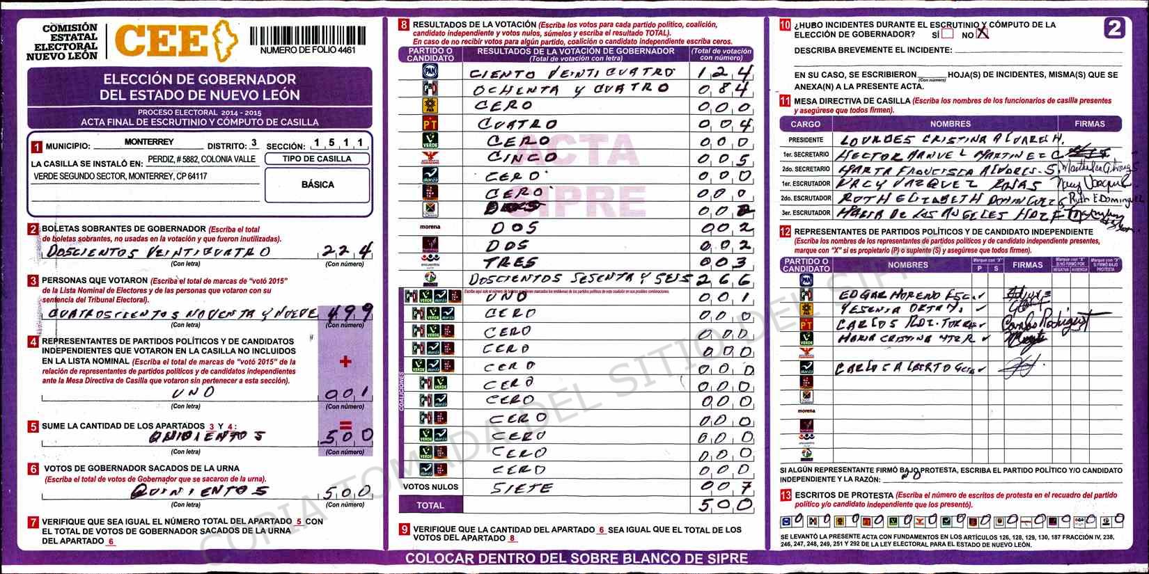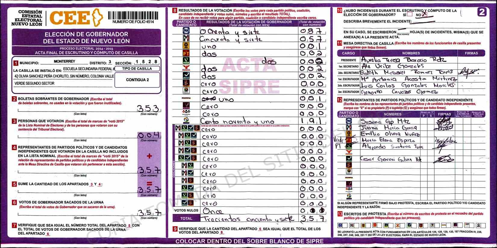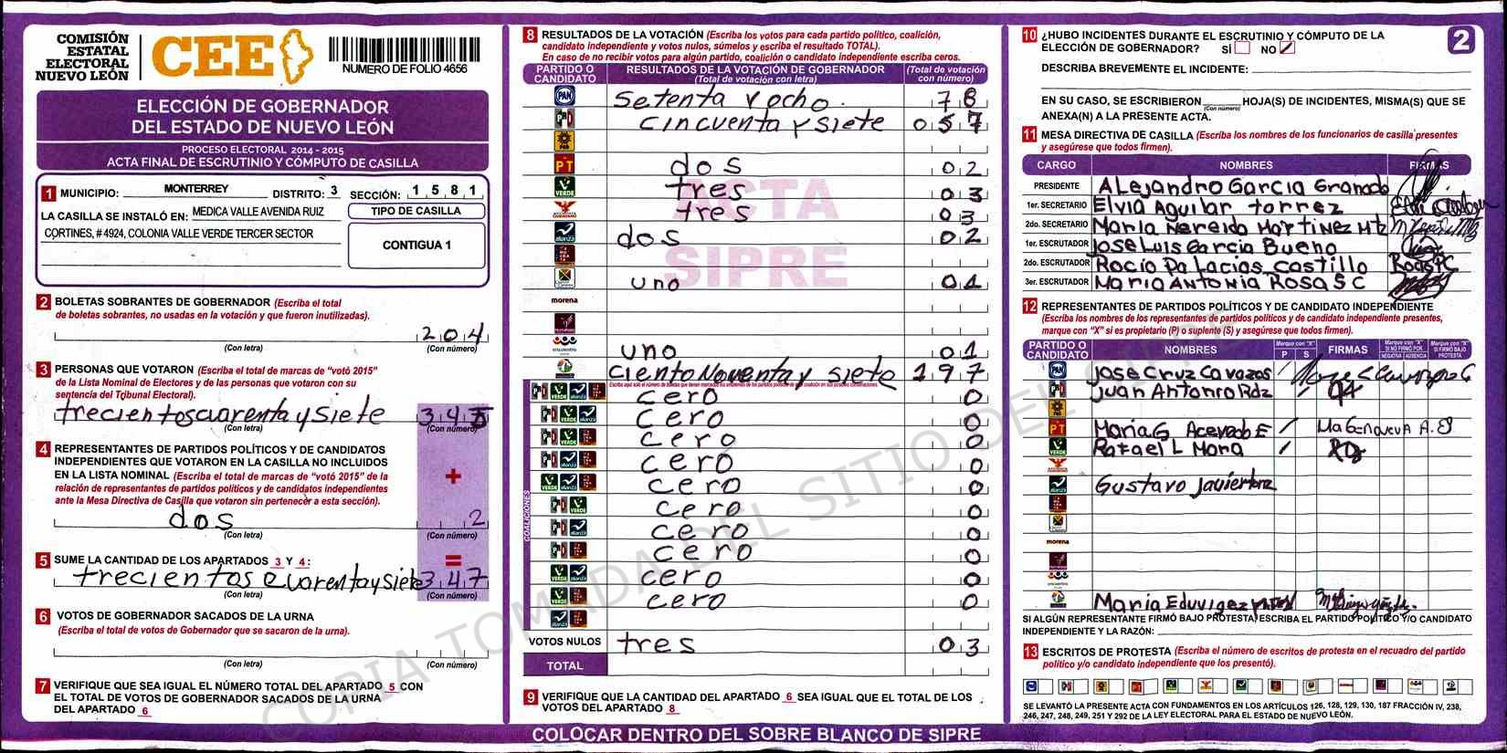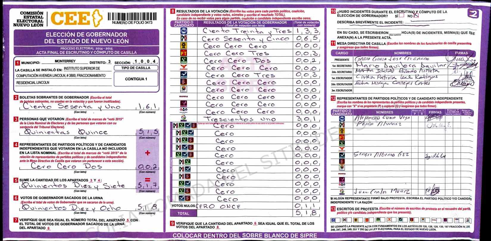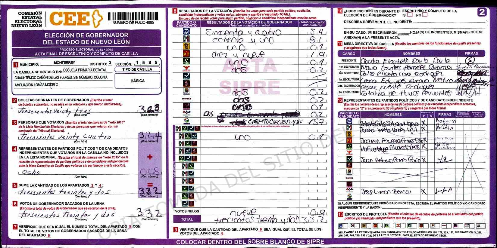 | Claves de Incidencia: | (1) Ilegible, (2) Mutilada, (3) Presenta Correcciones, (4) Presenta Borrones, (5) En Blanco, (6) Cifras Remarcadas, (7) Cifras de Mas, (8) Copiado Movido, (9) Con Signos Inválidos, (10) Excede Lista Nominal, (11) Otra |