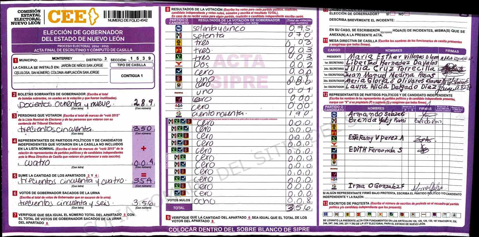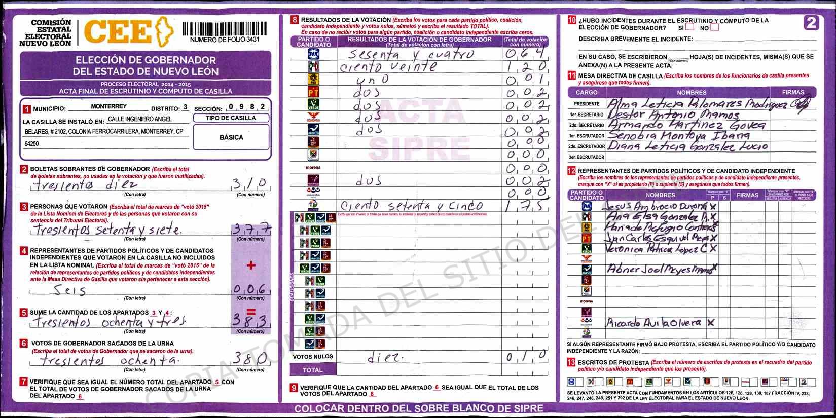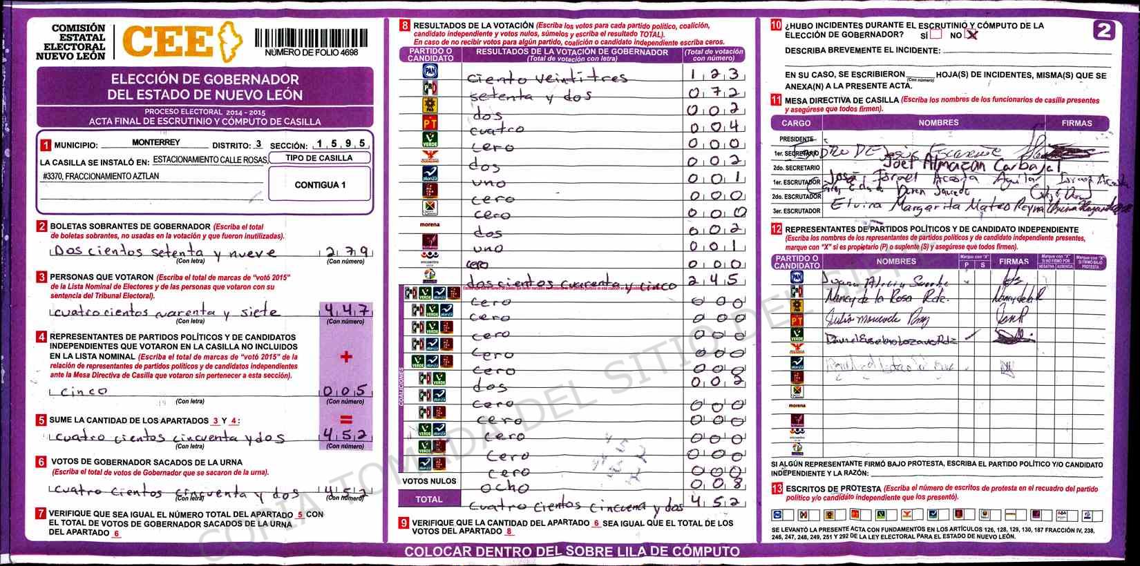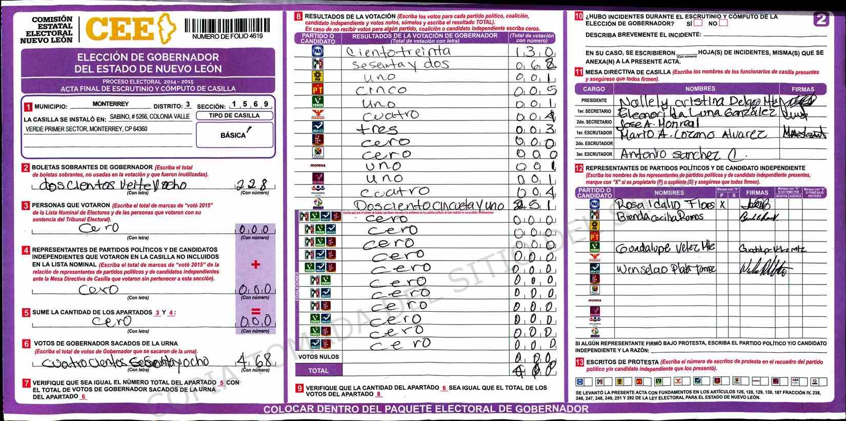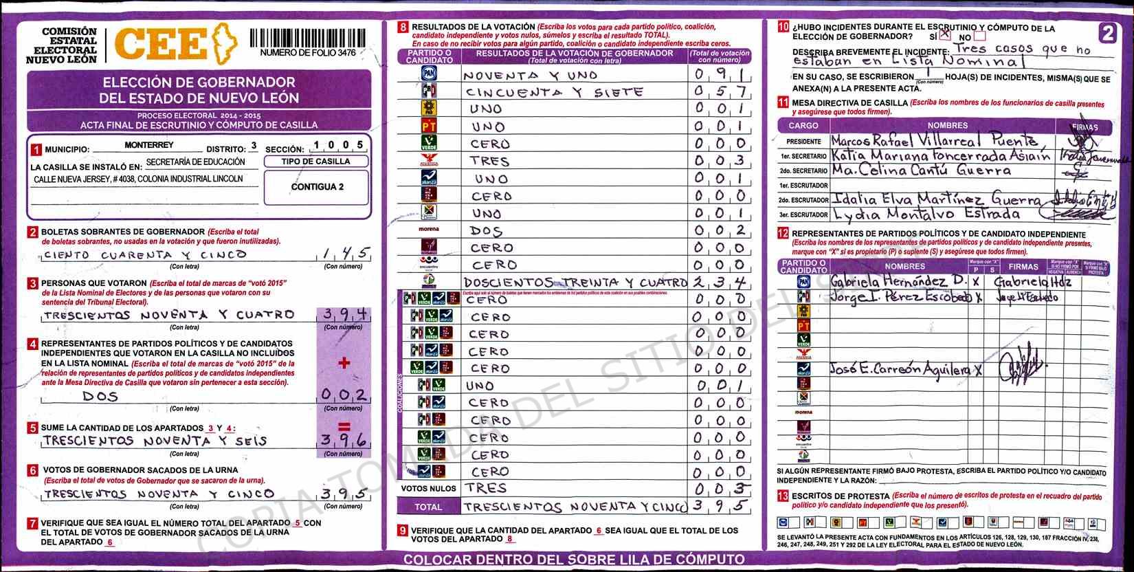 | Claves de Incidencia: | (1) Ilegible, (2) Mutilada, (3) Presenta Correcciones, (4) Presenta Borrones, (5) En Blanco, (6) Cifras Remarcadas, (7) Cifras de Mas, (8) Copiado Movido, (9) Con Signos Inválidos, (10) Excede Lista Nominal, (11) Otra |