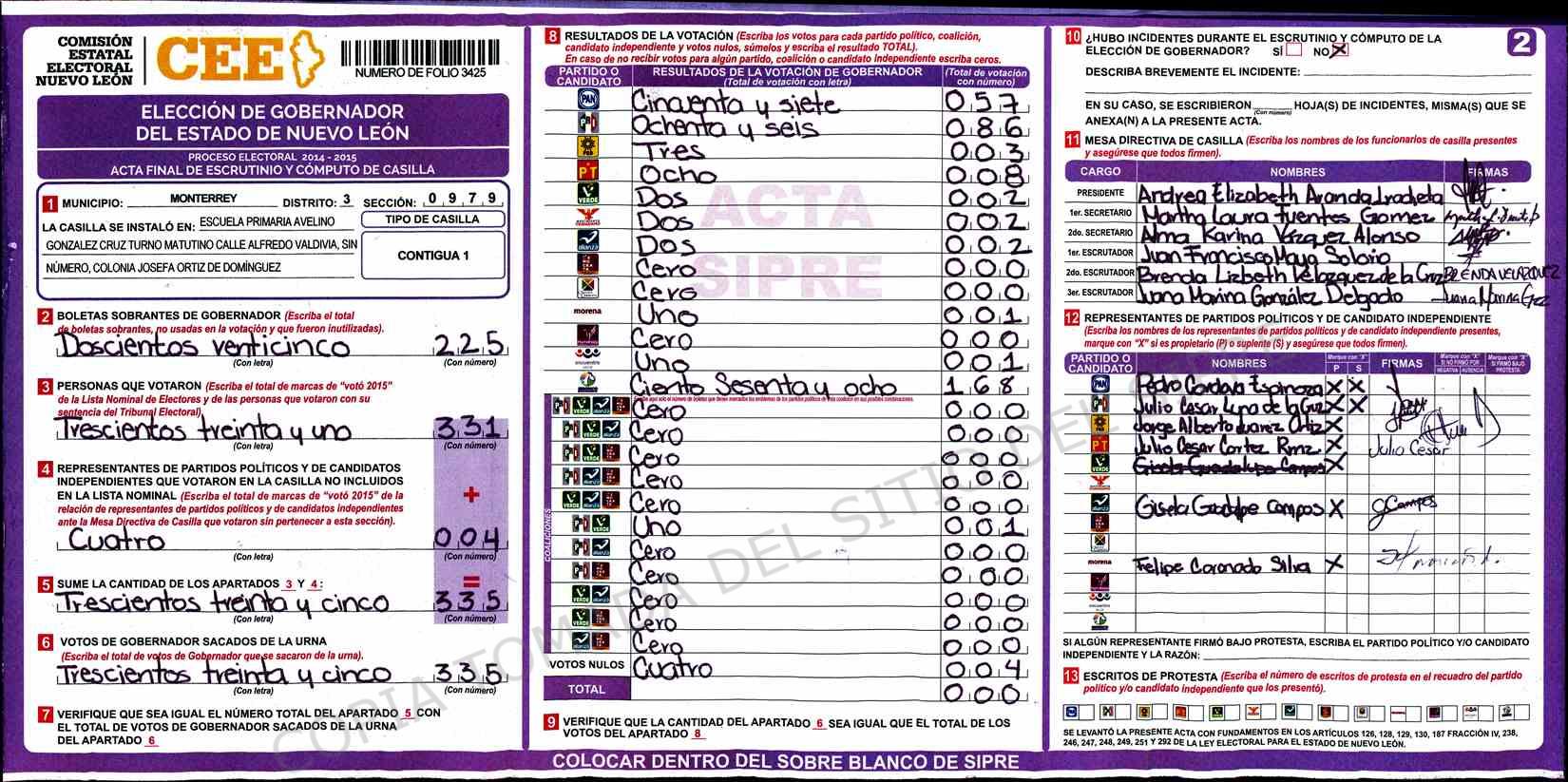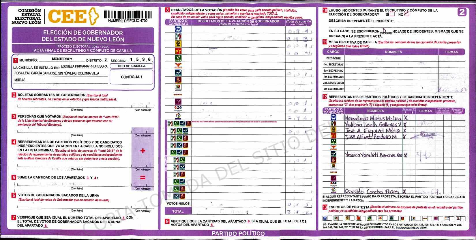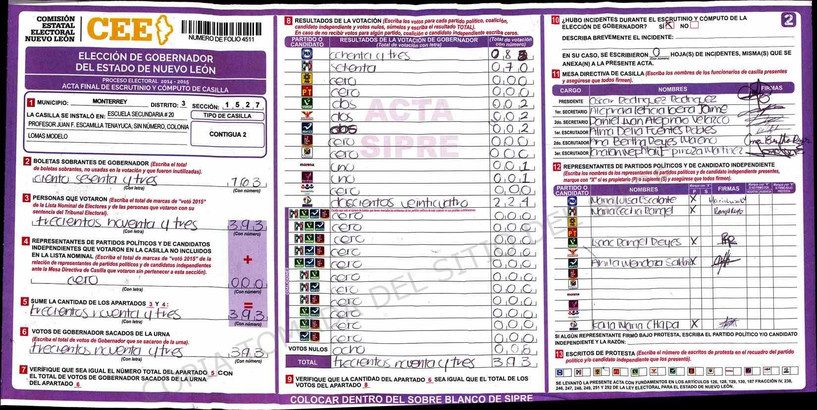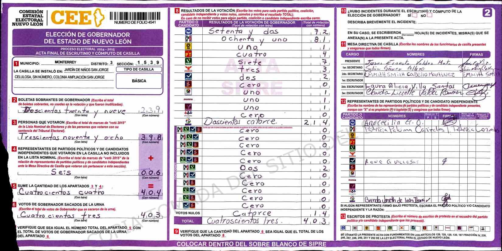| Claves de Incidencia: | (1) Ilegible, (2) Mutilada, (3) Presenta Correcciones, (4) Presenta Borrones, (5) En Blanco, (6) Cifras Remarcadas, (7) Cifras de Mas, (8) Copiado Movido, (9) Con Signos Inválidos, (10) Excede Lista Nominal, (11) Otra |