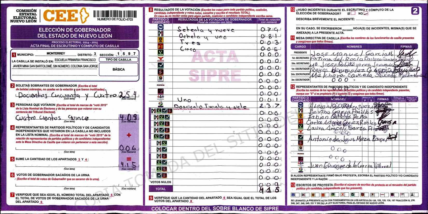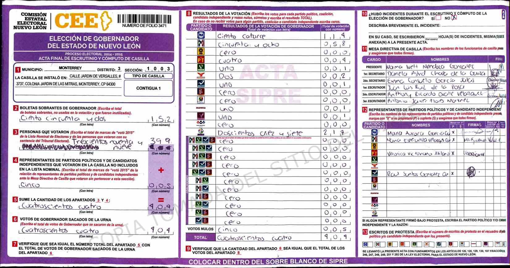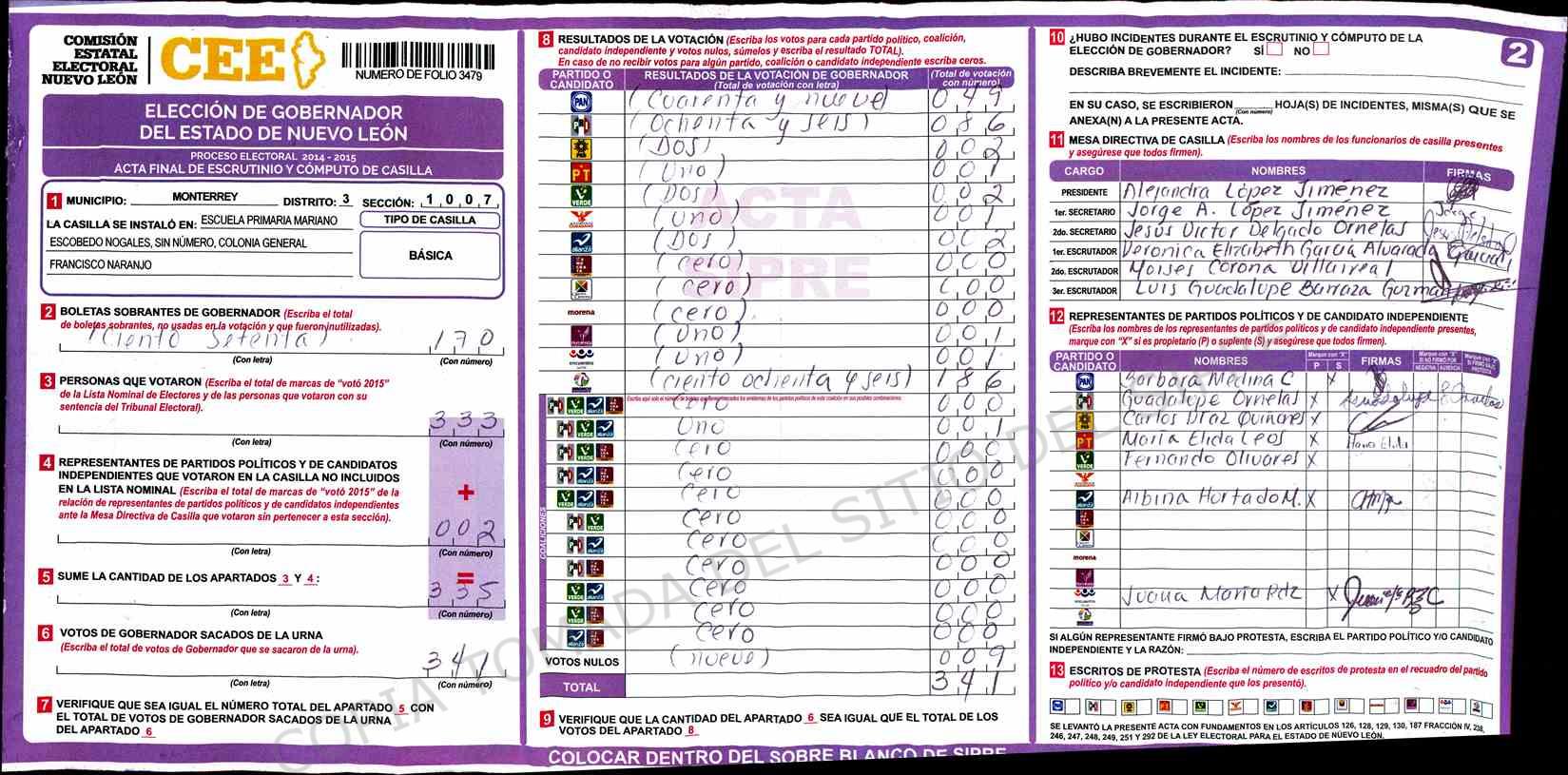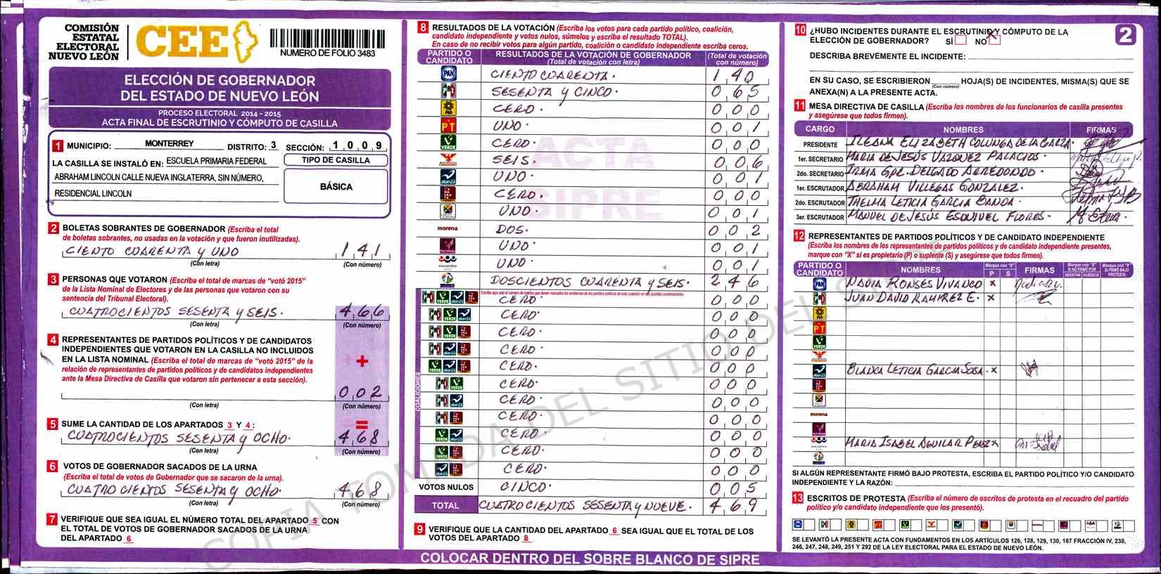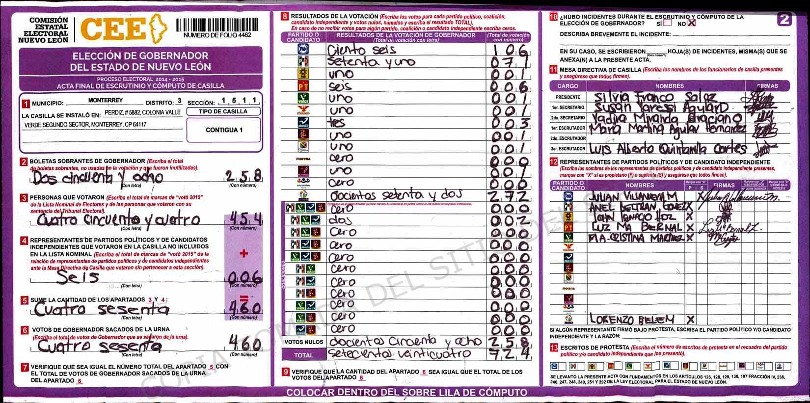 | Claves de Incidencia: | (1) Ilegible, (2) Mutilada, (3) Presenta Correcciones, (4) Presenta Borrones, (5) En Blanco, (6) Cifras Remarcadas, (7) Cifras de Mas, (8) Copiado Movido, (9) Con Signos Inválidos, (10) Excede Lista Nominal, (11) Otra |