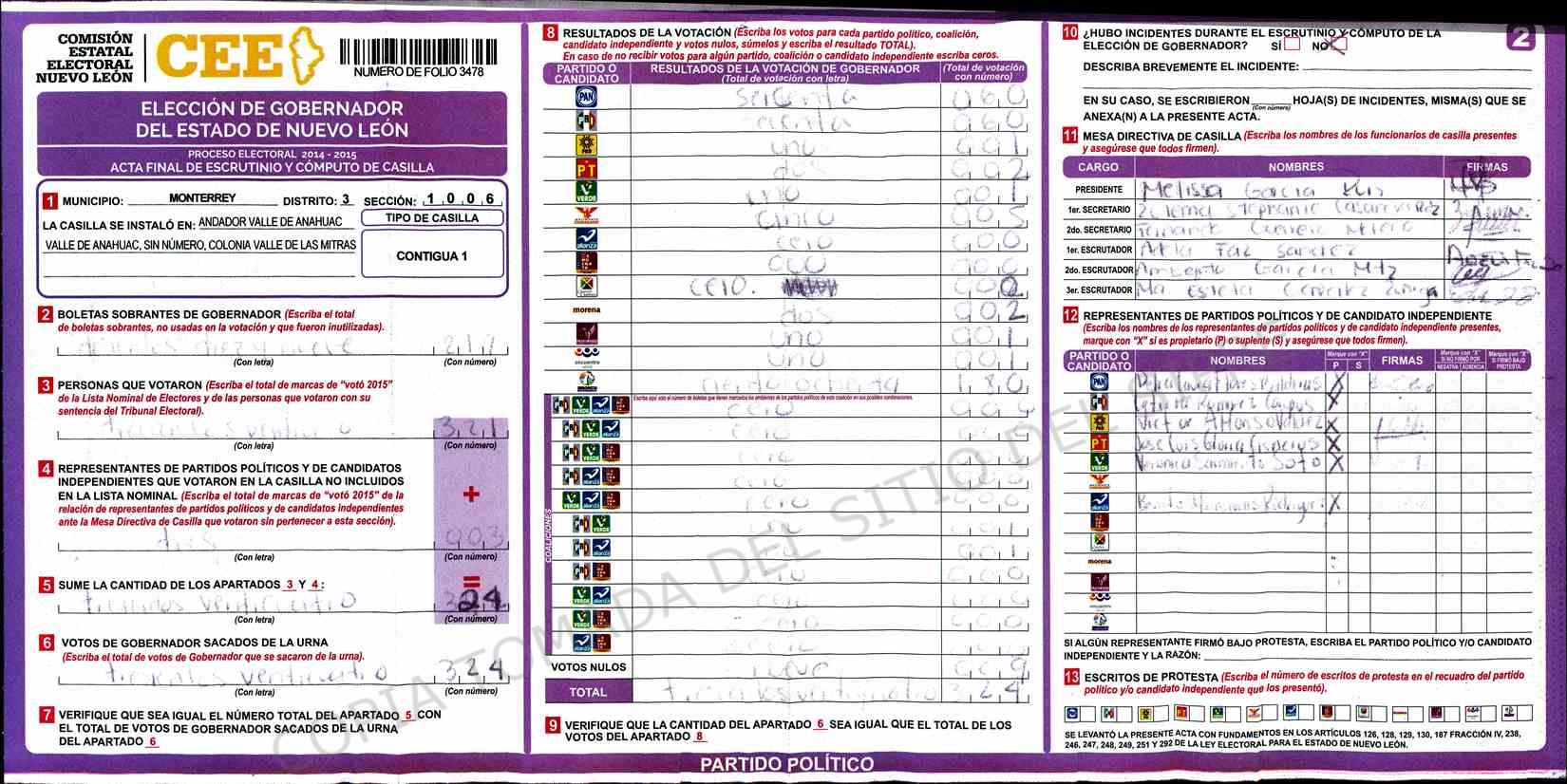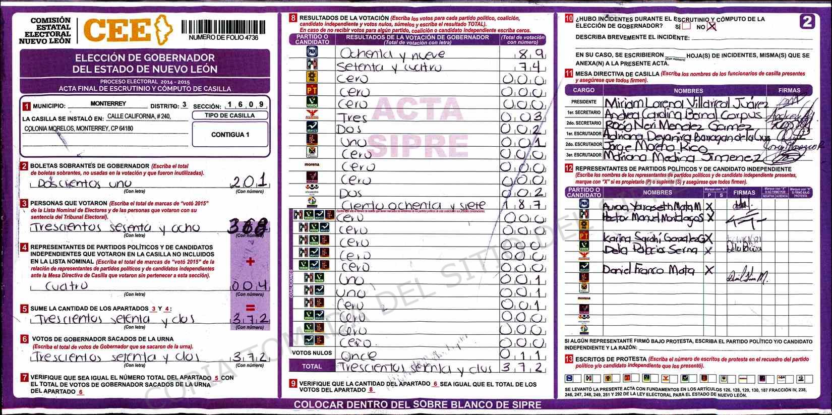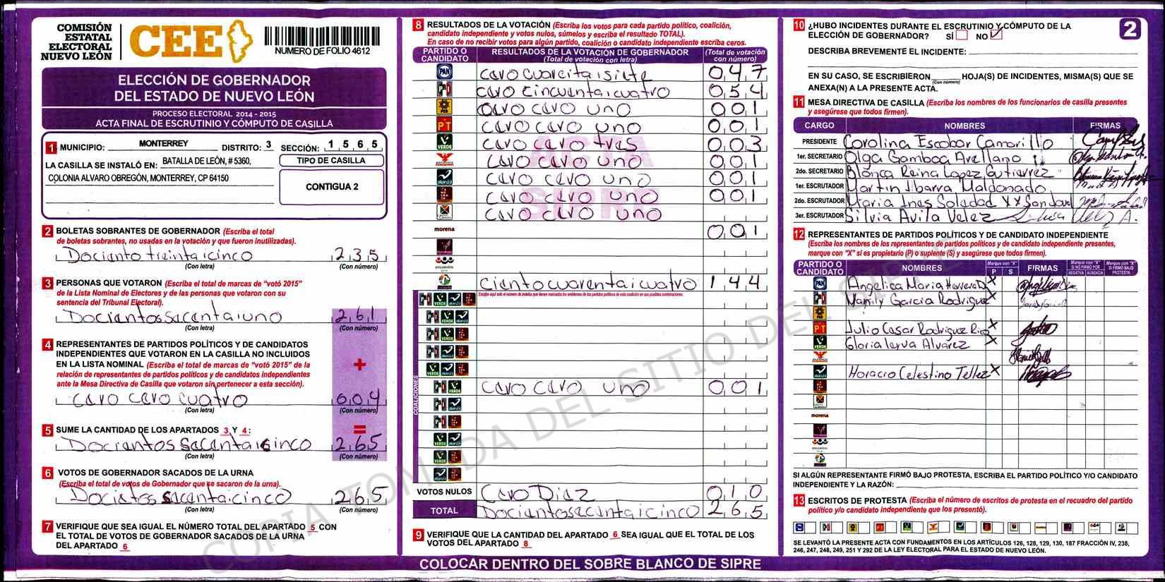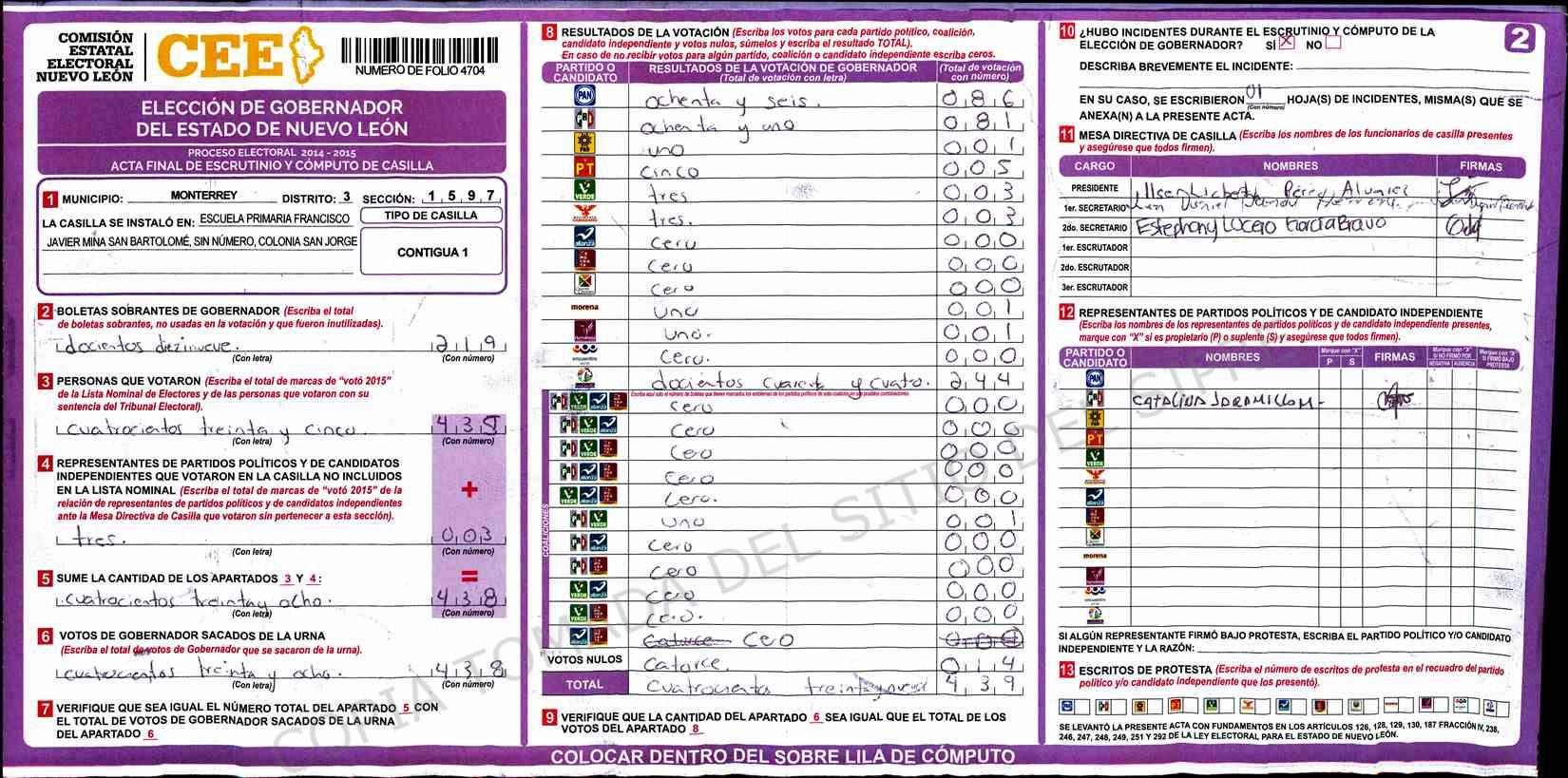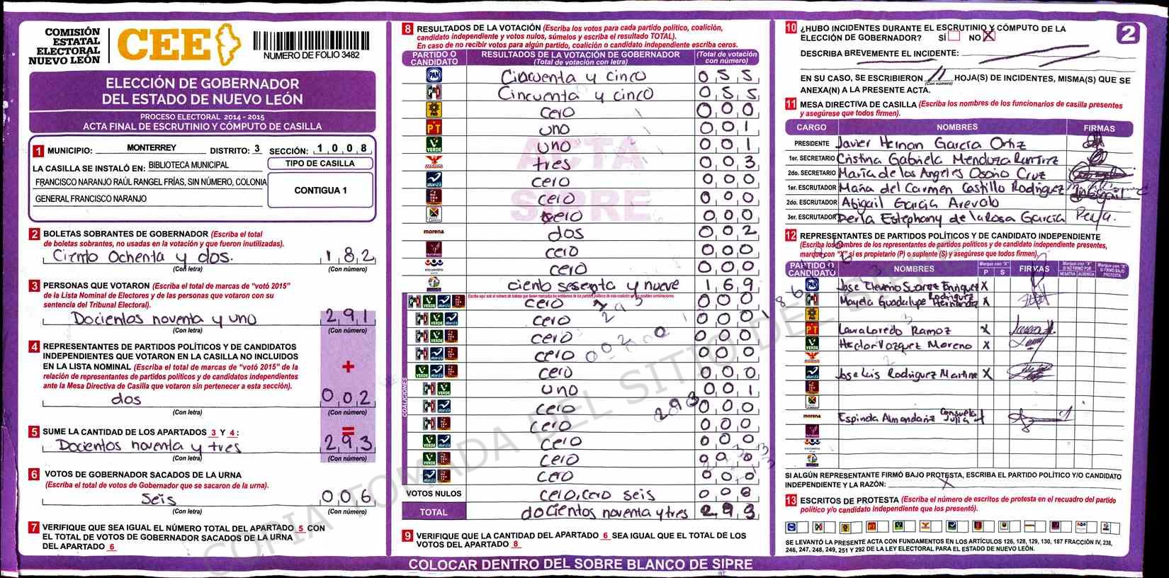 | Claves de Incidencia: | (1) Ilegible, (2) Mutilada, (3) Presenta Correcciones, (4) Presenta Borrones, (5) En Blanco, (6) Cifras Remarcadas, (7) Cifras de Mas, (8) Copiado Movido, (9) Con Signos Inválidos, (10) Excede Lista Nominal, (11) Otra |