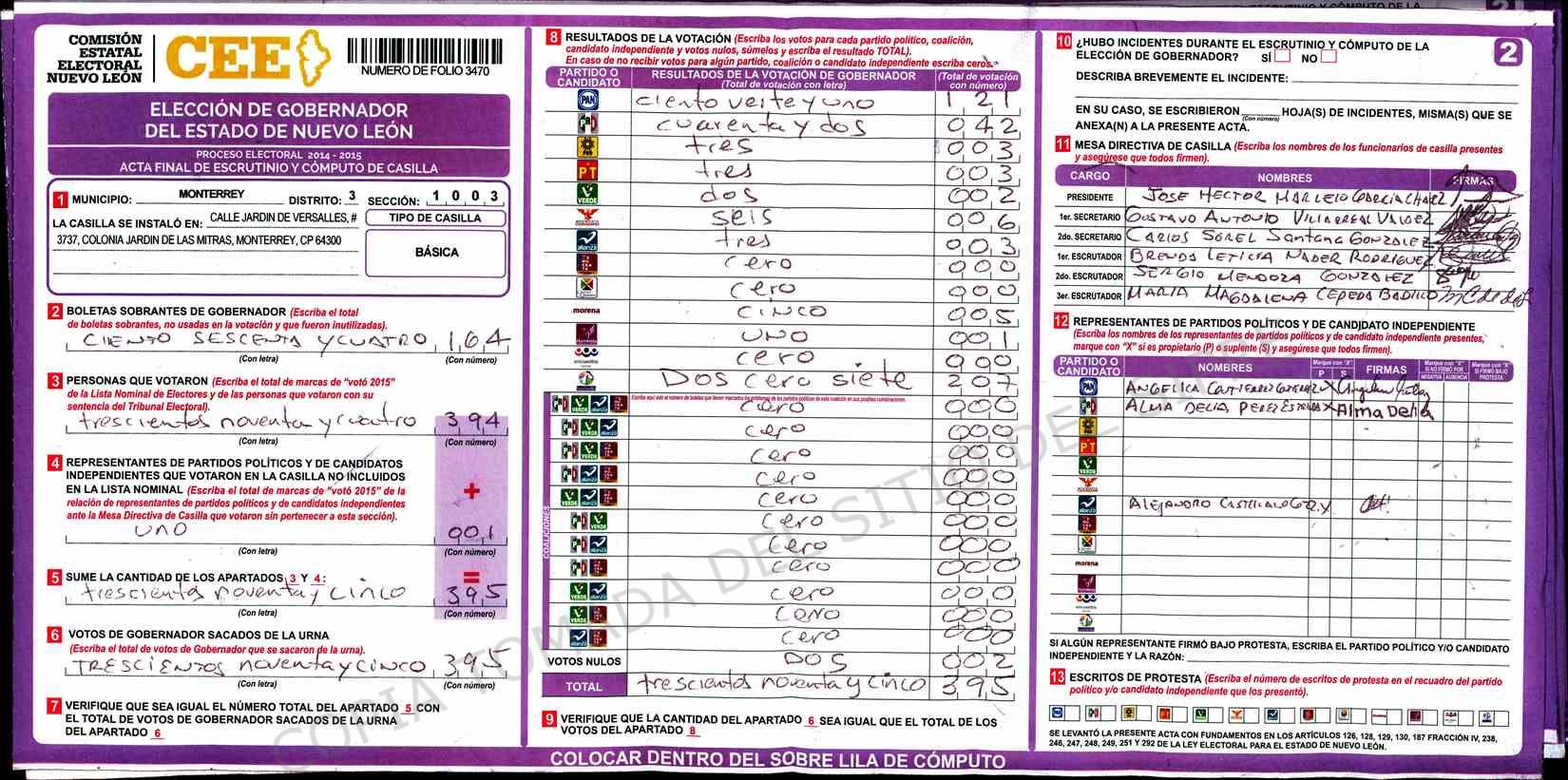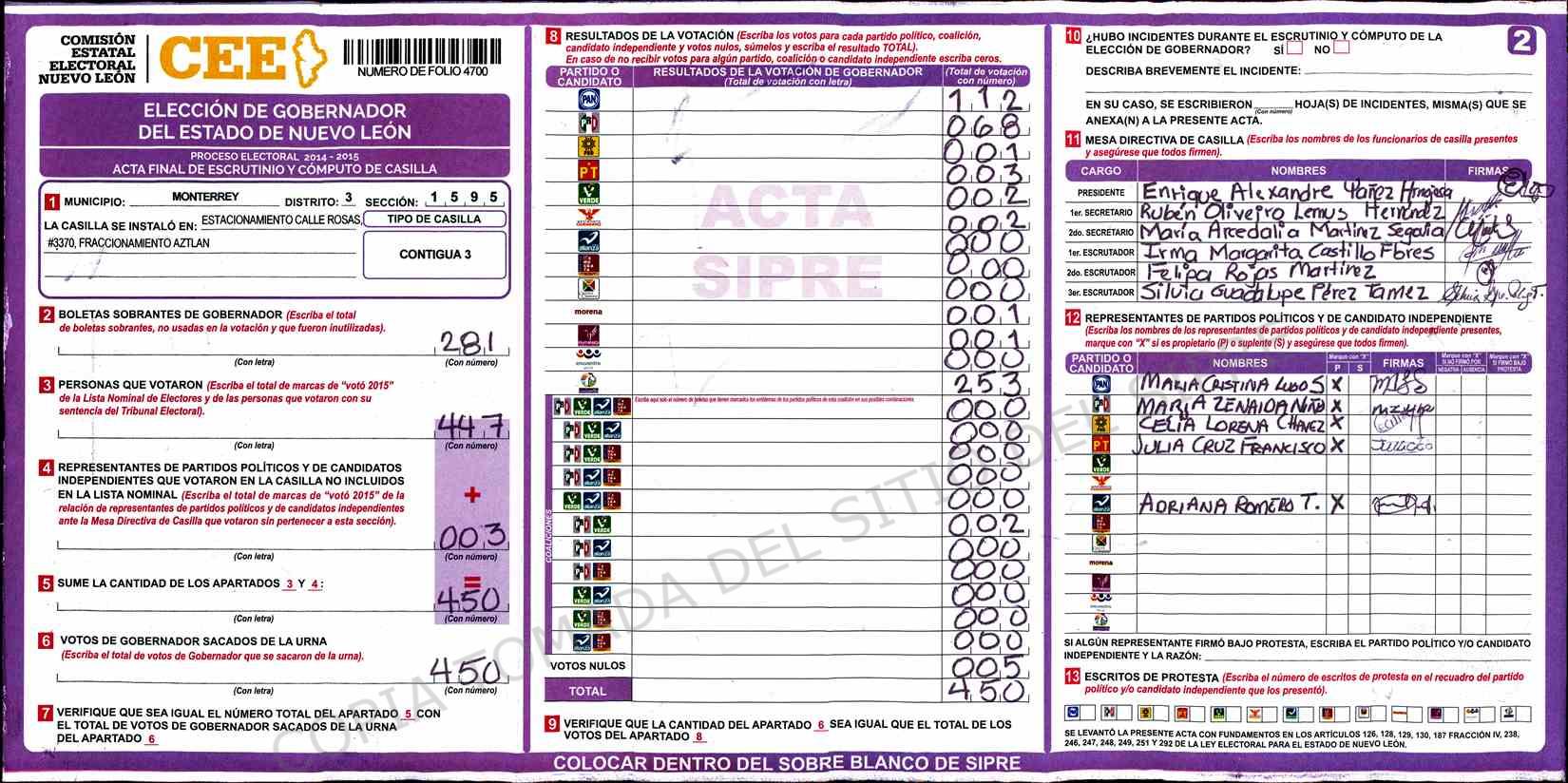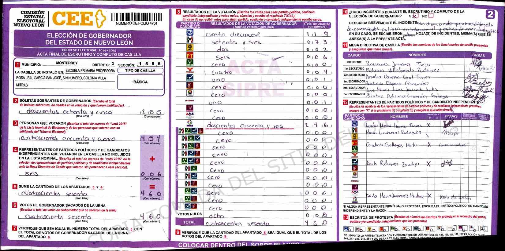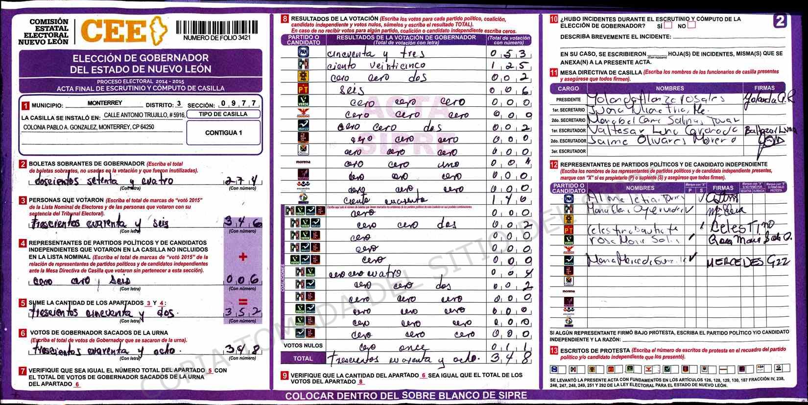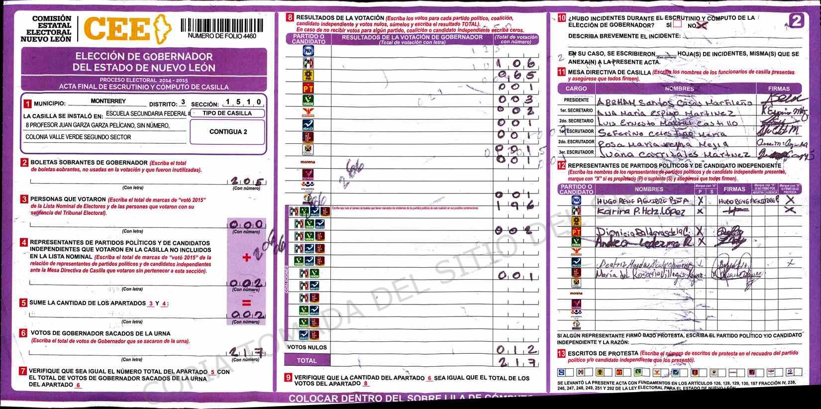 | Claves de Incidencia: | (1) Ilegible, (2) Mutilada, (3) Presenta Correcciones, (4) Presenta Borrones, (5) En Blanco, (6) Cifras Remarcadas, (7) Cifras de Mas, (8) Copiado Movido, (9) Con Signos Inválidos, (10) Excede Lista Nominal, (11) Otra |